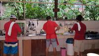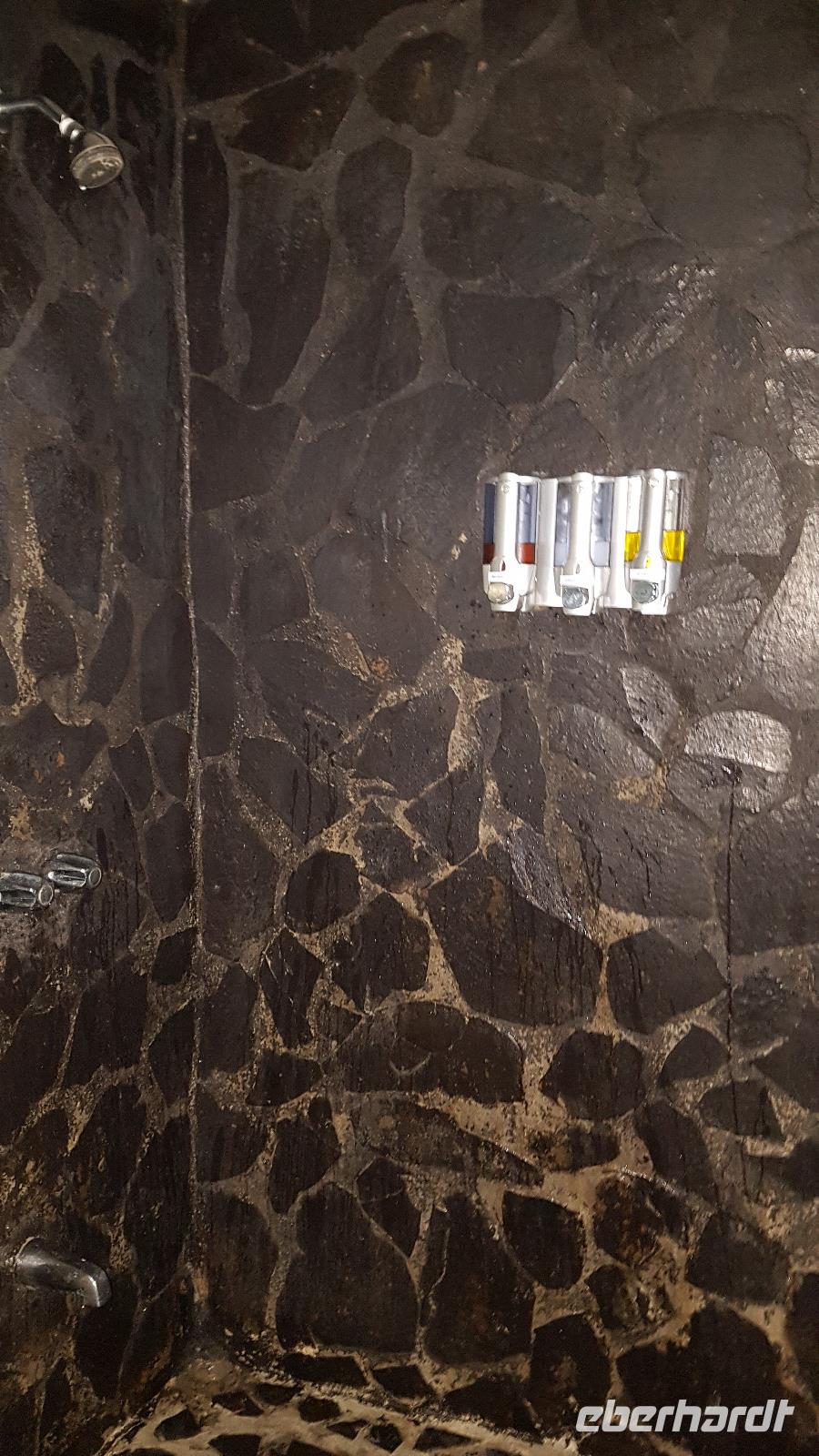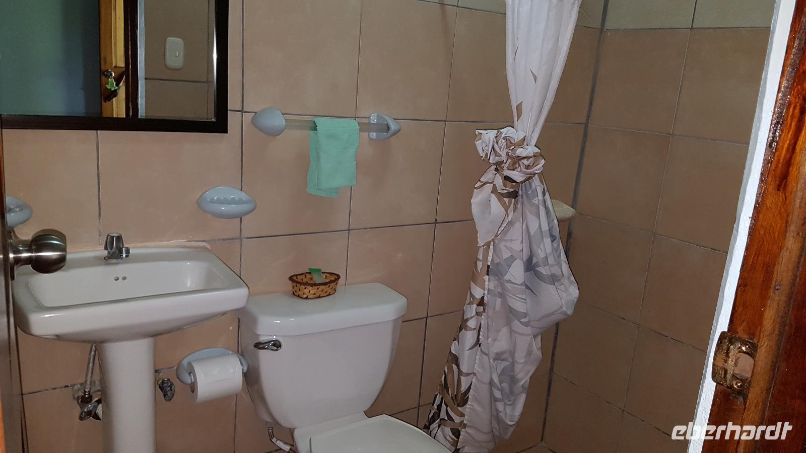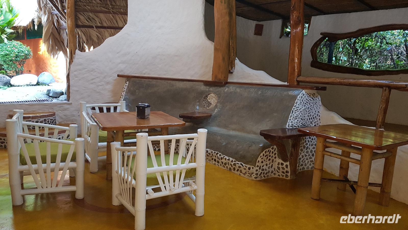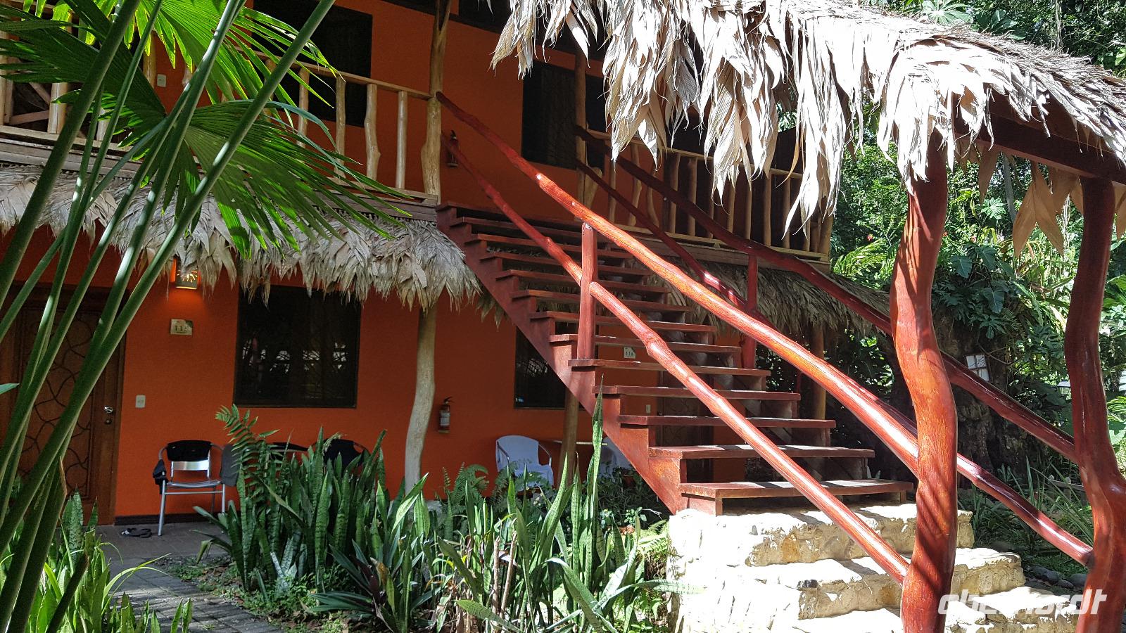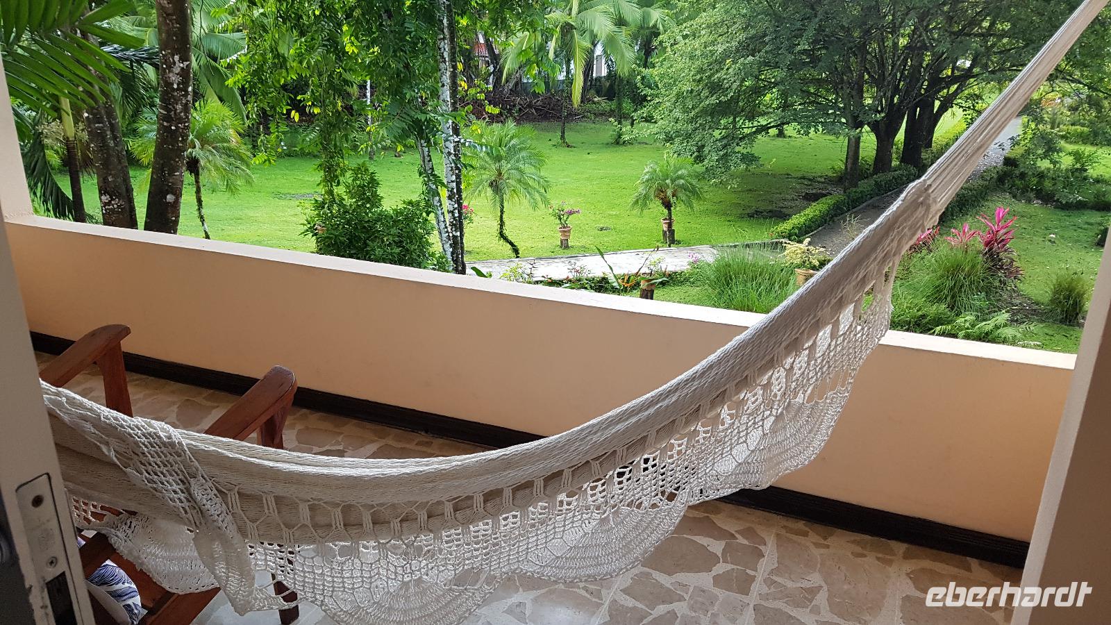 Neben den wilden Stellen im Paguare Fluss gab es auch ruhige und an einer solchen ruhigen Sandbank gingen wir an Land. Ein Boot wurde umgedreht und diente als Tisch. Während Ivan und Walter für uns das Picknick herrichteten, ging Jorge mit uns zu einem kleinen Fluss, erklärte uns das farbige Sedimentsgestein und weiter oben in einem kleinen Becken konnten wir schwimmen. Wieder zurück, liessen wir uns das Picknick schmecken, denn Rafting macht hungrig. Danach wurde alles zusammen gepackt und wir befuhren weiter den Paguare Fluss bis zu unserer Rios Tropicales Lodge. Dort gingen wir an Land, hingen die Helme und Rettungswesten auf eine schon vorbereitete Leine und nahmen die Schlüssel für unsere Unterkunft entgegen. Die Lodge lag direkt am Fluss und die hübschen Zimmer in dieser Wildnis waren eine echte Überraschung. Wir brachten nur das Gepäck in die Zimmer und wer noch Lust und Laune hatte, nahm an einer Regenwaldwanderung mit Ziel Wasserfall teil. Es war wieder sehr interessant und im Wassenfall konnten wir auch schwimmen. Beim Abfluss eines zweiten Wasserfalls war ein kleiner Generator installiert, der den Strom für die gesamte Lodge erzeugte. Wir zogen uns trockene Sachen an und trafen uns dann auf einen Welcome Drink auf der überdachten Terrasse. Dort blieben wir dann auch sitzen bis zum Abendessen und sahen unseren Bootsführern zu, wie sie unser Essen vorbereiteten. Einfach genial - diese Männer !