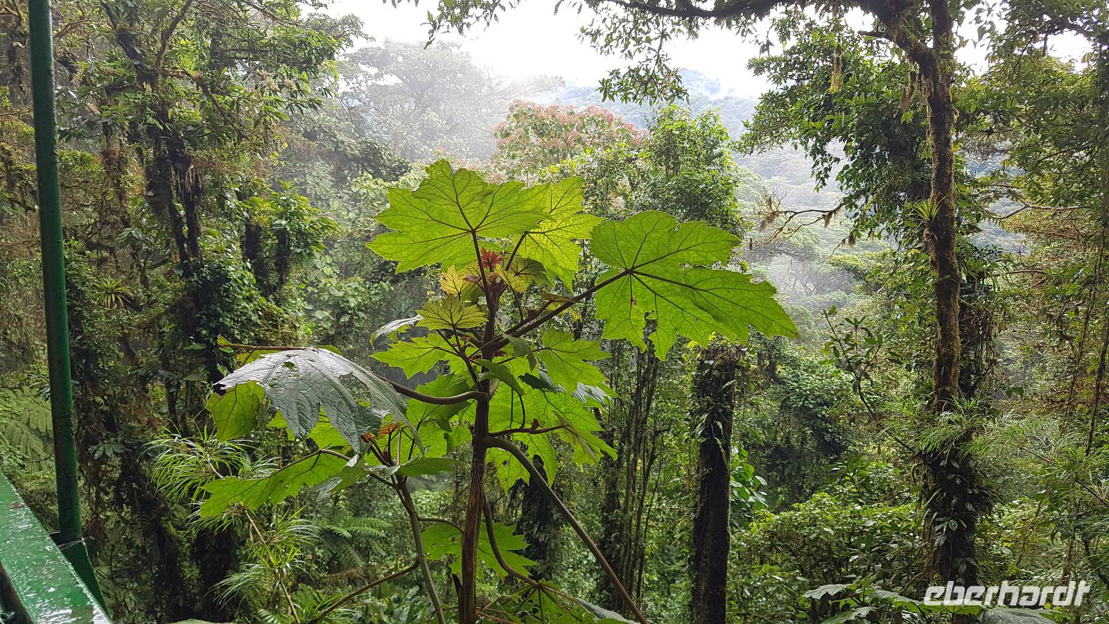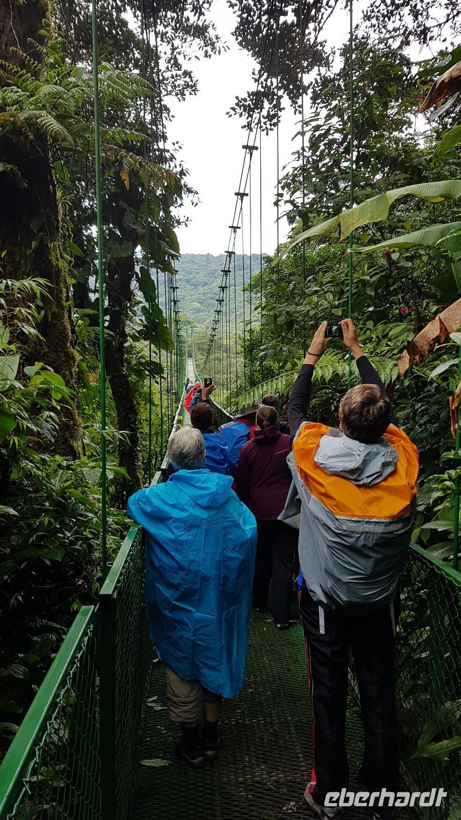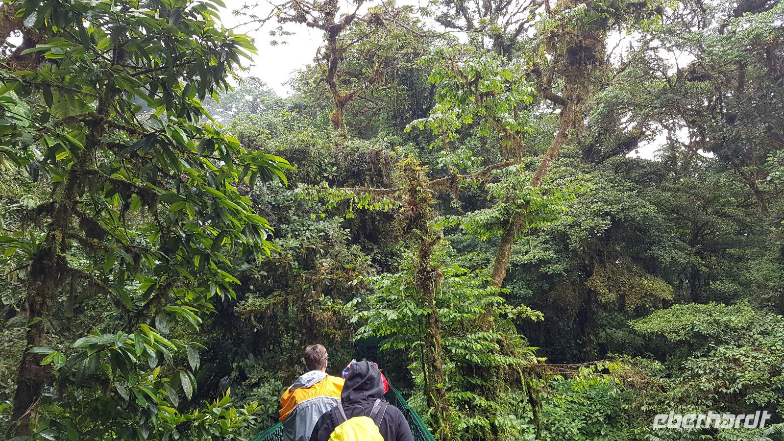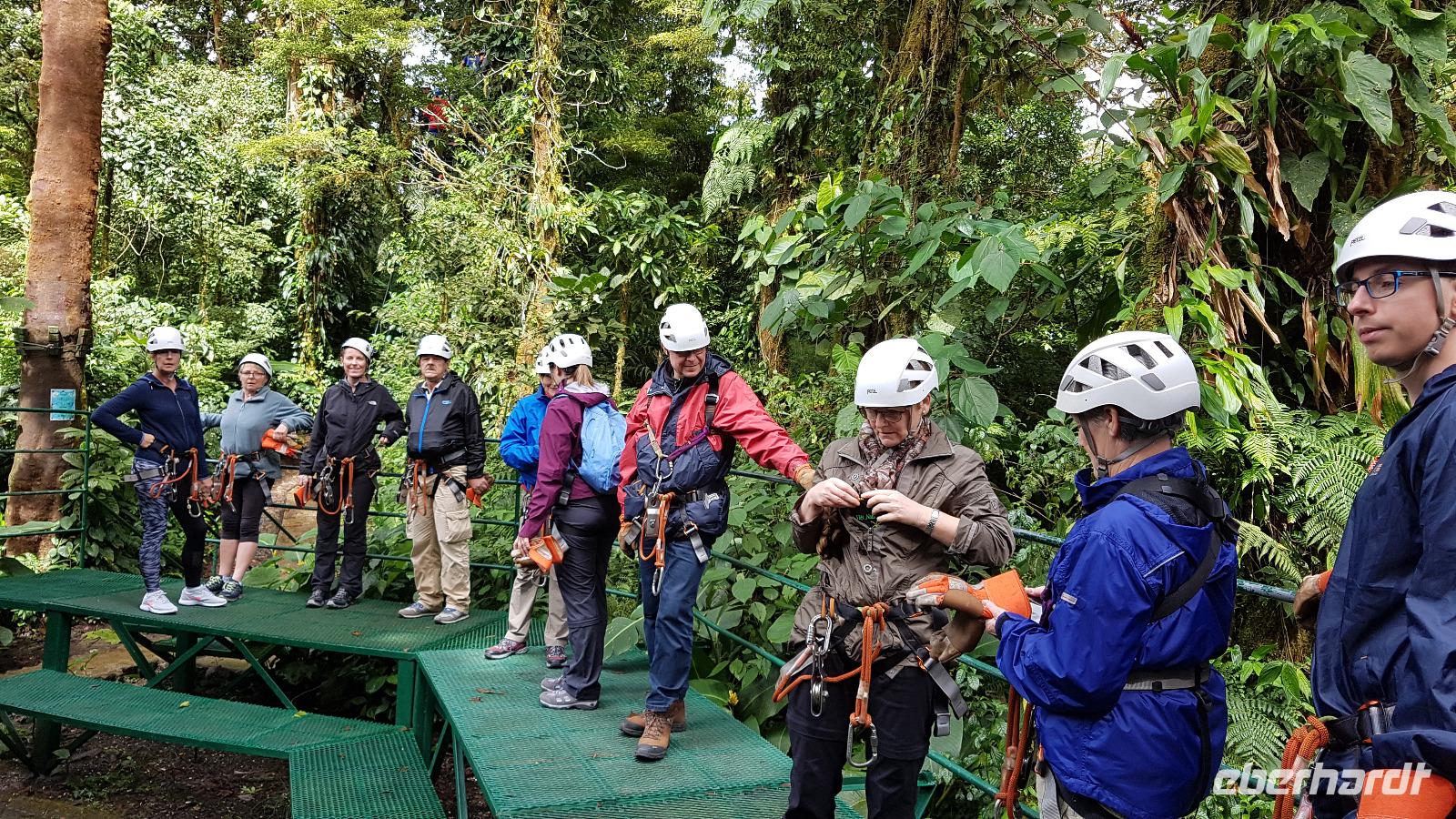 In Costa Rica fängt der frühe Vogel den Wurm - denn normalerweise ist es vormittags immer schön und irgendwann am Nachmittag setzt der Regen ein. So gab es fast immer ein zeitiges Frühstück und einen frühen Beginn der Touren. Über Nacht war unser Bus getauscht worden und Truman sehr glücklich, dass er uns nun zügig fahren konnte. Es war nur ein kurzes Stück bis zum Selvatura Park, wo wir sogleich Helme, Gurte und Arbeitslederhandschuhe bekamen. Auch konnte man eine Helmkamera ausleihen und den Rucksack für einen Vogelflug bekommen. Mit Jeeps fuhren wir dann bergauf bis zur ersten Plattform fürs Canopying. Dort erfolgte eine ganz praktische Einweisung und nun wurde es ernst für unser erstes Abenteuer. Wir stiegen hinauf auf die Plattform, wurden fachkundig gesichert und dann sauste jeder am Seil entlang zur nächsten Plattform. Haltungsnoten wurden glücklicherweise nicht vergeben, aber Hinweise, wie man noch schneller werden konnte. So glitten wir am Seil von Plattform zu Plattform und für die ganz langen Seile von 950 m und 1000 m fuhren immer 2 Personen gemeinsam, um über das Gewicht die nötige Geschwindigkeit zu bekommen. Leider hatte an diesem Vormittag der Regen schon viel zu früh eingesetzt und so waren die Mutigsten beim Tarzansprung schon klitschnass. Auch das längste Seil konnten wir wegen des starken Regens nicht mehr so richtig geniessen. Dennoch war es eine überwältigendes Erlebnis - dsas Abenteuer Nr. 1.