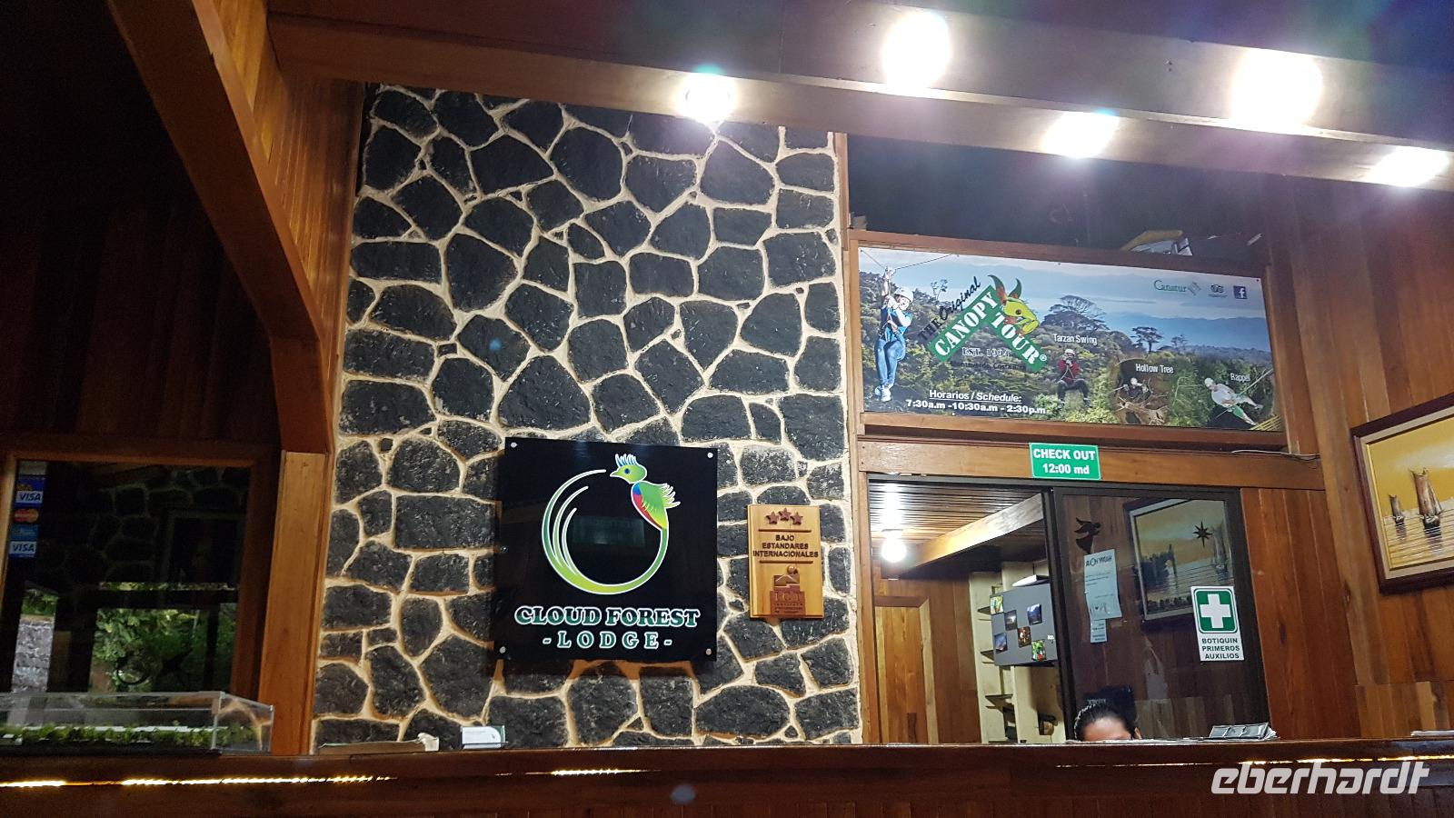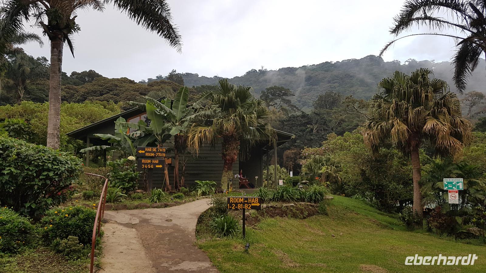 Wir waren alle schon mitten in der Nacht wach geworden und freuten uns auf das Frühstück. Reis mit Bohnen und viele Früchte gab es unter anderem und so starteten wir froh gelaunt und gut gestärkt in den Tag. Nico und Truman holten uns am Hotel ab, das Gepäck wurde verladen und wir fuhren durch San Jose Richtung Pazifikküste. Bei Puerto Caldera erreichten wir das Meer und gingen zum Strand, um unsere Füsse im warmen Wasser zu baden. Dann fuhren wir weiter auf der Panamerikana und legten eine Mittagspause im Cafe Macadamia ein, wo es ein umfangreiches Angebot an frisch zubereiteten Speisen und Kuchen gab. Kurz darauf verliessen wir die Hauptstrasse und nahmen die kurvenreiche Strasse hinauf nach Monteverde. Das Gebiet wurde erst Ende der 1940er Jahre von wenigen Costarikanern besiedelt. Zu Beginn der 1950er Jahre entdeckten dann amerikanische Quäker das Gebiet für sich und nannten es Monteverde - grüner Berg. Die Quäker lehnten den Militärdienst in den USA ab und kamen nach Costa Rica, weil hier gerade die Wehrpflicht abgeschafft worden war. Die Strasse hinauf nach Santa Elena wird Stück für Stück ausgebaut und verläuft teilweise auf Schotter. Sie wurde immer steiler und unser Bus hatte ein Problem und zu wenig Power. Nach einem kurzen Einkaufsstopp in Santa Elena war an einem sehr steilen Berg Schluß für unseren Bus und so stiegen wir alle aus und gingen ein beträchtliches, letztes Stück zu Fuss bis zu unserer Cloud Forest Lodge. Nach einem Welcome Drink und den wichtigsten Informationen bezog jeder ein schönes Holzhaus und gleich darauf trafen wir uns zur Vorstellungsrunde mit "Volksmedizin" Zuckerrohrschnaps. Danach informierte uns Nico über das bevorstehende Abenteuerprogramm in Costa Rica sehr ausführlich. Das Abendessen nahmen wir in der Lodge ein.
