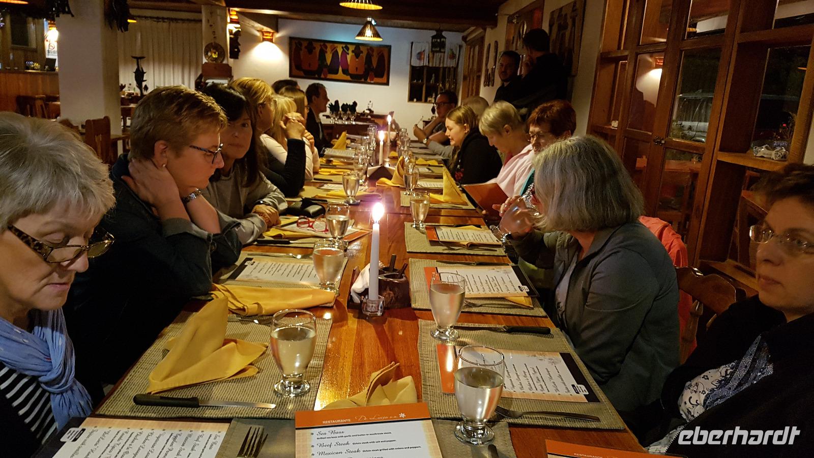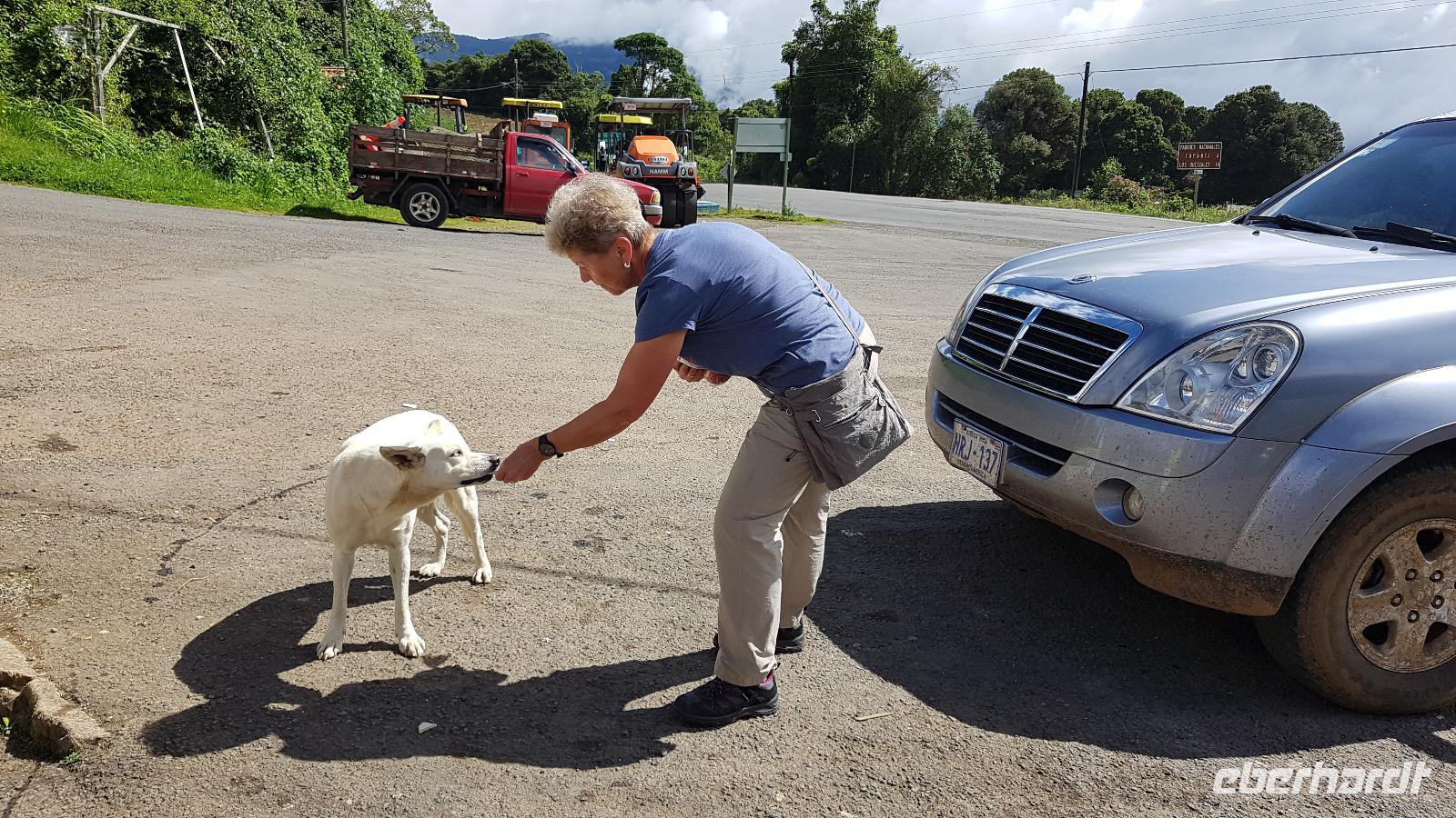 Nach dem Frühstück kontaktierten wir sicherheitshalber vor Ort einen Arzt wegen unklarer Beschwerden bei einer Dame. Der argentinische Arzt konnte zum Glück Entwarnung geben und so stand dem Rückflug nichts im Wege. Am späten Vormittag starteten wir dann mit unserem Bus zur Fahrt nach San Jose. In einem Supermarkt tätigte jeder noch die letzten Einkäufe und während der langen Fahrt beantwortete Nico noch alle anstehenden Fragen im Bus. Unterwegs machten wir eine kurze Mittagspause und verwöhnten ganz nebenbei noch 3 Hundewelpen und deren Mama. Gegen 16 Uhr erreichten wir die Hauptstadt San Jose und checkten ein im Hotel Autentico. Es regnete wieder stark und so waren wir froh über das Abendessen in unserem Hotel. Noch vor dem Abendessen liess ich unsere Bordkarten an der Rezeption ausdrucken und dann bedankten wir uns alle ganz herzlich bei Truman, unserem Fahrer, und bei Nico, unserem Reiseleiter. Beide hatten uns Costa Rica von der schönsten Seite gezeigt. Beim Abendessen kam dann so langsam Abschiedsstimmung auf und wir stiessen mit Wein und Bier auf unsere wunderschöne Reise an.