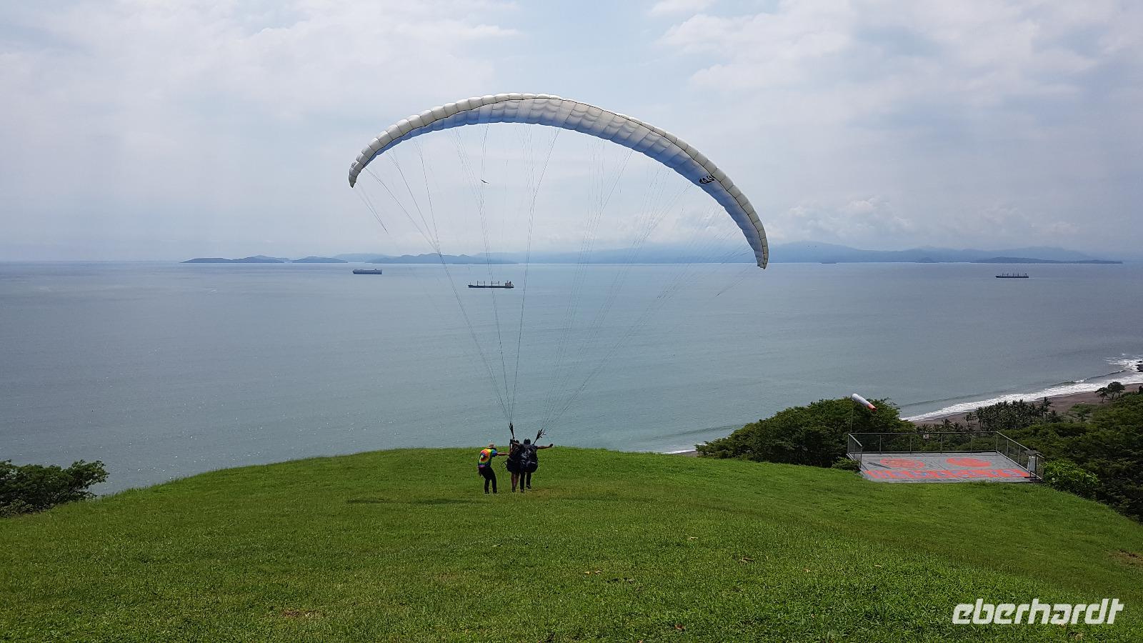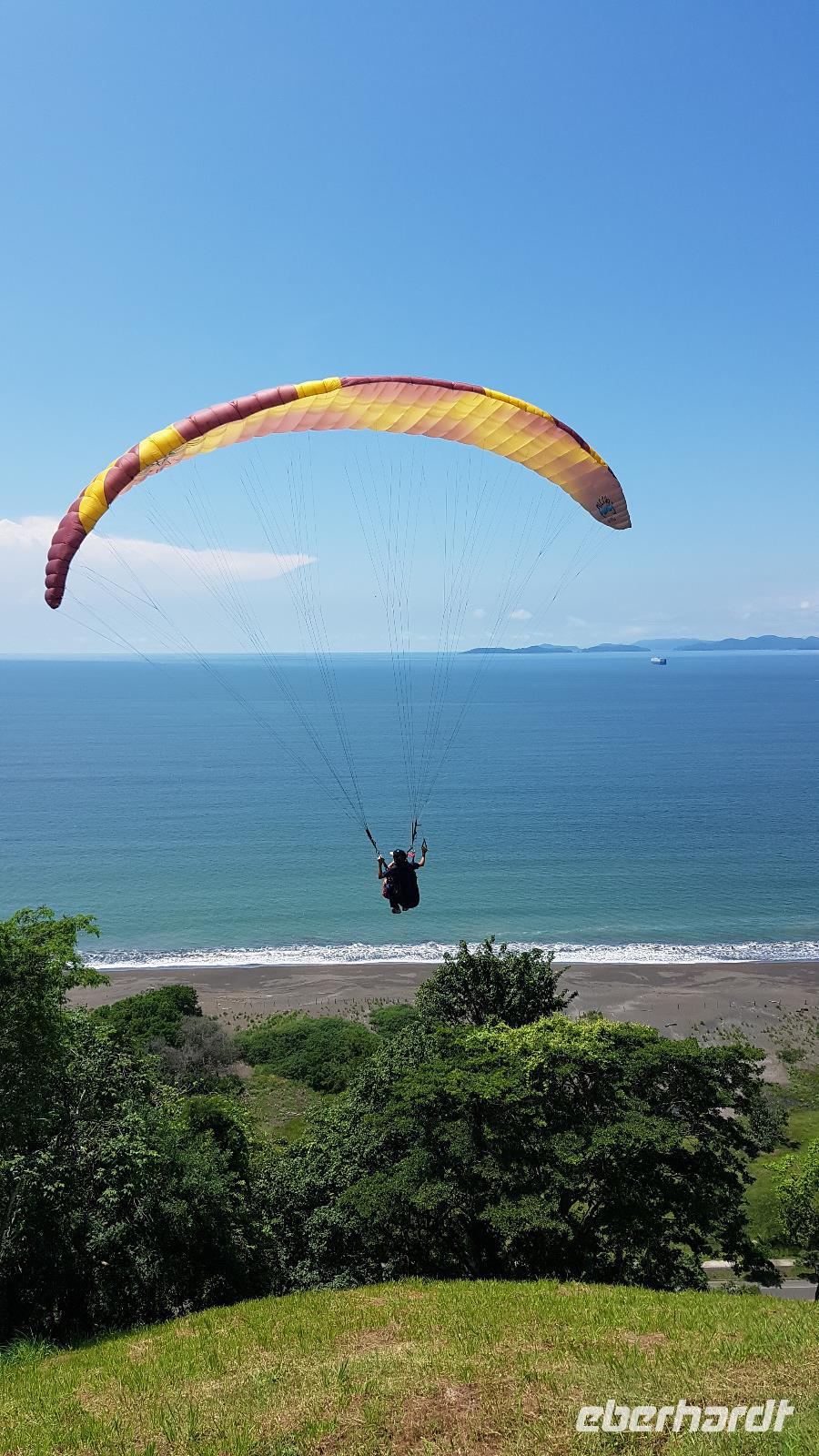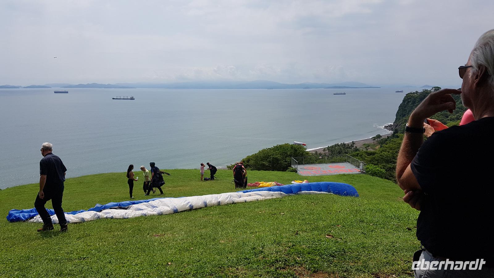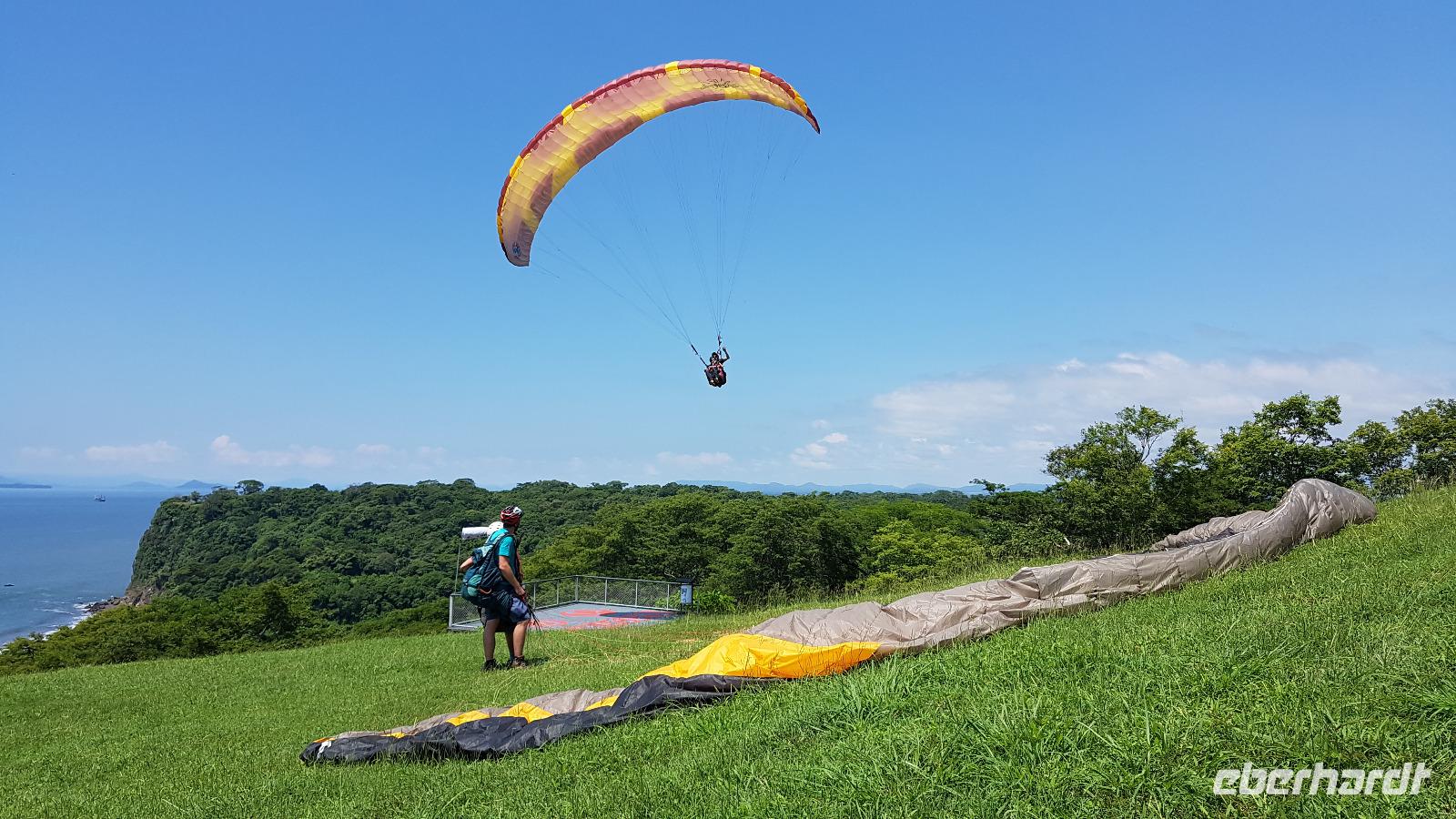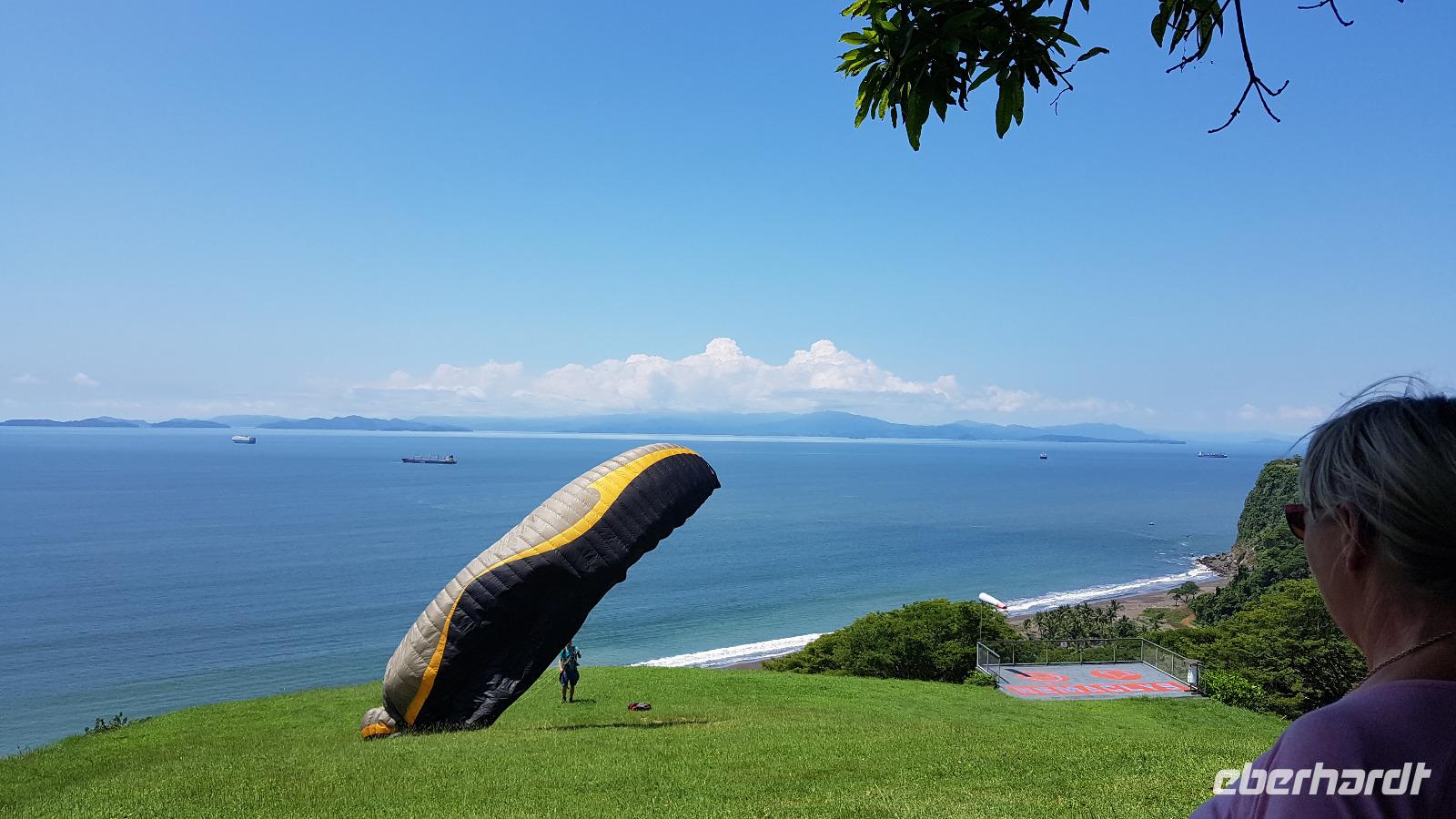 Am Vorabend hatte uns Nico nochmals sehr ausführlich zum Gleitschirmfliegen informiert und so fieberten wir diesem Ereignis aufgeregt entgegen. Zunächst musste aber unser Fahrer Truman lernen, die vielen Koffer im neuen Bus zu verstauen. Nachdem das gelungen war, starteten wir aus der Kühle der Bergwelt wieder hinunter an die feuchtwarme Pazifikküste. Unterwegs unterhielt uns Nico mit seiner Erzählung zum Erlangen einer Aufenthaltsgenehmigung in Costa Rica. Dabei dachten wir schon, in Deutschland ginge es bürokratisch zu, aber.....Am späten Vormittag erreichten wir dann die Absprungbasis fürs Gleitschirmfliegen, hoch oben über dem Strand von Caldera mit Blick auf den Pazifik. Die Sonne schien, aber es war nicht genug Wind. So warteten wir geduldig und dann endlich ging es los. Zunächst erfolgte wieder eine Einweisung am "Modell Karin" und sie durfte dann mit Jean-Claude als erste in die Luft gehen. Kurz darauf startete Nico mit seinem Gleitschirm und Uta im "Gepäck". Aber sein Schirm war kleiner als der von Jean-Claude und der Wind zu wenig und so landeten die beiden nicht planmässig, sondern unten am Meer und mussten dort geborgen werden. Danach wurde der Wind aber stärker und so konnten fast alle nacheinander ihren Gleitschirmflug absolvieren. Mit einer Stunde Verspätung wegen Stau, kam ein dritter Pilot Freddy dazu und nun waren ständig Starts und Landungen angesagt. Abenteuer Nr.3 lief gut. Mit Sorge blickte ich zum Himmel, wo ein Gewitter aufzog und uns leider kurz bevor alle geflogen waren, zum Aufgeben zwang. Das war sehr sehr traurig für die beiden Personen, die nun nicht mehr starten konnten. Mit den 3 Piloten stiessen wir mit einem guten Rum auf die Gleitschirmflüge an und wir bedankten uns sehr herzlich.
