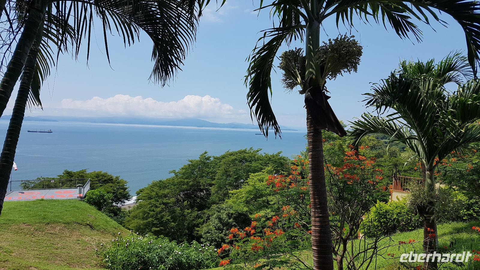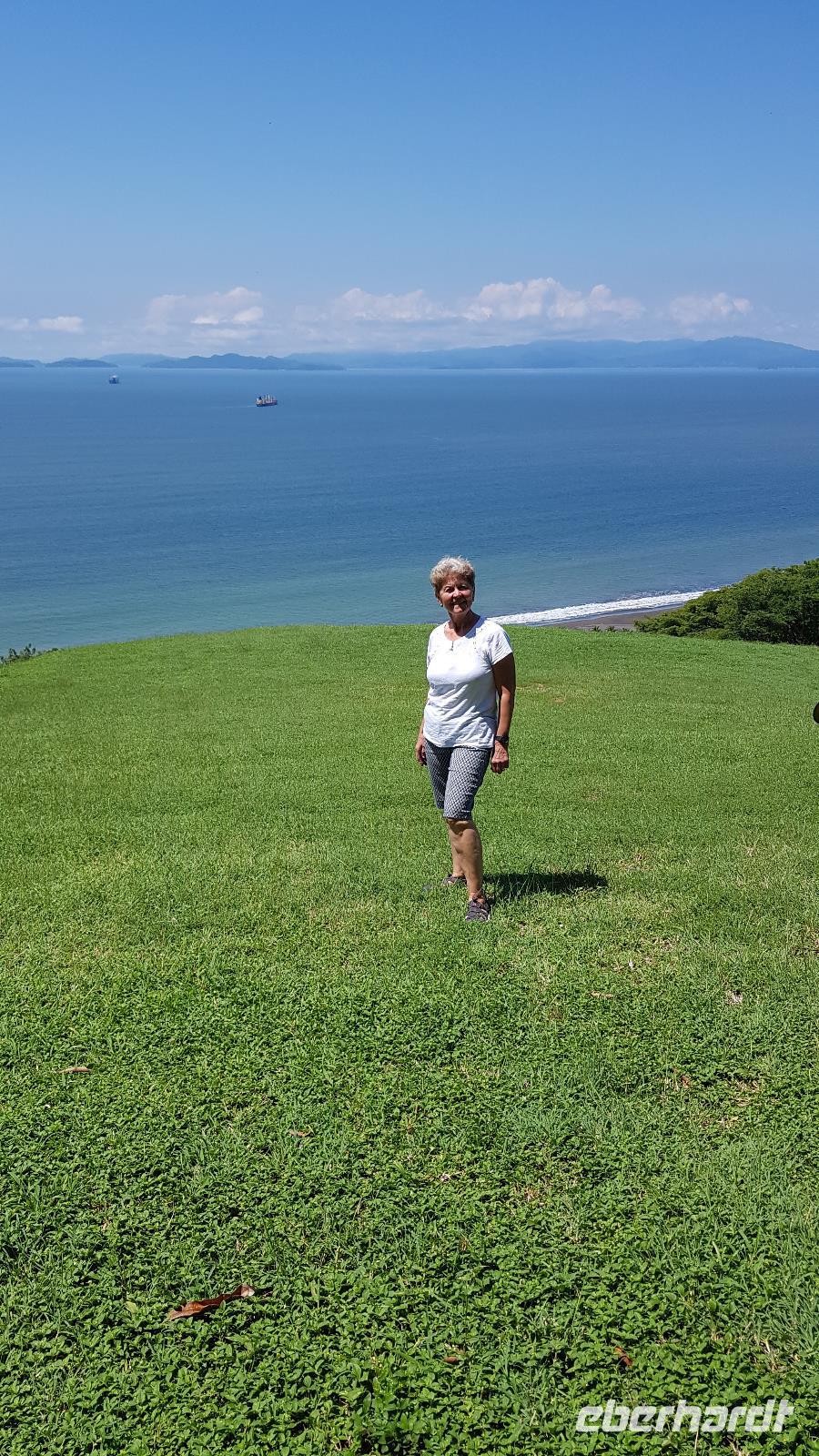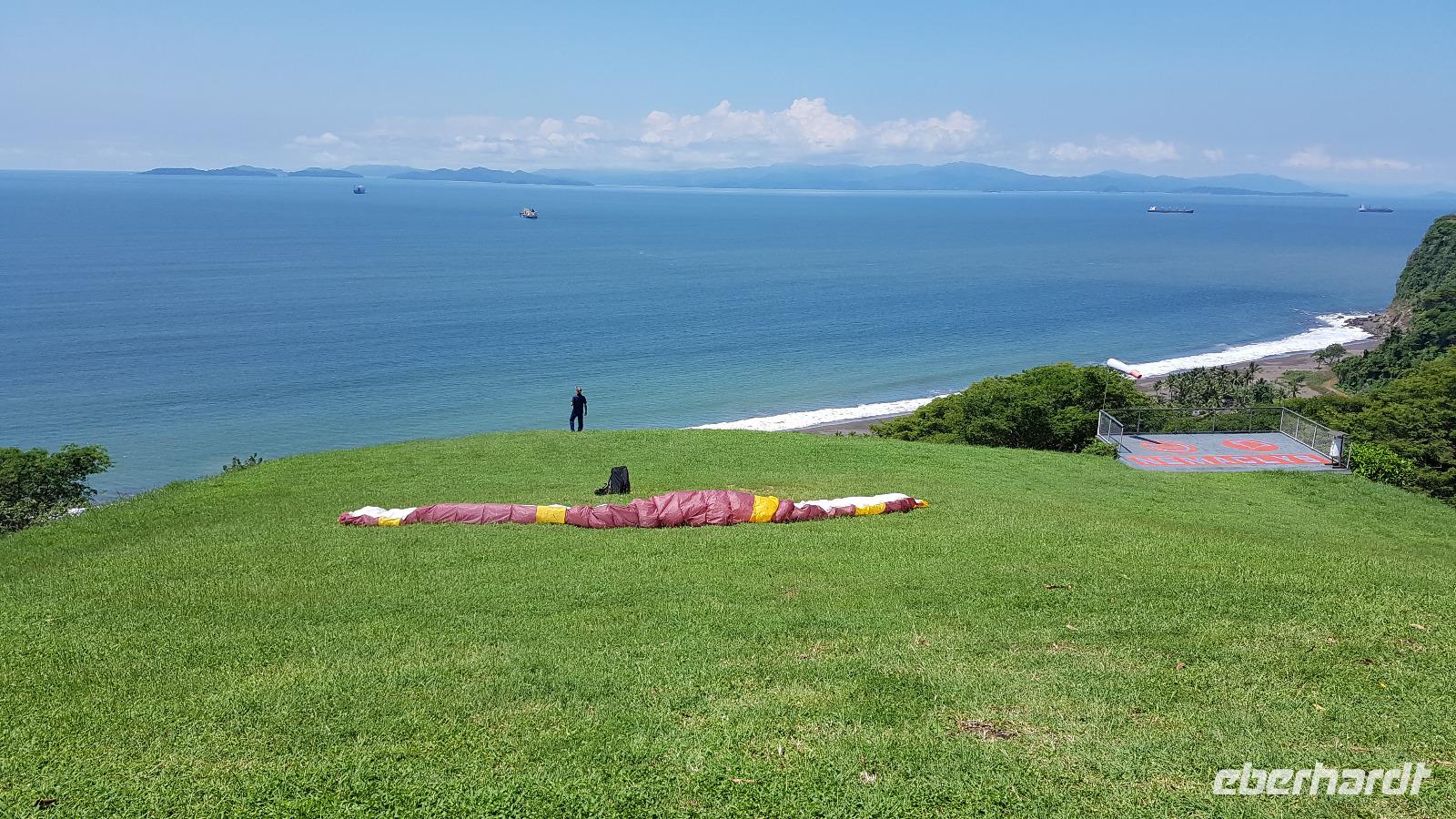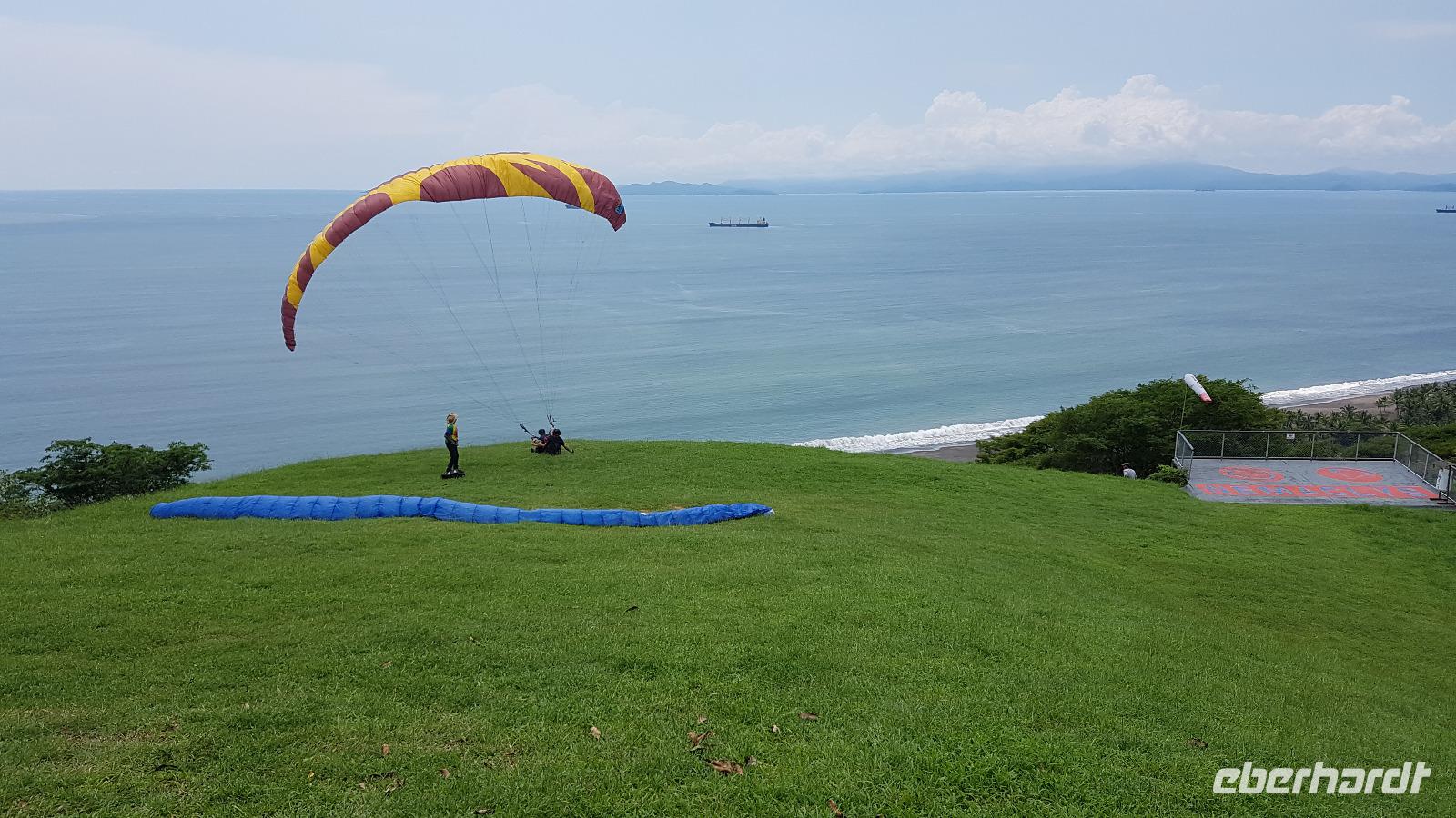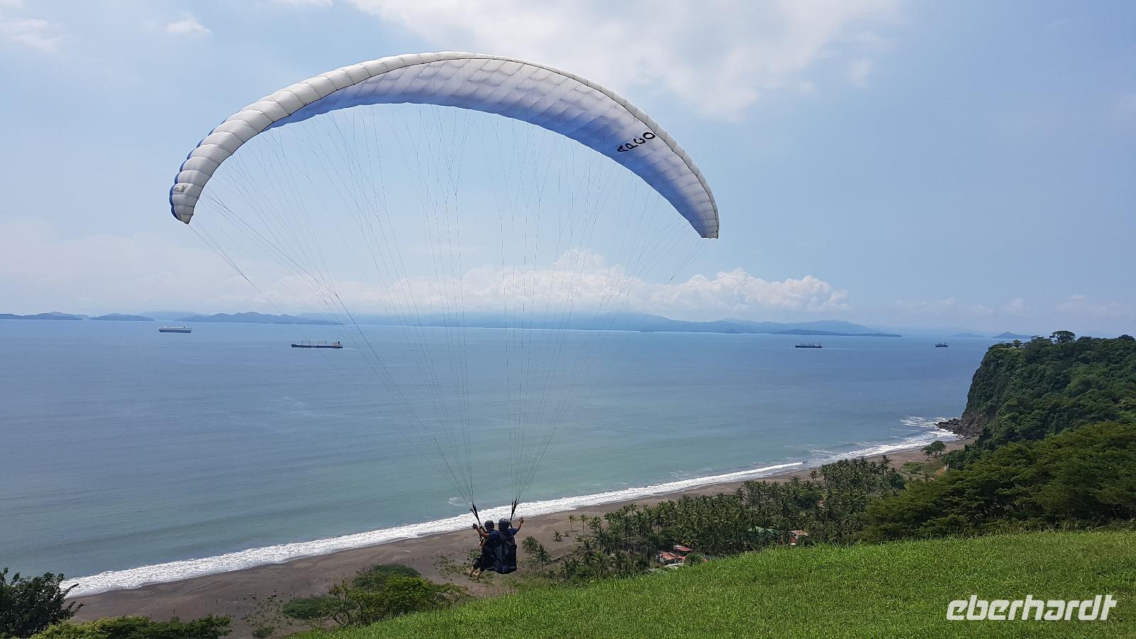 Am Vorabend hatte uns Nico nochmals sehr ausführlich zum Gleitschirmfliegen informiert und so fieberten wir diesem Ereignis aufgeregt entgegen. Zunächst musste aber unser Fahrer Truman lernen, die vielen Koffer im neuen Bus zu verstauen. Nachdem das gelungen war, starteten wir aus der Kühle der Bergwelt wieder hinunter an die feuchtwarme Pazifikküste. Unterwegs unterhielt uns Nico mit seiner Erzählung zum Erlangen einer Aufenthaltsgenehmigung in Costa Rica. Dabei dachten wir schon, in Deutschland ginge es bürokratisch zu, aber.....Am späten Vormittag erreichten wir dann die Absprungbasis fürs Gleitschirmfliegen, hoch oben über dem Strand von Caldera mit Blick auf den Pazifik. Die Sonne schien, aber es war nicht genug Wind. So warteten wir geduldig und dann endlich ging es los. Zunächst erfolgte wieder eine Einweisung am "Modell Karin" und sie durfte dann mit Jean-Claude als erste in die Luft gehen. Kurz darauf startete Nico mit seinem Gleitschirm und Uta im "Gepäck". Aber sein Schirm war kleiner als der von Jean-Claude und der Wind zu wenig und so landeten die beiden nicht planmässig, sondern unten am Meer und mussten dort geborgen werden. Danach wurde der Wind aber stärker und so konnten fast alle nacheinander ihren Gleitschirmflug absolvieren. Mit einer Stunde Verspätung wegen Stau, kam ein dritter Pilot Freddy dazu und nun waren ständig Starts und Landungen angesagt. Abenteuer Nr.3 lief gut. Mit Sorge blickte ich zum Himmel, wo ein Gewitter aufzog und uns leider kurz bevor alle geflogen waren, zum Aufgeben zwang. Das war sehr sehr traurig für die beiden Personen, die nun nicht mehr starten konnten. Mit den 3 Piloten stiessen wir mit einem guten Rum auf die Gleitschirmflüge an und wir bedankten uns sehr herzlich.