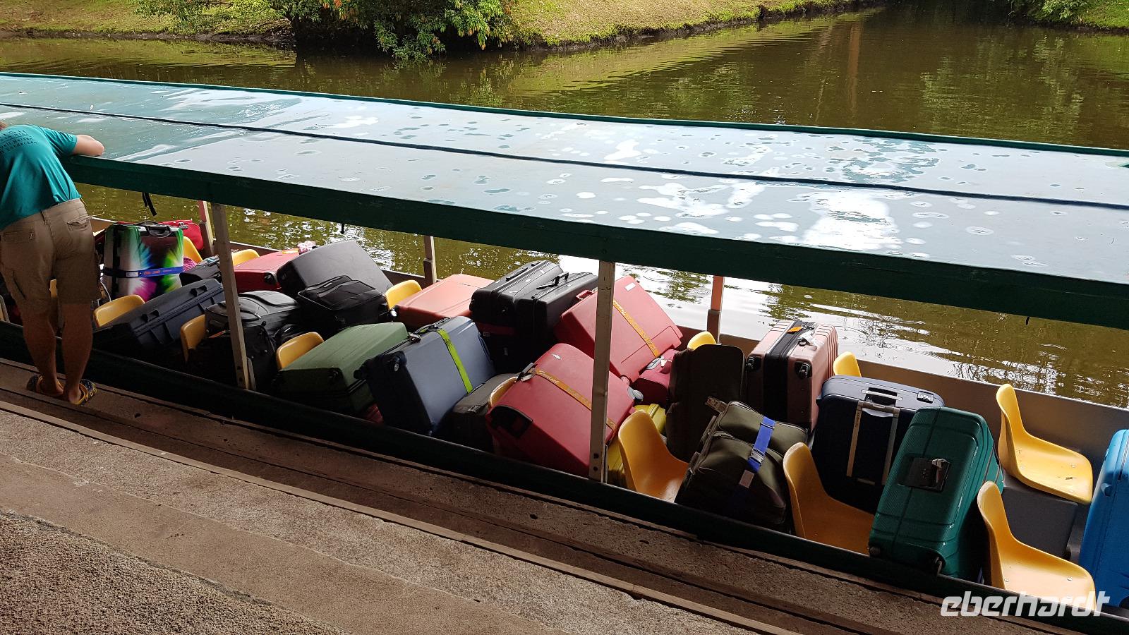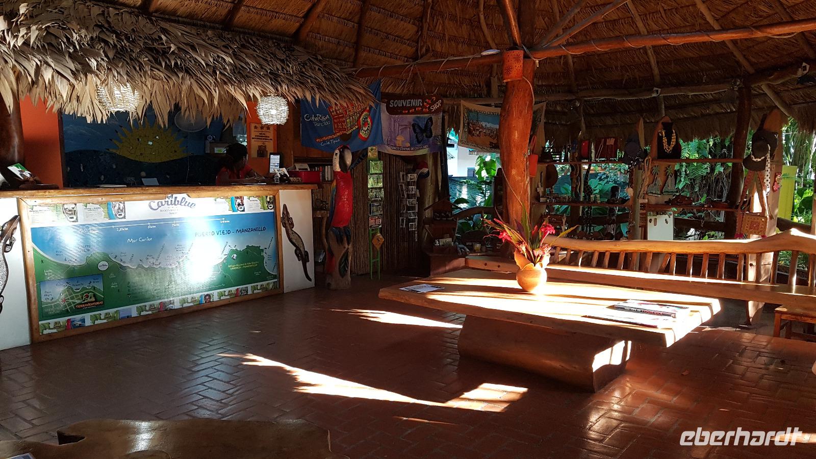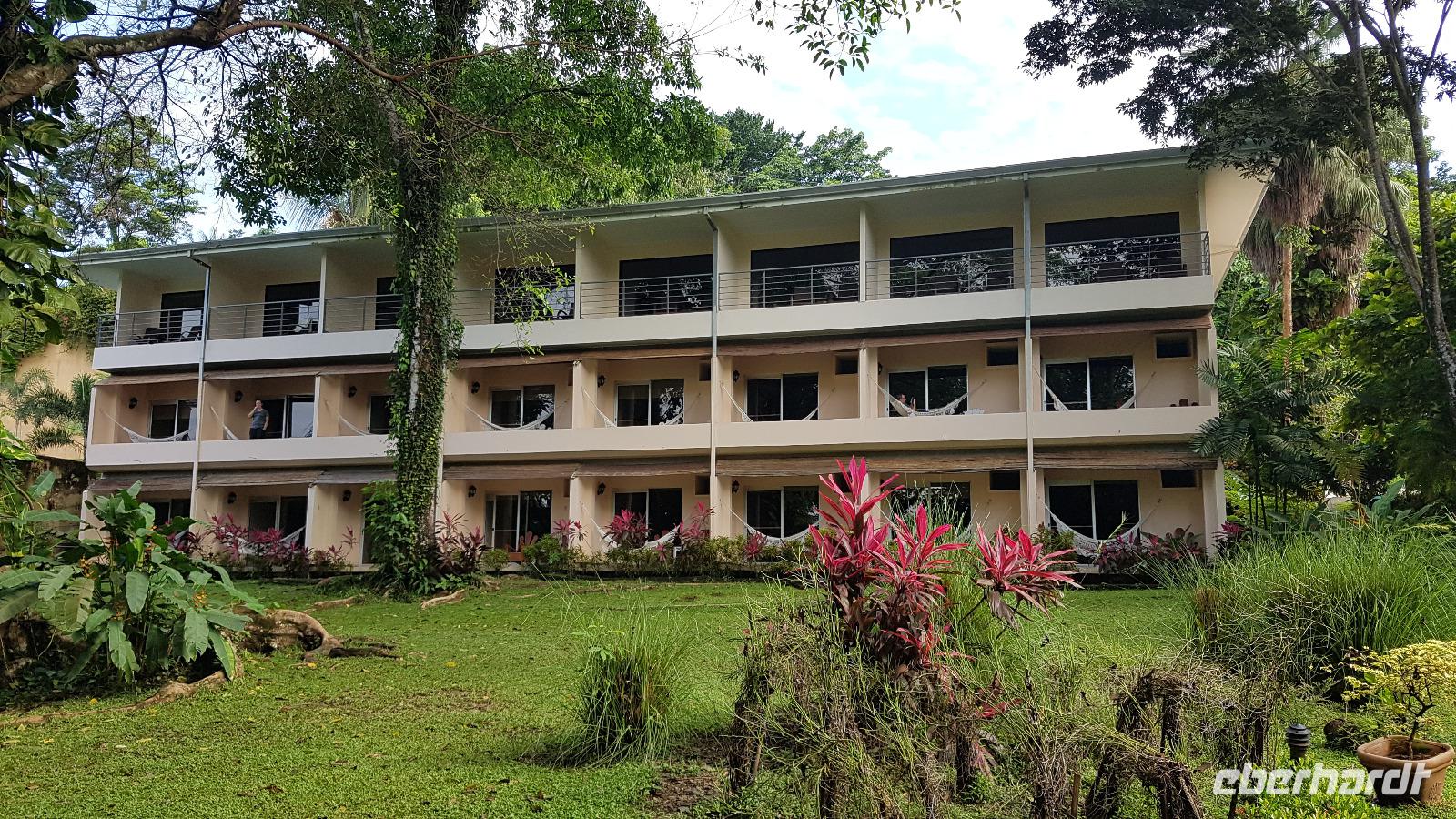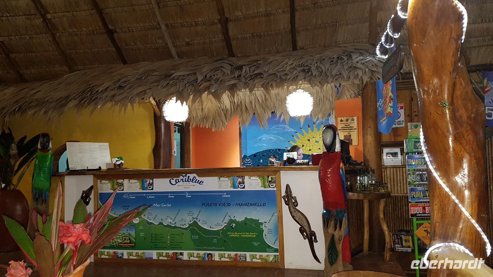 Da unsere Lodge nur per Boot zu erreichen war, brauchten wir für die Abreise wieder Boote, eins für die Koffer und eins für die Singles. Zum Abschied zeigte sich der "Haus"kaiman noch einmal, so als wollte er tschüss sagen. Augusto brachte uns zunächst auf schon bekannter Strecke und dann über einen Fluss mit vielen Windungen und Unrat drin zur Bootsanlagestelle. Dort trafen wir wieder auf Truman mit unserem Bus. Aber he, wer sitzt denn da am Steuer ? Nach kurzer Fahrtstrecke erreichten wir das Selva Tropical Restaurant, wo wir unser Mittagessen einnahmen. Nach dem Essen konnten wir im Schmetterlingsgarten die Schmetterlinge ganz nah beobachten und natürlich auch fotografieren. Und dann folgte eine sehr lange Busfahrt bis ganz an die Südküste. Puerto Limon an der Karibikküste ist der wichtigste Seehafen Costa Ricas und so wurde die Strasse dorthin 4spurig ausgebaut. Im Bereich der Baustelle gab es einen Unfall mit sehr langem Stau. Das kostet uns viel Zeit und Truman brauchte Geduld. Dann endlich kam das Meer in Sicht und nun war es nicht mehr weit bis zu unserem Hotel Cariblue. Dort gab es wieder einen Welcome Drink und jeder bekam ein Bändchen an den Arm mit seiner Zimmernummer. Wir wohnten in hübschen Häusern, die in der tropischen Anlage verstreut lagen. Das Abendessen nahmen wir im Hotel Restaurant ein.