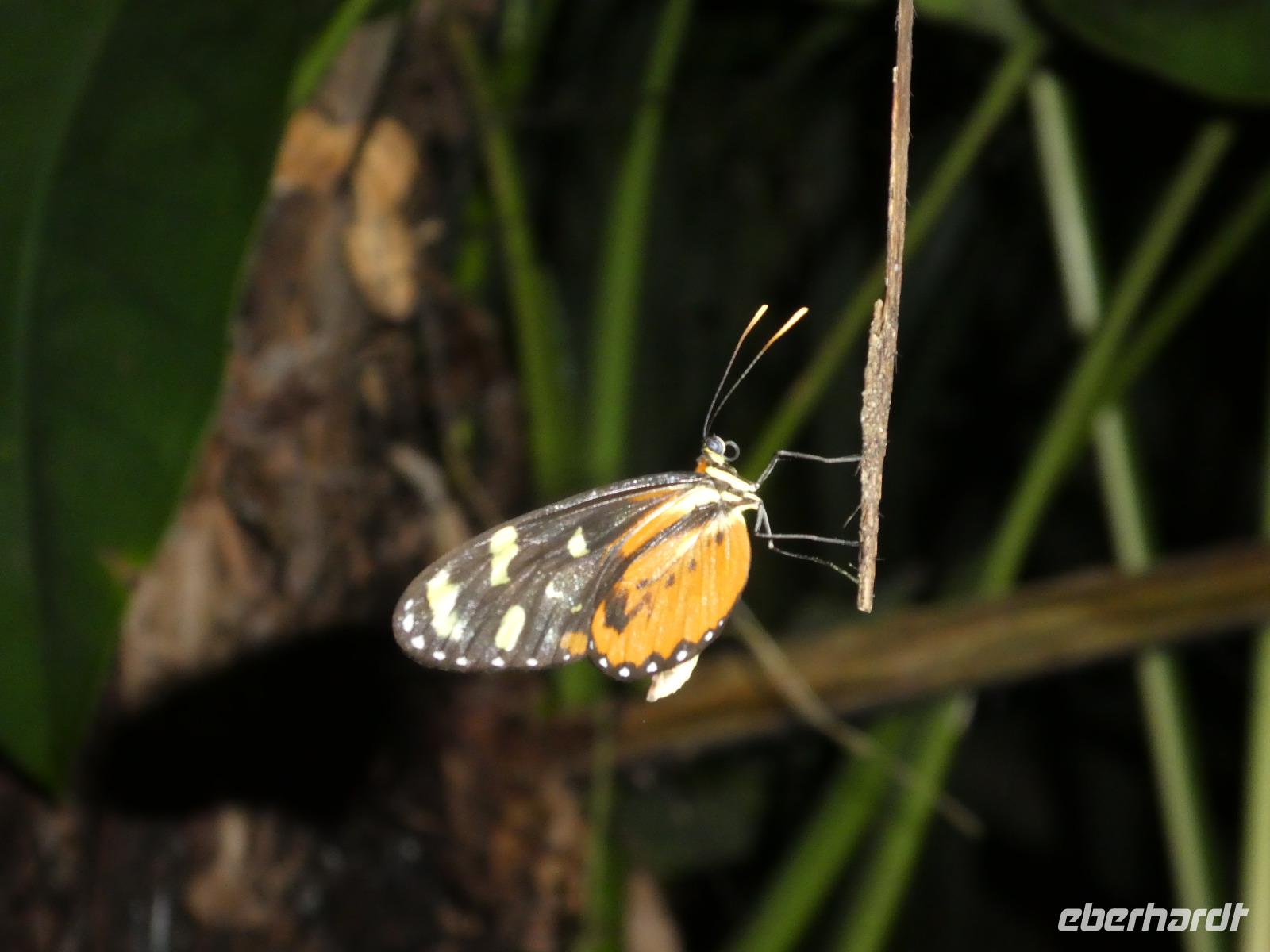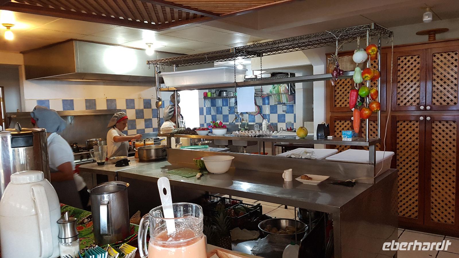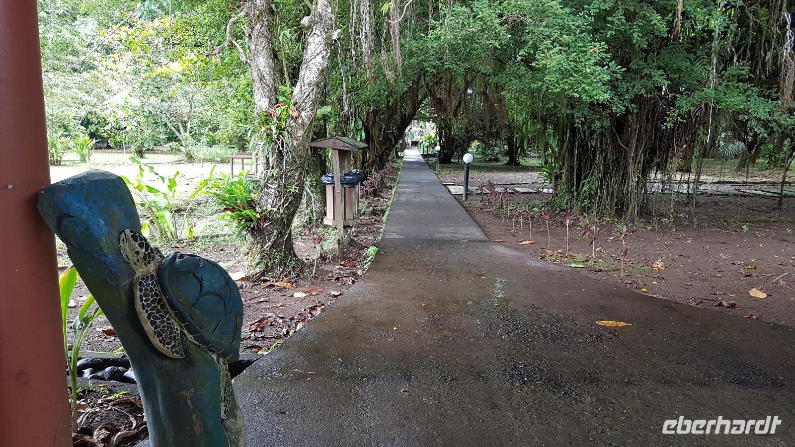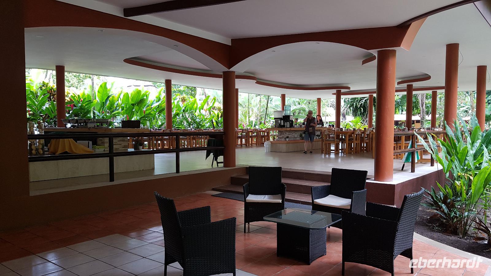 Da unsere Lodge nur per Boot zu erreichen war, brauchten wir für die Abreise wieder Boote, eins für die Koffer und eins für die Singles. Zum Abschied zeigte sich der "Haus"kaiman noch einmal, so als wollte er tschüss sagen. Augusto brachte uns zunächst auf schon bekannter Strecke und dann über einen Fluss mit vielen Windungen und Unrat drin zur Bootsanlagestelle. Dort trafen wir wieder auf Truman mit unserem Bus. Aber he, wer sitzt denn da am Steuer ? Nach kurzer Fahrtstrecke erreichten wir das Selva Tropical Restaurant, wo wir unser Mittagessen einnahmen. Nach dem Essen konnten wir im Schmetterlingsgarten die Schmetterlinge ganz nah beobachten und natürlich auch fotografieren. Und dann folgte eine sehr lange Busfahrt bis ganz an die Südküste. Puerto Limon an der Karibikküste ist der wichtigste Seehafen Costa Ricas und so wurde die Strasse dorthin 4spurig ausgebaut. Im Bereich der Baustelle gab es einen Unfall mit sehr langem Stau. Das kostet uns viel Zeit und Truman brauchte Geduld. Dann endlich kam das Meer in Sicht und nun war es nicht mehr weit bis zu unserem Hotel Cariblue. Dort gab es wieder einen Welcome Drink und jeder bekam ein Bändchen an den Arm mit seiner Zimmernummer. Wir wohnten in hübschen Häusern, die in der tropischen Anlage verstreut lagen. Das Abendessen nahmen wir im Hotel Restaurant ein.