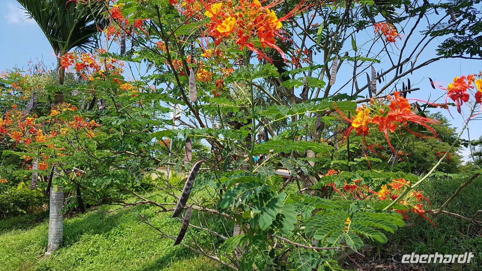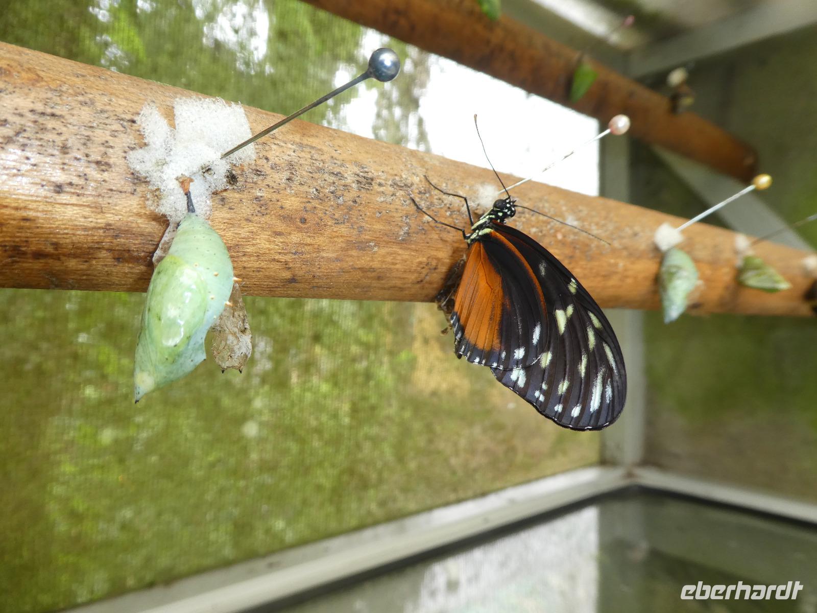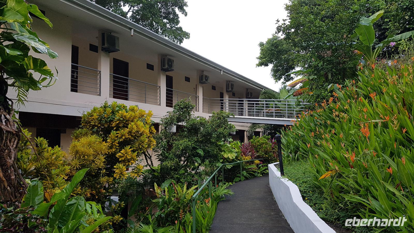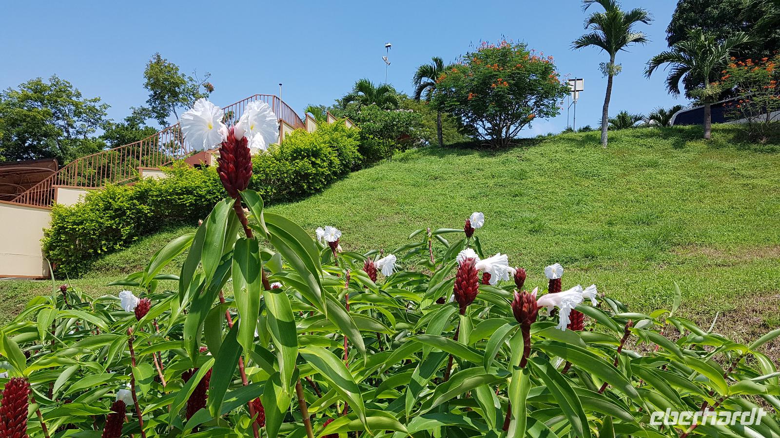 Da unsere Lodge nur per Boot zu erreichen war, brauchten wir für die Abreise wieder Boote, eins für die Koffer und eins für die Singles. Zum Abschied zeigte sich der "Haus"kaiman noch einmal, so als wollte er tschüss sagen. Augusto brachte uns zunächst auf schon bekannter Strecke und dann über einen Fluss mit vielen Windungen und Unrat drin zur Bootsanlagestelle. Dort trafen wir wieder auf Truman mit unserem Bus. Aber he, wer sitzt denn da am Steuer ? Nach kurzer Fahrtstrecke erreichten wir das Selva Tropical Restaurant, wo wir unser Mittagessen einnahmen. Nach dem Essen konnten wir im Schmetterlingsgarten die Schmetterlinge ganz nah beobachten und natürlich auch fotografieren. Und dann folgte eine sehr lange Busfahrt bis ganz an die Südküste. Puerto Limon an der Karibikküste ist der wichtigste Seehafen Costa Ricas und so wurde die Strasse dorthin 4spurig ausgebaut. Im Bereich der Baustelle gab es einen Unfall mit sehr langem Stau. Das kostet uns viel Zeit und Truman brauchte Geduld. Dann endlich kam das Meer in Sicht und nun war es nicht mehr weit bis zu unserem Hotel Cariblue. Dort gab es wieder einen Welcome Drink und jeder bekam ein Bändchen an den Arm mit seiner Zimmernummer. Wir wohnten in hübschen Häusern, die in der tropischen Anlage verstreut lagen. Das Abendessen nahmen wir im Hotel Restaurant ein.