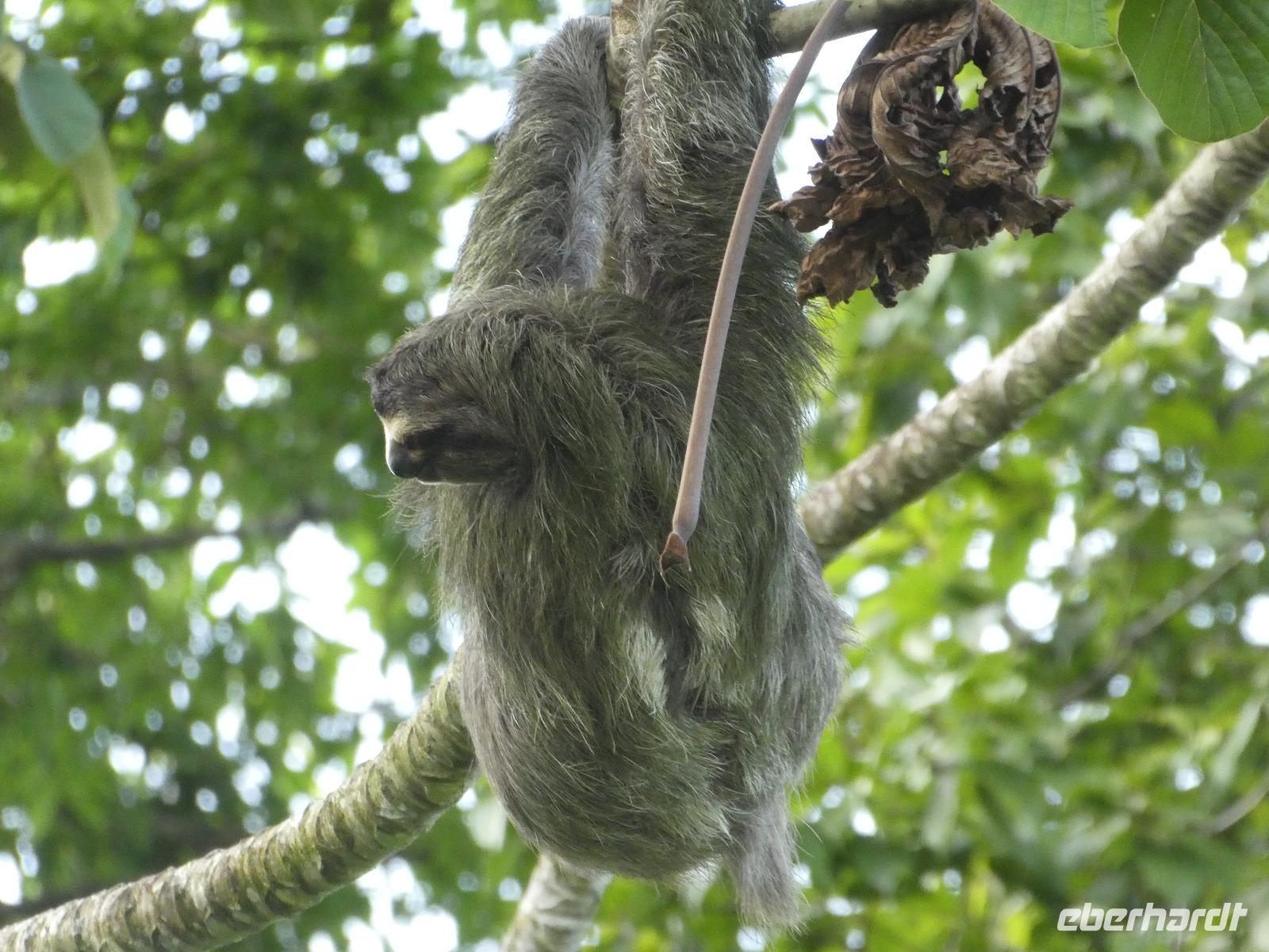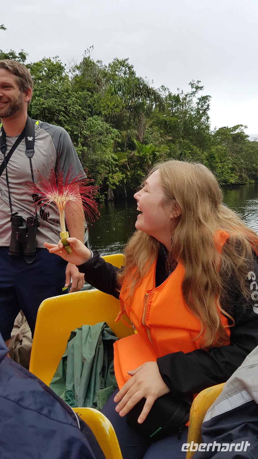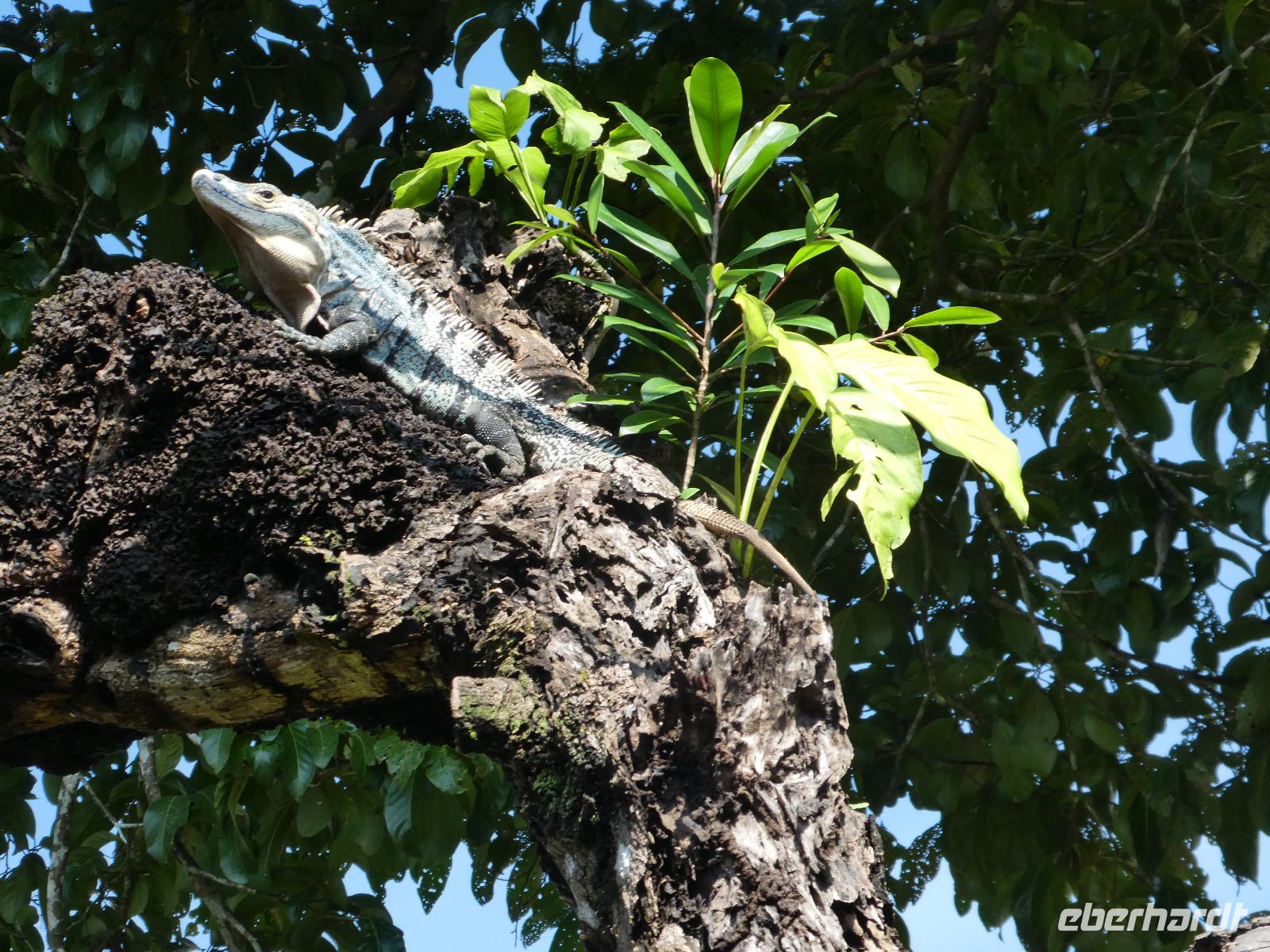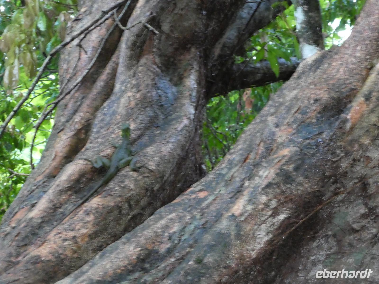 Mit einem frühen Morgenkaffee im Bauch starteten wir 6 Uhr zu unserer ersten Bootsfahrt, eingehüllt in unsere Regencaps. Wir fuhren mit Bootsführer Augusto entlang der Wasserkanäle und er sowie Nico spürten für uns die Tiere auf. Besonders spektakulär waren 5 Fledermäuse, die unter einem abgestorbenen Stamm hingen. Aber auch Leguane, Basilisken, Tukane, Schlangenhalsvögel, verschiedene Reiher und ein Marmorreiher Jungvogel im Nest waren u.a. zu beobachten. Nico "erntete" eine lange Frucht vom Provisionsbaum, schnitt sie an und Hokus pokus entfaltete sich eine tolle Blüte daraus. Kurz nach 8 Uhr waren wir zurück in der Lodge und frühstückten erst einmal. Wenig später gings dann schon weiter mit einer Kajaktour, bei der wir für die Fortbewegung selber sorgen mussten. Wir nahmen 3 Einer Kajaks und 2 grosse Boote und los ging es bei Regen. Diesmal stand die sportliche Fortbewegung im Vordergrund, dennoch entdeckten wir auch weitere Tiere. Am naturbelassenen Strand, der den Schildkröten abends und nachts vorbehalten ist, gingen wir kurz an Land und Nico berichtete über die vielen Schildkrötenarten, die hierher zur Eierablage kommen. Am Abend nahmen dann auch 3 Singles unserer Gruppe an der Schildkrötentour teil und konnten ein grosses Weibchen bei der Eierablage beobachten. Wir aber stiegen wieder in unsere Kajaks und paddelten zurück zur Lodge.