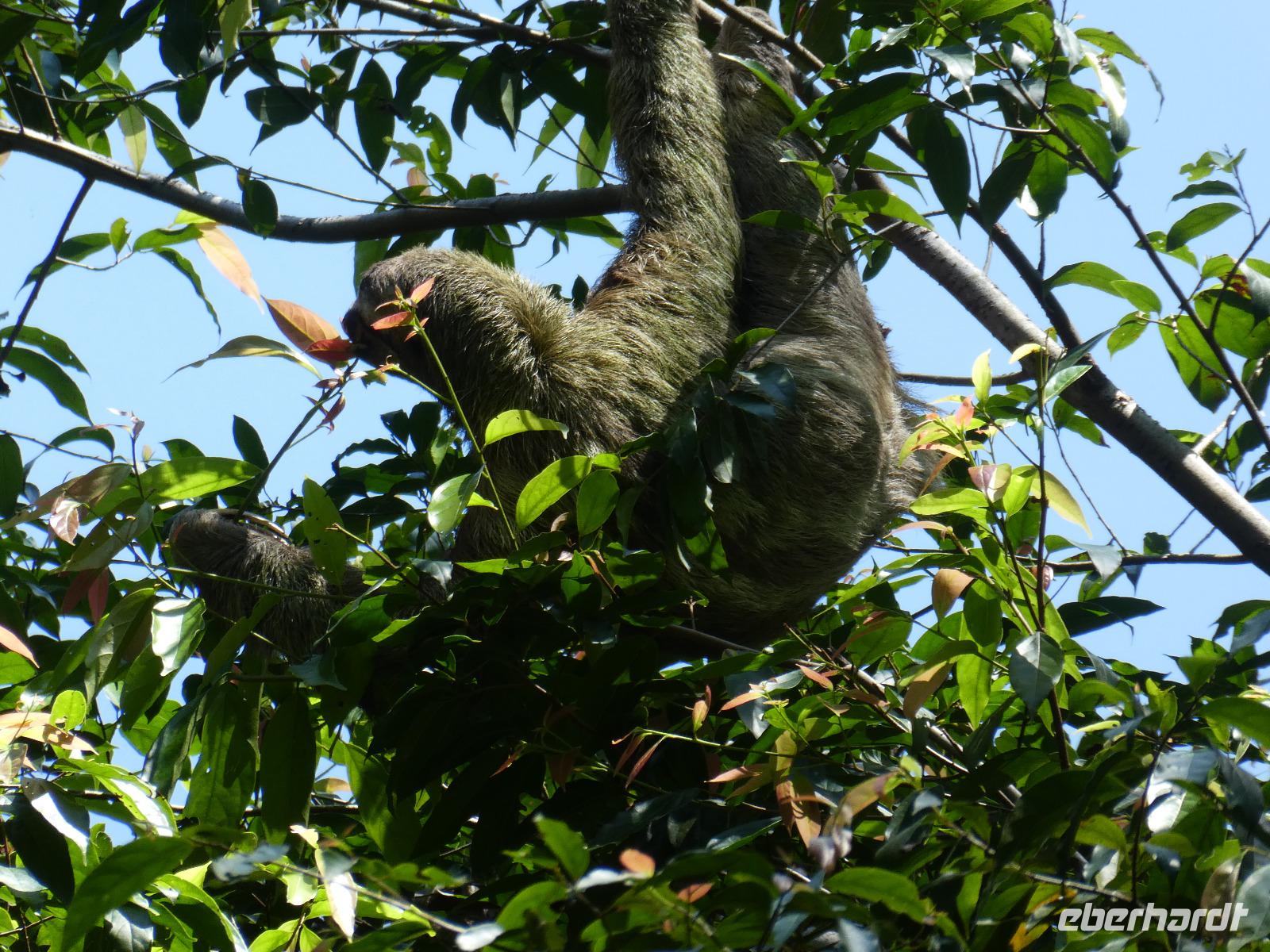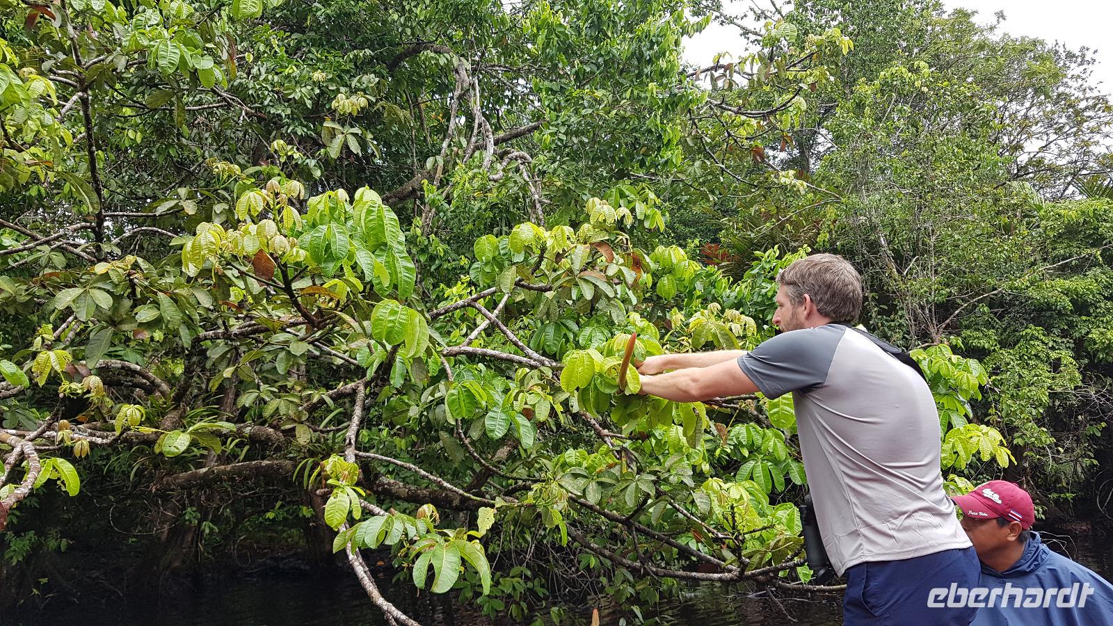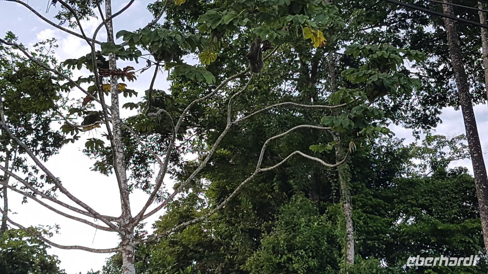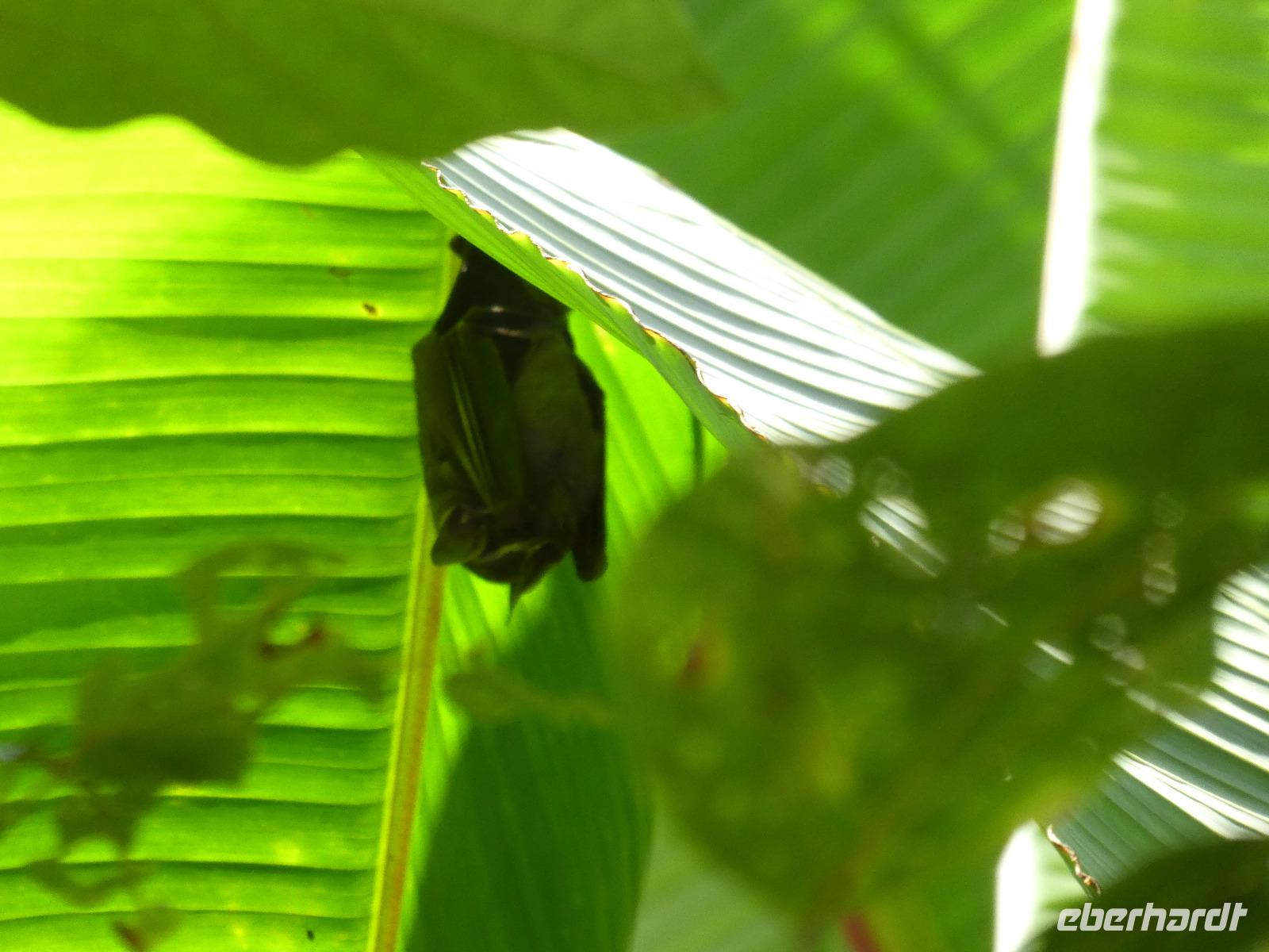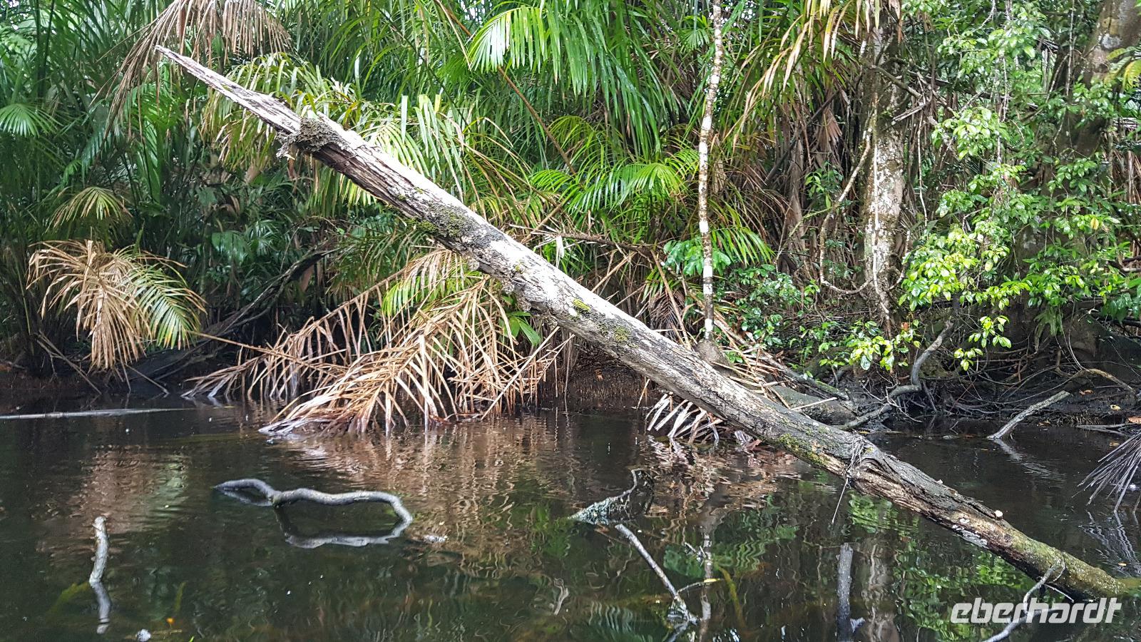 Mit einem frühen Morgenkaffee im Bauch starteten wir 6 Uhr zu unserer ersten Bootsfahrt, eingehüllt in unsere Regencaps. Wir fuhren mit Bootsführer Augusto entlang der Wasserkanäle und er sowie Nico spürten für uns die Tiere auf. Besonders spektakulär waren 5 Fledermäuse, die unter einem abgestorbenen Stamm hingen. Aber auch Leguane, Basilisken, Tukane, Schlangenhalsvögel, verschiedene Reiher und ein Marmorreiher Jungvogel im Nest waren u.a. zu beobachten. Nico "erntete" eine lange Frucht vom Provisionsbaum, schnitt sie an und Hokus pokus entfaltete sich eine tolle Blüte daraus. Kurz nach 8 Uhr waren wir zurück in der Lodge und frühstückten erst einmal. Wenig später gings dann schon weiter mit einer Kajaktour, bei der wir für die Fortbewegung selber sorgen mussten. Wir nahmen 3 Einer Kajaks und 2 grosse Boote und los ging es bei Regen. Diesmal stand die sportliche Fortbewegung im Vordergrund, dennoch entdeckten wir auch weitere Tiere. Am naturbelassenen Strand, der den Schildkröten abends und nachts vorbehalten ist, gingen wir kurz an Land und Nico berichtete über die vielen Schildkrötenarten, die hierher zur Eierablage kommen. Am Abend nahmen dann auch 3 Singles unserer Gruppe an der Schildkrötentour teil und konnten ein grosses Weibchen bei der Eierablage beobachten. Wir aber stiegen wieder in unsere Kajaks und paddelten zurück zur Lodge.