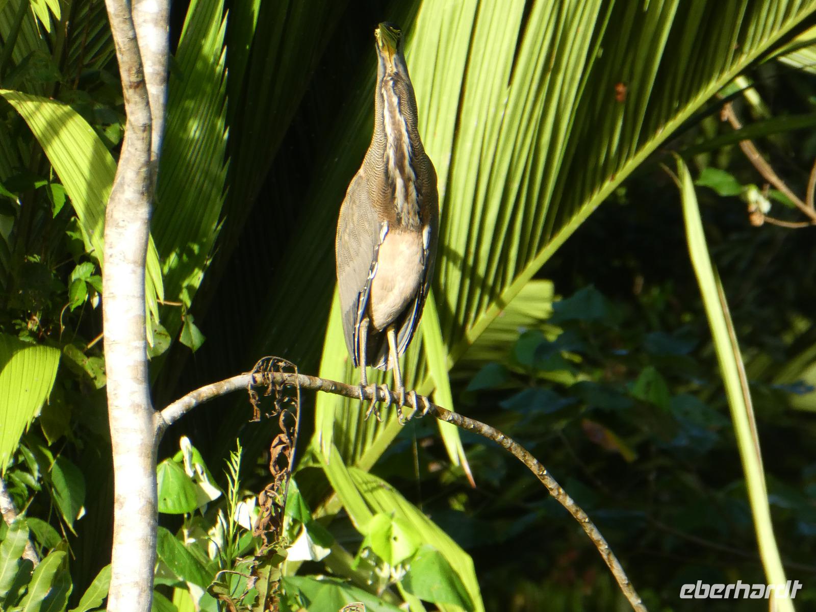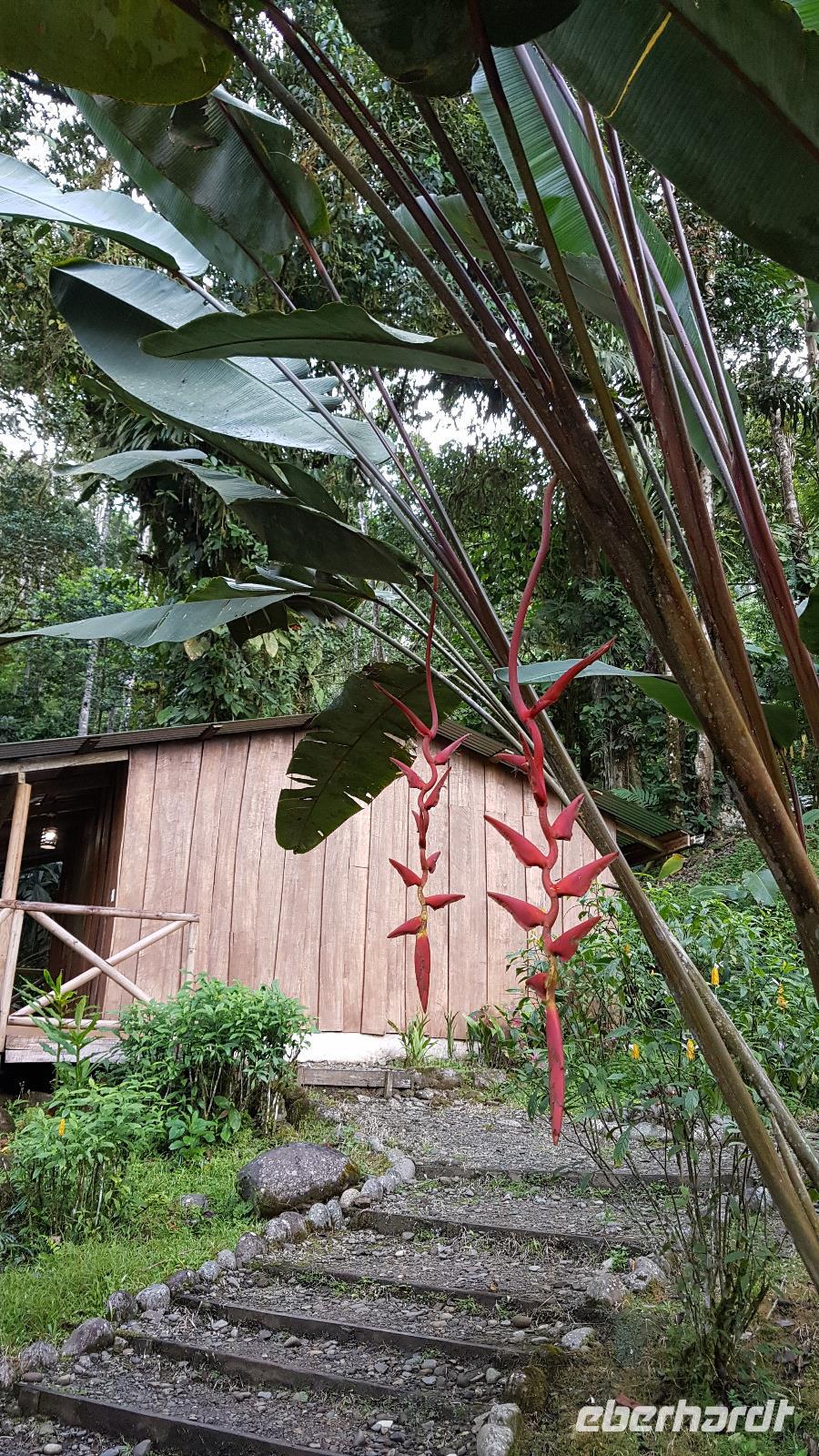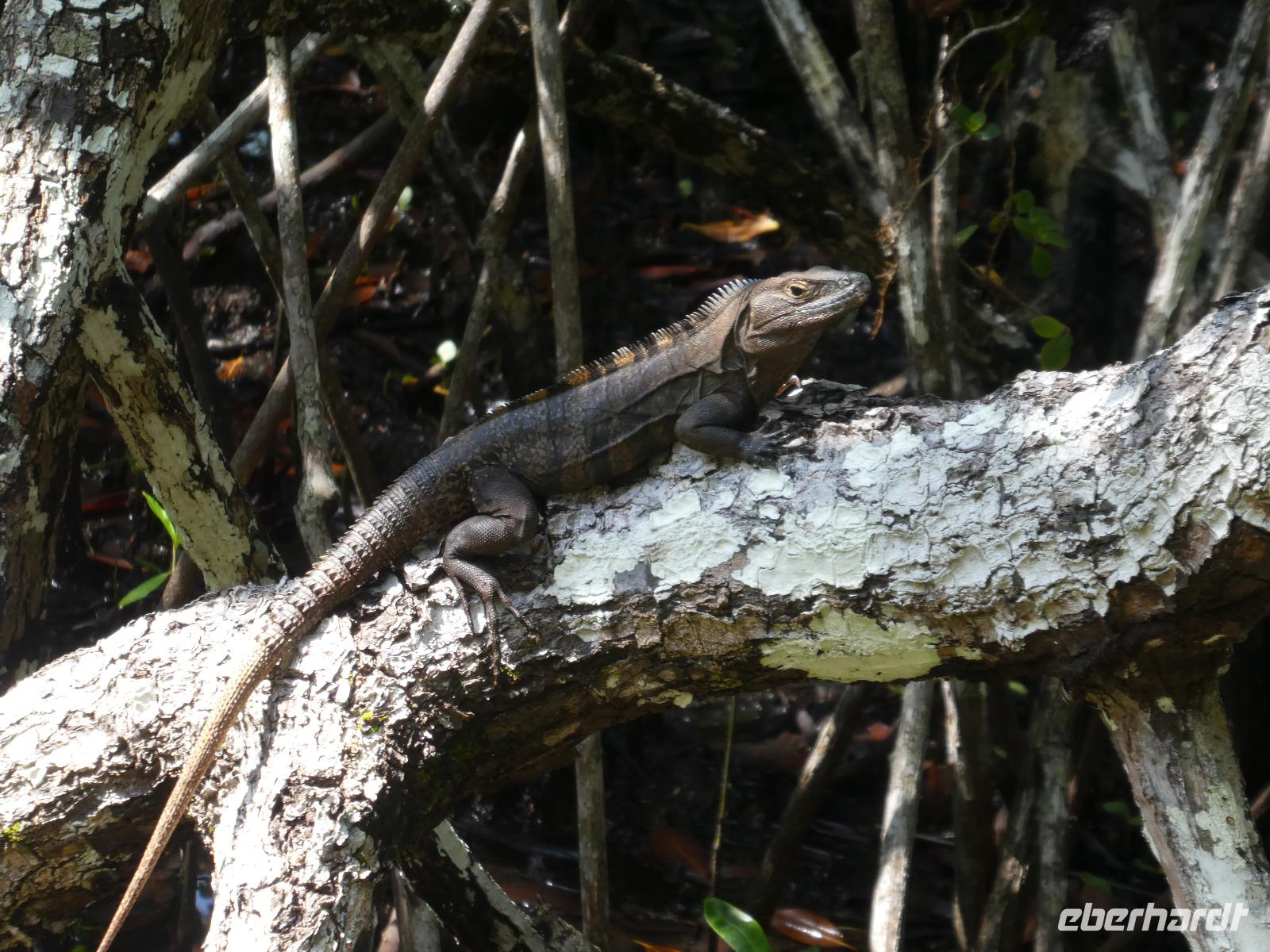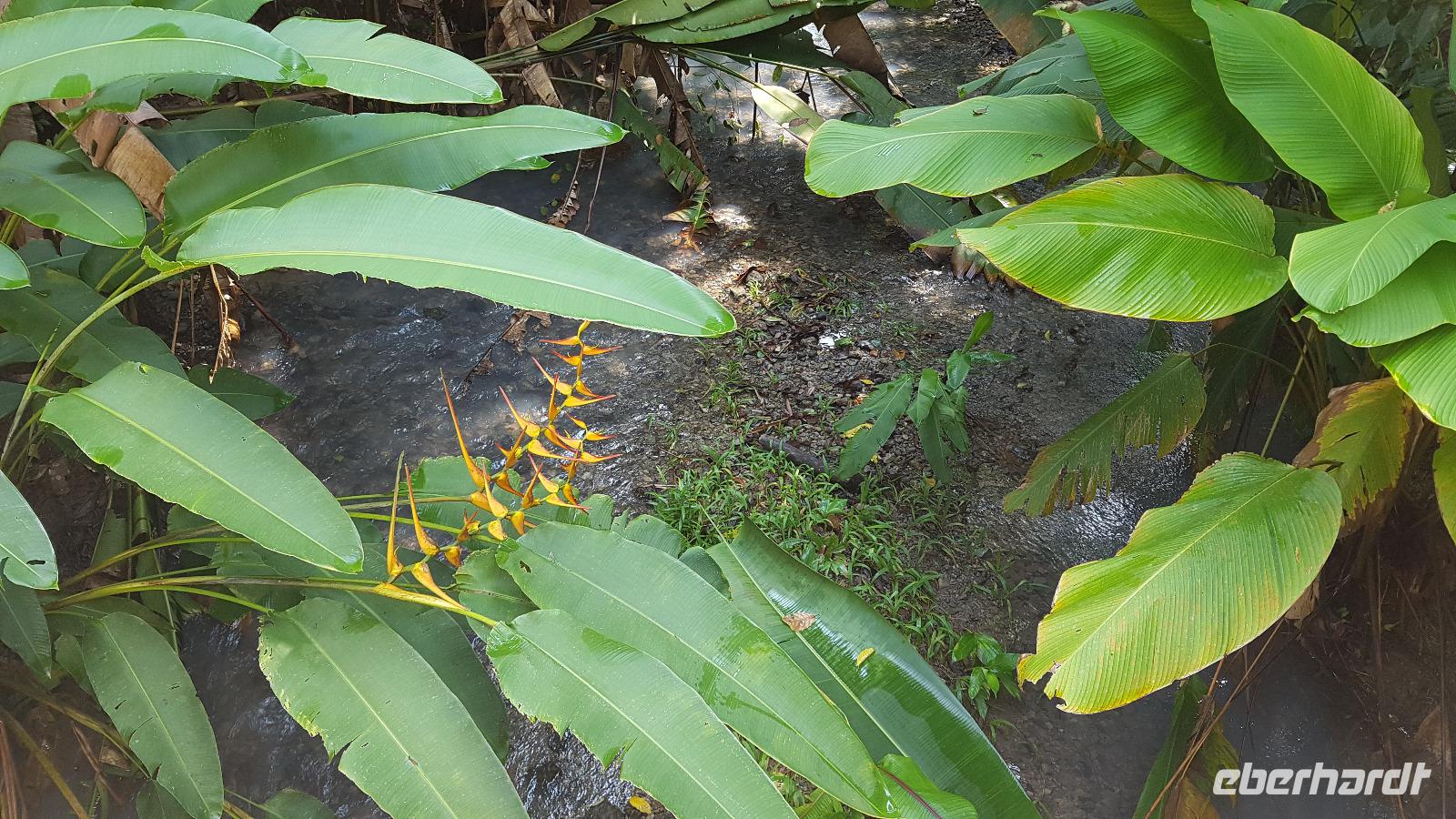 Mit einem frühen Morgenkaffee im Bauch starteten wir 6 Uhr zu unserer ersten Bootsfahrt, eingehüllt in unsere Regencaps. Wir fuhren mit Bootsführer Augusto entlang der Wasserkanäle und er sowie Nico spürten für uns die Tiere auf. Besonders spektakulär waren 5 Fledermäuse, die unter einem abgestorbenen Stamm hingen. Aber auch Leguane, Basilisken, Tukane, Schlangenhalsvögel, verschiedene Reiher und ein Marmorreiher Jungvogel im Nest waren u.a. zu beobachten. Nico "erntete" eine lange Frucht vom Provisionsbaum, schnitt sie an und Hokus pokus entfaltete sich eine tolle Blüte daraus. Kurz nach 8 Uhr waren wir zurück in der Lodge und frühstückten erst einmal. Wenig später gings dann schon weiter mit einer Kajaktour, bei der wir für die Fortbewegung selber sorgen mussten. Wir nahmen 3 Einer Kajaks und 2 grosse Boote und los ging es bei Regen. Diesmal stand die sportliche Fortbewegung im Vordergrund, dennoch entdeckten wir auch weitere Tiere. Am naturbelassenen Strand, der den Schildkröten abends und nachts vorbehalten ist, gingen wir kurz an Land und Nico berichtete über die vielen Schildkrötenarten, die hierher zur Eierablage kommen. Am Abend nahmen dann auch 3 Singles unserer Gruppe an der Schildkrötentour teil und konnten ein grosses Weibchen bei der Eierablage beobachten. Wir aber stiegen wieder in unsere Kajaks und paddelten zurück zur Lodge.