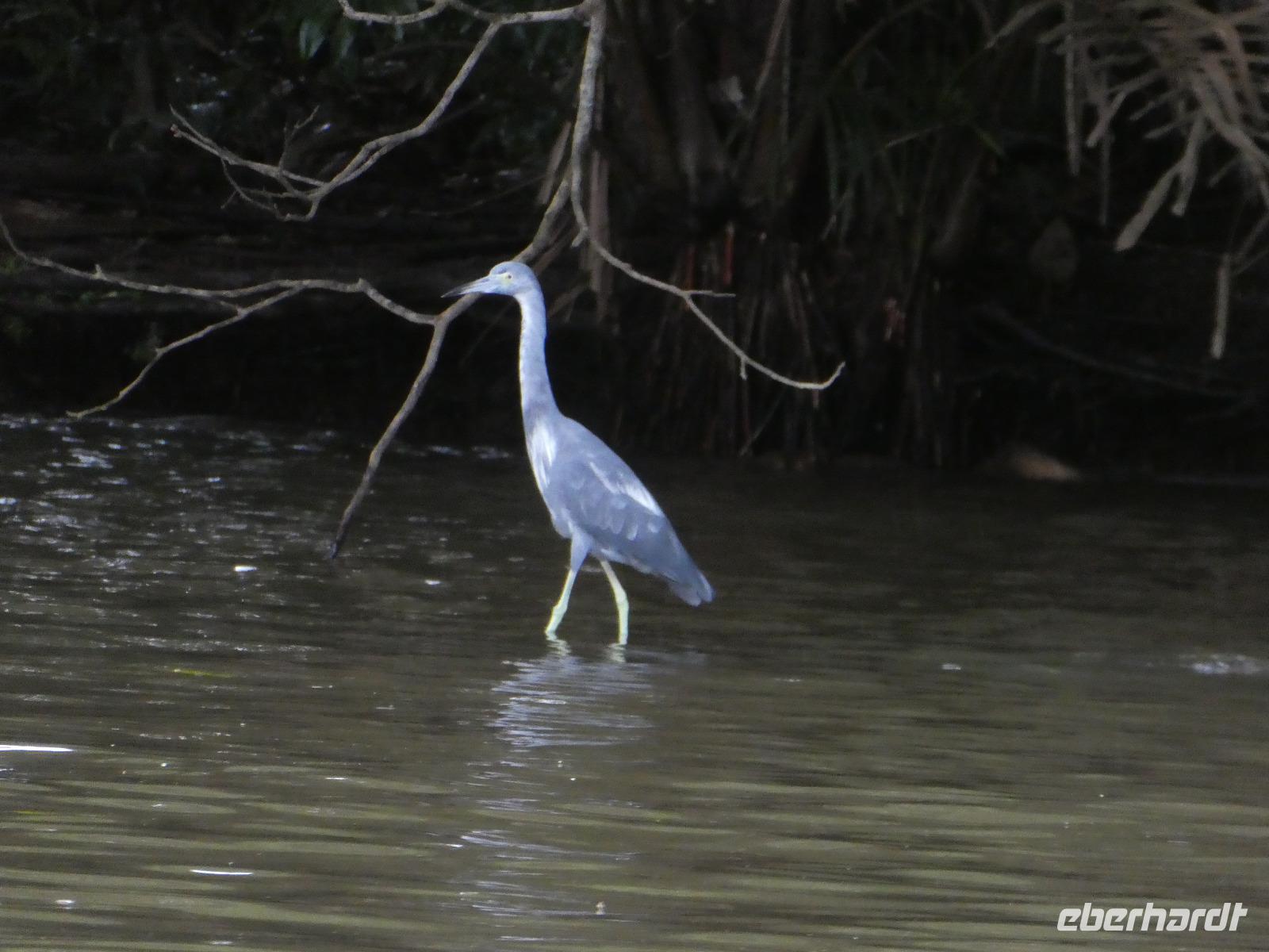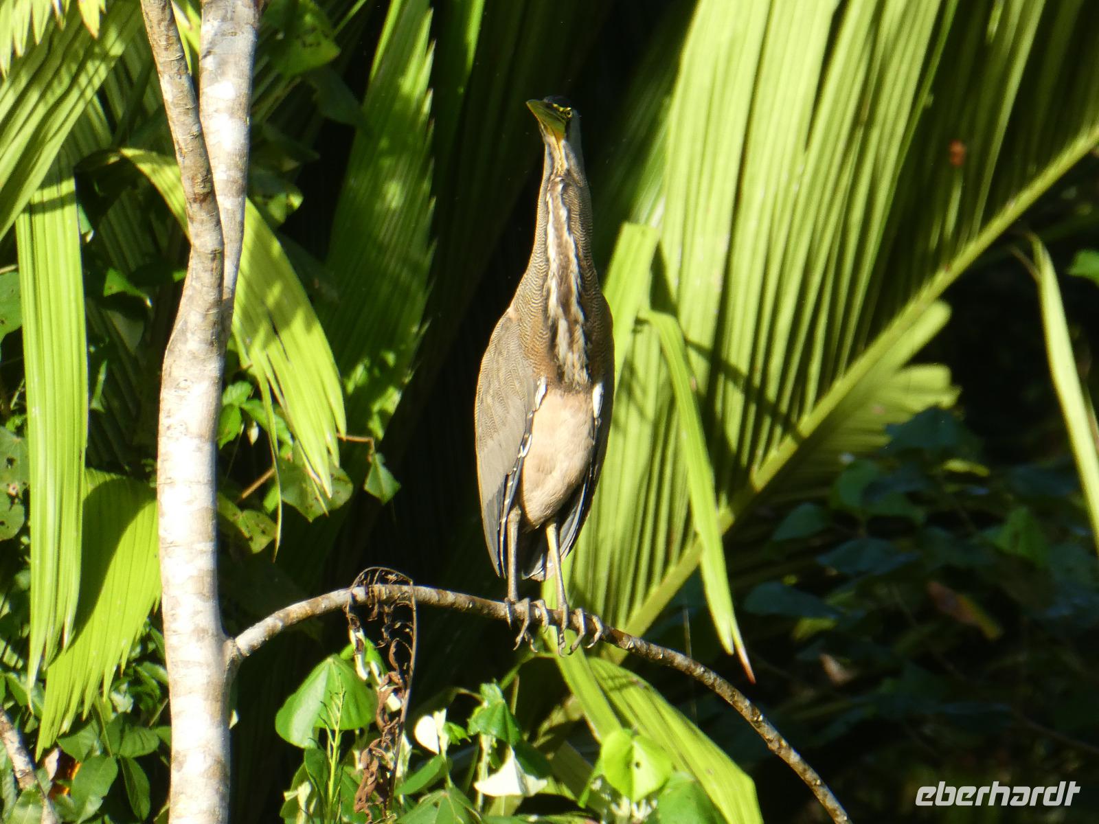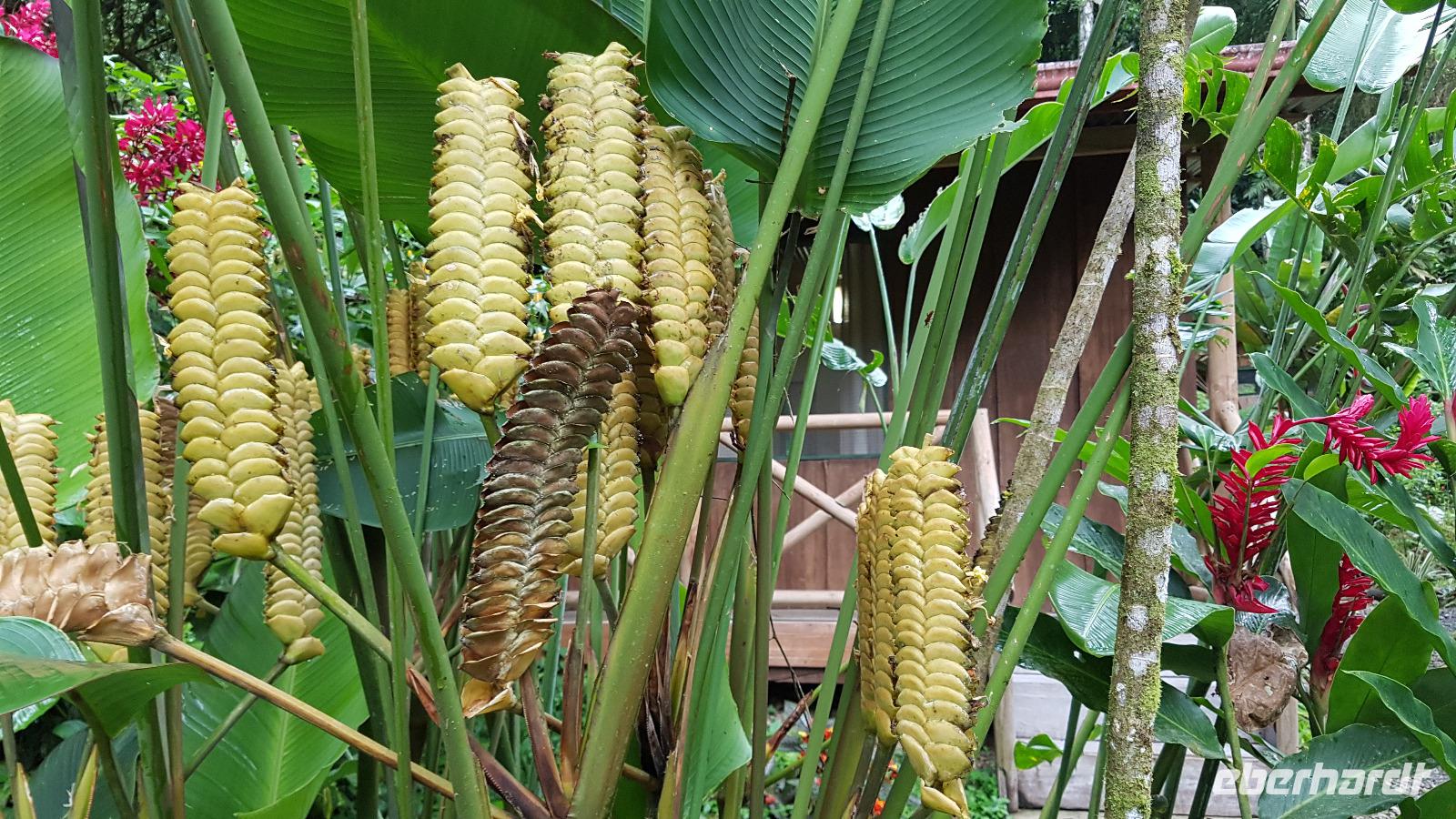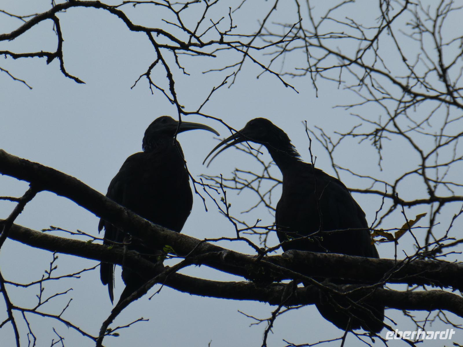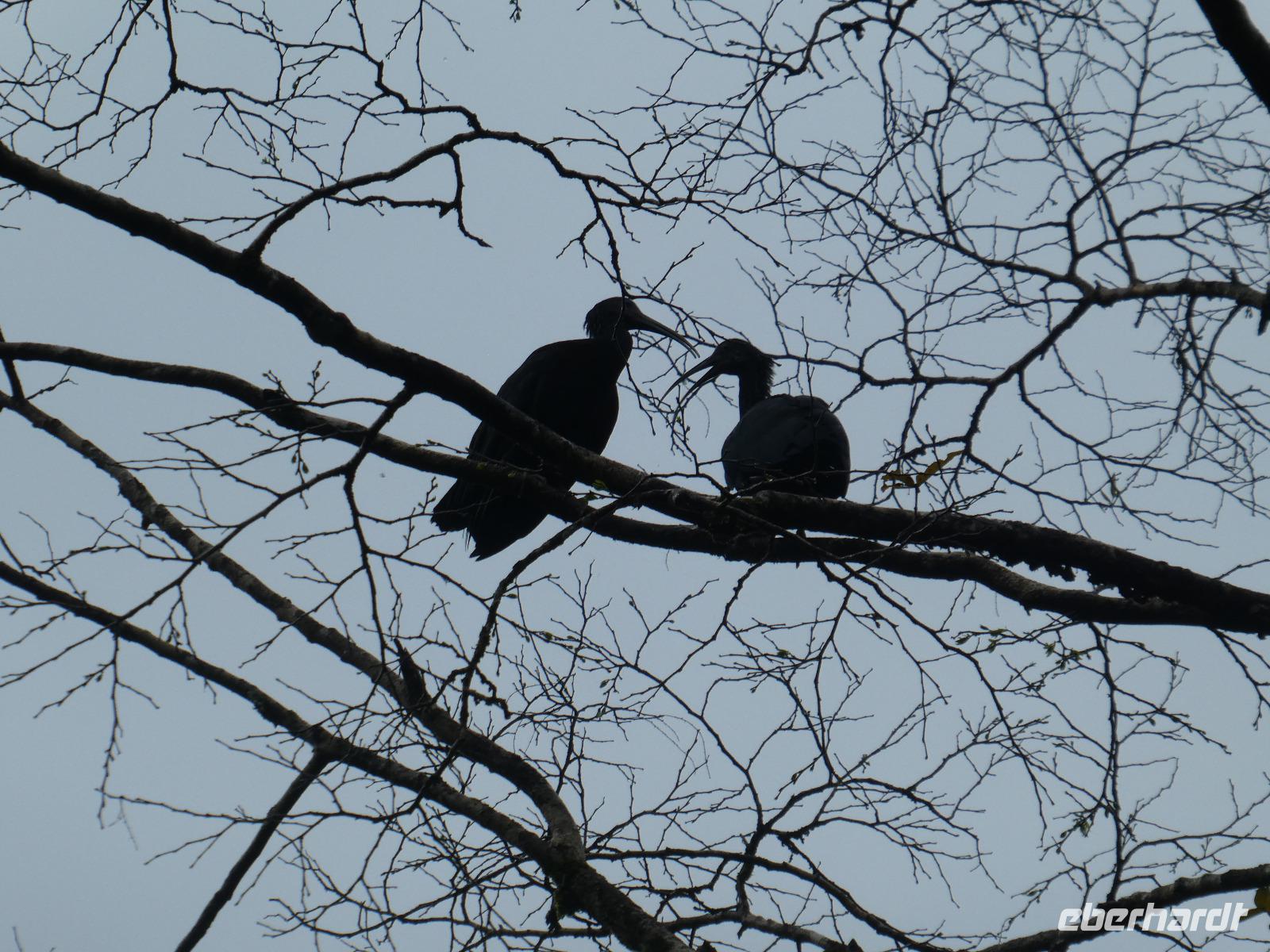 Mit einem frühen Morgenkaffee im Bauch starteten wir 6 Uhr zu unserer ersten Bootsfahrt, eingehüllt in unsere Regencaps. Wir fuhren mit Bootsführer Augusto entlang der Wasserkanäle und er sowie Nico spürten für uns die Tiere auf. Besonders spektakulär waren 5 Fledermäuse, die unter einem abgestorbenen Stamm hingen. Aber auch Leguane, Basilisken, Tukane, Schlangenhalsvögel, verschiedene Reiher und ein Marmorreiher Jungvogel im Nest waren u.a. zu beobachten. Nico "erntete" eine lange Frucht vom Provisionsbaum, schnitt sie an und Hokus pokus entfaltete sich eine tolle Blüte daraus. Kurz nach 8 Uhr waren wir zurück in der Lodge und frühstückten erst einmal. Wenig später gings dann schon weiter mit einer Kajaktour, bei der wir für die Fortbewegung selber sorgen mussten. Wir nahmen 3 Einer Kajaks und 2 grosse Boote und los ging es bei Regen. Diesmal stand die sportliche Fortbewegung im Vordergrund, dennoch entdeckten wir auch weitere Tiere. Am naturbelassenen Strand, der den Schildkröten abends und nachts vorbehalten ist, gingen wir kurz an Land und Nico berichtete über die vielen Schildkrötenarten, die hierher zur Eierablage kommen. Am Abend nahmen dann auch 3 Singles unserer Gruppe an der Schildkrötentour teil und konnten ein grosses Weibchen bei der Eierablage beobachten. Wir aber stiegen wieder in unsere Kajaks und paddelten zurück zur Lodge.