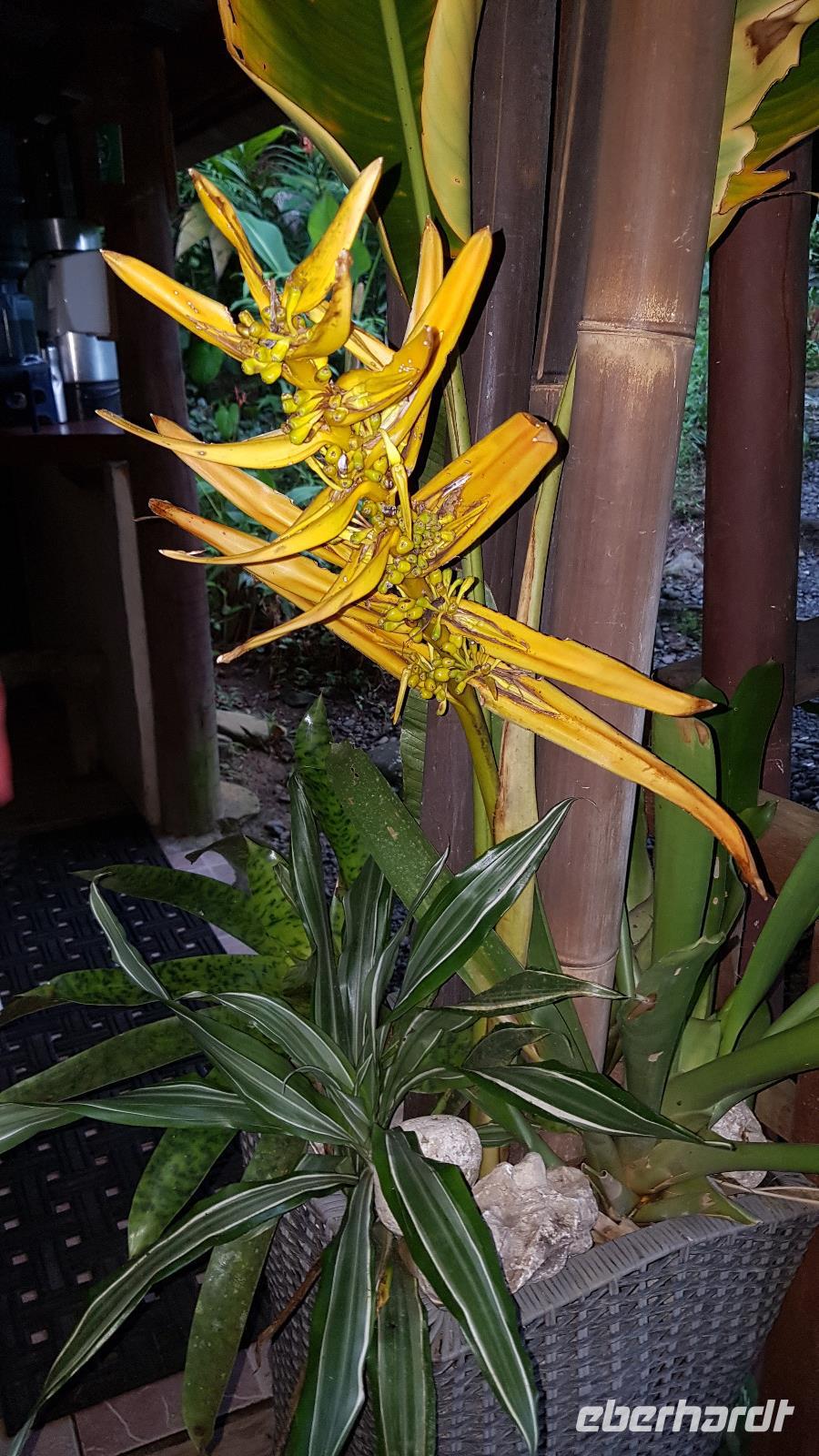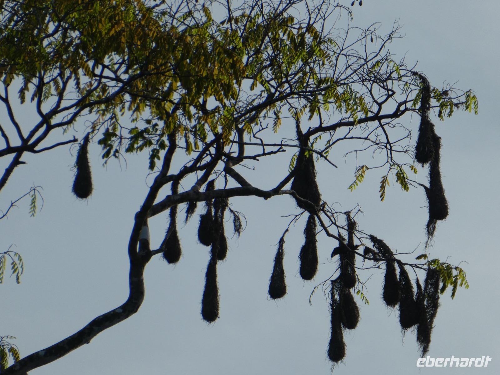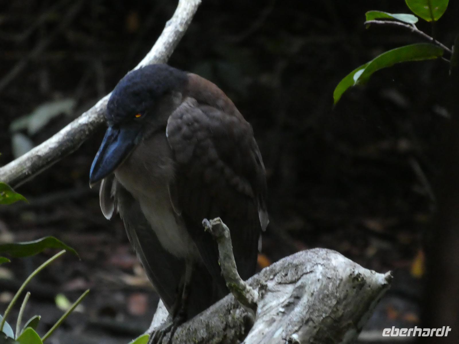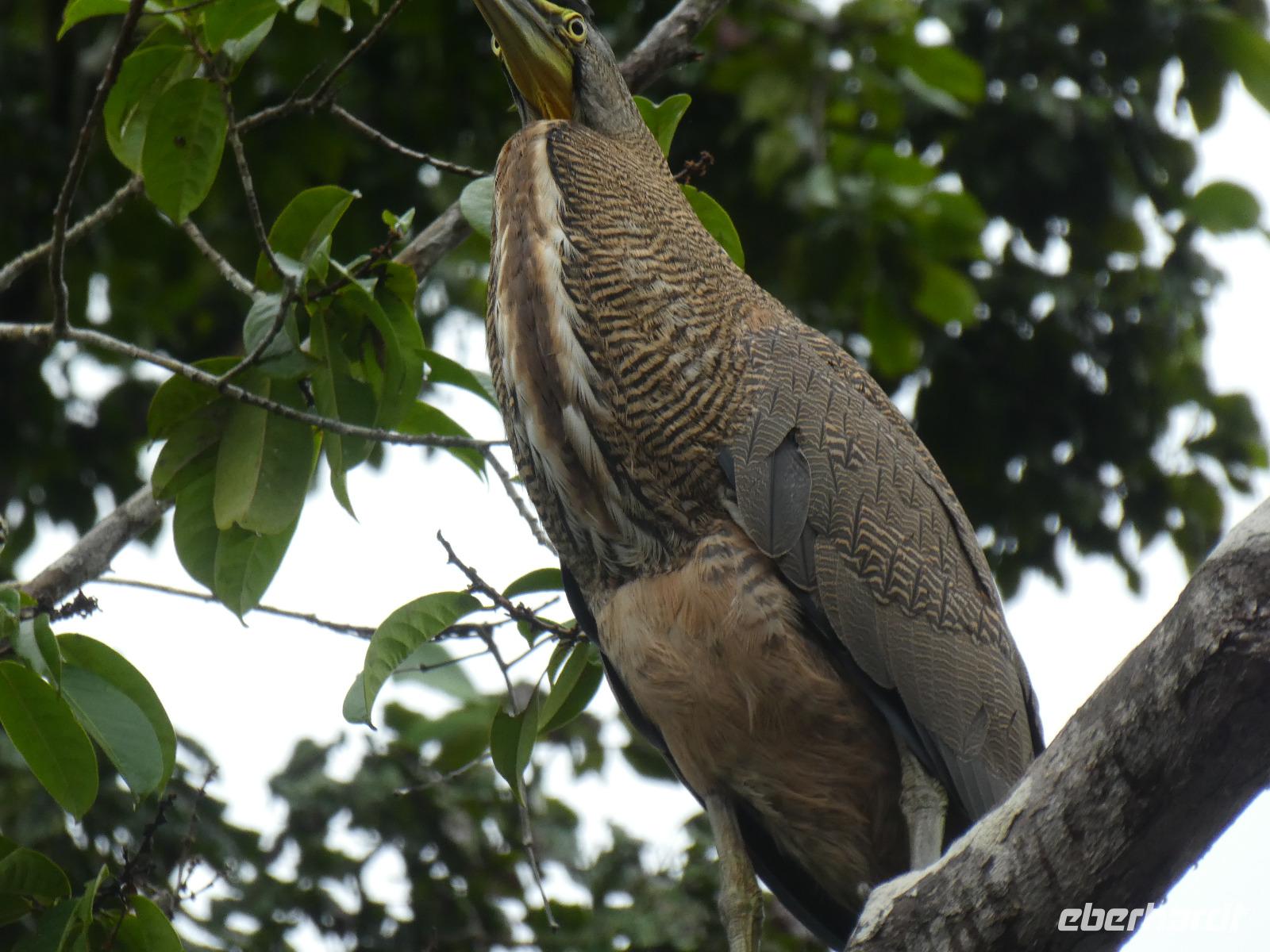 Mit einem frühen Morgenkaffee im Bauch starteten wir 6 Uhr zu unserer ersten Bootsfahrt, eingehüllt in unsere Regencaps. Wir fuhren mit Bootsführer Augusto entlang der Wasserkanäle und er sowie Nico spürten für uns die Tiere auf. Besonders spektakulär waren 5 Fledermäuse, die unter einem abgestorbenen Stamm hingen. Aber auch Leguane, Basilisken, Tukane, Schlangenhalsvögel, verschiedene Reiher und ein Marmorreiher Jungvogel im Nest waren u.a. zu beobachten. Nico "erntete" eine lange Frucht vom Provisionsbaum, schnitt sie an und Hokus pokus entfaltete sich eine tolle Blüte daraus. Kurz nach 8 Uhr waren wir zurück in der Lodge und frühstückten erst einmal. Wenig später gings dann schon weiter mit einer Kajaktour, bei der wir für die Fortbewegung selber sorgen mussten. Wir nahmen 3 Einer Kajaks und 2 grosse Boote und los ging es bei Regen. Diesmal stand die sportliche Fortbewegung im Vordergrund, dennoch entdeckten wir auch weitere Tiere. Am naturbelassenen Strand, der den Schildkröten abends und nachts vorbehalten ist, gingen wir kurz an Land und Nico berichtete über die vielen Schildkrötenarten, die hierher zur Eierablage kommen. Am Abend nahmen dann auch 3 Singles unserer Gruppe an der Schildkrötentour teil und konnten ein grosses Weibchen bei der Eierablage beobachten. Wir aber stiegen wieder in unsere Kajaks und paddelten zurück zur Lodge.
