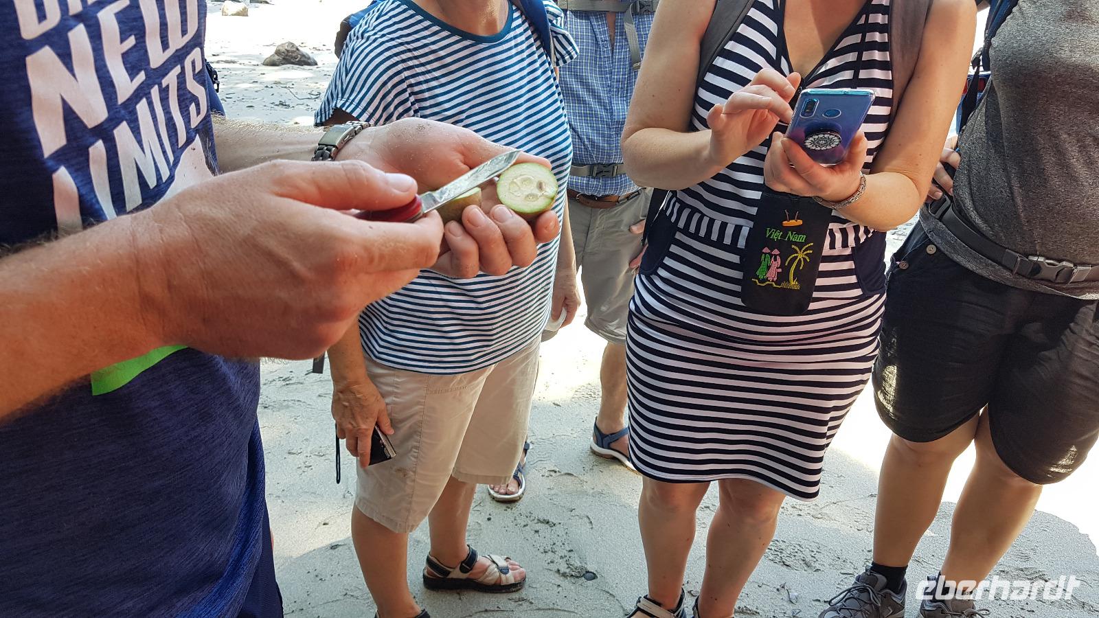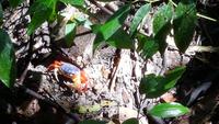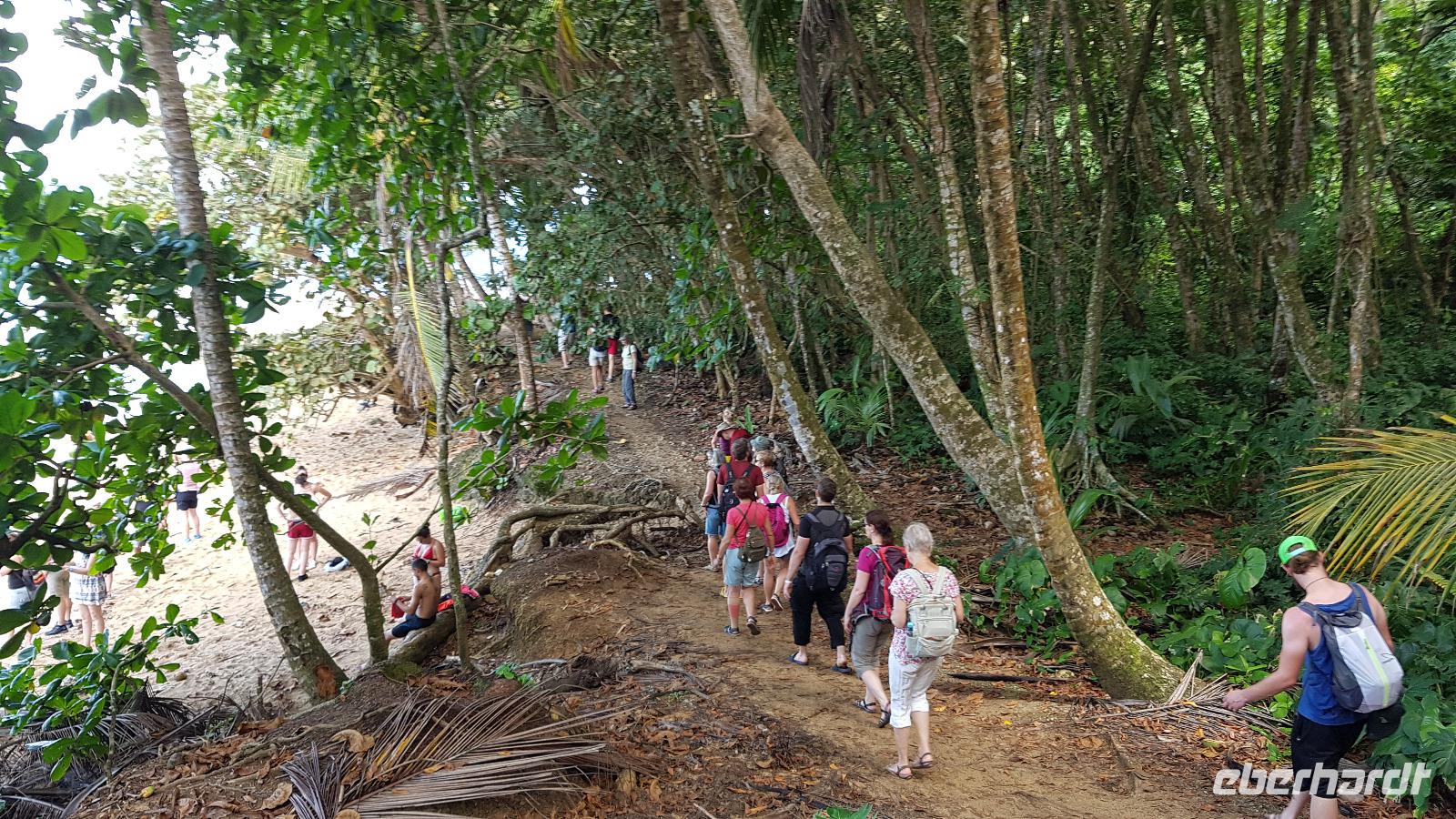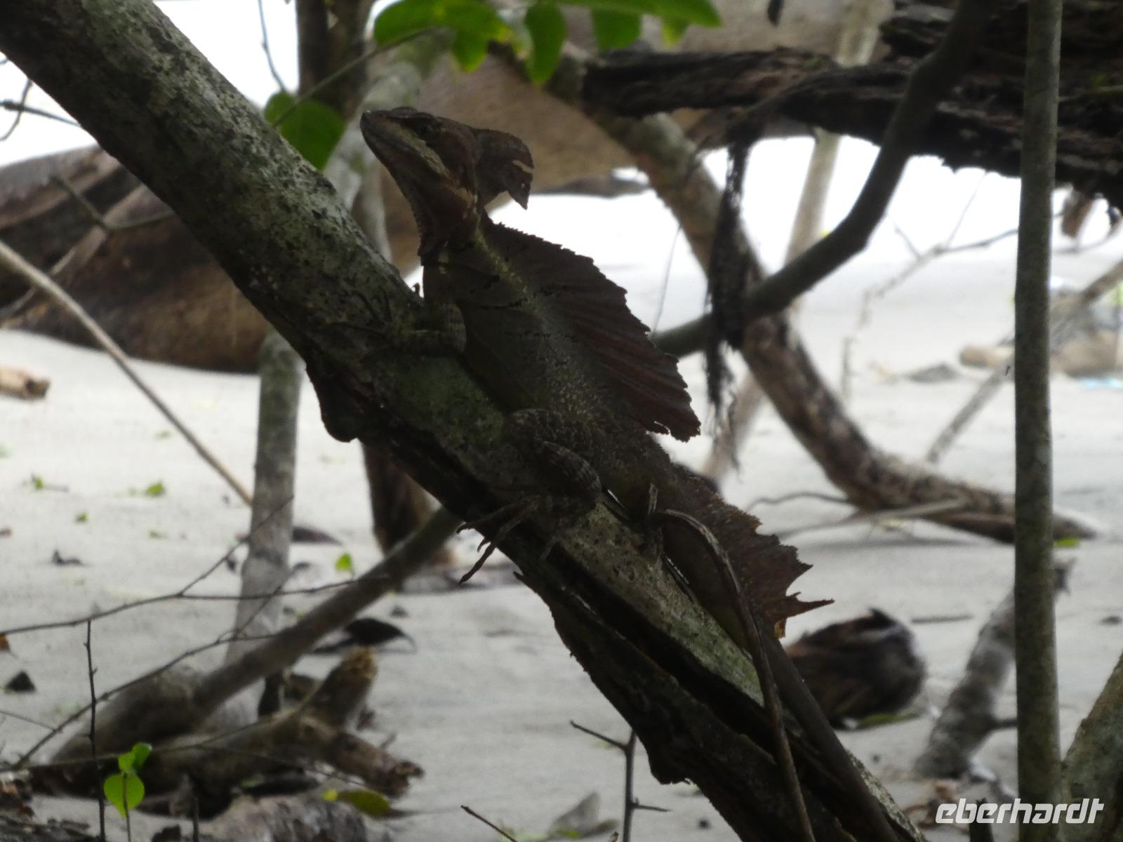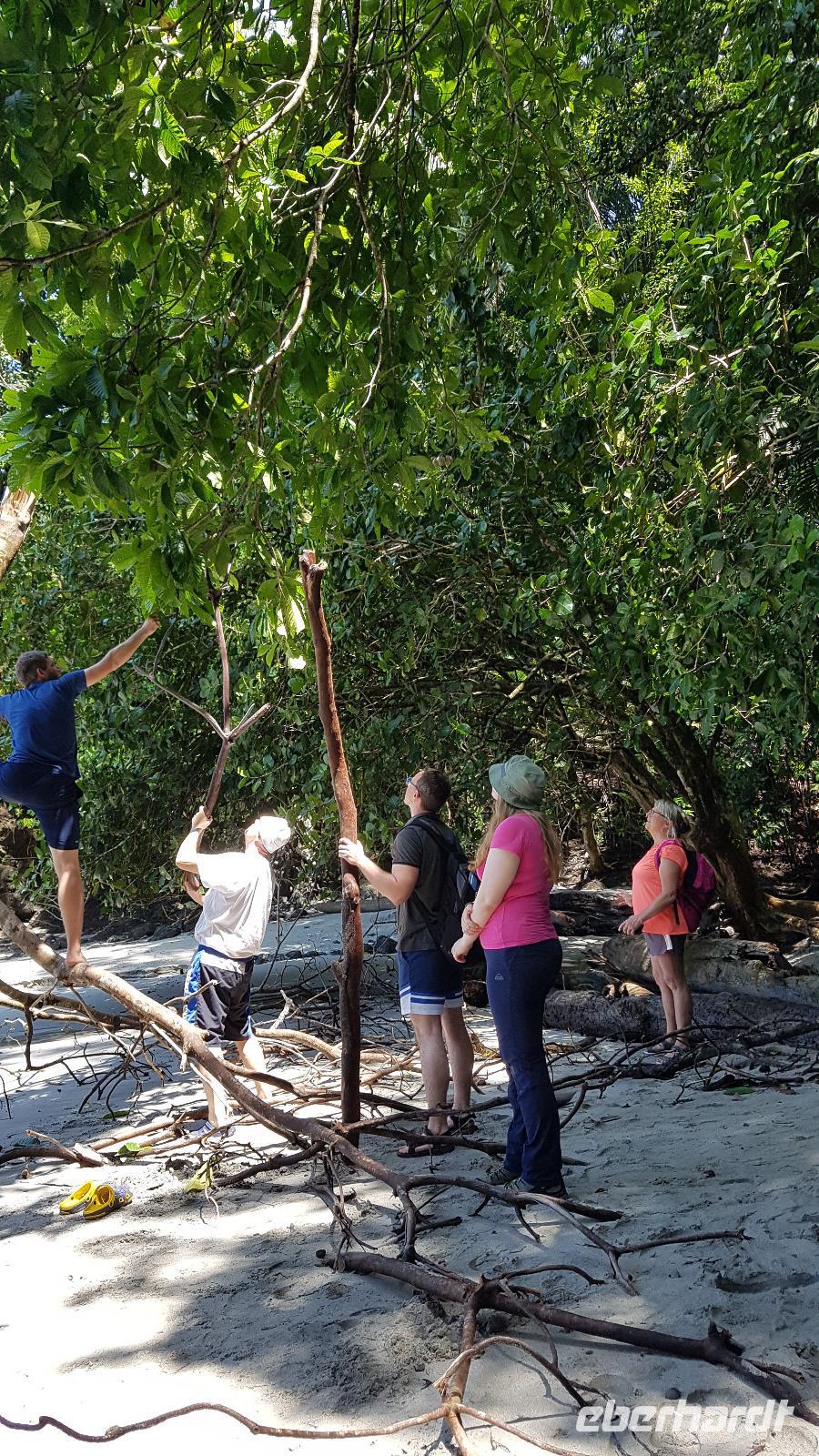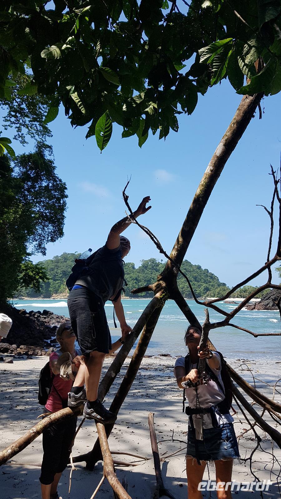 Nach einem guten Frühstück gingen wir am Strand entlang zum Eingang des Nationalparkes. Nico war schon voraus gelaufen, um die Eintrittskarten zu kaufen, denn die Anzahl der Besucher wird begrenzt und wer zu spät kommt, muss wieder kommen. Beim Einlass wurden unsere Taschen nach Essbarem durchsucht und einiges auch einbehalten, allerdings nach einem nicht schlüssigen Vorgehen. Im Park gingen wir mit Nico ganz langsam auf den befestigten Wegen und hielten Ausschau nach Tieren. Faultiere, Haloween Krabben, eine kleine Fledermaus und viele Leguane und Baselisten entdeckten wir. Später am Strand mussten wir eine Guaetil Frucht von einem hohen Baum ernten - Abenteuer 4 - Nico schnitt sie mit einem Messer auf und wir "bemalten" uns mit dem völlig unscheinbaren Saft. Nach einem Tag färbte sich alles blau - Tatoo auf costaricanisch ! War waren sehr gespannt und überrascht!
