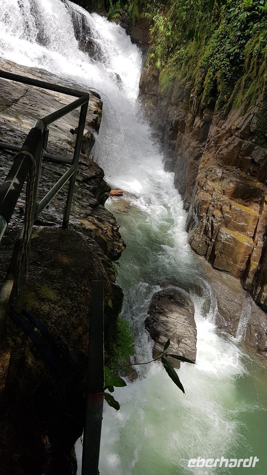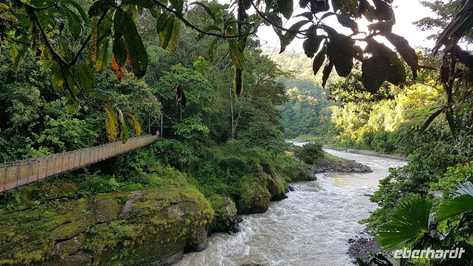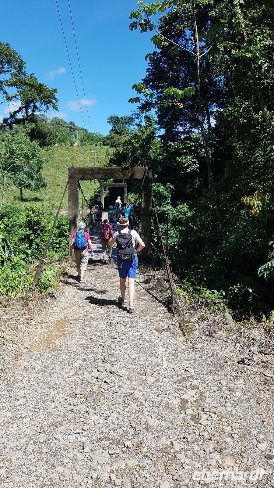 Unser erster Blick am Morgen galt dem Pegel und der war wieder auf normal gefallen. So stand dem zweiten Teil unserer Raftingtour zumindest vom Fluss nichts entgegen. Noch vor dem Frühstück erkundeten wir die Umgebung unserer Lodge und gingen über die Hängebrücke auf die andere Flussseite. Wir genossen das Frühstück, zogen danach unsere nassen Sachen wieder an, legten die Ausrüstung an und bekamen erneut eine Sicherheitseinweisung. Heute begleitete uns zusätzlich Walter in einem Kajak und ein Fotograf, der das Spektakel für uns in Bildern festhielt. Dann ging es los und es kamen Stromschnellen mit Namen wilde Pferde und jede Menge wilder Strudel und grosser Absätze im Fluss. Die Boote stürzten in die Tiefe und nur einmal wurde es knifflig, als eins der Boote zu kentern drohte. Aber glücklicherweise legte sich ein zweites Boot davor und so ging nur die Hälfe der Besatzung baden. Dann folgten wieder ruhigere Abschnitte und im Canyon zwischen den hohen Felsen durften wir die Boote zum Schwimmen verlassen. Wir liessen uns treiben und mussten dann aber doch schwimmen, um die Boote wieder einzuholen. Uli verpasste das Boot und wurde vom Transportboot aufgenommen und so ganz gemütlich zur Anlegestelle gebracht. Dort war dann leider unser Mega Abenteuer Rafting auch schon zu Ende und wir alle sehr sehr traurig darüber. Am Ufer wurde das Gepäck verteilt und wir zogen uns sogleich die trockenen Sachen wieder an. Mit unserem Bus fuhren wir zur Basis von Rios Tropicales, bedankten uns herzlich beim Team und stärkten uns beim Mittagessen. Wir bezahlten die Fotos und nahmen Abschied von den Männern, die uns sicher und mit viel Spass begleitet hatten.
