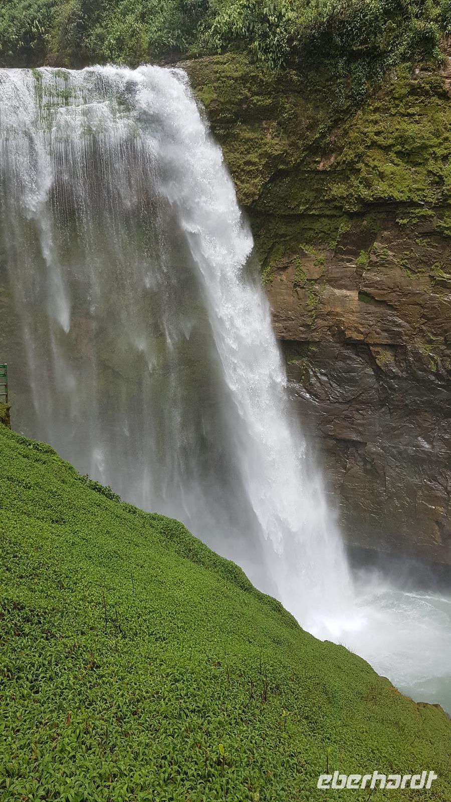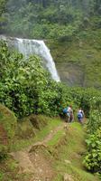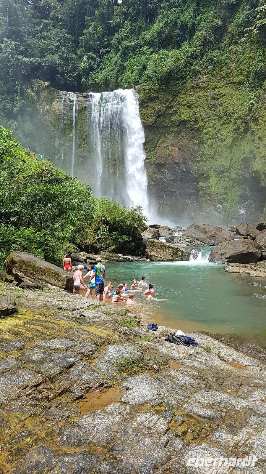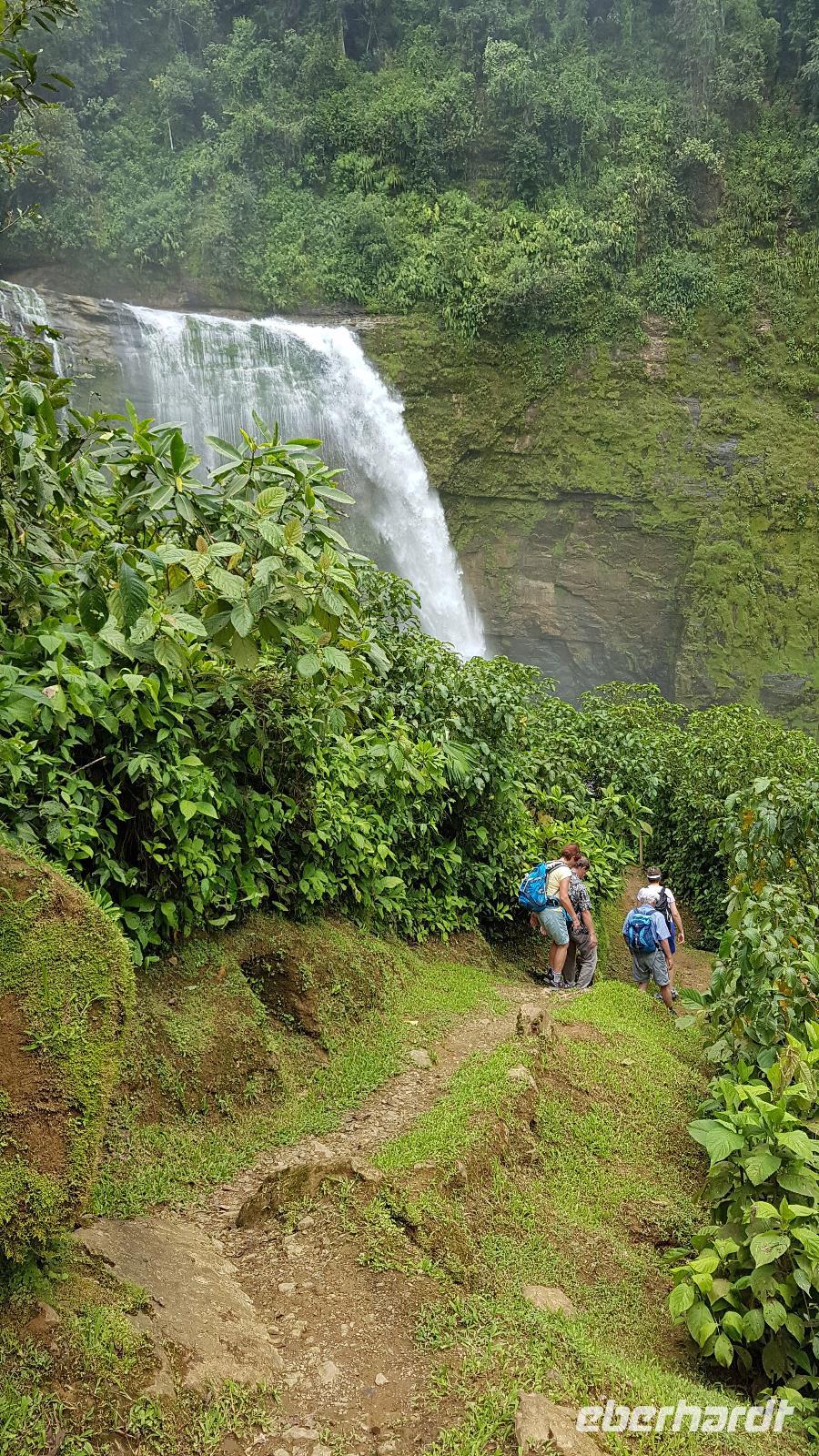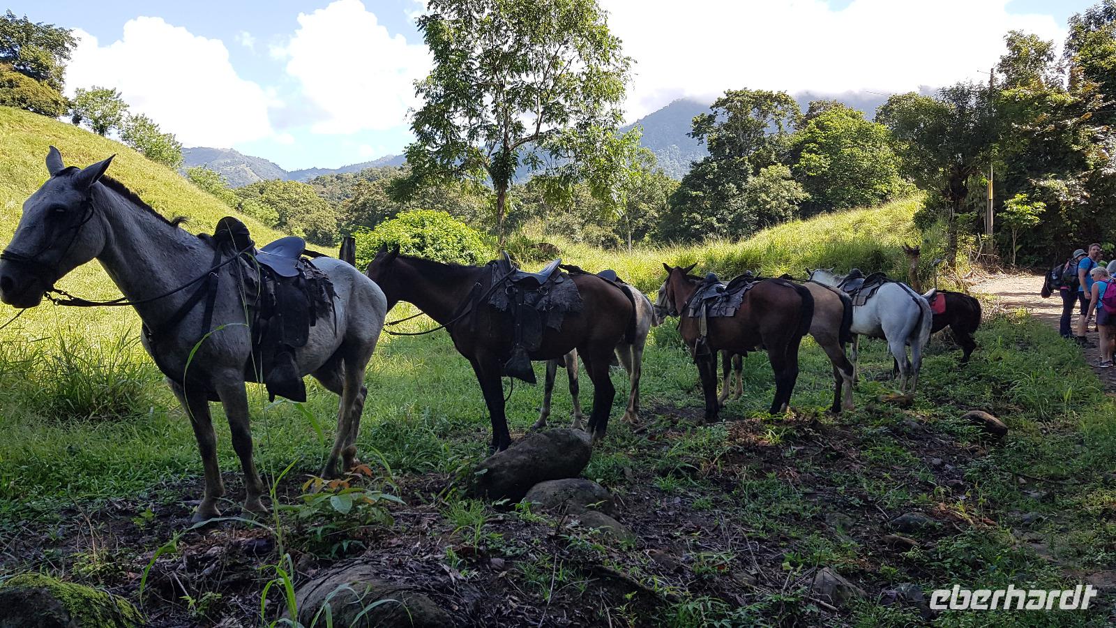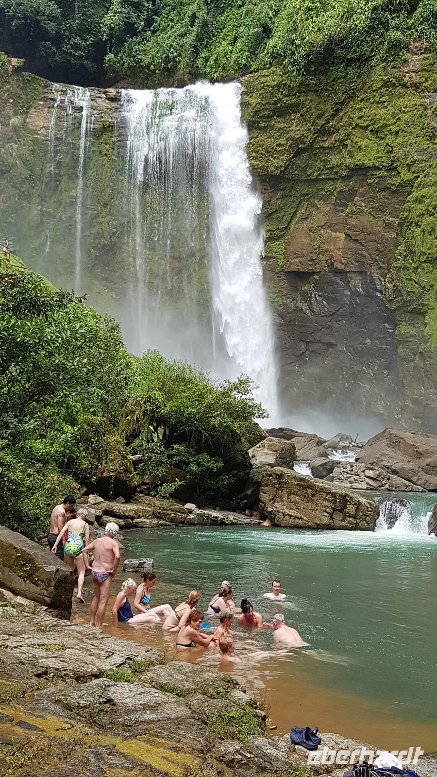 Wir verliessen nach einem guten Frühstück die Pazifikküste und fuhren in Richtung ECO Chontales Wasserfall. Vor einer schmalen Brücke war Schluss für unseren Bus, von hier ging es zunächst über die Brücke und dann auf dem Rücken von Pferden oder zu Fuss Richtung Wasserfall. Der Weg verlief in der Sonne und viele Passagen recht steil bergan. Für alle zu Fuss war das eine echte Herausforderung. Nach reichlich 4 km erreichten wir eine Ansiedlung oberhalb des Wasserfalles. Dort gab es Toiletten und etwas zu trinken. Ein steiler Weg führte hinunter ins Tal zum ECO Chontales Wasserfall. Gewaltige Wassermassen stürzten ins Tal und bildeten kleinere und ein grösseres Badebecken. Das nutzten wir gern für eine Abkühlung. Dann führte man uns zu einem 8 m hohen Plateau und von dort konnte man einen Mutsprung in das tosende Wasser machen. Wir hatten so mutige Herren und sogar eine Frau in der Gruppe, die tatsächlich sprangen - Abenteuer 5. Im Restaurant beim Wasserfall nahmen wir dann unser schon am Vortag ausgewähltes Mittagessen ein und stiegen anschliessend wieder steil bergan. Für den Rückweg zum Bus standen Pferde und ein Pickup bereit. Auf dem Rückweg gab es natürlich den nachmittäglichen Regen !