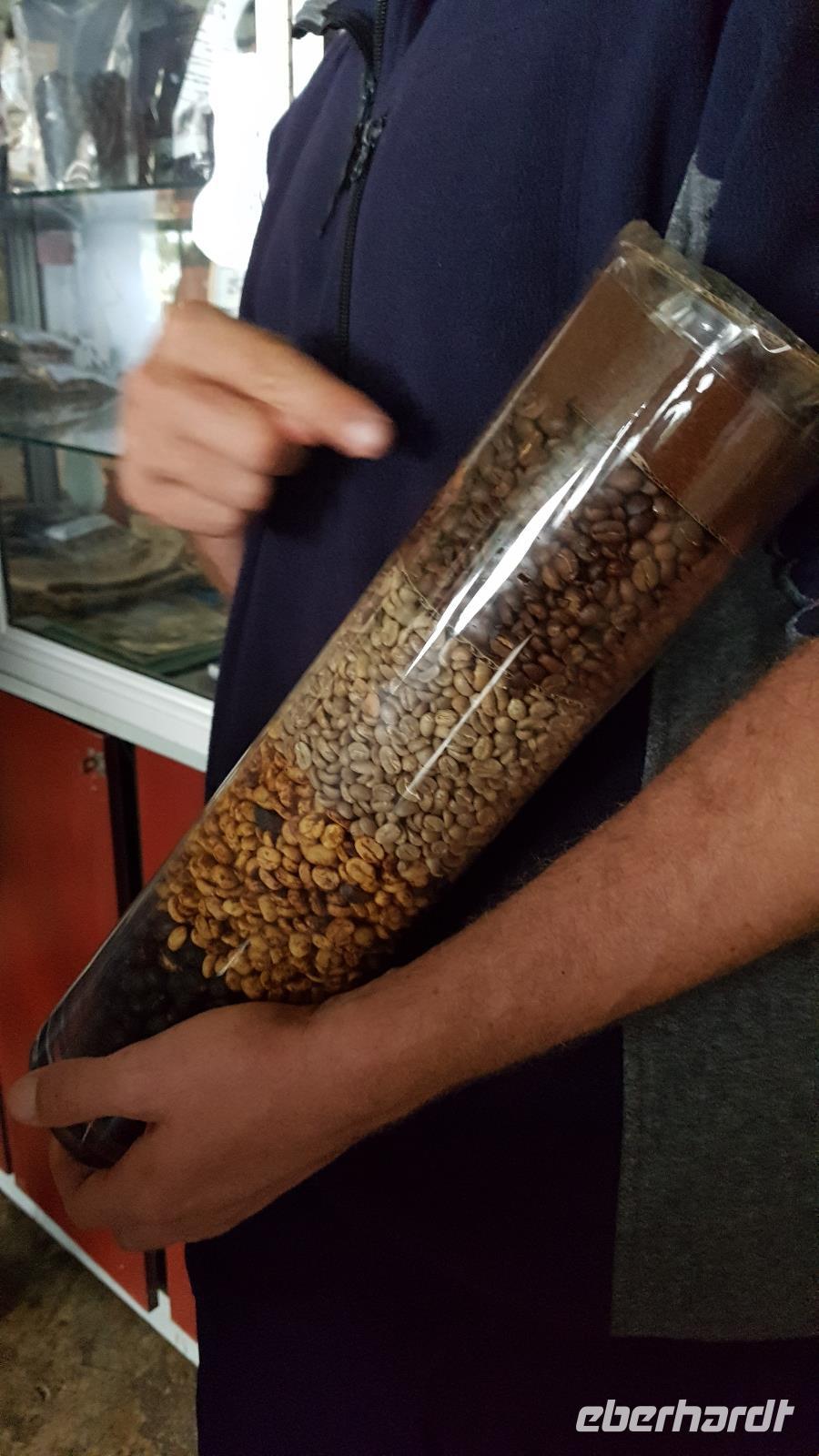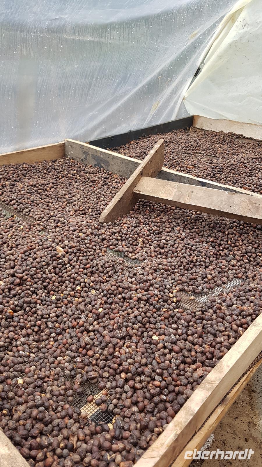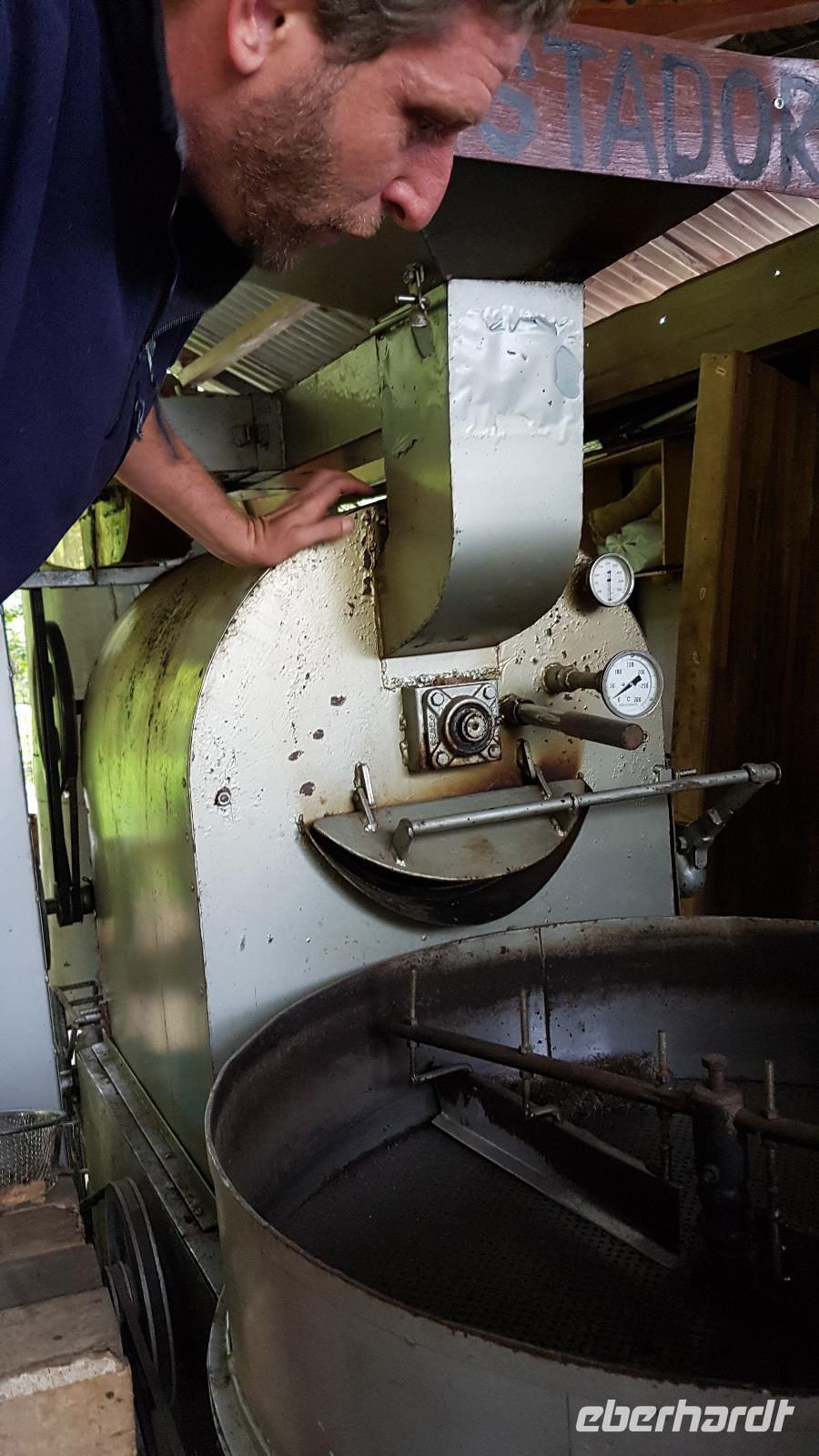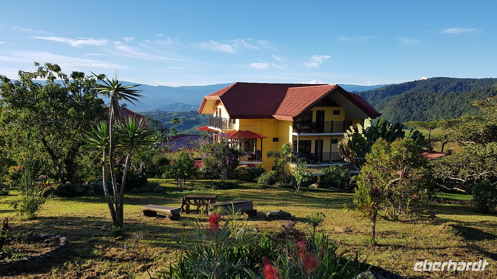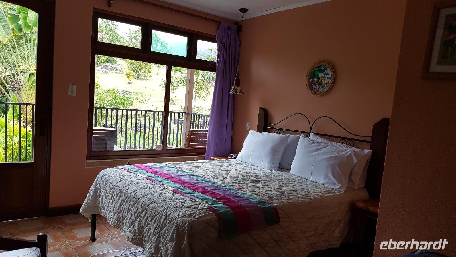 Unsere nächste Unterkunft lag im Savegretal und dorthin stand uns eine lange Fahrt bevor. Unterwegs kamen wir an vielen Kaffeeplantagen vorbei und so erzählte uns Nico über die Bedeutung des Kaffees für Costa Rica. Bei einem Kaffeebauern, der auch ein Lokal zum Probieren des Kaffees unterhielt, machten wir Stopp und sahen eine alte Röstmaschine und die Kaffeebohnen noch mit Schale zum Trocknen. Dabei lernten wir, dass der weniger geröstete Kaffee mehr Coffein enthält und wir glaubten immer, dass das kein starker Kaffee sei ! Wir kennen nur stark gerösteten Kaffee mit starkem Aroma und der hat dann eben weniger Coffein. Für 800 Colones probierten wir einen schwarzen Kaffee und waren überrascht vom guten Geschmack und dessen aufwendiger Zubereitung. Die Weiterfahrt verlief über viele Serpentinen hinauf zum 3400 m hohen Pass "Berg des Todes" und beinahe hätten wir einen Unfall erlebt, wenn nicht unser Fahrer Truman so beherzt reagiert und gebremst hätte. Das letzte Stück hinunter ins Savegretal verlief in der Dunkelheit auf einer äusserst schmalen Strasse, für die unser Bus viel zu gross war. Aber Truman hatte das gemeistert !