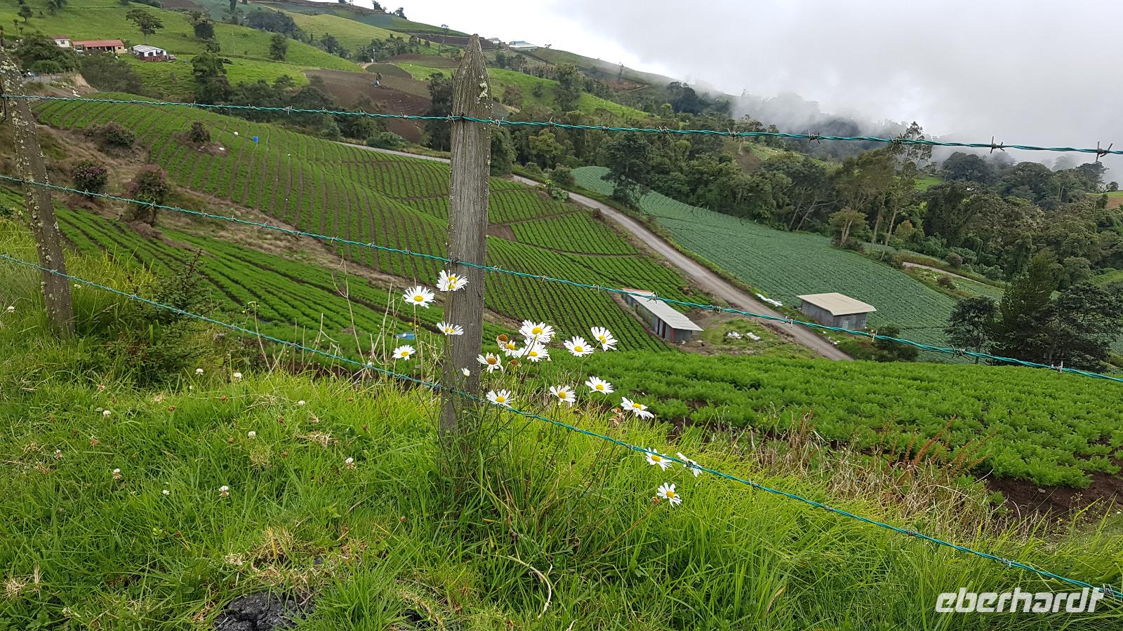 Auch heute am Sonntag brachen wir wieder früh auf, hielten kurz an einer Bäckerei, wo ich frisches Brot für unser Picknick kaufte und dann fuhren wir hinauf zum Nationalpark Irazu. Erst wenige Autos standen am Eingang und so brachte uns Truman zügig hinauf zum höchsten Punkt auf 3432 m. Von dort oben war ein guter Übersichtsblick gegeben auf den Irazu und bei Wolkenlücken auch hinüber zum Turrialba. Danach fuhren wir hinunter auf den Parkplatz und dort spazierten wir entlang am Kraterrand und genossen die Aus- und Einblicke am Krater. Nico hatte uns die bevorstehende Wanderung gut beschrieben und so beschlossen einige Gäste, mit Truman zum Wanderendpunkt zu fahren und der grösste Teil der Gruppe wanderte los auf einem befestigten Weg zwischen den Vulkanen Irazu und Turrialba. Unterwegs auf einer Weide machten wir Picknick und probierten den Käse vom Vortag. Dazu gab es frisches Brot und einen Wodka Nikolai. Am Ende der Wanderung kamen wir durch La Central, ein aus Sicherheitsgründen entvölkertes Dorf, wo sich sonntags immer viele Menschen treffen, um dem gefährlichen Turrialba nah zu sein. Unser Bus war bis ans Ende der Asphaltstrasse gefahren und dort stiegen wir dann auch wieder zu. Wir fuhren zurück in unsere Lodge und bei einer Tasse Kaffee informierte uns Nico nochmals zu unserer Raftingtour am Montag und Dienstag. Dafür war es nötig, ein kleines Gepäckstück zu packen, welches auf den Booten dann wasserdicht verstaut werden konnte. Unsere Koffer blieben an beiden Tagen bei Truman im Bus. Wir genossen noch einmal das gute Essen in der Lodge und gingen ein wenig aufgeregt zu Bett.