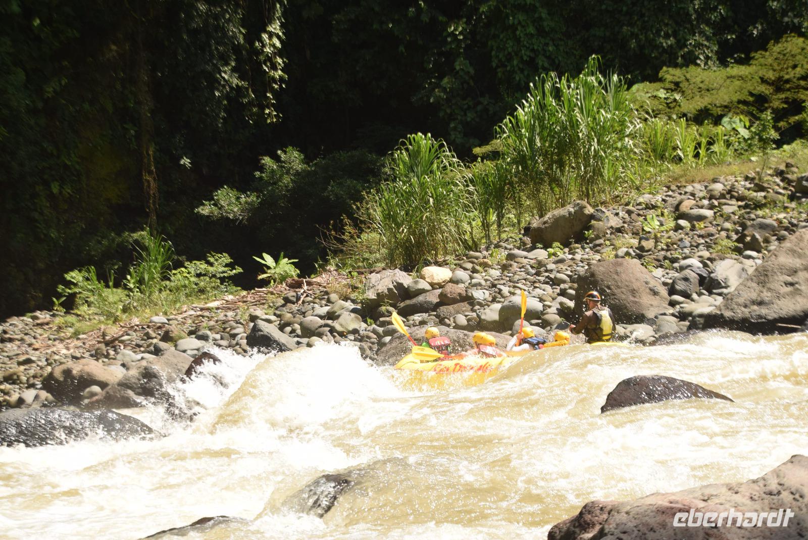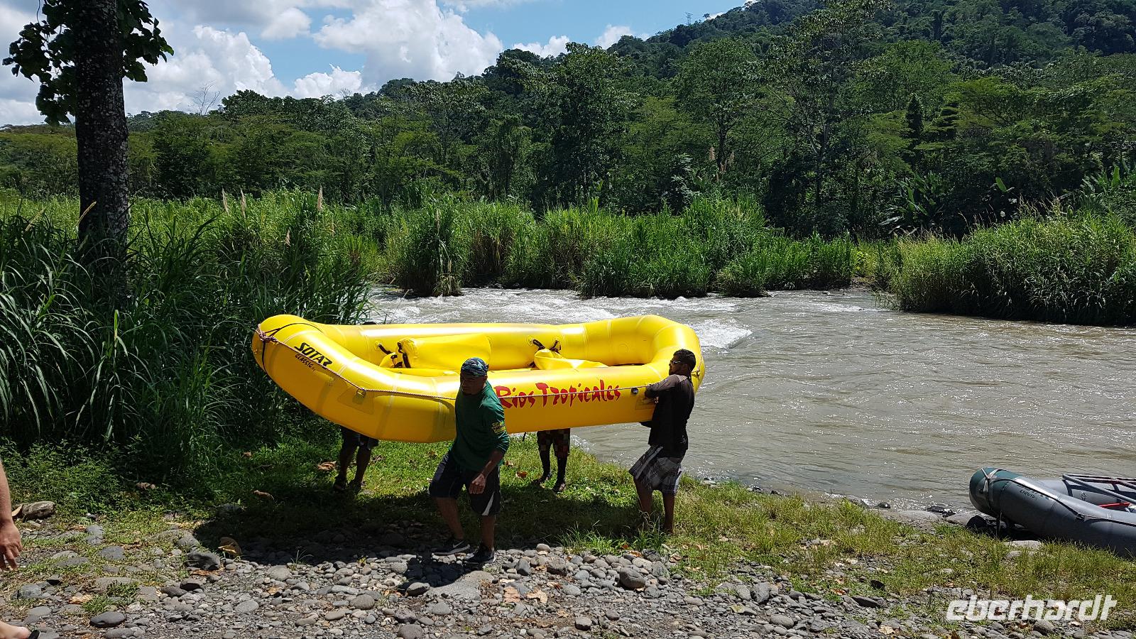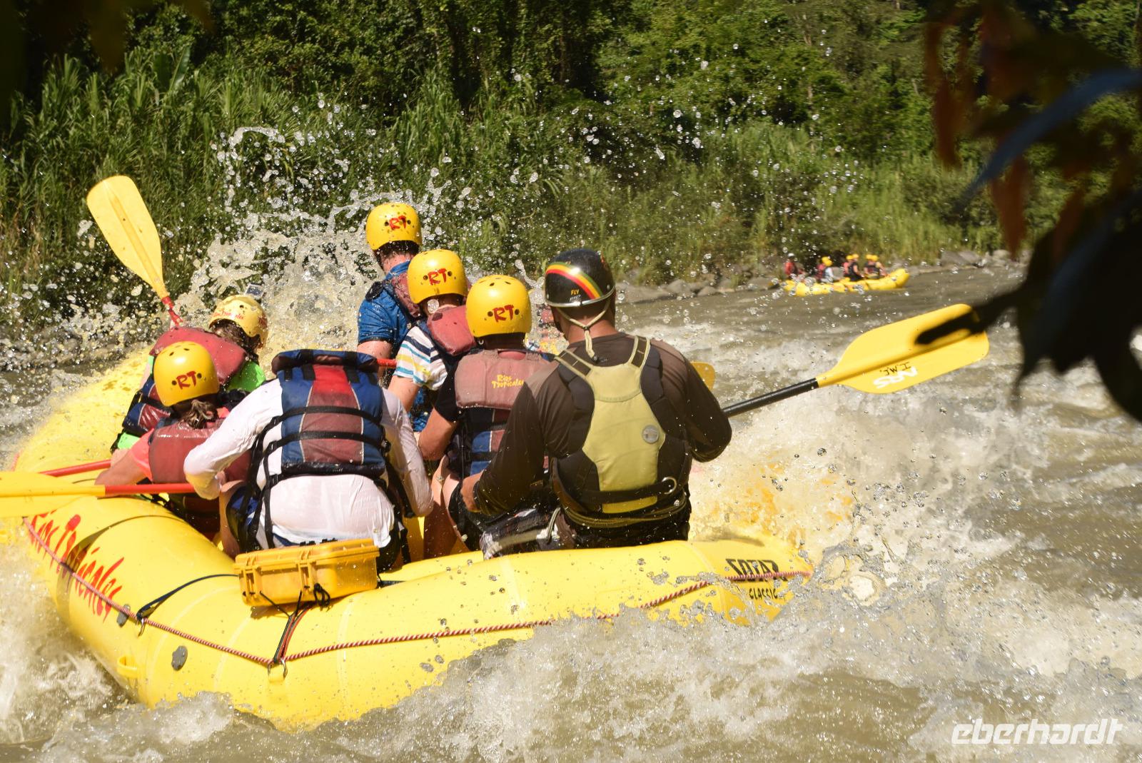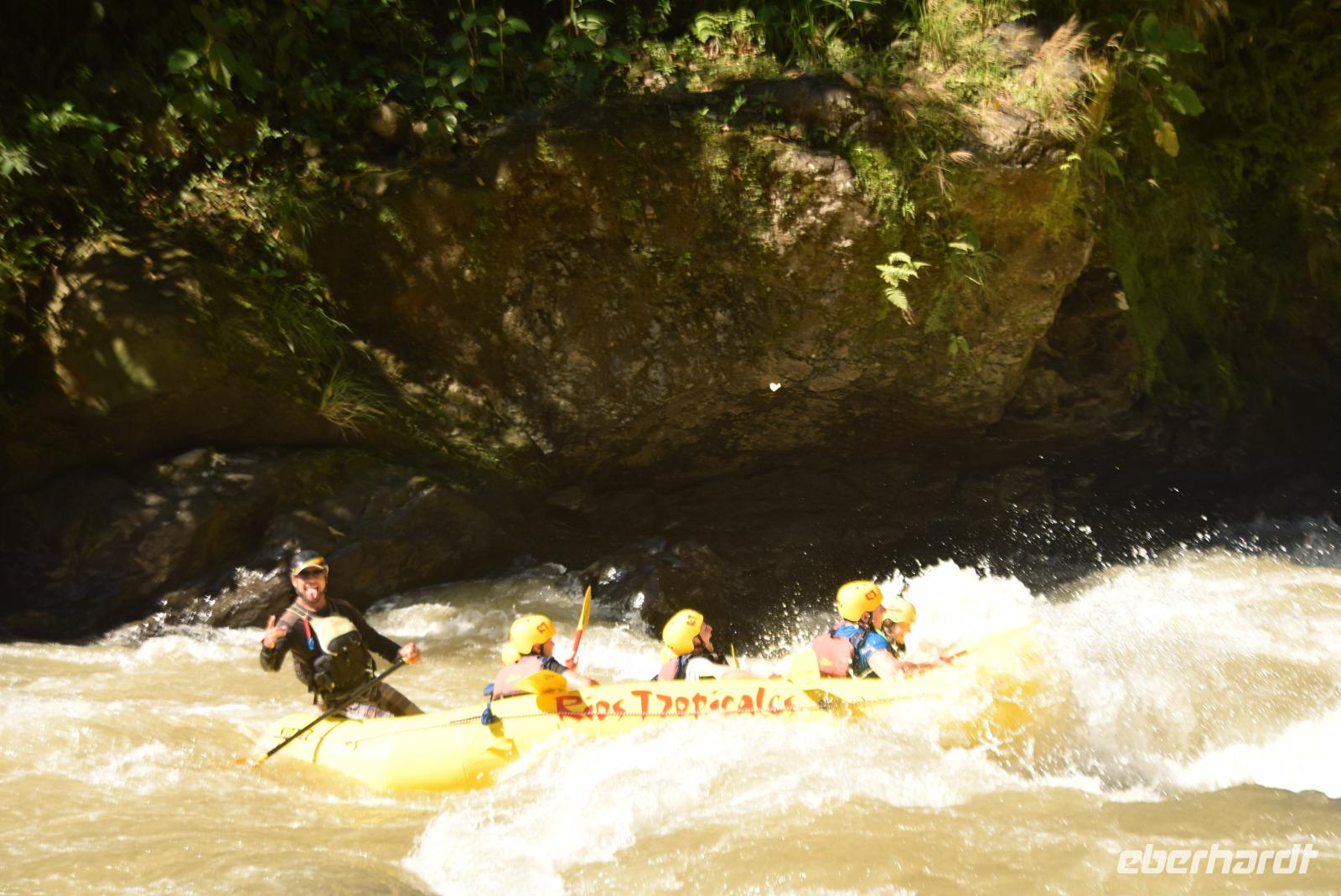 Wir waren alle früh aufgestanden und genossen den wunderschönen Garten unserer Lodge und den Blick hinunter ins Tal. Beim Frühstück gab es nur noch ein Thema - Rafting. Die Koffer wurden verstaut und das kleine Gepäck nahmen wir mit in den Bus. Unten in Turrialba stoppten wir beim Supermarkt und Truman fuhr zur Tankstelle. Dann ging es weiter Richtung Rafting Startplatz. Oberhalb des Paguare Flusses erwartete uns schon Jorge, einer der Bootsführer von Rios Tropicales und wir stiegen um in eine "Landwirtschaftslimousine", wie Nico den Traktor mit Anhänger liebevoll nannte. Die Fahrt auf steilem Weg hinunter zum Fluss war eigentlich schon Abenteuer Nr.6. Aber wir wollen mal nicht übertreiben ! Unten am Fluss lagen die grossen Schlauchboote, Helme und Rettungswesten bereit. Wir gaben unser kleines 2-Tages-Gepäck zum Verstauen ab, legten Helme und Rettungswesten an und danach wurden die Bootsteams zusammen gestellt - 2 x 6 Personen und 1 x 8 Personen. Für das Rafting war Alex, ein junger Schwede, zu unserer Gruppe gestossen und verstärkte unser Team. Nun erfolgte eine umfangreiche Sicherheitseinweisung durch Jorge. Nach und nach bestiegen wir die Schlauchboote und wurden nochmals von unseren Bootsführern eingewiesen. Kurz nach dem Start wurde einer ins Wasser gestossen, um die Rettung zu demonstrieren und unsere ständige Aufmerksamkeit nochmals zu unterstreichen. Alle mussten den Befehlen des Bootsführers zügig Folge leisten, denn nur so war das Mega-Abenteuer zu bewältigen. Es klappte alles erstaunlich gut und wir hatten unbeschreiblich viel Spass, obwohl wir schon nach dem ersten Strudel klitschnass waren. Die Boote schwankten auf und ab, drehten sich wild in den Strudeln und oft waren nur noch die gelben Paddel zu sehen. Ich ging plötzlich über Bord und landete unter dem Boot, aber Ivan packte mich an der Rettungsweste und zog mich wieder ins Boot.