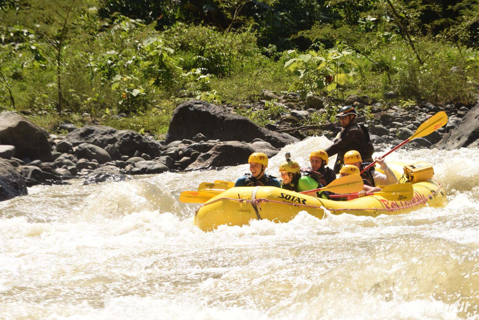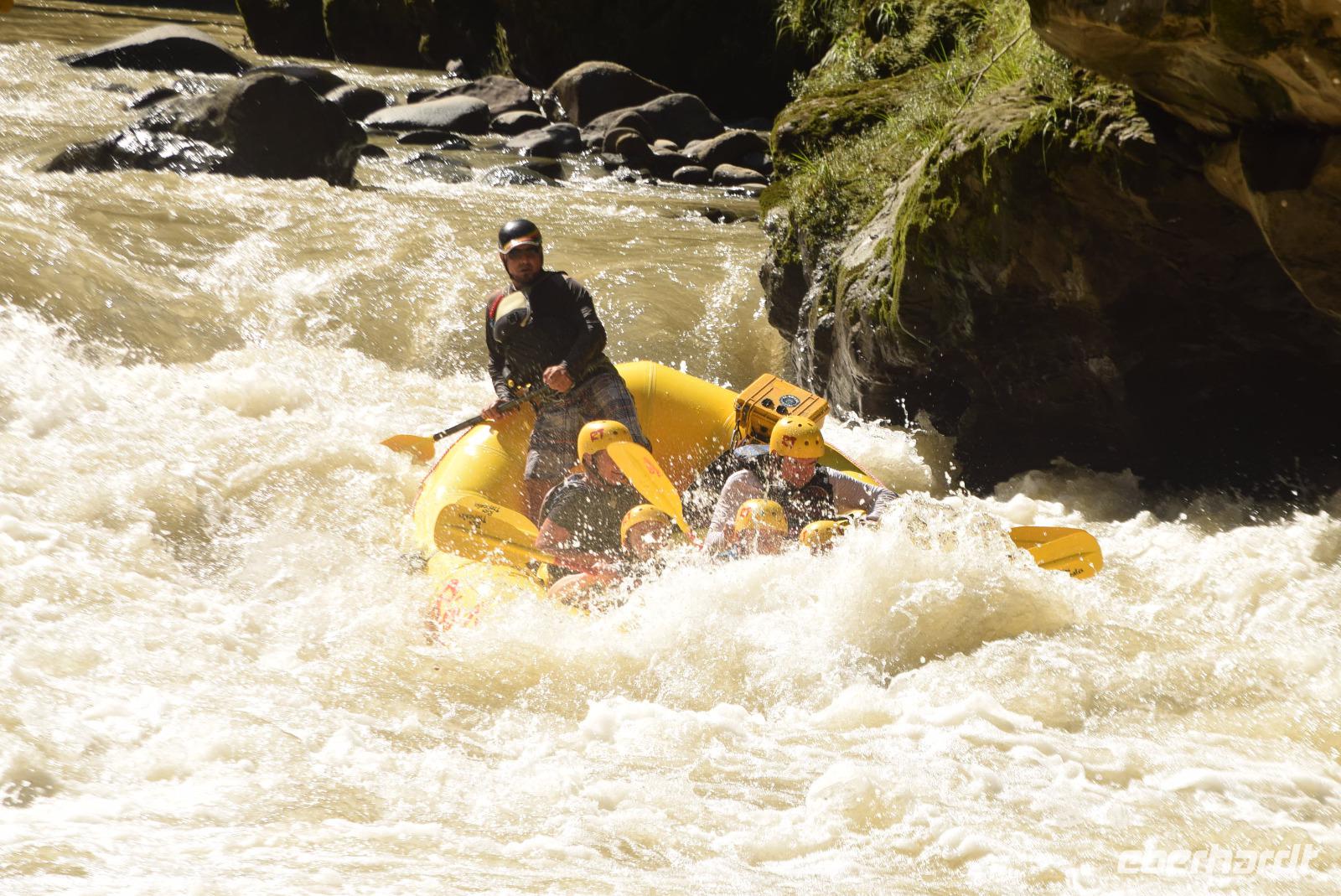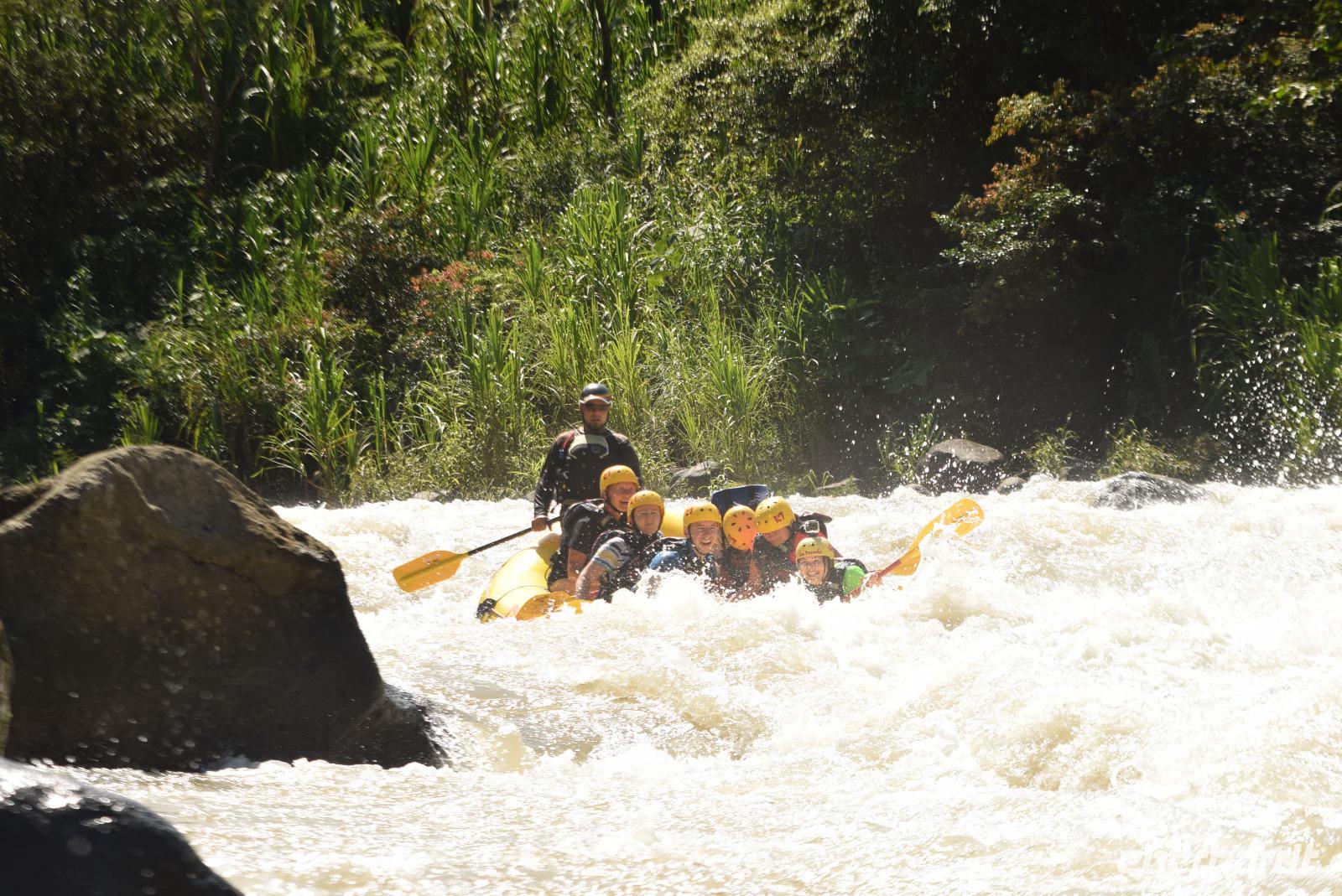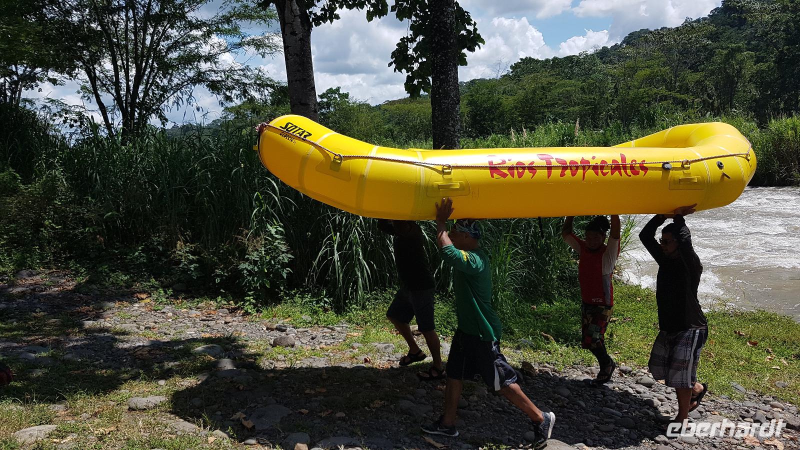 Wir waren alle früh aufgestanden und genossen den wunderschönen Garten unserer Lodge und den Blick hinunter ins Tal. Beim Frühstück gab es nur noch ein Thema - Rafting. Die Koffer wurden verstaut und das kleine Gepäck nahmen wir mit in den Bus. Unten in Turrialba stoppten wir beim Supermarkt und Truman fuhr zur Tankstelle. Dann ging es weiter Richtung Rafting Startplatz. Oberhalb des Paguare Flusses erwartete uns schon Jorge, einer der Bootsführer von Rios Tropicales und wir stiegen um in eine "Landwirtschaftslimousine", wie Nico den Traktor mit Anhänger liebevoll nannte. Die Fahrt auf steilem Weg hinunter zum Fluss war eigentlich schon Abenteuer Nr.6. Aber wir wollen mal nicht übertreiben ! Unten am Fluss lagen die grossen Schlauchboote, Helme und Rettungswesten bereit. Wir gaben unser kleines 2-Tages-Gepäck zum Verstauen ab, legten Helme und Rettungswesten an und danach wurden die Bootsteams zusammen gestellt - 2 x 6 Personen und 1 x 8 Personen. Für das Rafting war Alex, ein junger Schwede, zu unserer Gruppe gestossen und verstärkte unser Team. Nun erfolgte eine umfangreiche Sicherheitseinweisung durch Jorge. Nach und nach bestiegen wir die Schlauchboote und wurden nochmals von unseren Bootsführern eingewiesen. Kurz nach dem Start wurde einer ins Wasser gestossen, um die Rettung zu demonstrieren und unsere ständige Aufmerksamkeit nochmals zu unterstreichen. Alle mussten den Befehlen des Bootsführers zügig Folge leisten, denn nur so war das Mega-Abenteuer zu bewältigen. Es klappte alles erstaunlich gut und wir hatten unbeschreiblich viel Spass, obwohl wir schon nach dem ersten Strudel klitschnass waren. Die Boote schwankten auf und ab, drehten sich wild in den Strudeln und oft waren nur noch die gelben Paddel zu sehen. Ich ging plötzlich über Bord und landete unter dem Boot, aber Ivan packte mich an der Rettungsweste und zog mich wieder ins Boot.