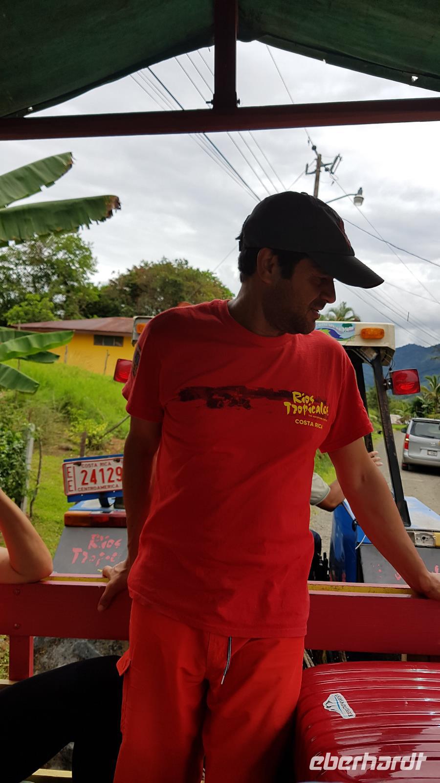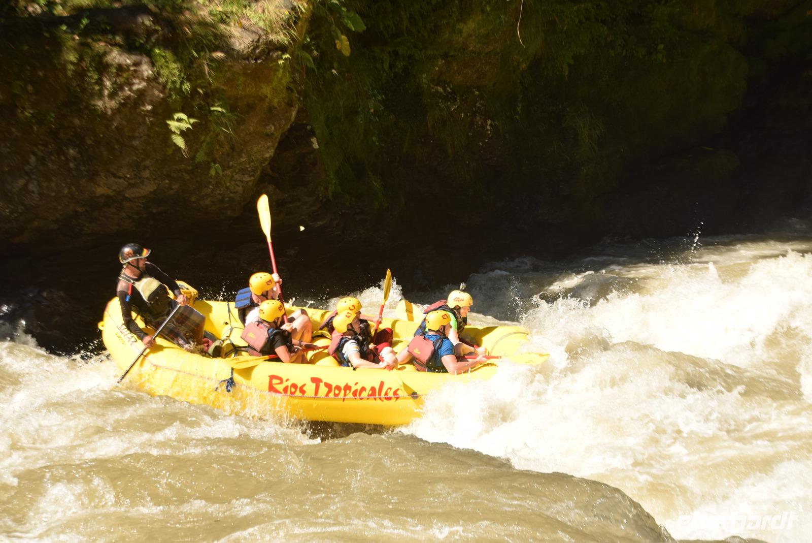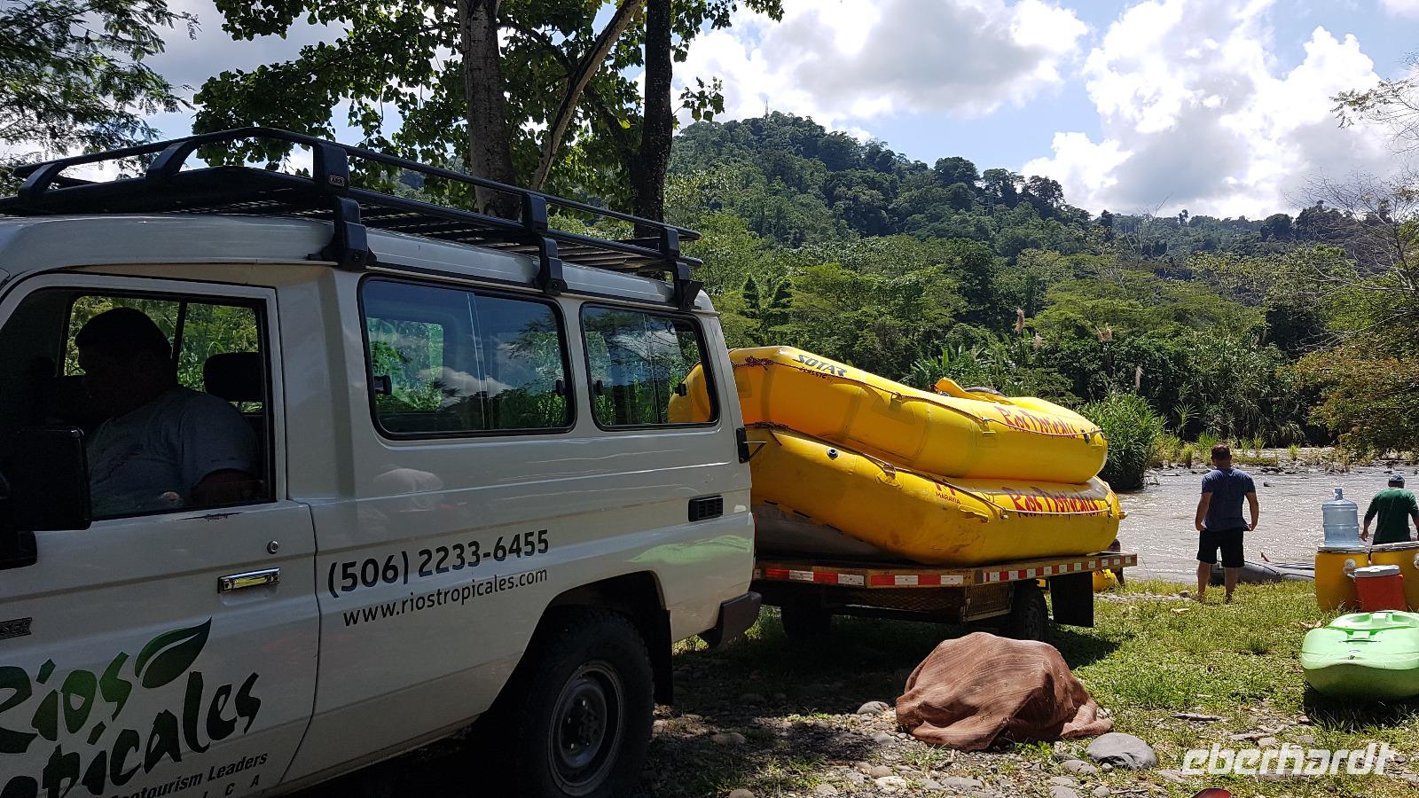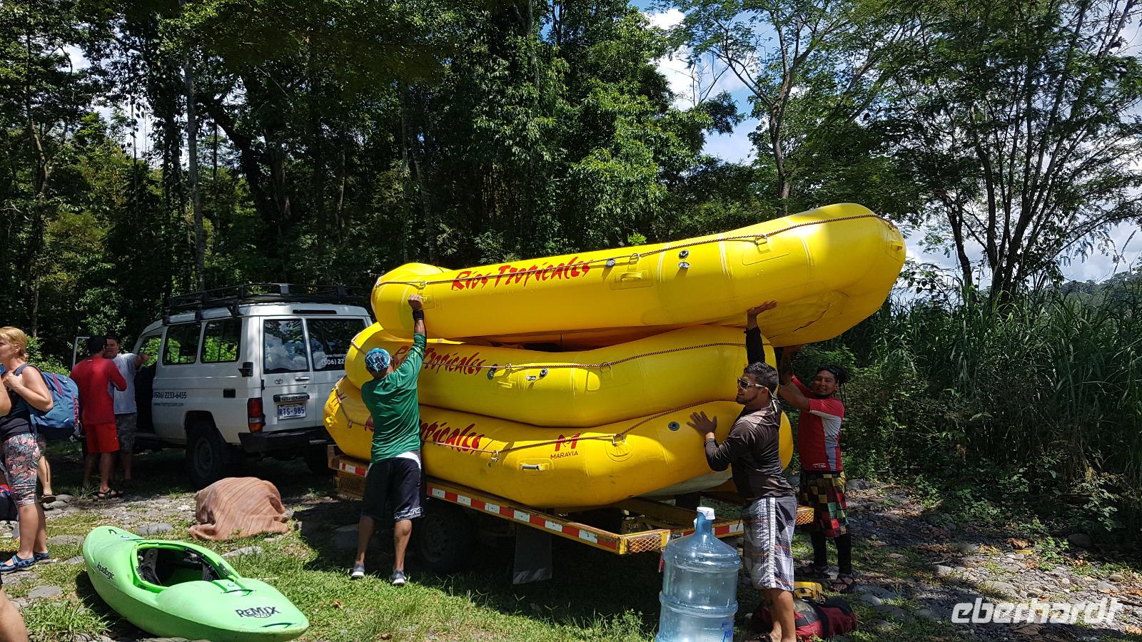 Wir waren alle früh aufgestanden und genossen den wunderschönen Garten unserer Lodge und den Blick hinunter ins Tal. Beim Frühstück gab es nur noch ein Thema - Rafting. Die Koffer wurden verstaut und das kleine Gepäck nahmen wir mit in den Bus. Unten in Turrialba stoppten wir beim Supermarkt und Truman fuhr zur Tankstelle. Dann ging es weiter Richtung Rafting Startplatz. Oberhalb des Paguare Flusses erwartete uns schon Jorge, einer der Bootsführer von Rios Tropicales und wir stiegen um in eine "Landwirtschaftslimousine", wie Nico den Traktor mit Anhänger liebevoll nannte. Die Fahrt auf steilem Weg hinunter zum Fluss war eigentlich schon Abenteuer Nr.6. Aber wir wollen mal nicht übertreiben ! Unten am Fluss lagen die grossen Schlauchboote, Helme und Rettungswesten bereit. Wir gaben unser kleines 2-Tages-Gepäck zum Verstauen ab, legten Helme und Rettungswesten an und danach wurden die Bootsteams zusammen gestellt - 2 x 6 Personen und 1 x 8 Personen. Für das Rafting war Alex, ein junger Schwede, zu unserer Gruppe gestossen und verstärkte unser Team. Nun erfolgte eine umfangreiche Sicherheitseinweisung durch Jorge. Nach und nach bestiegen wir die Schlauchboote und wurden nochmals von unseren Bootsführern eingewiesen. Kurz nach dem Start wurde einer ins Wasser gestossen, um die Rettung zu demonstrieren und unsere ständige Aufmerksamkeit nochmals zu unterstreichen. Alle mussten den Befehlen des Bootsführers zügig Folge leisten, denn nur so war das Mega-Abenteuer zu bewältigen. Es klappte alles erstaunlich gut und wir hatten unbeschreiblich viel Spass, obwohl wir schon nach dem ersten Strudel klitschnass waren. Die Boote schwankten auf und ab, drehten sich wild in den Strudeln und oft waren nur noch die gelben Paddel zu sehen. Ich ging plötzlich über Bord und landete unter dem Boot, aber Ivan packte mich an der Rettungsweste und zog mich wieder ins Boot.