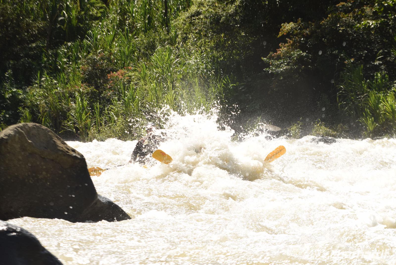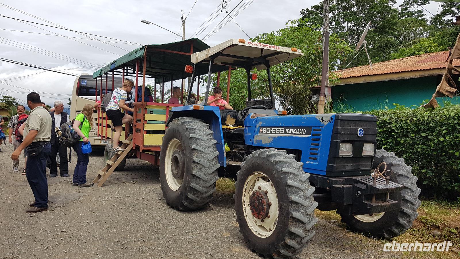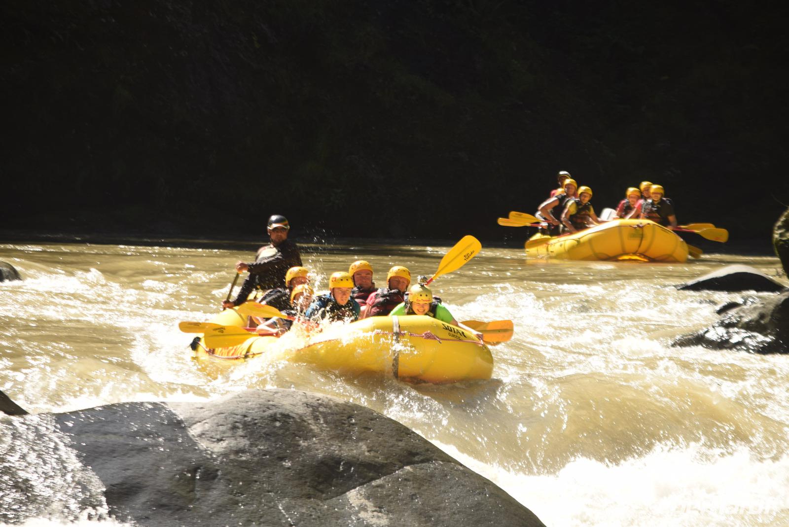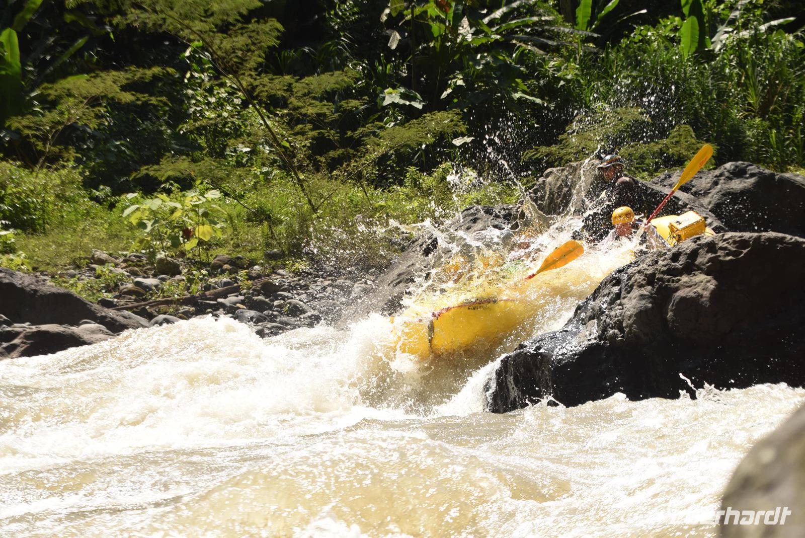 Wir waren alle früh aufgestanden und genossen den wunderschönen Garten unserer Lodge und den Blick hinunter ins Tal. Beim Frühstück gab es nur noch ein Thema - Rafting. Die Koffer wurden verstaut und das kleine Gepäck nahmen wir mit in den Bus. Unten in Turrialba stoppten wir beim Supermarkt und Truman fuhr zur Tankstelle. Dann ging es weiter Richtung Rafting Startplatz. Oberhalb des Paguare Flusses erwartete uns schon Jorge, einer der Bootsführer von Rios Tropicales und wir stiegen um in eine "Landwirtschaftslimousine", wie Nico den Traktor mit Anhänger liebevoll nannte. Die Fahrt auf steilem Weg hinunter zum Fluss war eigentlich schon Abenteuer Nr.6. Aber wir wollen mal nicht übertreiben ! Unten am Fluss lagen die grossen Schlauchboote, Helme und Rettungswesten bereit. Wir gaben unser kleines 2-Tages-Gepäck zum Verstauen ab, legten Helme und Rettungswesten an und danach wurden die Bootsteams zusammen gestellt - 2 x 6 Personen und 1 x 8 Personen. Für das Rafting war Alex, ein junger Schwede, zu unserer Gruppe gestossen und verstärkte unser Team. Nun erfolgte eine umfangreiche Sicherheitseinweisung durch Jorge. Nach und nach bestiegen wir die Schlauchboote und wurden nochmals von unseren Bootsführern eingewiesen. Kurz nach dem Start wurde einer ins Wasser gestossen, um die Rettung zu demonstrieren und unsere ständige Aufmerksamkeit nochmals zu unterstreichen. Alle mussten den Befehlen des Bootsführers zügig Folge leisten, denn nur so war das Mega-Abenteuer zu bewältigen. Es klappte alles erstaunlich gut und wir hatten unbeschreiblich viel Spass, obwohl wir schon nach dem ersten Strudel klitschnass waren. Die Boote schwankten auf und ab, drehten sich wild in den Strudeln und oft waren nur noch die gelben Paddel zu sehen. Ich ging plötzlich über Bord und landete unter dem Boot, aber Ivan packte mich an der Rettungsweste und zog mich wieder ins Boot.