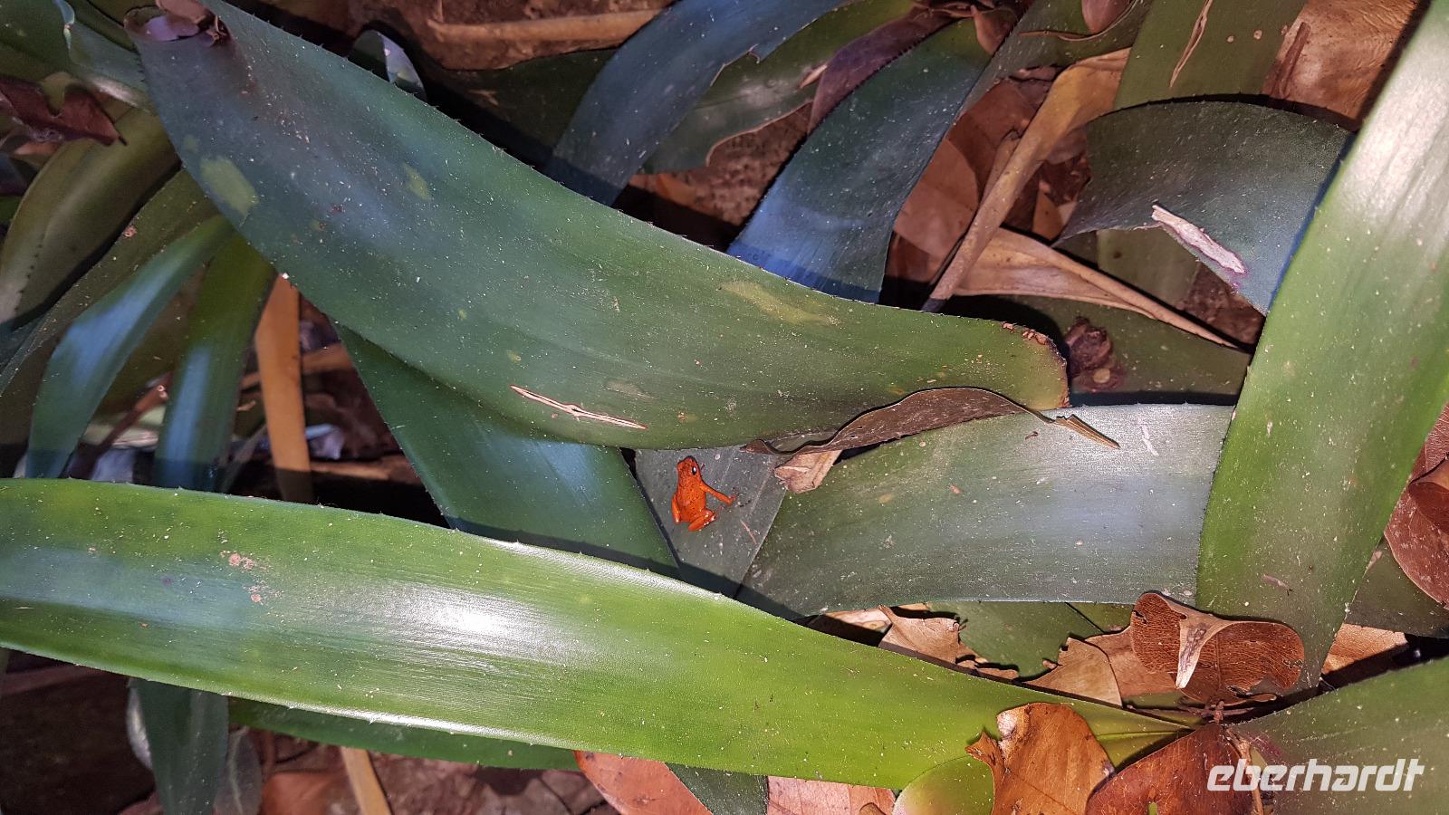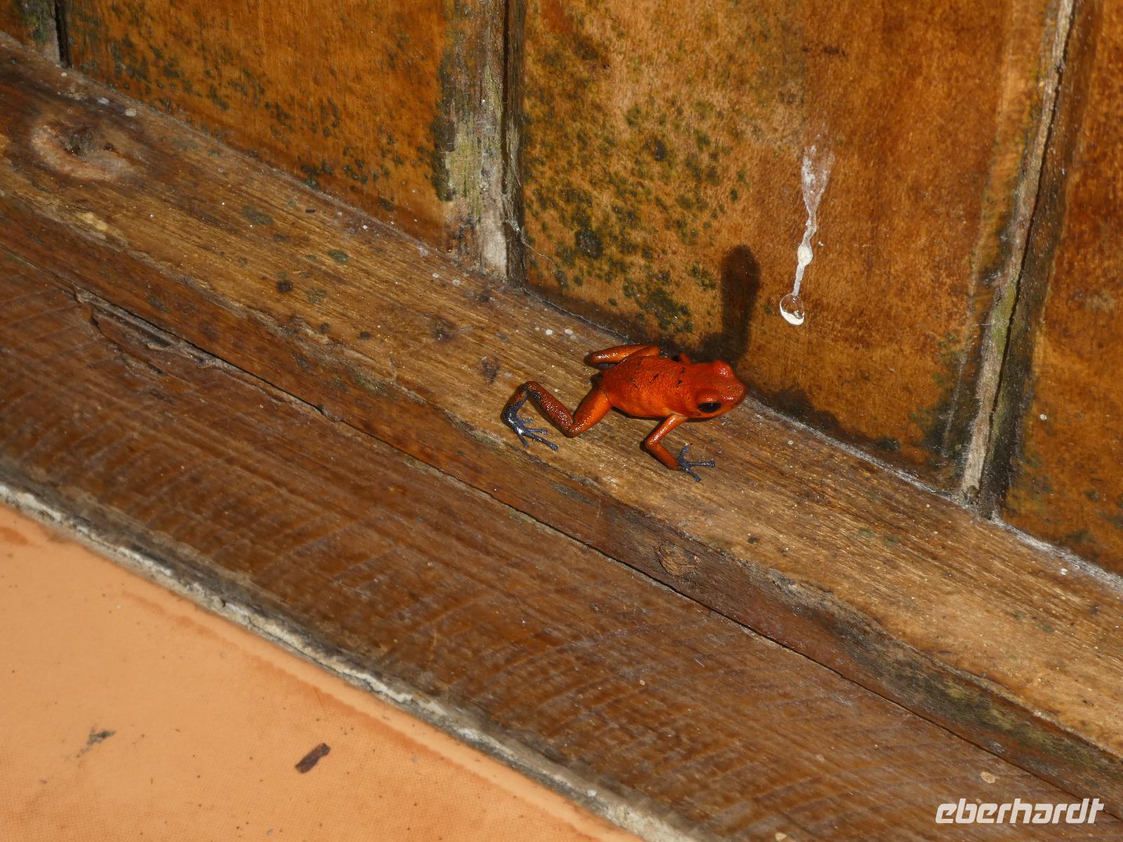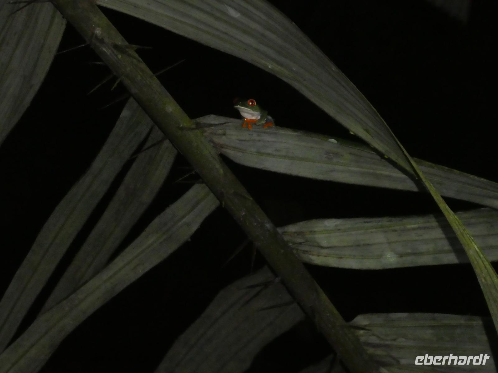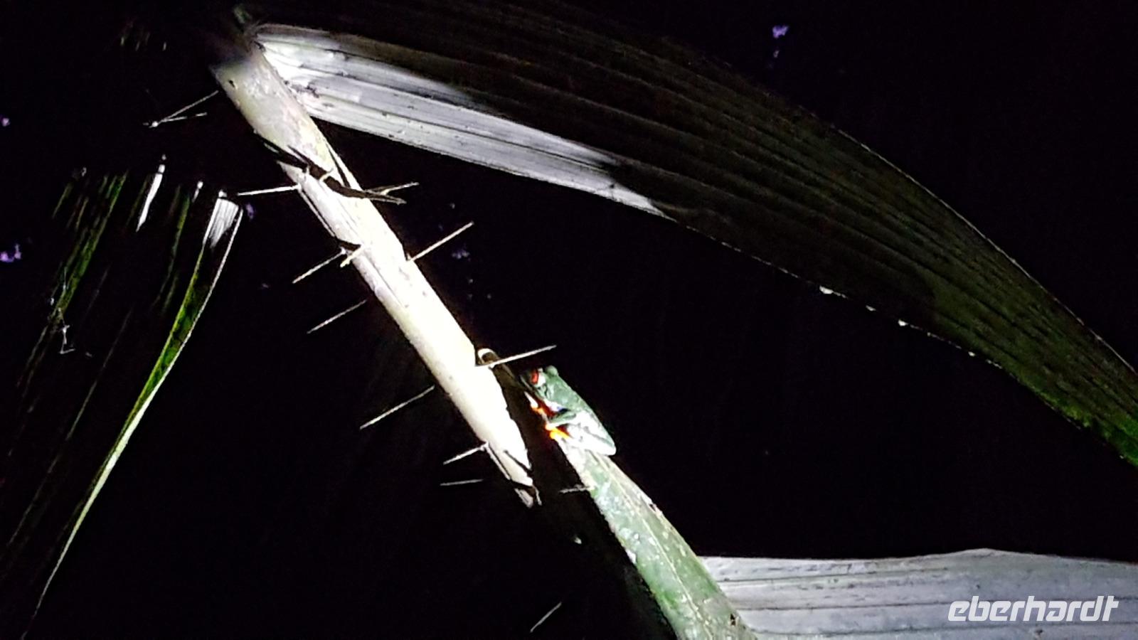 Unsere Fahrt mit dem Bus ging weiter in Richtung Karibikküste und an einer Bootsanlagestelle luden wir unser gesamtes Gepäck auf ein Boot und wir fuhren in einem anderen Boot in den Tortuguero National Park. Schon während der zweistündigen Fahrt genossen wir die üppige Natur entlang der Wasserwege und in unserer Lodge begrüsste man uns mit einem Drink an der Bootsanlegestelle. Wir checkten ein, bezogen unsere kleinen Häuschen und trafen uns kurz darauf wieder mit Taschenlampen zu einem ersten Regenwaldspaziergang. Dafür zogen wir Gummistiefel an und konnten so die schlammigen Wege gut bewandern. Nico fand viele Tiere in der Dämmerung, die wir beobachteten und fotografieren konnten. Das Abendessen gab es vom Bufett und danach fielen wir todmüde in unsere Betten. Draussen ging derweil Starkregen nieder.
