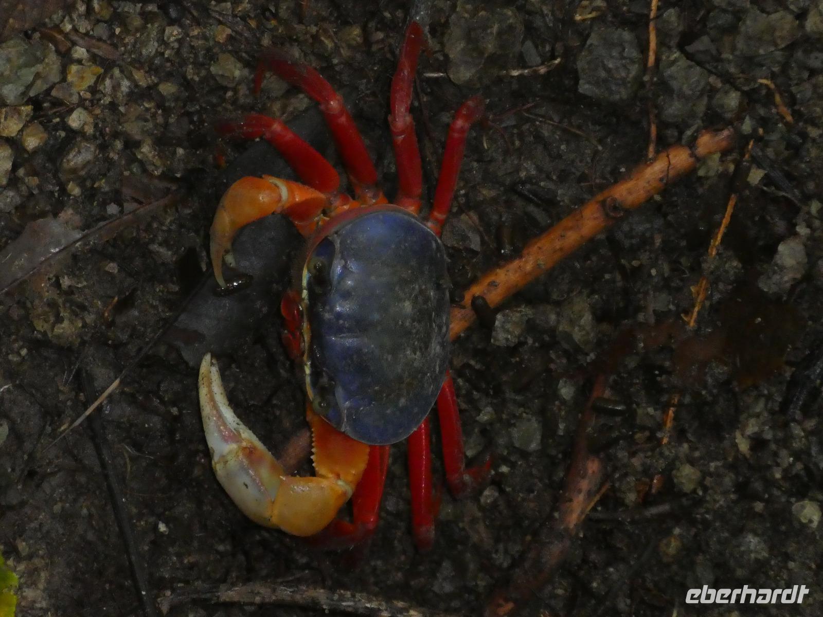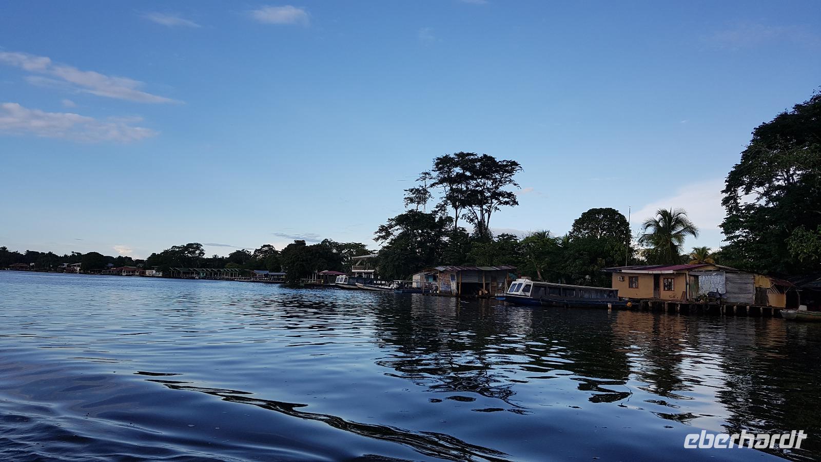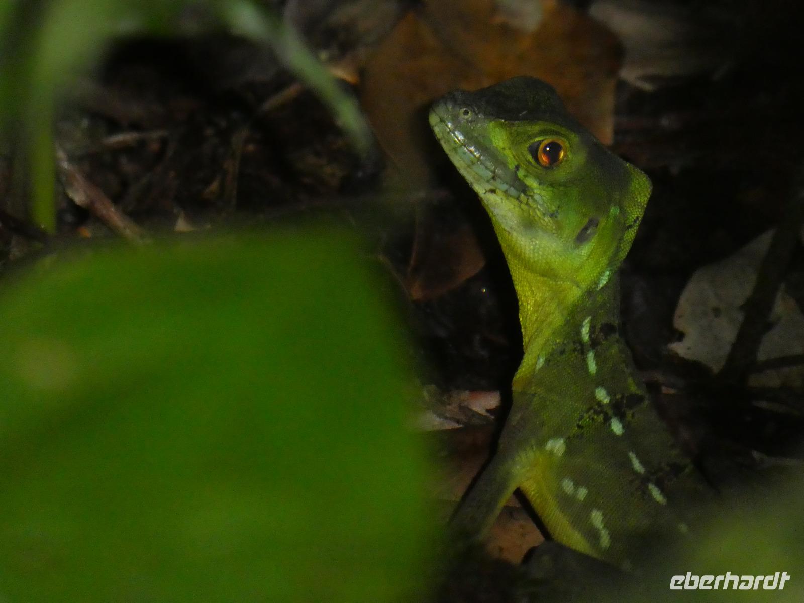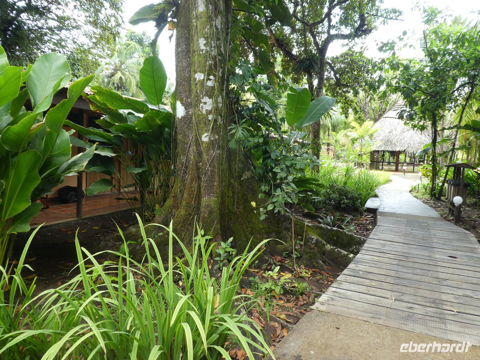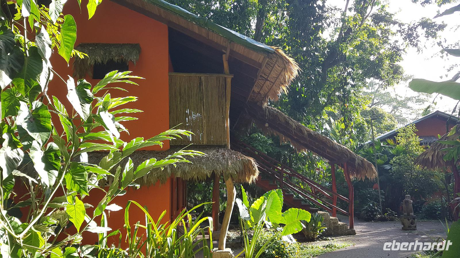 Unsere Fahrt mit dem Bus ging weiter in Richtung Karibikküste und an einer Bootsanlagestelle luden wir unser gesamtes Gepäck auf ein Boot und wir fuhren in einem anderen Boot in den Tortuguero National Park. Schon während der zweistündigen Fahrt genossen wir die üppige Natur entlang der Wasserwege und in unserer Lodge begrüsste man uns mit einem Drink an der Bootsanlegestelle. Wir checkten ein, bezogen unsere kleinen Häuschen und trafen uns kurz darauf wieder mit Taschenlampen zu einem ersten Regenwaldspaziergang. Dafür zogen wir Gummistiefel an und konnten so die schlammigen Wege gut bewandern. Nico fand viele Tiere in der Dämmerung, die wir beobachteten und fotografieren konnten. Das Abendessen gab es vom Bufett und danach fielen wir todmüde in unsere Betten. Draussen ging derweil Starkregen nieder.