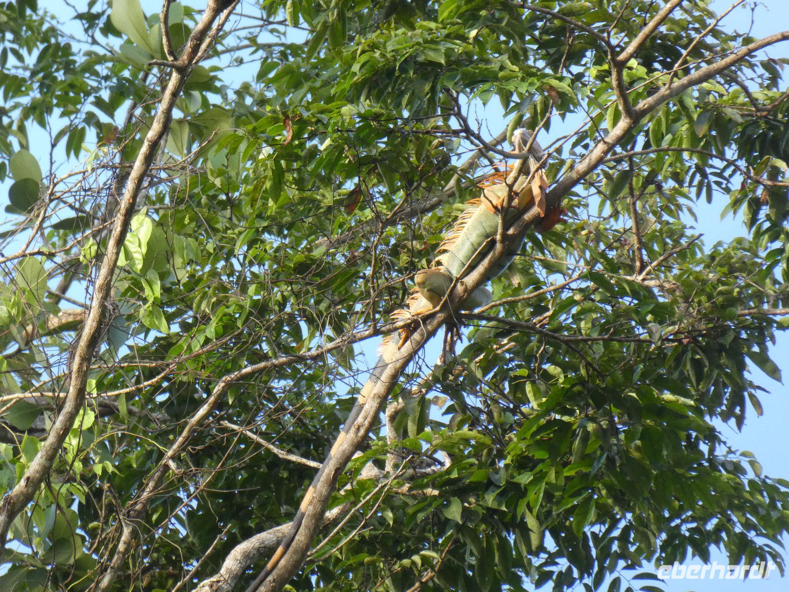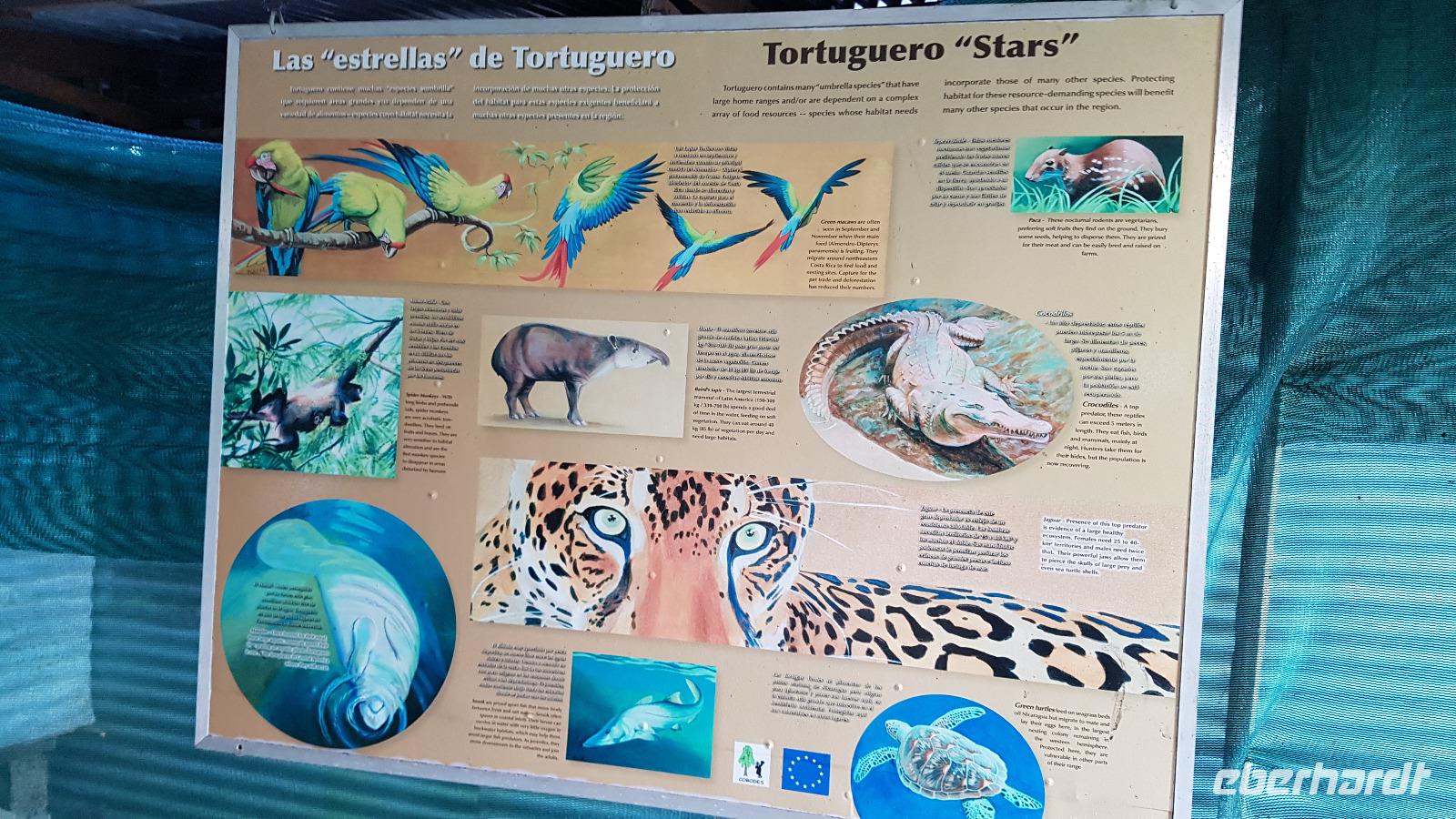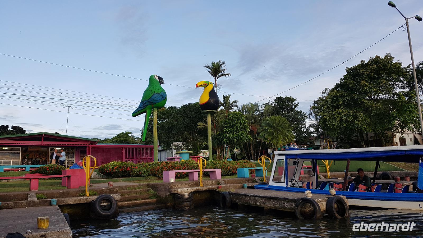Nach dem Mittagessen am frühen Nachmittag brachen wir nochmals auf zu einer Tierbeobachtungsfahrt im Boot mit Dach. Das war sehr gut, denn es begann schon wieder zu regnen und wir waren schon am Vormittag 2mal nass geworden. Zwar störte das Bootsdach beim Fotografieren ein wenig, aber das nahmen wir gern in Kauf. Wir sahen Krabbenreihen und Krabbenbussard, ein Gelbstirnblatthühnchen, Schlangenhalsvögel weiblich und männlich, einen grünen Leguan oben im Baum, Nacktkehlreiher, Oropendola an den Bäumen und eine schöne Goldspinne. Im Dorf Tortuguero hatten wir ein wenig Zeit für einen Spaziergang und dann brachte uns das Boot zurück zur Lodge. Dort gab es auch sogleich Abendessen wieder vom Bufett. Wir sassen noch ein wenig zusammen und besprachen dann mit Nico unsere Abreise ganz in den Süden Costa Ricas an der Karibikküste.