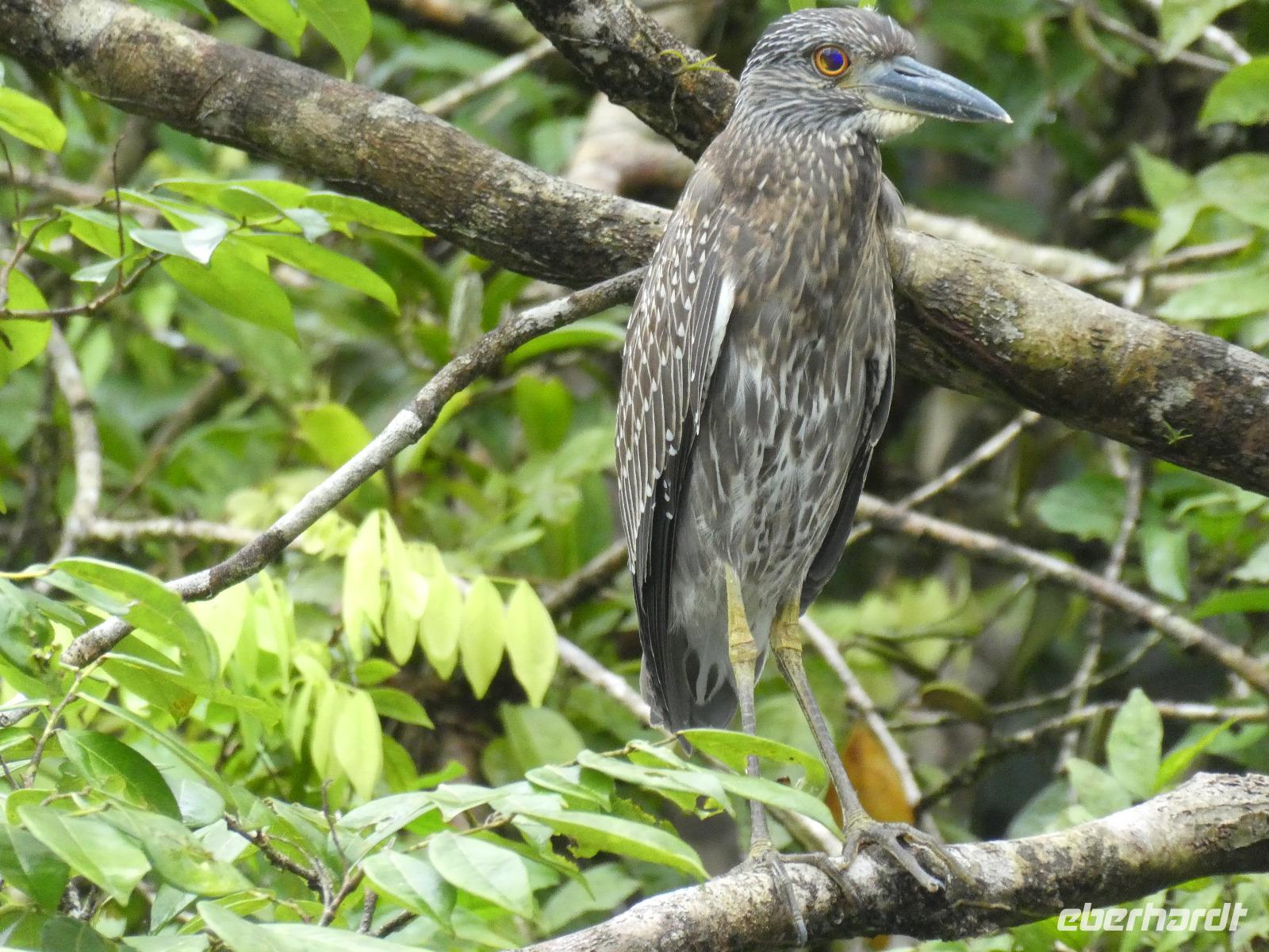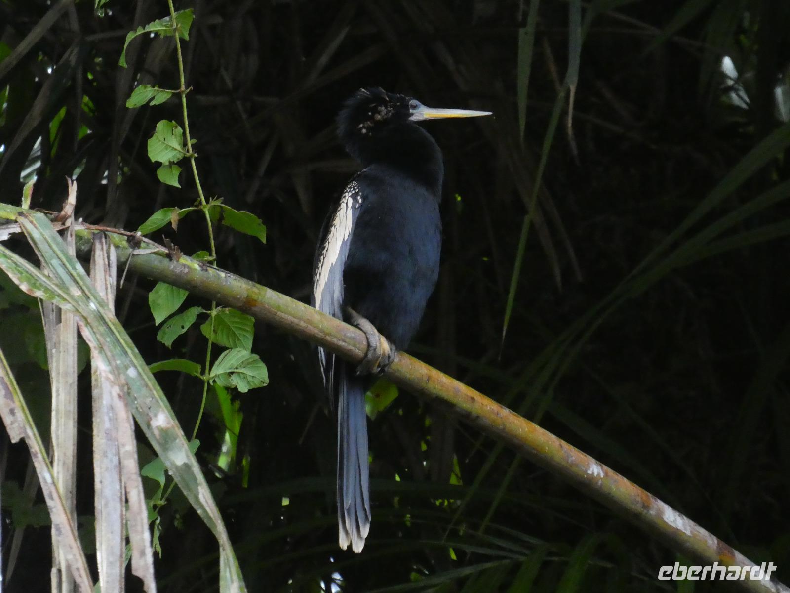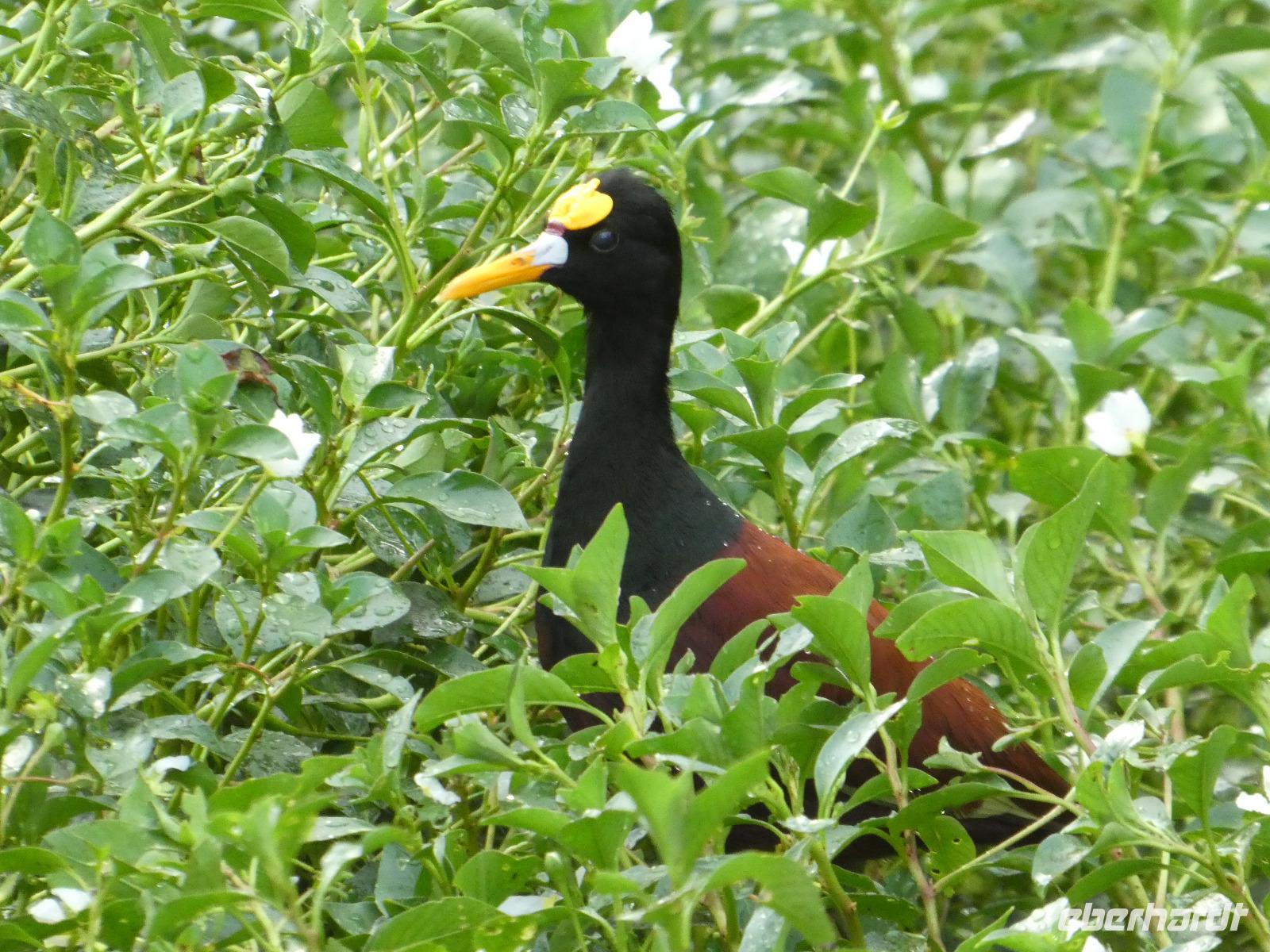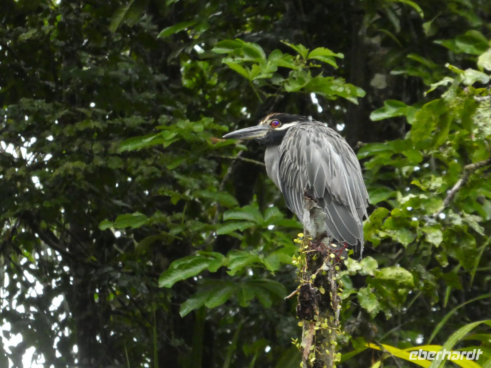 Nach dem Mittagessen am frühen Nachmittag brachen wir nochmals auf zu einer Tierbeobachtungsfahrt im Boot mit Dach. Das war sehr gut, denn es begann schon wieder zu regnen und wir waren schon am Vormittag 2mal nass geworden. Zwar störte das Bootsdach beim Fotografieren ein wenig, aber das nahmen wir gern in Kauf. Wir sahen Krabbenreihen und Krabbenbussard, ein Gelbstirnblatthühnchen, Schlangenhalsvögel weiblich und männlich, einen grünen Leguan oben im Baum, Nacktkehlreiher, Oropendola an den Bäumen und eine schöne Goldspinne. Im Dorf Tortuguero hatten wir ein wenig Zeit für einen Spaziergang und dann brachte uns das Boot zurück zur Lodge. Dort gab es auch sogleich Abendessen wieder vom Bufett. Wir sassen noch ein wenig zusammen und besprachen dann mit Nico unsere Abreise ganz in den Süden Costa Ricas an der Karibikküste.