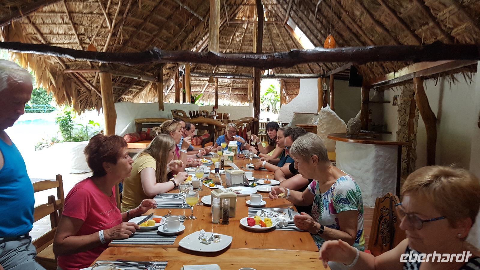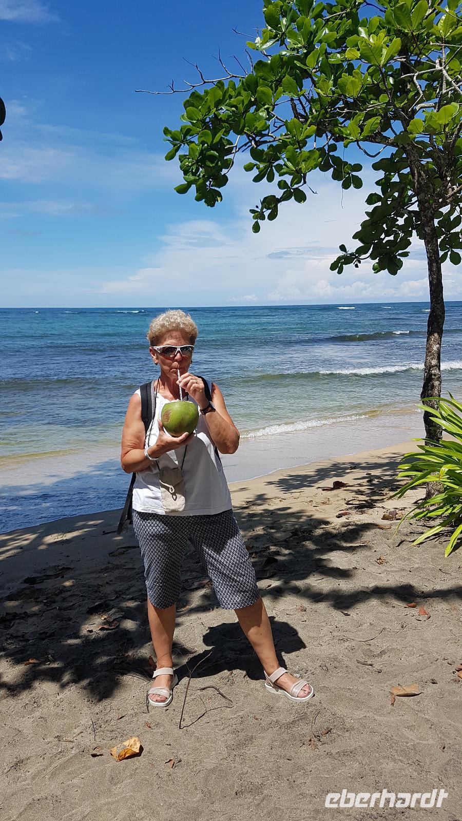 Heute gab es was zu feiern, denn 2 Singles hatten Geburtstag. Zum kleinen Geburtstagsgeschenk brachte der Kellner jedem einen kleinen Kuchen mit Kerze und wir sangen ein Geburtstagsständchen. Nach dem Frühstück brachen dann 7 Singles zu Fuss zur Tierauffangstation Jaguar auf und nahmen dort an einer Führung teil. Die anderen Singles verbrachten den Vormittag am Meer und 11 Uhr startete unser Bus in Richtung Gandozo-Manzanillo-Schutzgebiet. Dort machten wir gemeinsam im Schutzgebiet einen Spaziergang und bestaunten die Vegetation und die alten Korallenriffe am Strand. Zu Mittag kehrten wir in einem typisch karibischen Lokal ein, wo es sehr viel Geduld brauchte. Der am Strassenrand gekaufte Fleischspiess oder die Kokosnuss direkt vor uns aufgeschlagen und trinkbereit gemacht, gingen da wesentlich schneller. Wieder zurück in unserem Hotel, gönnten wir uns einen Kaffee.