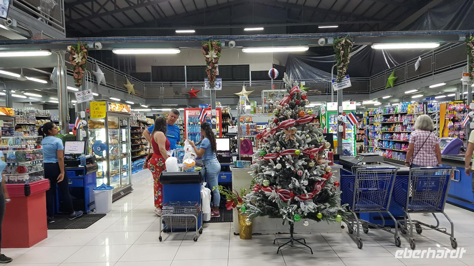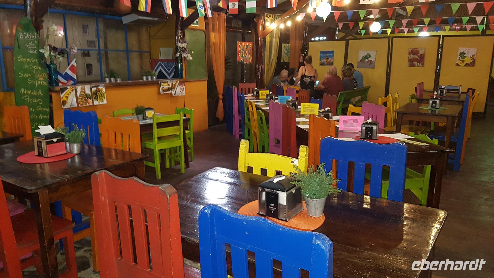 Halb Fünf fuhren wir mit unserem Bus in den kleinen Ort Puerto Viejo, um zunächst bei der Post Briefmarken zu kaufen und die geschriebenen Karten auch gleich aufzugeben. Es wurde höchste Zeit dafür. Dann hatten wir genügend freie Zeit zum Bummeln, Einkaufen, Leute beobachten usw. Im Restaurant Bikini trafen wir uns dann wieder zum Abendessen. Wir durften aus einer sehr umfangreichen Karte das Hauptgericht auswählen. Die riesigen Portionen schaffte kaum einer, aber es schmeckte ganz ausgezeichnet. Dann kam die Geburtstagstorte für die beiden "Kinder" und zum grossen Spass aller wurde typischer Kindergeburtstag mit einer Pinata gefeiert. Dafür mussten die Beiden mit verbundenen Augen eine mit Süssigkeiten gefüllte Box mit einem Stock zerschlagen. Die Box hing an einem Strick und wurde ständig bewegt. Wir alle hatten viel Spass dabei und die dann aus der kaputten Box herausfallenden Bonbons wurden schnell aufgesammelt von allen. Gut gelaunt traten wir mit unserem Bus die Heimfahrt zum Hotel an.