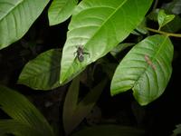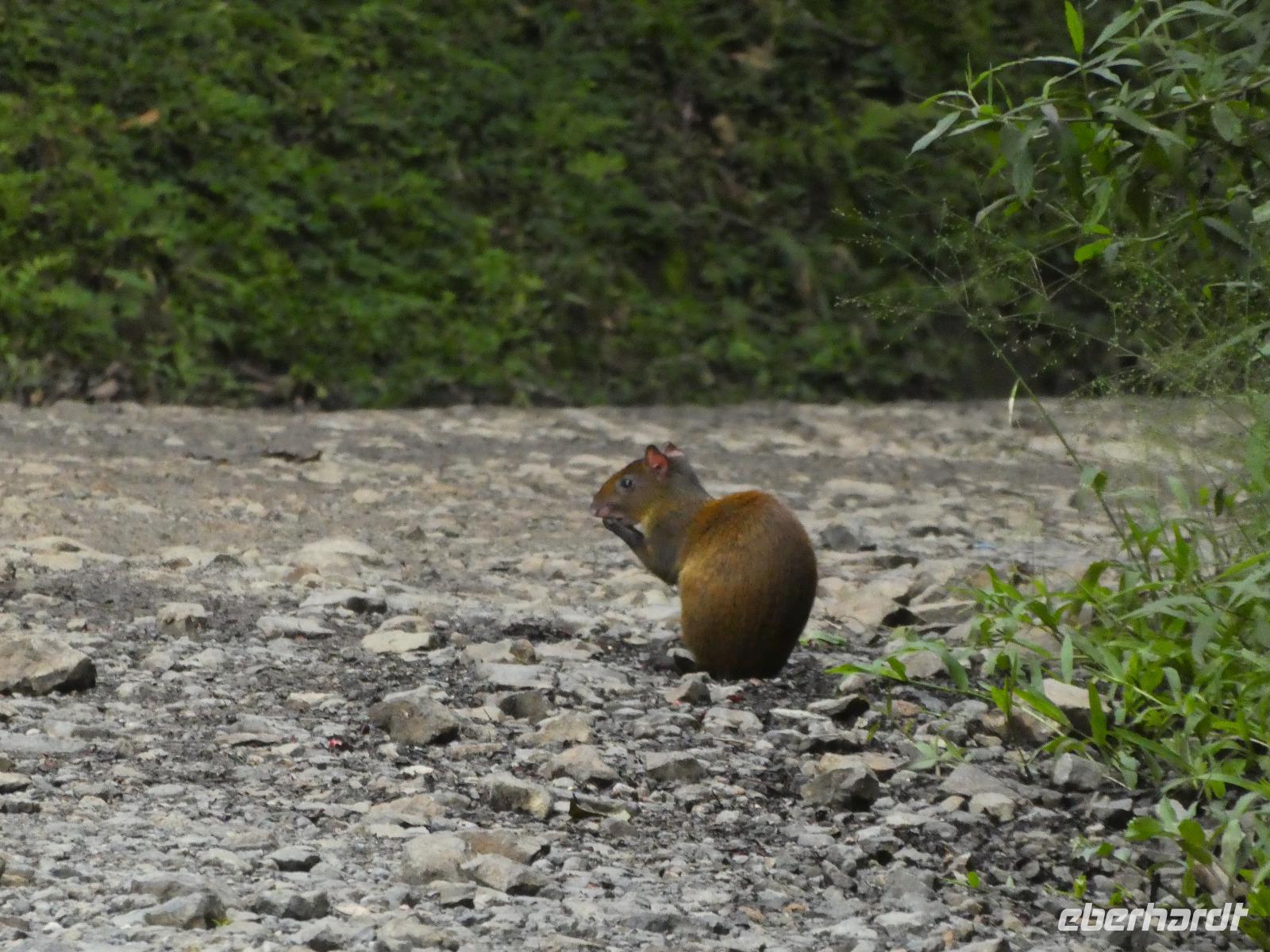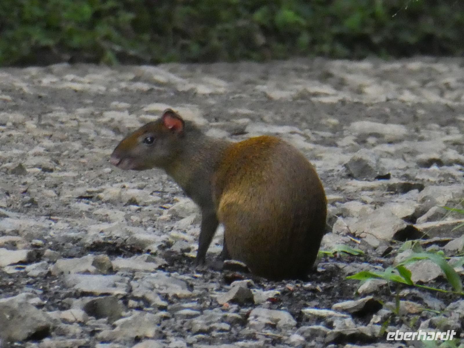 Wieder zurück an der Basissstation konnten wir die Fotos vom Canopy anschauen und erwerben. Dann entschlossen wir uns, so nass wie wir waren, gleich noch die Wanderung zu machen, denn dabei wurden wir eh wieder nass. Über viele Hängebrücken spazierten wir unter den Canopyseilen hindurch und konnten nun die zauberhafte Flora ganz entspannt aus der Nähe betrachten und viele Fotos machen. Viele Tausendfüssler sahen wir und über den Geruch konnte man die Weibchen bestimmen. Nach unserer Wanderung kehrten wir im Parkrestaurant ein und auf der Rückfahrt zur Lodge hielten wir wieder in Santa Elena für Einkäufe. Dann endlich konnten wir uns der nassen Sachen entledigen und an der Rezeption nahm man die nasse Kleidung zum Trocknen entgegen. Mit frischer, trockener Kleidung brachen wir dann noch einmal auf zu einer kleinen Wanderung mit Ziel Würgefeigenbaum. Dieses riesige Exemplar stand an einem Hang und wir konnten in den Hohlräumen der Luftwurzeln hinauf klettern - Abenteuer Nr.2 ! Auf dem Rückweg trafen wir auf ein Aguti, welches am Strassenrand nach Fressbarem suchte. Zum Abendessen fuhren wir hinunter nach Santa Elena ins Restaurant Di Lucia und dort speisten wir ganz vorzüglich.