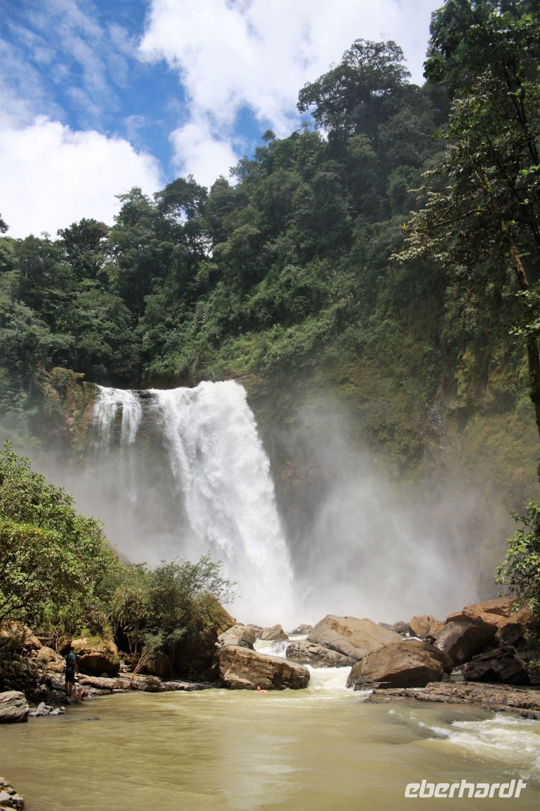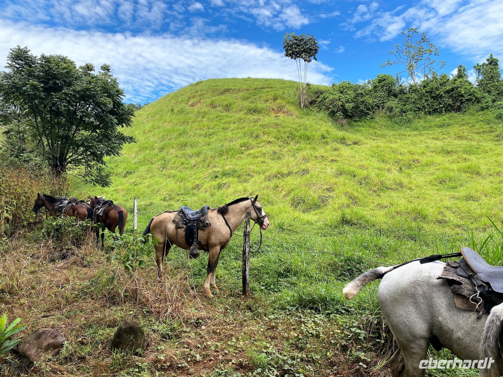 Das Glück der Erde liegt auf dem Rücken der Pferde. Und so geht es heute für einige von uns hoch zu Ross zu einem der noch eher unbekannteren Wasserfälle in Costa Rica: der Eco Chontales. Doch zuvor bringt uns unser Bus über eine etwa 15 km lange Schotterpiste zu einer mehr als fragwürdigen Hängebrücke. Ab hier endet unser Komfort und wir begeben uns zu Fuß über besagte Brücke. Auf der anderen Seite erwartet uns eine Pferdestärke, von der die Hälfte unserer Gruppe gerne Gebrauch nimmt. Der Rest der Gruppe wagt sich bis zum ca. 4,5 km entfernten Wasserfall zu Fuß weiter, was bei der sengenden Hitze an diesem Tag und einer gefühlten Luftfeuchtigkeit von 90%, am Ende des Weges eher den Eindruck eines gelaufenen Halbmarathons bei uns hinterlässt. Doch unsere Strapazen werden belohnt, als wir vor dem beeindruckenden Wasserfall stehen, von dem eine gewaltige Menge an Wasser in die Tiefe stürzt. Hier genießen wir nun etwas Erholung, gehen baden, sitzen in der Sonne und stärken uns beim reichhaltigen Mittagessen für unseren Rückweg.