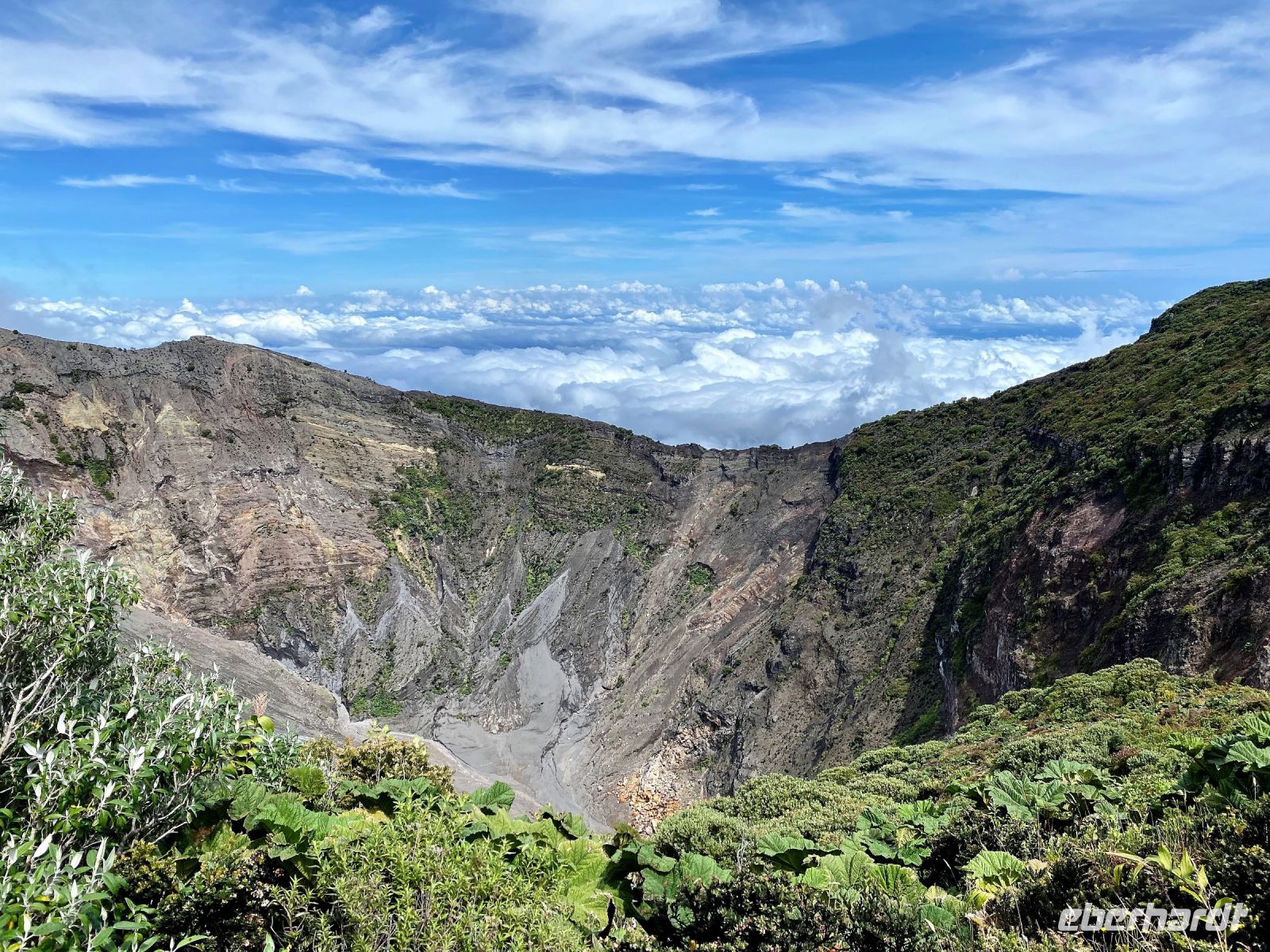 Zu den Highlights Costa Ricas gehören zweifelsohne die zahlreichen Vulkane. Vielen von ihnen schlafen oder sind bereits erloschen, 6 aber sind immer noch aktiv. Die bekanntesten sind der Poas, der Turrialba sowie der Irazú-Vulkan, wobei der letztere mit mehr als 3400 Metern sogar der höchste Vulkan Costa Ricas ist. Praktischerweise ist er zudem auch am einfachsten zu erreichen, da eine sehr gut ausgebaute Straße bis direkt nach oben führt. Doch bevor wir den Vulkan besteigen, oder besser gesagt ganz bequem nach oben gefahren werden, machen wir auf unserem Weg dorthin noch einen kurzen Stopp in einer kleinen Käserei, wo wir für unser geplantes Picknick zum Mittag, eher landesuntypischen, kräftig im Geschmack schmeckenden Käse kaufen. Dazu noch ein paar Stangen Baguette und unserem Picknick steht nichts mehr im Weg. Doch wie versprochen folgt erst einmal die Fahrt zum Vulkan Irazú (oder auch der „grollende Berg“). Oben angekommen erreichen wir nach gerade einmal 5 Minuten Fußweg die beeindruckenden zwei Hauptkrater. Einfacher kommt man auf dieser Welt kaum auf solch einen exponierten Vulkan, denn an klaren Tagen kann man vom Irazú (angeblich) bis an beide Küsten schauen – Pazifik und Karibik. So beeindruckend wie der Blick von oben war, so merkten einige von uns dann aber doch, in welcher Höhe wir uns eigentlich befinden. Die Luft wurde dünner, die Beine schwer und so waren wir nicht ganz unglücklich darüber, als wir uns auf den Weg zum Startpunkt unserer heutigen Wanderung machten, der zum Glück ganze 500 m unterhalb des Kraters lag.