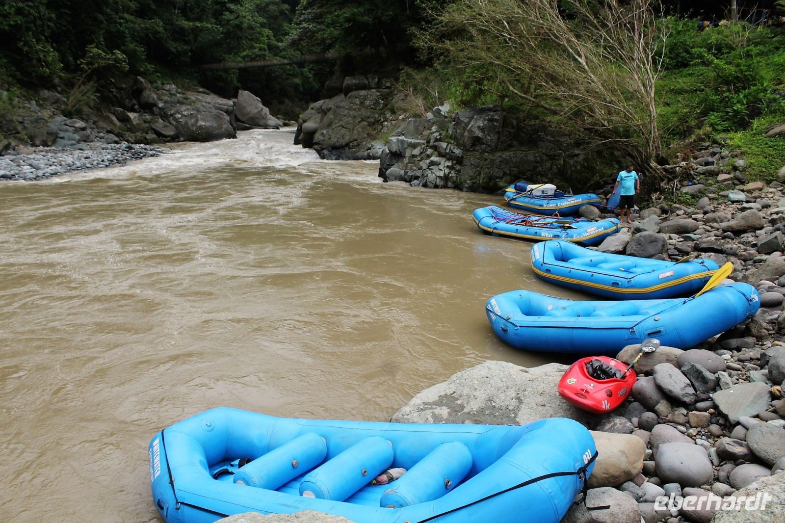 Gekonnt bringt uns unser Beto auf einem Holperweg in steilen Serpentinen hinunter in die Schlucht zum Fluss. Hier unten am Ufer, gibt es nur noch ein dominierendes Geräusch: das Tosen des Wassers. Unsere Boote werden vom Hänger gehievt, Schwimmesten, Paddel und Helme liegen bereit, dann werden unsere Rücksäcke und Kameras in wasserdichte Säcke verpackt, die auf einem Extraboot ihren Platz finden. Bevor es dann aber so richtig losgeht, bekommen wir natürlich noch eine umfangreiche Sicherheitseinweisung mit einigen Trockenübungen dazu. Die Befehle, die wir vom jeweiligen Guide in unserem Boot während der Fahrt zugeschriehen bekommen, werden natürlich auch geübt. Kommandos wie vorwärts, rückwärts, Stopp, alle auf eine Seite, alle in die Mitte des Boots, werden uns in den nächsten 2 Tagen begleiten – das Ganze natürlich auf Englisch.