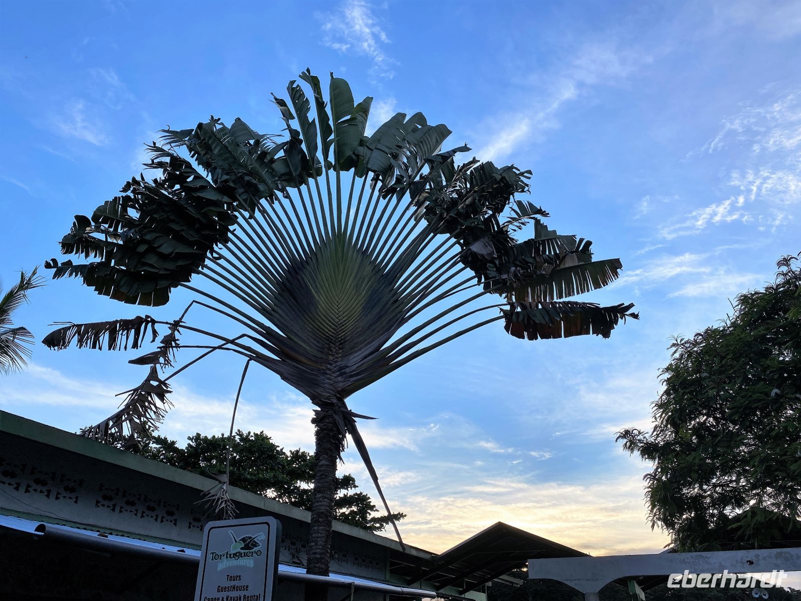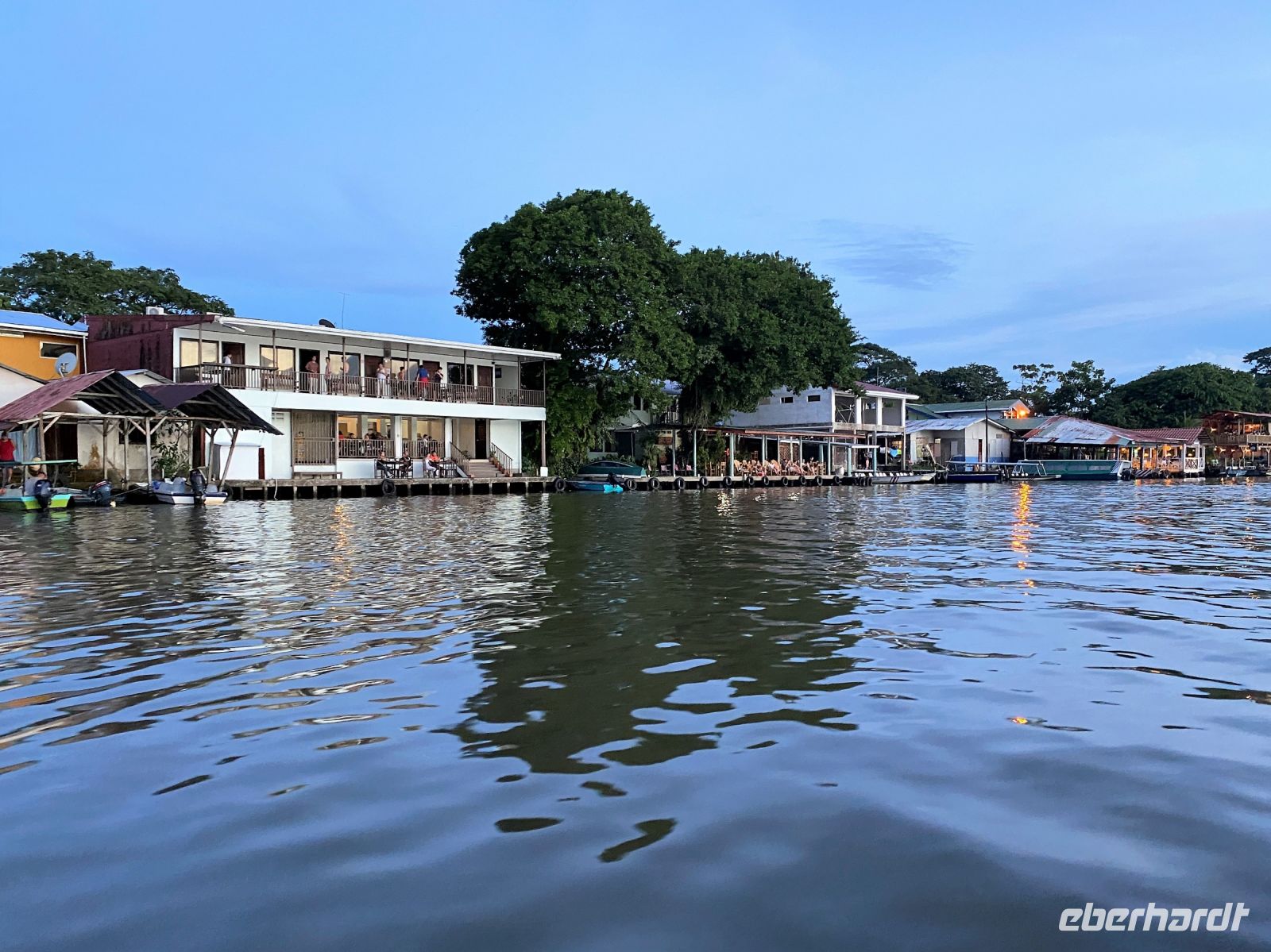 Kurze Zeit später findet unser Raftingabenteuer sein Ende. Nun heißt es rein in trockene Kleidung und Abschied nehmen von unseren Guides, die uns zwei unvergessene Tage Abenteuer beschert haben, bevor wir uns auf den Weg in Richtung Karibikküste machen. Das Ziel Tortuguero, der Weg dorthin spektakulär durch weitläufige Bananenplantagen, über immer holpriger werdende Pisten, weiter zum Pier, wo wir samt Gepäck in ein Boot umsteigen, das uns zur Turtle Beach Lodge bringt. Alleine die Anreise nach Tortuguero ist spektakulär und gleicht einer Erkundungstour und so genossen wir während der zweistündigen Fahrt die üppige Natur entlang der Wasserwege. Auf unserem Weg legen wir noch einen kleinen Zwischenstopp im Dorf Tortuguero ein. Gemeinsam spazieren wir über die kleine Straße, die uns durch das Dorf führt, vorbei an kleinen Shops, einem Supermarkt, Unterkünften, Bars und Cafés. Kaum zu glauben, dass dieser verschlafene Ort zur Hauptsaison voll mit Touristen sein soll. Im Dunkeln erreichen wir später dann unser Domizil für die nächsten zwei Nächte, wo wir am Bootsanleger schon freudig mit einem Willkommens-Drink erwartet werden. Schnell sind die Zimmer bezogen und wir kurze Zeit später hungrig beim Abendessen vom Büffet, bevor wir am heutigen Abend todmüde in unsere Betten fallen.