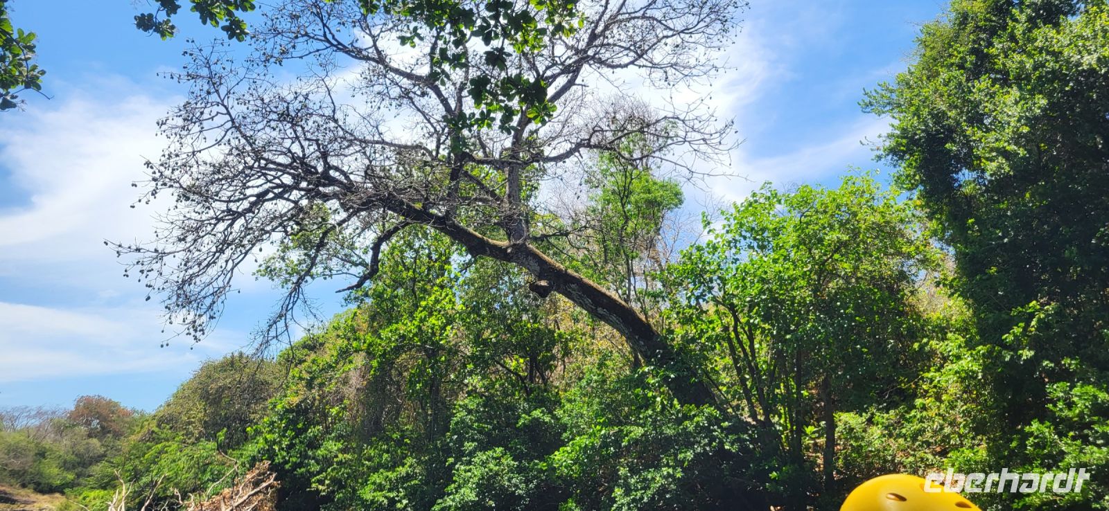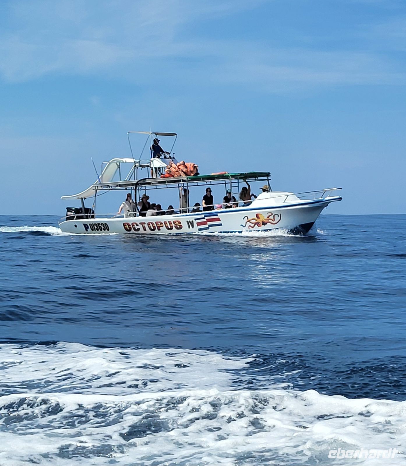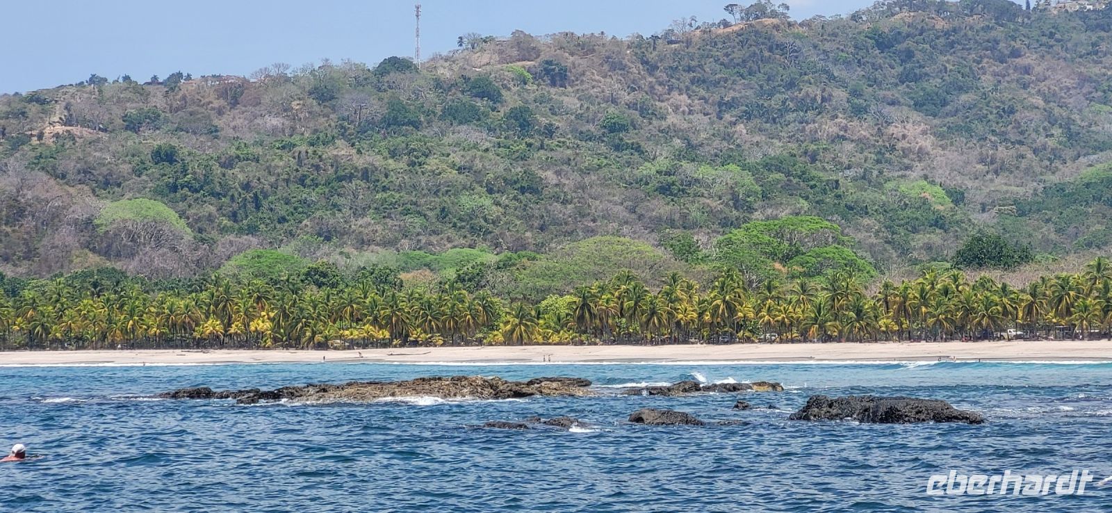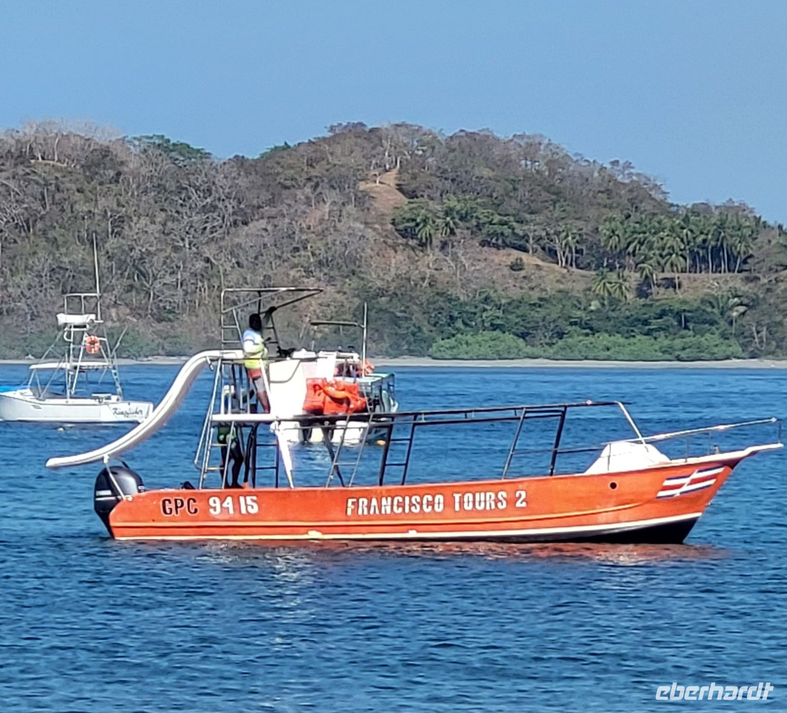 Ohne Brüllaffenweckruf bestens geschlafen, danach ein genüssliches Frühstück bei unseren deutschen Gastgebern und los geht’s für die meisten von uns auf Delphintour. Hierzu werden wir von Francisco abgeholt und in die nahegelegene Bahia Carillo gebracht. Von dieser Bucht startet unsere Tour Richtung offenes Meer und wir sehen lange viiiiiiel Wasser. Plötzlich eine Meeresschildkröte, die zum Atmen an die Oberfläche kommt. Bald darauf einen absolut seltenen und kaum zu sehenden Mondfisch, dessen Erscheinungsbild an Urzeiten erinnert. Irgendwann und ganz fern draußen haben dann auch die Delphine ein Einsehen mit uns und lassen sich in der Nähe unseres Bootes blicken. Ein toller Anblick, diese imposanten Tiere so nah zu sehen. Unser Bootsguide gibt uns viele interessante Informationen zu den Meeresbewohnern und so hören wir, dass Delphinweibchen ihren Nachwuchs säugen, indem sie über eine Drüse Milch ins Wasser absetzen und das Neugeborene bis zu einem Jahr somit Milch über das Meereswasser aufnimmt. Nachdem alle die Tiere ausreichend bestaunt haben, fahren wir zurück zur Küste, wo geschnorchelt werden kann. Ausrüstungen dazu erhalten wir von der Bootscrew und so manche von uns stürzen sich in die warmen Fluten. Viele schöne, bunte Fische werden gesichtet und die Unterwasserwelt Costa Ricas ist ein Erlebnis. So vergeht ein toller Vormittag und zurück an Land, fahren wir wieder zu unserer Unterkunft um uns für den Nachmittag vorzubereiten. Kurz darauf starten wir zum Werner Sauter Biological Reserve, welches von der Familie Sauter als Schutzgebiet erklärt wurde. Anstelle vom Raubbau der Natur vergangener Zeit, hat man sich nun dem Pflanzenschutz verschrieben und dadurch bedingt ist hier nach 30 Jahren ein tolles Biotop entstanden, in dem sich Vögel und viele Pflanzen entdecken und beobachten lassen. Wir sehen so Besonderheiten wie die Stachelzeder, den Krokodilbaum und die Affenleiter. Guide Marcelo erklärt uns viel Wissenswertes entlang unserer Strecke und führt uns hoch hinauf zu einem tollen Aussichtspunkt mit Blick auf die komplette Bucht von Samara. Einfach eine unglaublich schöne Stimmung und ein wunderbares Erlebnis. Zurück in unserer Lodge haben wir Zeit uns wieder frisch zu machen und genießen ein schönes Abendessen im Casa Esmeralda, zu welchem wir zu Fuß in den Ort spazieren.