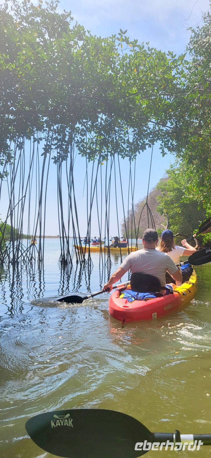 Herrlich geschlafen und auch hier von Brüllaffen geweckt, treffen wir uns zum Frühstück und staunen-es gibt Buffet. Die Hotelanlage wird seit 30 Jahren von einem deutschen Ehepaar betrieben und somit steht für den deutschen Hunger alles bereit. Wir müssen uns leider ein wenig sputen, denn schon bald erwartet uns die Kajaktour Crew, die uns zum morgendlichen Ausflug abholt. Bald sitzen wir im offenen Fahrzeug, die Kajaks auf dem Anhänger hinter uns und los geht’s an der Pazifikküste entlang. Wir passieren den malerischen Strand „Playa Carillo“ mit vielen Kokosnusspalmen-ein Anblick wie im Bilderbuch. Am Ora Fluss angekommen, verteilen wir uns zu zweit auf die Kajaks und paddeln Richtung Flussmündung am Meer. Es bietet sich uns eine herrliche Kulisse. Ruhiges Gewässer, Natur pur, die Brüllaffenfamilien machen ihrem Namen alle Ehre, aber auch viele Vogelstimmen erfreuen uns. Ein Krokodil am Ufer, Fledermäuse am Baum, Reiher und Adler in der Luft, einfach eine wunderbare Stimmung. An der Flussmündung angekommen, pausieren wir mit kalten Getränken und frisch aufgeschnittener Ananas sowie Wassermelone und auch ein Spaziergang am Pazifik darf nicht fehlen. Auf dem Rückweg kommen uns der Wind und die Strömung sehr entgegen, sodass wir mühelos wieder zum Ausgangspunkt gelangen. Auf gleichem Wege geht es per Geländewagen wieder zurück, womit wir mittags wieder an unserer Unterkunft angelangt sind. Der Nachmittag steht nun zur freien Verfügung, wir erkunden das Städtchen, nehmen ein Bad im Pool oder spazieren den 4 Km langen Sandstrand entlang, einfach herrlich und das alles bei unglaublichen 36° C. Vor dem Abendessen gibt es eine Überraschung für unsere Gäste. Nico und ich organisieren einen kleinen Umtrunk zum Sonnenuntergang am Playa Carillo und so stoßen wir in fröhlicher Runde auf unser tolles Abenteuer Costa Rica an-Pura Vida. Anschließend speisen wir genüsslich bei Live Musik im Restaurant Las Olas, welches direkt am Strand gelegen ist.