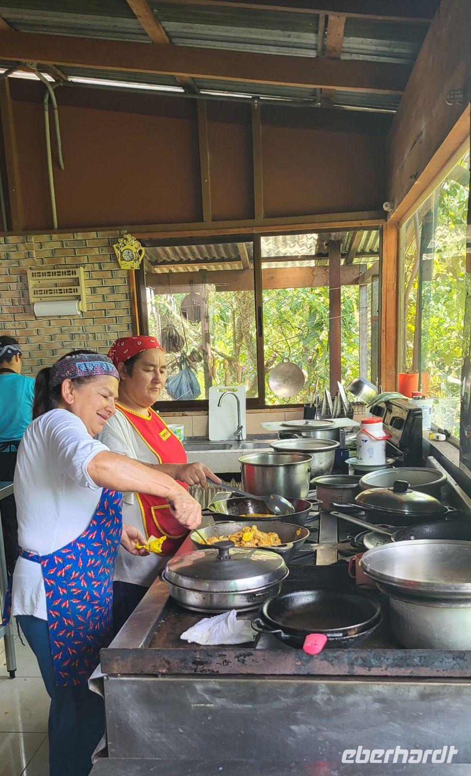 Nach einem letzten Frühstück mit Aussicht, verlassen wir Samara und freuen uns auf eine kühlere Region, die wir Richtung Monte Verde antreffen werden. Unseren ersten Halt machen wir in Nicoya und besichtigen die aus der Kolonialzeit stammende Kirche von 1556 „Iglesia de San Blas de Nicoya“. Weiter geht’s zur technischen Pause nach Limon, wo wir zum ersten Mal in Costa Rica Aras in freier Wildbahn antreffen. Wir hören von Nico, dass sich hier eine Art Auffangstation dieser befindet, mit dem Ziel, sie eigentlich wieder auszuwildern. Dies funktioniert nur mäßig, denn offensichtlich fühlen sich die Tiere so wohl, dass sie einfach bleiben. Somit hat sich dieser Ort natürlich zum Besucheranziehungspunkt entwickelt, da jeder diese prächtigen Tiere sehen möchte. Auf dem Weg nach Monteverde schraubt sich unser Bus endlose Serpentinen hinauf auf über 1000 m Höhe, von wo aus wir eine unglaubliche Aussicht auf die nun unter uns in der Ferne liegende Nicoya Halbinsel haben. Mittags erreichen wir Dona Hermida, die uns bereits mit einem leckeren Mittagessen und somit Costa-Ricanischer Hausmannskost erwartet. Wir sitzen wie bei Freunden auf der Veranda, schauen den Damen beim Werkeln zu und lassen uns kulinarisch verwöhnen. Einfach köstlich, diese einheimischen Spezialitäten auszuprobieren. Dazu hausgemachte Säfte aus besonderen Früchten und ein besonders schmackhafter Kaffee aus der eigenen Plantage dürfen natürlich auch nicht fehlen. Dona Hermida hat vor Jahrzehnten als eine der ersten Frauen Costa Ricas ein Naturimperium aufgebaut, welches uns ihr Enkel Alan sehr informativ bei einem schönen Rundgang näher bringt. Wir sehen verschiedene Kaffeeplantagen, teils in voller Blüte, teils bereits mit Kaffeekirschen, daneben endlose Kräuter, die duften und auch heilende Wirkungen haben. Papayabäume, Jackfruits und Grapefruitbäume fehlen hier genauso wenig wie Bananenstauden oder Mangobäume. Nachdem wir uns noch herrlich duftenden Kaffee direkt von Dona Hermidas Plantage mitnehmen, steuern wir unser Tagesziel Monteverde an. Nach einem kurzen Check-in, treffen wir uns mit Herrn Ricardo, einem Quäker, der uns einen spannenden Vortrag über die Entstehung der Monteverde Region hält. Wir erfahren, dass sich einst einige Quäker, die in den USA lebten, in Costa Rica niederließen. Als pazifistische Religionsgemeinschaft stimmte deren Philosophie nicht mehr mit der Politik der USA überein und man fand in Costa Rica eine neue Heimat. Das Stück Land, auf dem sie sich niederließen, wurde bewohnbar gemacht und mit dem Namen Monte Verde getauft. Wir sehen viele alte Aufnahmen aus Herrn Ricardos Familienalbum. Eine wirklich beeindruckende Begegnung. Den heutigen Abend verbringen wir im Hotelrestaurant und lassen den Tag in netter Runde Revue passieren.