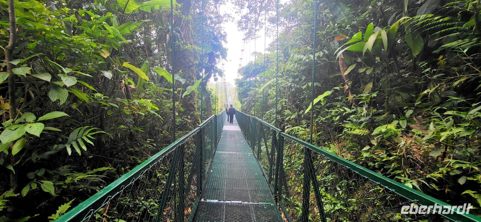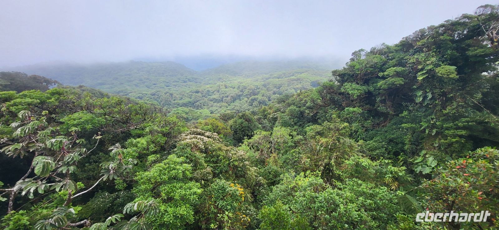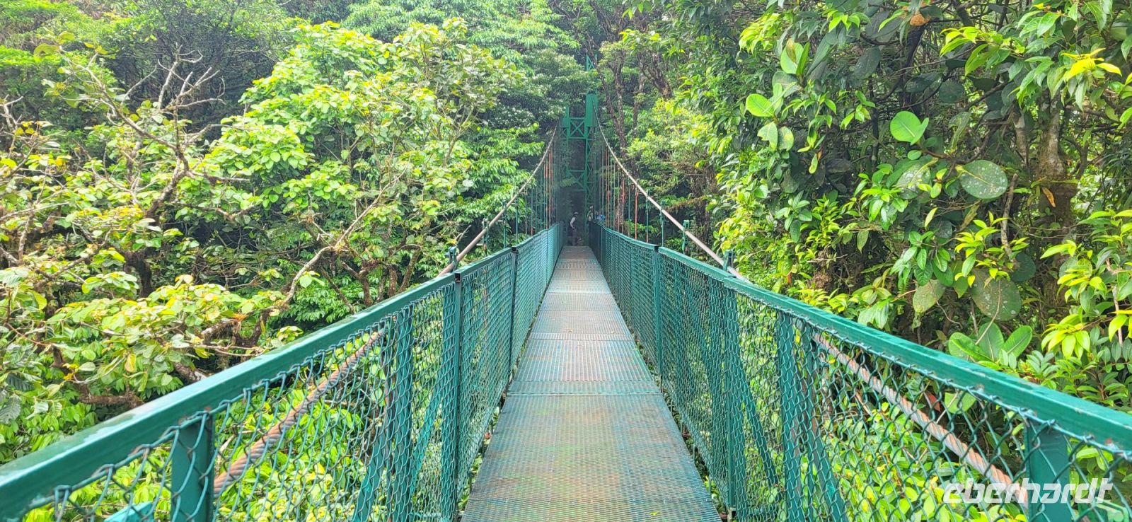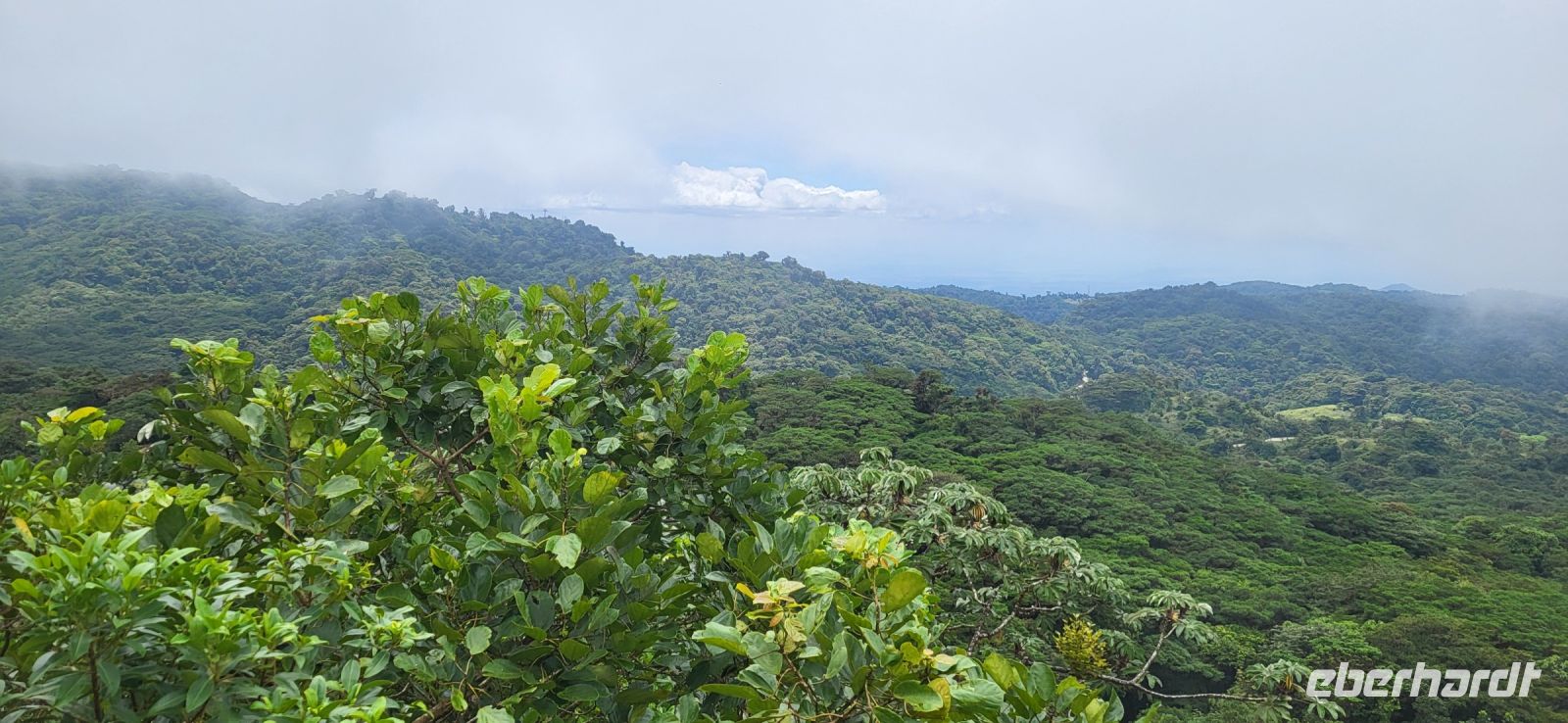 Nach einem reichhaltigen Frühstück vom Buffet starten wir gemeinsam Richtung Nebelwald. Busfahrer Henry fährt uns 30 Min. über Stock und Stein, bis wir unseren Ausgangspunkt erreicht haben. Zunächst starten wir mit den insgesamt 8 Hängebrücken, die von bis zu 30 m Höhe und 157 m Länge eine unglaubliche Aussicht über die Baumkronen des Nebelwalds und die umliegende Umgebung bieten. So mancher Vogel ist zu hören, andere auch zu sehen. Den bekanntesten Bewohner des costa-ricanischen Waldes-den Quetzal- entdeckt Adlerauge Nico und mithilfe unserer Ferngläser und Fotoapparate sehen auch wir ihn im Dickicht. Der Nebelwald erweist sich alle Ehre und so ziehen teils Nebelschwaden an uns vorbei und schaffen eine unwirkliche Atmosphäre. Nach einem Mittagsstopp begeben wir uns nun auf eine schöne Wanderung durch den Nebelwald und sind beinahe alleine unterwegs. Wir begegnen nur wenigen Menschen und genießen die Urwaldatmosphäre mit allen Geräuschen, Gerüchen und vor allem viel Natur. So wandern wir auf 1600 m Höhe bei milden Temperaturen. Unser Ziel ist die Wasserscheide, von wo aus wir bis zur Nicoya Halbinsel mit Samara blicken können, sowie auf der anderen Seite bei wolkenlosem Himmel die Karibikküste erspähen würden. So nicht heute, da alles Wolkenverhangen ist. Trotz allem ist es eine wunderschöne Tour durch den Nebelwald mit unendlichen Pflanzen, mystischen Bäumen und Vogelstimmen, die uns sehr gut gefallen hat. Abschließend beginnt indessen ein neues Abenteuer, zu dem sich die meisten aus unserer Gruppe entscheiden. Die sogenannte Canopytour. Bestens geschützt durch diverse Gurte und Seile sausen die Gäste über den Nebelwald und die verschiedensten Stationen. Eine großartige Gaudi und ein unvergessliches Abenteuer über die Baumkronen Costa Ricas zu fliegen. Unser heutiges Abendessen erfolgt bei Thomas und Thiago, einem schönen Restaurant, fußläufig unserer Anlage gelegen.