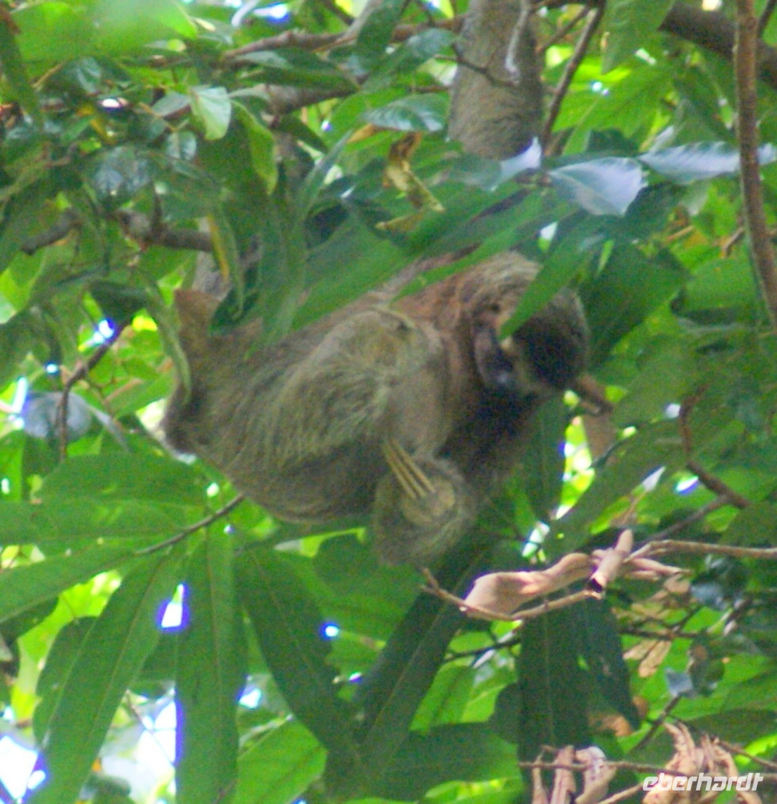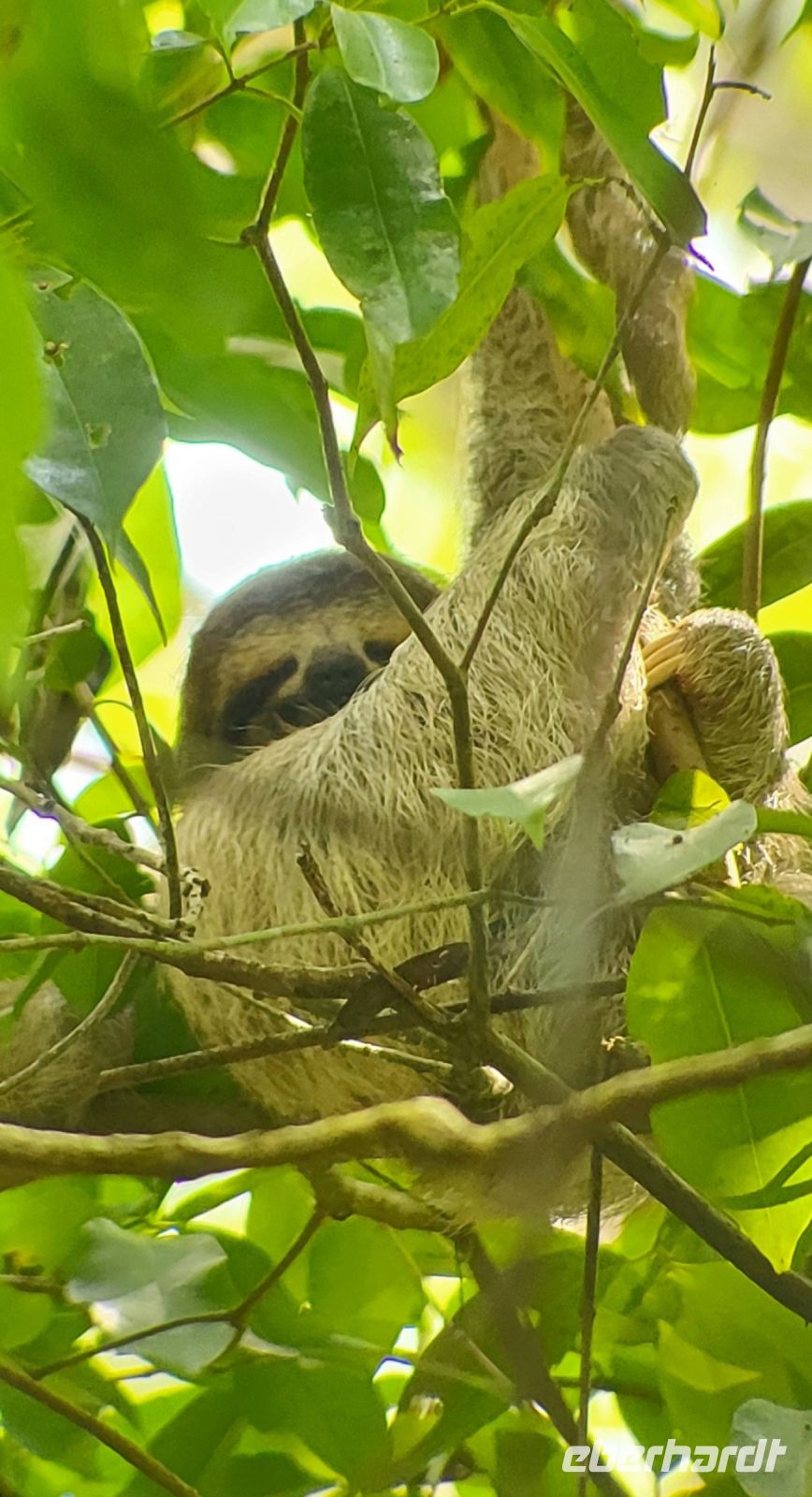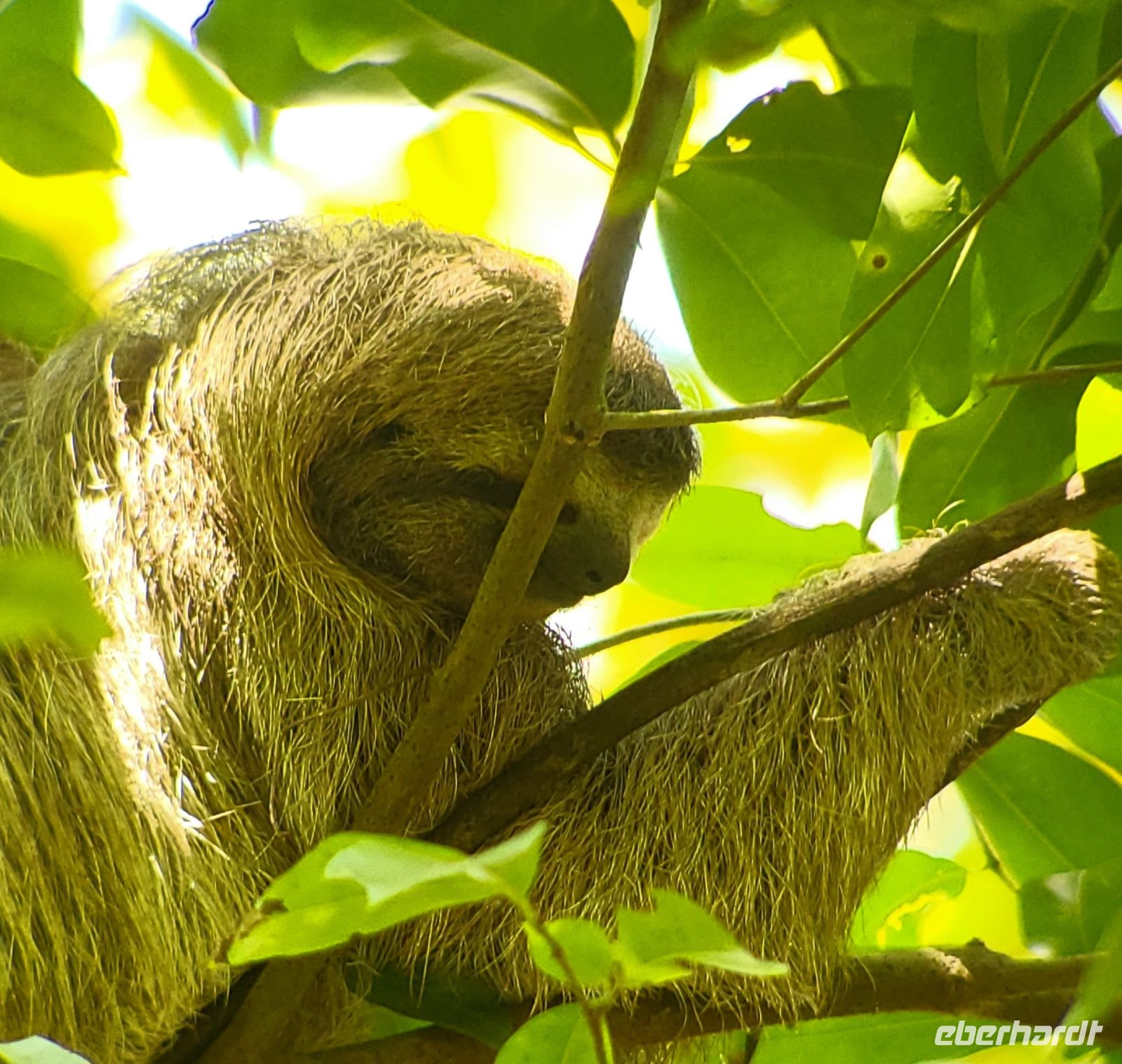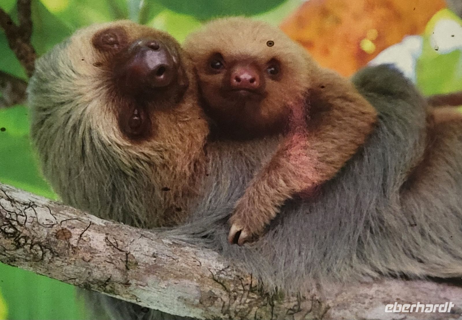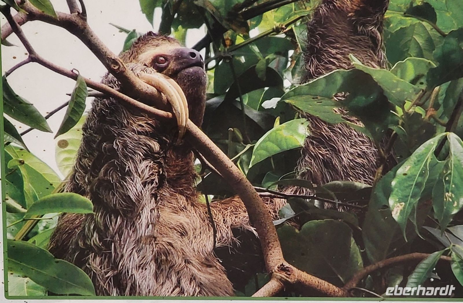 Der Brüllaffen-Weckruf fiel heute leider aus, da es die ganze Nacht und auch den Morgen wie aus Eimern geregnet hat. Im Restaurant genießen wir ein einheimisches Frühstück, genannt „Gallo Pinto“, ein Teller mit Reis+Bohnen, dazu Eierspeisen, Käse und Toast, halt so, wie die Ticos (die Bewohner Costa Ricas) ebenso frühstücken. Begleitet werden wir von zahlreichen Vögeln, die ebenfalls zum frischen Obst, welches ihnen bereitgestellt wurde, zum Frühstück kommen. Der besonders schöne Mot Mot (ähnlich eines Eichelhähers) lauert schon auf unsere Teller und schaut von oben zu, ob etwas für ihn unten abfällt. Gut versorgt starten wir zum La Fortuna Wasserfall. Dieser ist nur ca. 5 Minuten Fahrt von unserer Lodge entfernt und führt uns über 530 Stufen nach unten und genauso wieder hinauf. Ein sehr gut ausgebauter Treppenweg führt uns zum Wasserfall, der nicht ohne Grund zu einem der schönsten Costa Ricas zählt. Somit erleben alle einen sportlichen Vormittag und sich die Mühe mehr als gelohnt hat. Im Anschluss haben wir Freizeit um uns das Touristenstädtchen La Fortuna genauer anzuschauen. Nach so vielen Aktivitäten lassen wir uns ein sehr schmackhaftes Mittagessen im Restaurant Selva Rustica schmecken, wo wir einheimische Spezialitäten probieren. Anschließend gibt es eine Überraschung für unsere Gäste und wir gehen auf Faultiersuche. Zunächst erfolglos, wird uns dennoch das Glück hold und wir sehen gleich drei dieser besonderen Tiere in den Baumwipfeln hängen. Gleich beide Gattungen gibt es zu sehen und somit ein erster Blick auf ein Zweifinger und ein Dreifingerfaultier. Zurück in der Lodge ruhen wir bei erneutem Regenbeginn ein wenig aus, bevor es dann zu den Thermalquellen "Paradise Hotsprings" und zum Entspannen geht. Hier können die Gäste in verschiedenen Becken und Temperaturen genüsslich entspannen, das Ganze umrahmt von den Geräuschen des Waldes mit singenden Zykaden-eine unwirkliche und besondere Kulisse, die jeder für sich in Ruhe genießen kann. Hier nehmen wir abschließend unser Abendessen ein und greifen vom schmackhaften Buffet zu. Zurück in unserer Arenal Oasis Eco Lodge übernachten wir ein letztes Mal und lauschen auch heute Nacht wieder den Geräuschen der Natur, von der wir umgeben sind. Ob die Brüllaffen wohl morgen früh den Weckruf übernehmen?