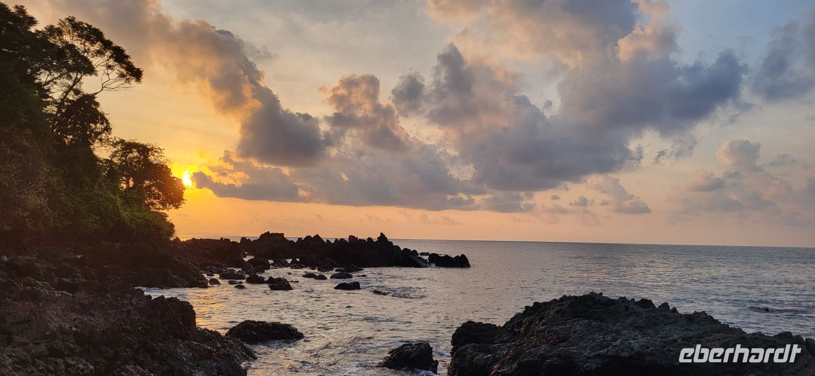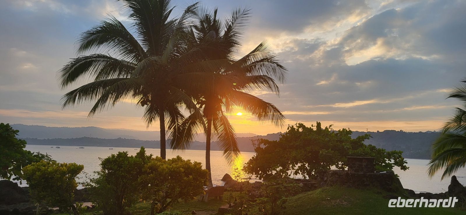 Wir verlassen die wunderschöne La Cusinga Lodge, nachdem wir ein Frühstück mit Aussicht auf den Pazifik und noch etwas Freizeit zur Vogelbeobachtung genutzt haben. Weiter geht es entlang der Küste, kurze Besorgungen im Supermarkt und schon erreichen wir Sierpe, von wo aus wir per Boot zur Drake Bay gelangen. Die Koffer werden uns durch die Bootscrew vom Bus zum Boot gebracht und wassergeschützt eingelagert. Schon sausen wir den Fluss Richtung offenes Meer und genießen eine einstündige Fahrt mit viel frischem Wind. In der Drake Bay und somit unserem Drake Bay Wilderness Resort angekommen, werden wir von Host Brian in Empfang genommen, der uns bei einem kühlen Welcome Drink so einiges Wissenswertes zu unserem Aufenthalt verkündet. Nach unserem Zimmerbezug und einem ersten Rundgang durch die herrliche Anlage treffen wir uns zum Mittagessen wieder. Nachmittags ist Freizeit für alle, so nutzen die einen Hängematte, Liegestuhl und Co., die anderen wandern zu den nah gelegenen Stränden und erkunden die Umgebung dieses schönen Fleckchen Costa Ricas. Nach einem schönen Sonnenuntergang und nochmaligem Versuch bei einer weiteren Dusche für Abkühlung zu sorgen, erfolgt ein schmackhaftes Abendessen in drei Gängen und geselliger Runde.