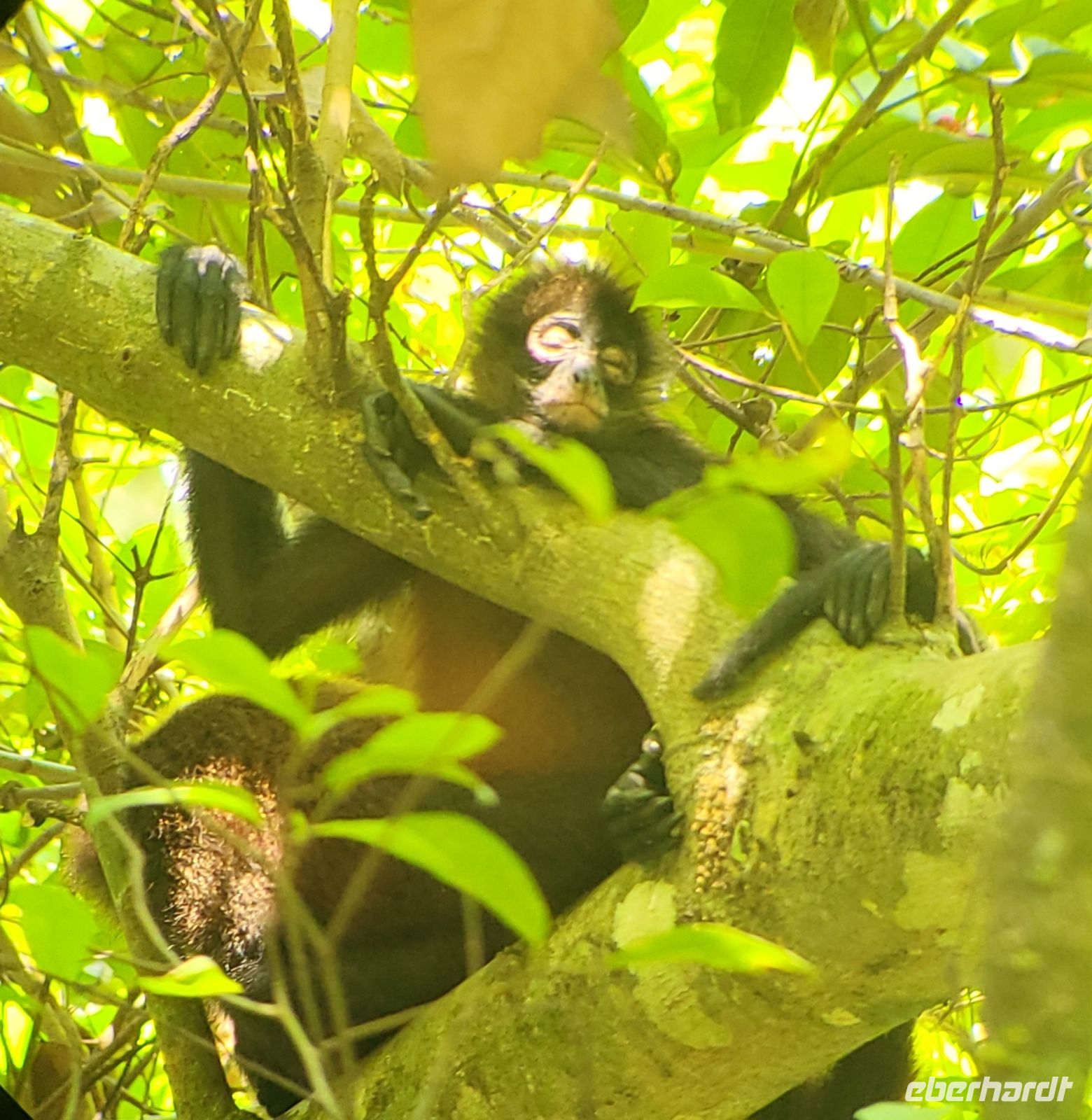 Zu einem sehr frühen Frühstück um 05.00 Uhr treffen wir uns wieder und kurz darauf, öffnet der Himmel seine Schleusen. Ein Platzregen vom Feinsten, lässt unsere Abfahrt per Speedboot etwas in die Ferne rücken. Mit Verspätung legen wir ab und fahren eine Stunde entlang der Küste bis zum berühmten Corcovado Nationalpark- Leider erwischt uns zunächst doch noch ein Regenguss, dem man auf einem offenen Boot nicht entkommen kann, aber bis zu unserer Ankunft bei deutlicher Wetterbesserung und sogar Sonnenschein, konnten wir wieder ein wenig trocknen. Bedingt durch die verspätete Abfahrt, waren wir nun die letzten, die am Checkpoint/Nationalparkeingang ankamen und die Registrierung vornehmen mussten. Auch dies wurde relativ zügig erledigt und schon sollten wir unser erstes Highlight zu sehen bekommen. Direkt am Eingang erscheint ein Tapir und zeigt sich uns in voller Größe. Dieses besondere Tier, verwandt mit Pferd und Nashorn, spaziert entspannt an uns vorbei, um sich an den umliegenden Bäumen und deren Blättern zu bedienen. Welch ein Erlebnis und erst recht, welch ein Start. Guide José, der uns schon von der Lodge her begleitet, führt uns abseits des Touristenstroms und so haben wir schöne Spazierwege durch den Nationalpark und sind gefühlt beinahe alleine unterwegs. Mit seinem hochwertigen Teleskop zeigt er uns viele Tiere, u.a. ein Dreifinger Faultier, welches wir Dank Technik beinahe vor uns sehen können. Durch sein Teleskop entstehen für uns geniale Aufnahmen der Tiere, so dass jeder mit Smartphone tolle Erinnerungen mit nach Hause nehmen kann. Wir sehen folgendes: Brüllaffen, Klammeraffen, rote Aras, Tapir am Wegesrand oder bei der Mittagsruhe im Sumpf, Faultiere, Falken, Nasenbären, Spinnen. Neu sind für uns die Klammeraffen, die auf Englisch Spidermonkeys genannt werden. Der Name beruht darauf, dass sie an den behaarten Händen nur vier Finger und keine Daumen haben und diese somit Spinnen gleichen. Von den Brüllaffen hören wir, dass diese nach den Elefanten, die zweitlautesten Säugetiere der Erde sind. Ein wunderschönes Naturerlebnis, der Weg ist unbeschwerlich, da er im Schatten verläuft und stets eine Brise vom Meer hineinweht. Bis jetzt der schönste Nationalpark, den wir in Costa Rica besucht haben. Zur Halbzeit nehmen wir ein schmackhaftes Mittagessen in der Rangerstation ein und führen unsere Tour fort. Am Fluss pausieren wir nochmals, genießen das einmalige Umfeld direkt am Pazifik und sichten ein Krokodil, sowie Reiher beim Fischfang. Danach geht es zur Rangerstation und per Speedboot trockenen Fußes zurück zu unserer Lodge. Den Nachmittag genießt jeder in seinem Tempo und relaxt einfach mal von den erlebnisreichen Stunden des heutigen Vormittags und dem frühen Start in den Tag. Nochmals ein tolles Abendessen und eine weitere erholsame Nacht, bevor unser Abenteuer in der Drake Bay am nächsten Morgen erneut startet.