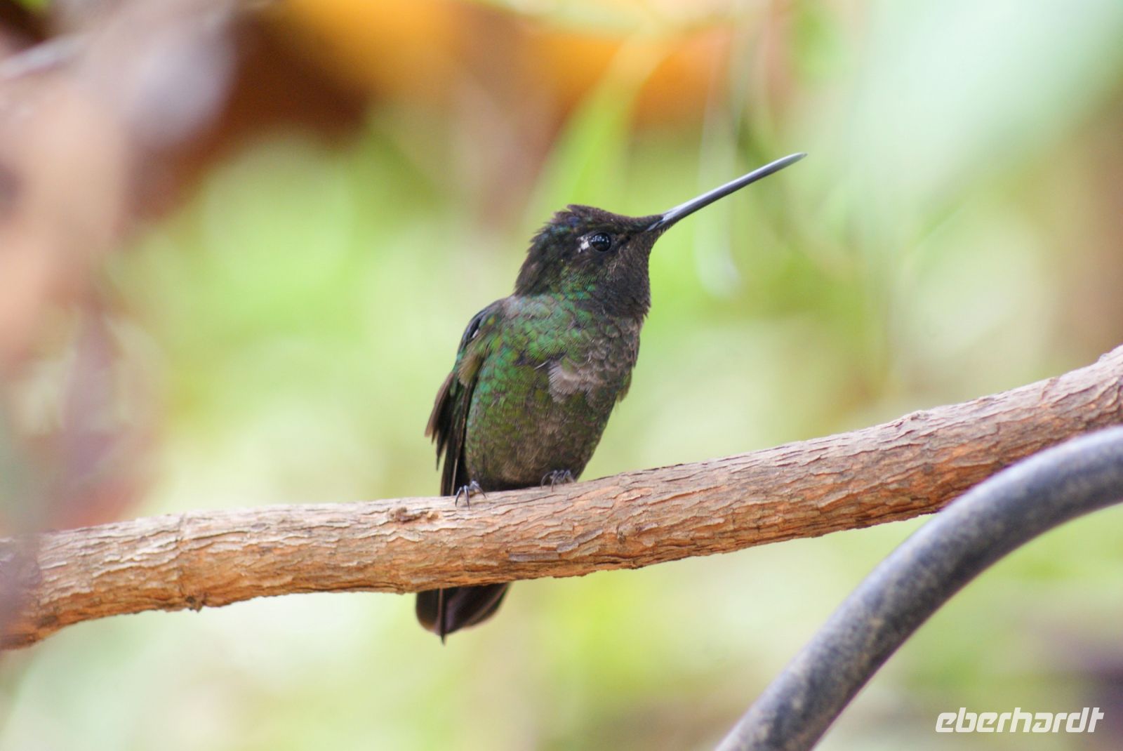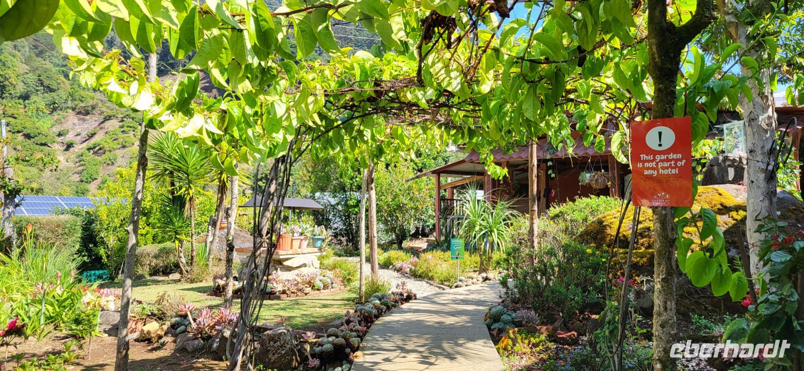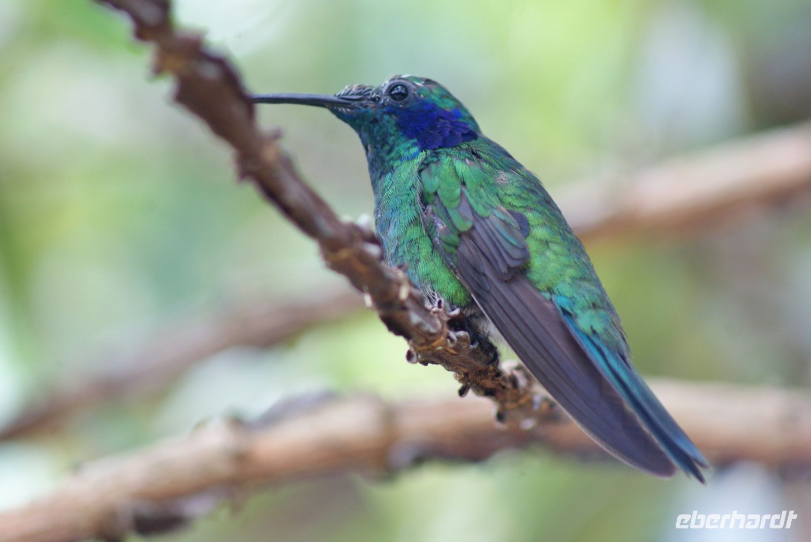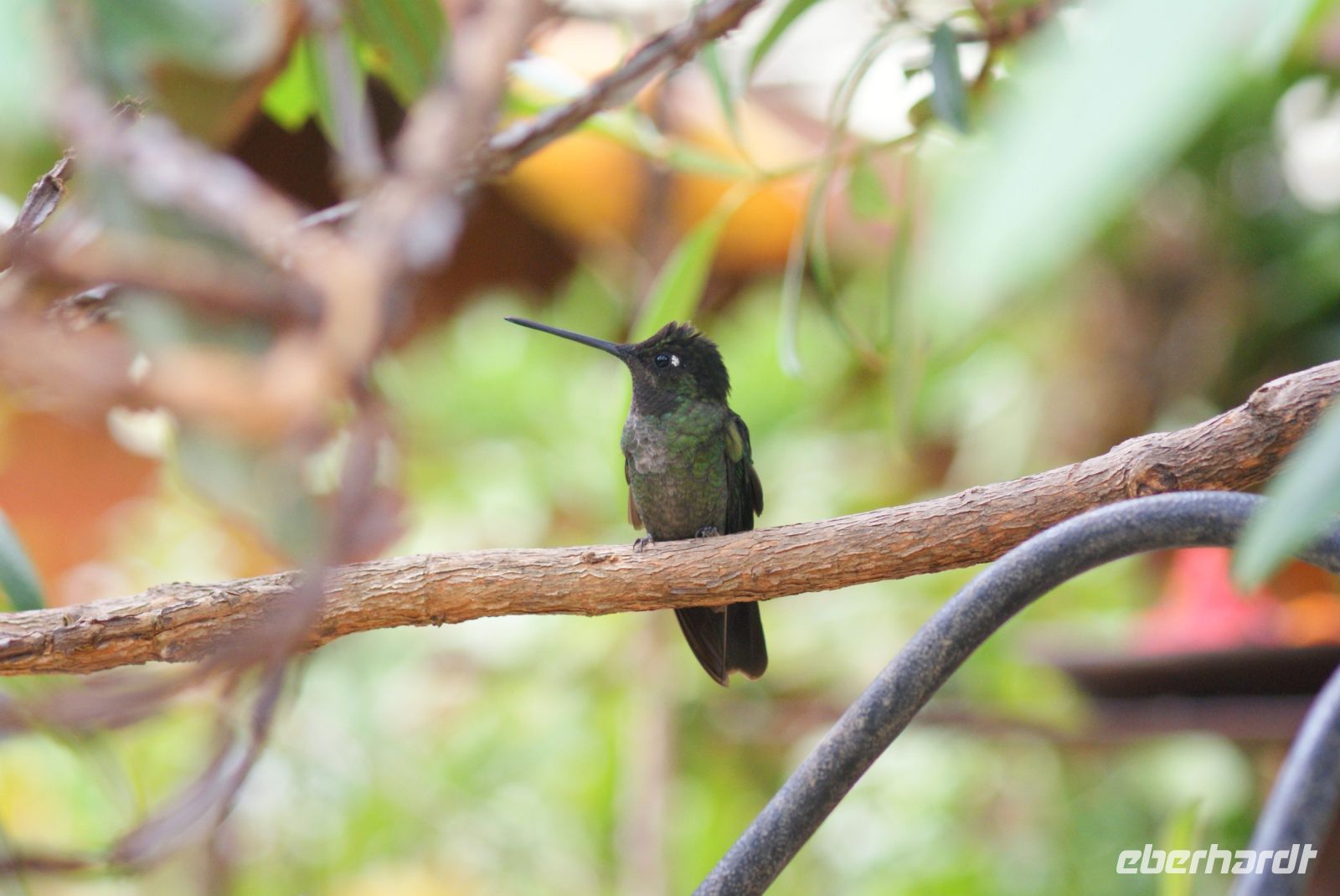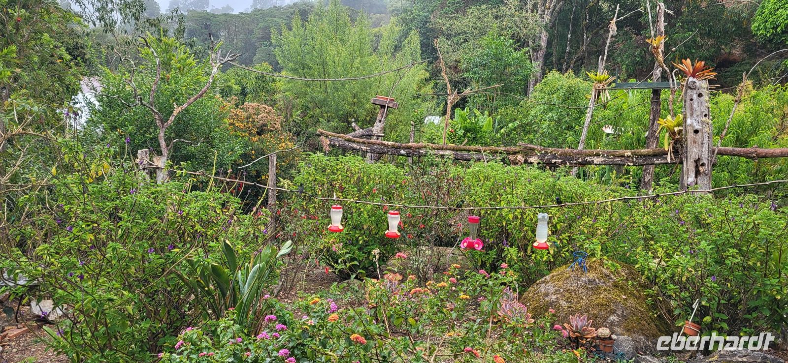 Ein letztes schönes Frühstück in der Drake Bay, ein letztes Mal begrüßen uns die roten Aras, die sich ebenfalls eingefunden haben. Unser liebenswerter Restaurantleiter Henry umsorgt uns nochmals rührend und bald darauf heißt es Abschied nehmen. Per Speedboot und Kapitän Memo geht es zurück nach Sierpe. Memo bietet uns an, noch eine kleine Mangroventour einzubauen, begeistert nehmen wir dies an. Erneut sehen wir Brüllaffen und Totenkopfäffchen, besondere Vögel wie den sogenannten Stockvogel, Schlangen, Krokodile, Echsen, etc. Ein im Wasser treibender Mangrovensamen wird von uns an einem kargen Ufer eingepflanzt und so haben auch wir einen Teil zur schönen Natur beigetragen. Zurück an Land gibt es als „Welcome back Drink“ eine frisch aufgeschlagene und dazu noch gekühlte Kokosnuss für alle. Welch ein Empfang, der genossen werden muss, so schmeckt das köstlich kühle Kokoswasser in der Hitze besonders gut. Etwas außerhalb von Sierpe zeigt uns Nico die ominösen Steinkugeln, die weit über das Land hinaus für Costa Rica bekannt sind. Einige Hunderte davon gibt es hier in der Gegend und auch in anderen Regionen des Landes. Bis heute ist es nicht ganz klar, warum diese bis zu Tonnen schwere Kugeln von Menschenhand ohne Maschen geschaffen und weite Strecken transportiert wurden. Da auch wir keine Lösung finden und uns ein streitsüchtiges Arapärchen im Baum über uns in den Ohren liegt, ziehen wir weiter und kehren in ein schönes einheimisches Lokal zum Mittagessen ein. Auf dem letzten Teil unserer heutigen Fahrt schrauben wir uns über etliche Serpentinen bis auf 3340 m hinauf und befinden uns nun am höchsten Punkt der Panamericana in Costa Rica. Danach geht es wieder bergab und wir erreichen über die letzten neun, ziemlich abenteuerlichen Kilometer, schließlich unser Savegre Lodge für die nächsten beiden Nächte. Diese liegt mitten im Vogel-und Gartenparadies und wir werden von Kolibris und anderen Vögeln nur so umschwärmt. Ob sich hier auch der berühmte Quetzal blicken lässt? Diesen gilt es morgen früh zu finden.