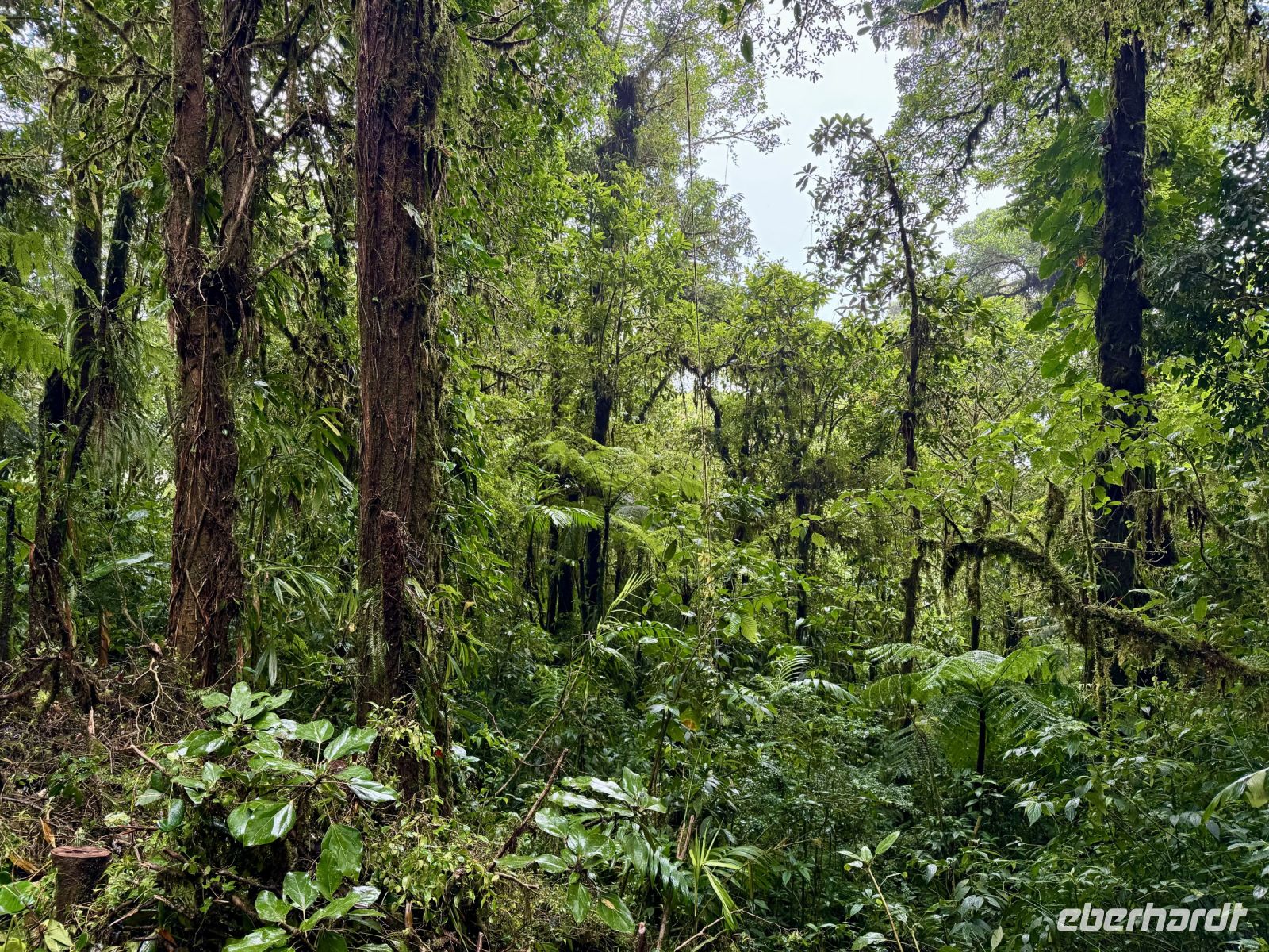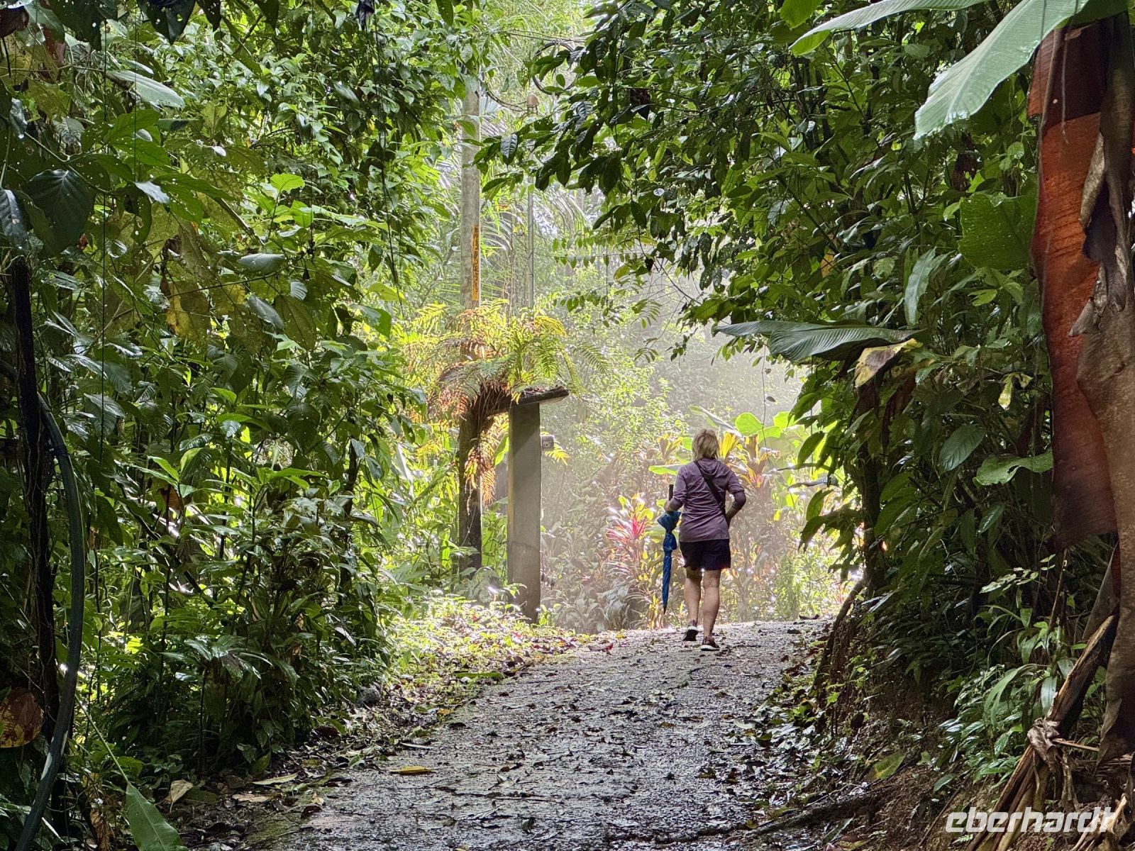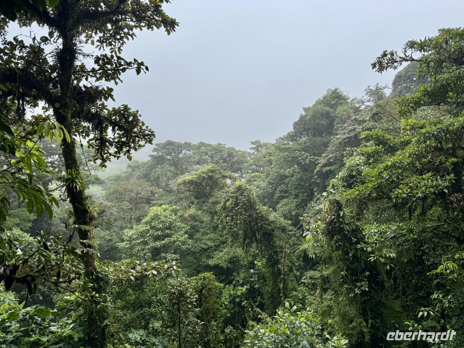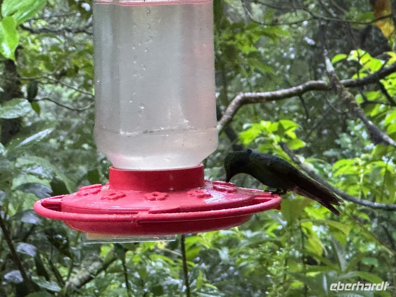 Mein erster Gedanke nach dem Klingeln des Weckers, nein eigentlich noch vor dem Klingeln des Weckers, gilt Nico und seiner optimistischen Wetterprognose von gestern Abend. Ich weiß nicht, ob es wirklich der heftigste Regenschauer ist, den ich bisher in Costa Rica erlebt habe. In meinem noch sehr verschlafenen Zustand kommt er mir jedenfalls so vor. Es rumpelt wieder heftig auf dem Dach. Als ich in meine Badelatschen schlüpfe, blicken mich etwa sechs bis acht neugierige Affenköpfchen aus den Giebelfenstern an und beobachten einen fluchenden Eberhardt-Reiseleiter bei seinem täglichen Morgenritual, darunter auch mindestens eine Affenmutter mit ihrem Jungtier, die so ab fünf Uhr morgens lärmend vor den herabstürzenden Wassermassen ausgerechnet unter meinem Vordach Schutz gesucht haben. Mein chaotisches Treiben wird von ihnen allen fleißig kommentiert. Da bin ich den fünf Fledermäusen im mittleren Giebelfenster dankbar, dass sie mich nur wortlos beäugen. Kann man sich so sehr in einen Ort verlieben, einen Ort, über dem ein besonderer Zauber zu liegen scheint, an dem man herzlich aufgenommen und vorzüglich bewirtet wird, dass der Abschied unheimlich schwerfällt? Die kleinen Tränen, die sich in meinen Augenwinkeln sammeln, und ein Gefühl der Traurigkeit, als unser Boot ablegt und uns unsere Gastgeber Christina und Roland nochmals zuwinken, sind meine Antwort auf diese Frage. Nicht vermissen werde ich hingegen die vielen Stufen hinauf zu unseren Zimmern und die holprige Überfahrt über die Drake Bay. Auch das Meer scheint etwas aufgebracht ob unseres Abschieds. Von der Fahrt auf dem Fluss durch den Regen völlig durchnässt fallen wir Hera in die Arme, der uns am Anleger mit einem neuen Bus erwartet. (Ach, ein riesiges hungriges Krokodil haben wir übrigens auch wieder gesehen.) Dank vieler helfender Hände sind unsere Koffer schnell durch eines der hinteren Fenster auf die Rückbank gehoben und wir beginnen unsere Fahrt in die Berge. In Palmar Norte halten wir schon das erste Mal wieder an, weil uns Nico riesige mysteriöse Steinkugeln zeigen will, die vor ungefähr 1.500 Jahren von der Urbevölkerung mit unbekannten Methoden zu unbekannten Zwecken in vermutlich mühevoller Arbeit produziert worden sind. Ein überdimensionales Murmelspiel? Ein astronomischer Kalender? Fragen, die wohl ohne Zeitmaschine nie beantwortet werden können. Auf der bekannten Küstenstraße fahren wir ein Stück zurück gen Norden, diesmal allerdings bei Tageslicht, sodass wir ab und zu einen Blick auf den Pazifik erhaschen können. Für die Mittagspause hat Nico auch extra ein kleines Restaurant mit Aussicht gewählt — sehen tun wir allerdings nichts. Die Wolken ziehen sogar durch die Sichtfenster bis zu unserem Tisch hinein. Vielleicht ist es auch gut so, dass wir wetterbedingt vom berühmt-berüchtigten „Berg des Todes“ auf der Panamericana nicht viel mitbekommen. Aber es sieht rings um uns herum auch auf einer Höhe von 3.400 Metern immer noch sehr grün aus. Da draußen ist immer noch ein Wald, vielleicht nicht ganz so hoch und dicht, aber immer noch ein grüner Wald. In den Alpen gäbe es auf dieser Höhe nur den blanken Fels. Ins wildromantische Tal von San Gerardo de Dota führt eine steile Stichstraße hinab, die Hera noch einmal herausfordert. Damit wir uns nicht erst umgewöhnen müssen, fahren wir an allen Hotels vorbei, die (noch) im Trockenen liegen, und halten genau an dem, über dem es schon regnet. Danke, Nico! Zu seiner Ehrenrettung: Es ist ein sehr schönes Hotel mit einer sehr hübschen Gartenanlage. Und gebucht hat er es ja auch nicht. Und wenig später regnet es sowieso im ganzen Tal, auf noch rund 2.000 Metern Höhe. Es ist merklich frischer als unten am Pazifik, als wir gegen 16:00 Uhr aussteigen und unsere Zimmer beziehen. Den großen Tisch zum Abendessen haben wir heute im Hotelrestaurant schon etwas zeitiger gebucht, denn morgen geht es früh los — noch vor dem Frühstück —, denn der Quetzal ist ein früher Vogel, der aber gar keine Würmer fängt (bzw. selten).