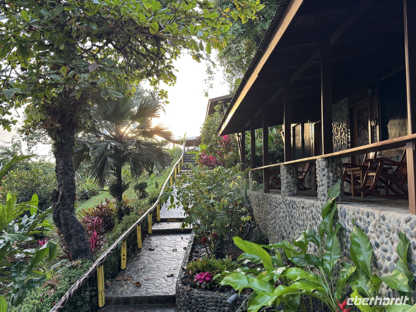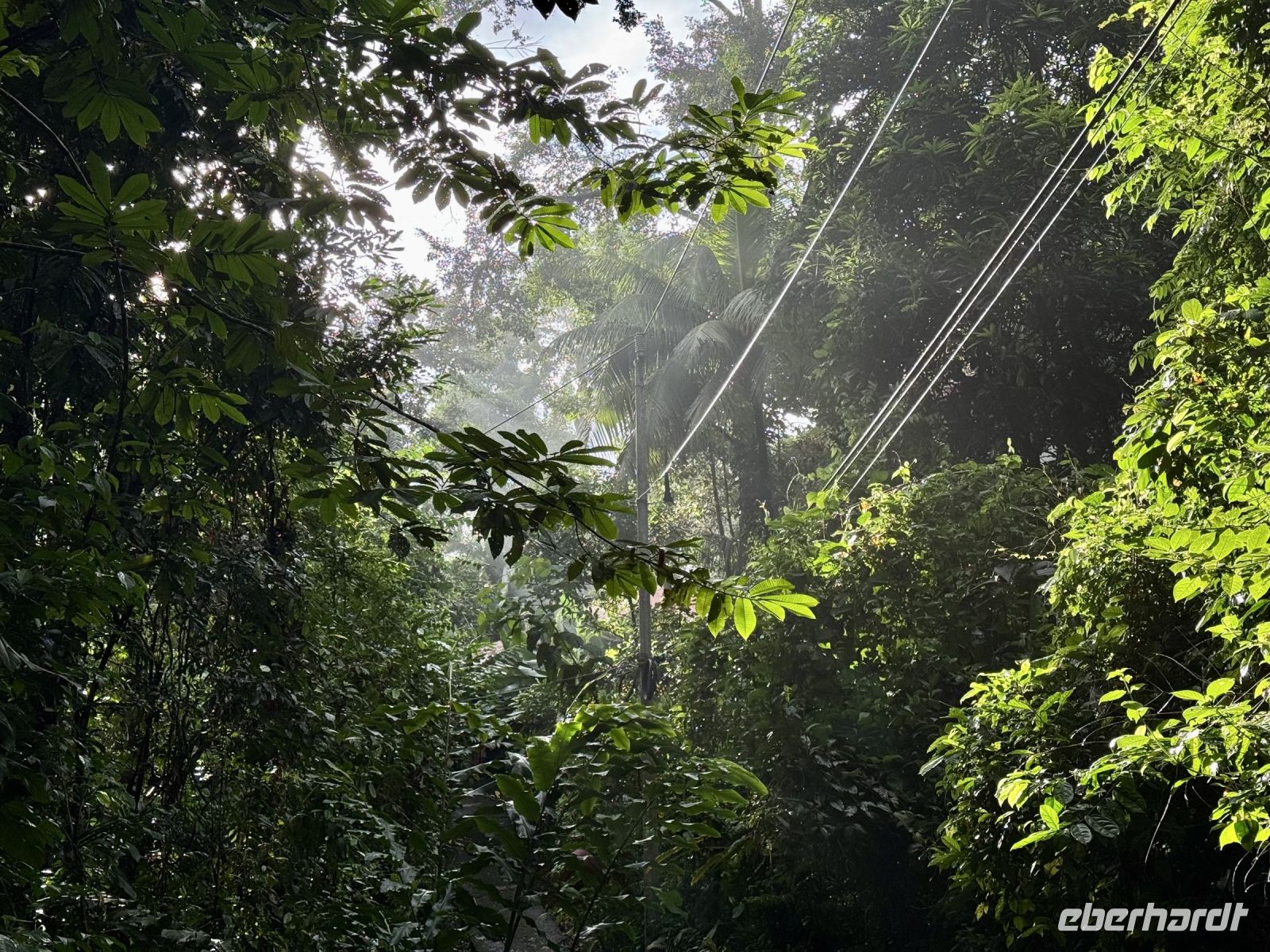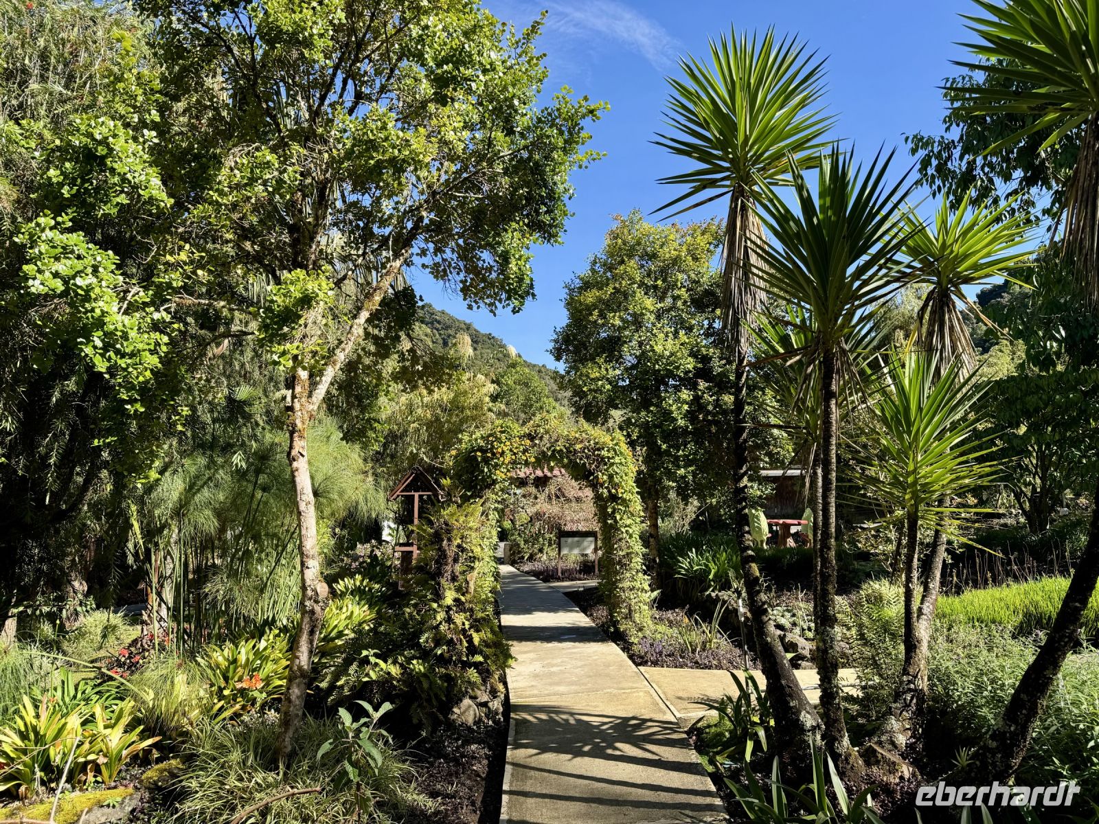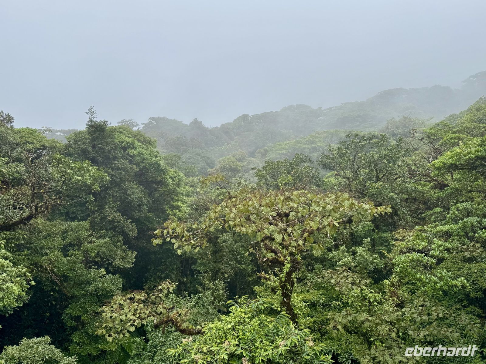 Mein erster Gedanke nach dem Klingeln des Weckers, nein eigentlich noch vor dem Klingeln des Weckers, gilt Nico und seiner optimistischen Wetterprognose von gestern Abend. Ich weiß nicht, ob es wirklich der heftigste Regenschauer ist, den ich bisher in Costa Rica erlebt habe. In meinem noch sehr verschlafenen Zustand kommt er mir jedenfalls so vor. Es rumpelt wieder heftig auf dem Dach. Als ich in meine Badelatschen schlüpfe, blicken mich etwa sechs bis acht neugierige Affenköpfchen aus den Giebelfenstern an und beobachten einen fluchenden Eberhardt-Reiseleiter bei seinem täglichen Morgenritual, darunter auch mindestens eine Affenmutter mit ihrem Jungtier, die so ab fünf Uhr morgens lärmend vor den herabstürzenden Wassermassen ausgerechnet unter meinem Vordach Schutz gesucht haben. Mein chaotisches Treiben wird von ihnen allen fleißig kommentiert. Da bin ich den fünf Fledermäusen im mittleren Giebelfenster dankbar, dass sie mich nur wortlos beäugen. Kann man sich so sehr in einen Ort verlieben, einen Ort, über dem ein besonderer Zauber zu liegen scheint, an dem man herzlich aufgenommen und vorzüglich bewirtet wird, dass der Abschied unheimlich schwerfällt? Die kleinen Tränen, die sich in meinen Augenwinkeln sammeln, und ein Gefühl der Traurigkeit, als unser Boot ablegt und uns unsere Gastgeber Christina und Roland nochmals zuwinken, sind meine Antwort auf diese Frage. Nicht vermissen werde ich hingegen die vielen Stufen hinauf zu unseren Zimmern und die holprige Überfahrt über die Drake Bay. Auch das Meer scheint etwas aufgebracht ob unseres Abschieds. Von der Fahrt auf dem Fluss durch den Regen völlig durchnässt fallen wir Hera in die Arme, der uns am Anleger mit einem neuen Bus erwartet. (Ach, ein riesiges hungriges Krokodil haben wir übrigens auch wieder gesehen.) Dank vieler helfender Hände sind unsere Koffer schnell durch eines der hinteren Fenster auf die Rückbank gehoben und wir beginnen unsere Fahrt in die Berge. In Palmar Norte halten wir schon das erste Mal wieder an, weil uns Nico riesige mysteriöse Steinkugeln zeigen will, die vor ungefähr 1.500 Jahren von der Urbevölkerung mit unbekannten Methoden zu unbekannten Zwecken in vermutlich mühevoller Arbeit produziert worden sind. Ein überdimensionales Murmelspiel? Ein astronomischer Kalender? Fragen, die wohl ohne Zeitmaschine nie beantwortet werden können. Auf der bekannten Küstenstraße fahren wir ein Stück zurück gen Norden, diesmal allerdings bei Tageslicht, sodass wir ab und zu einen Blick auf den Pazifik erhaschen können. Für die Mittagspause hat Nico auch extra ein kleines Restaurant mit Aussicht gewählt — sehen tun wir allerdings nichts. Die Wolken ziehen sogar durch die Sichtfenster bis zu unserem Tisch hinein. Vielleicht ist es auch gut so, dass wir wetterbedingt vom berühmt-berüchtigten „Berg des Todes“ auf der Panamericana nicht viel mitbekommen. Aber es sieht rings um uns herum auch auf einer Höhe von 3.400 Metern immer noch sehr grün aus. Da draußen ist immer noch ein Wald, vielleicht nicht ganz so hoch und dicht, aber immer noch ein grüner Wald. In den Alpen gäbe es auf dieser Höhe nur den blanken Fels. Ins wildromantische Tal von San Gerardo de Dota führt eine steile Stichstraße hinab, die Hera noch einmal herausfordert. Damit wir uns nicht erst umgewöhnen müssen, fahren wir an allen Hotels vorbei, die (noch) im Trockenen liegen, und halten genau an dem, über dem es schon regnet. Danke, Nico! Zu seiner Ehrenrettung: Es ist ein sehr schönes Hotel mit einer sehr hübschen Gartenanlage. Und gebucht hat er es ja auch nicht. Und wenig später regnet es sowieso im ganzen Tal, auf noch rund 2.000 Metern Höhe. Es ist merklich frischer als unten am Pazifik, als wir gegen 16:00 Uhr aussteigen und unsere Zimmer beziehen. Den großen Tisch zum Abendessen haben wir heute im Hotelrestaurant schon etwas zeitiger gebucht, denn morgen geht es früh los — noch vor dem Frühstück —, denn der Quetzal ist ein früher Vogel, der aber gar keine Würmer fängt (bzw. selten).