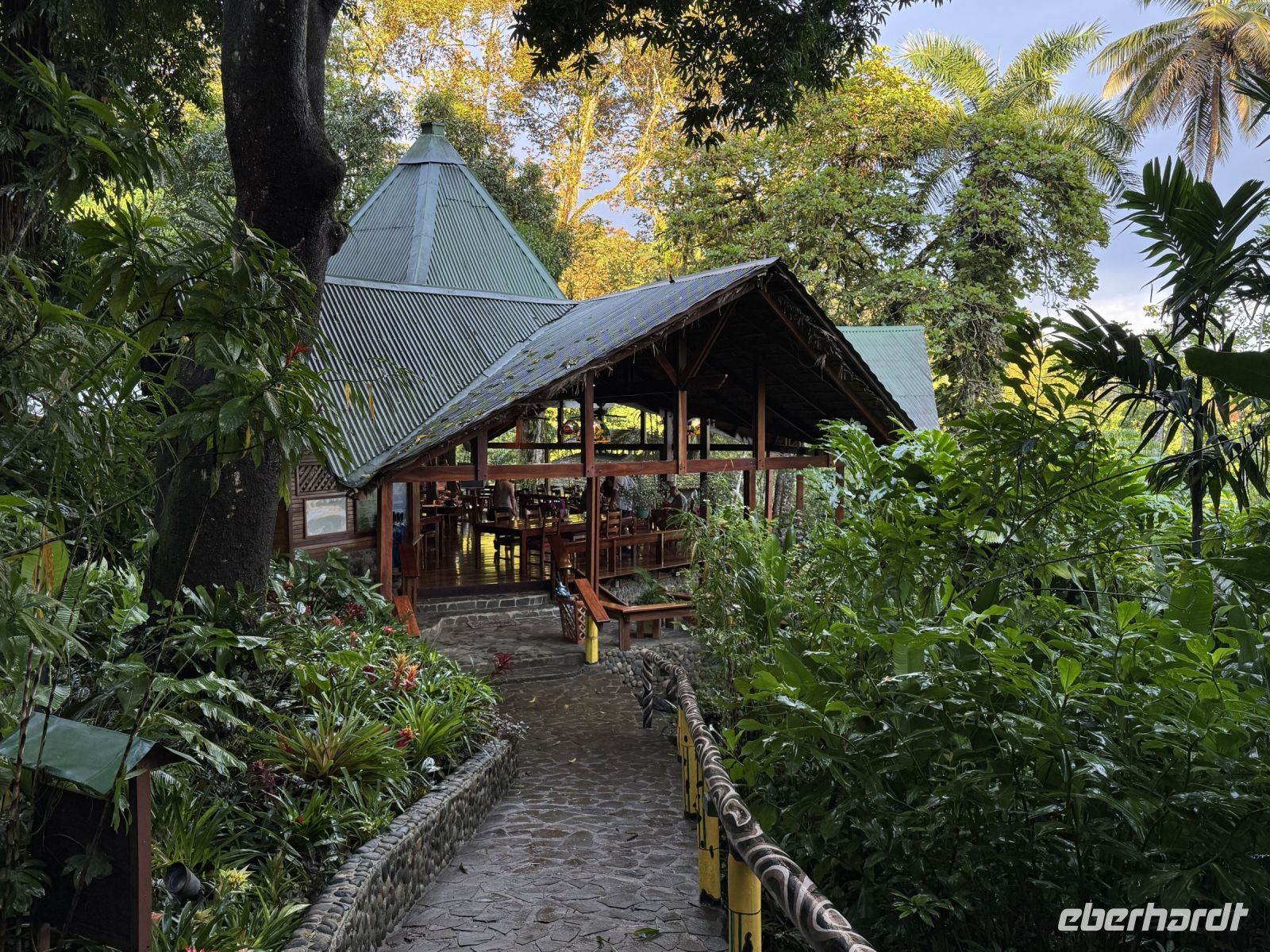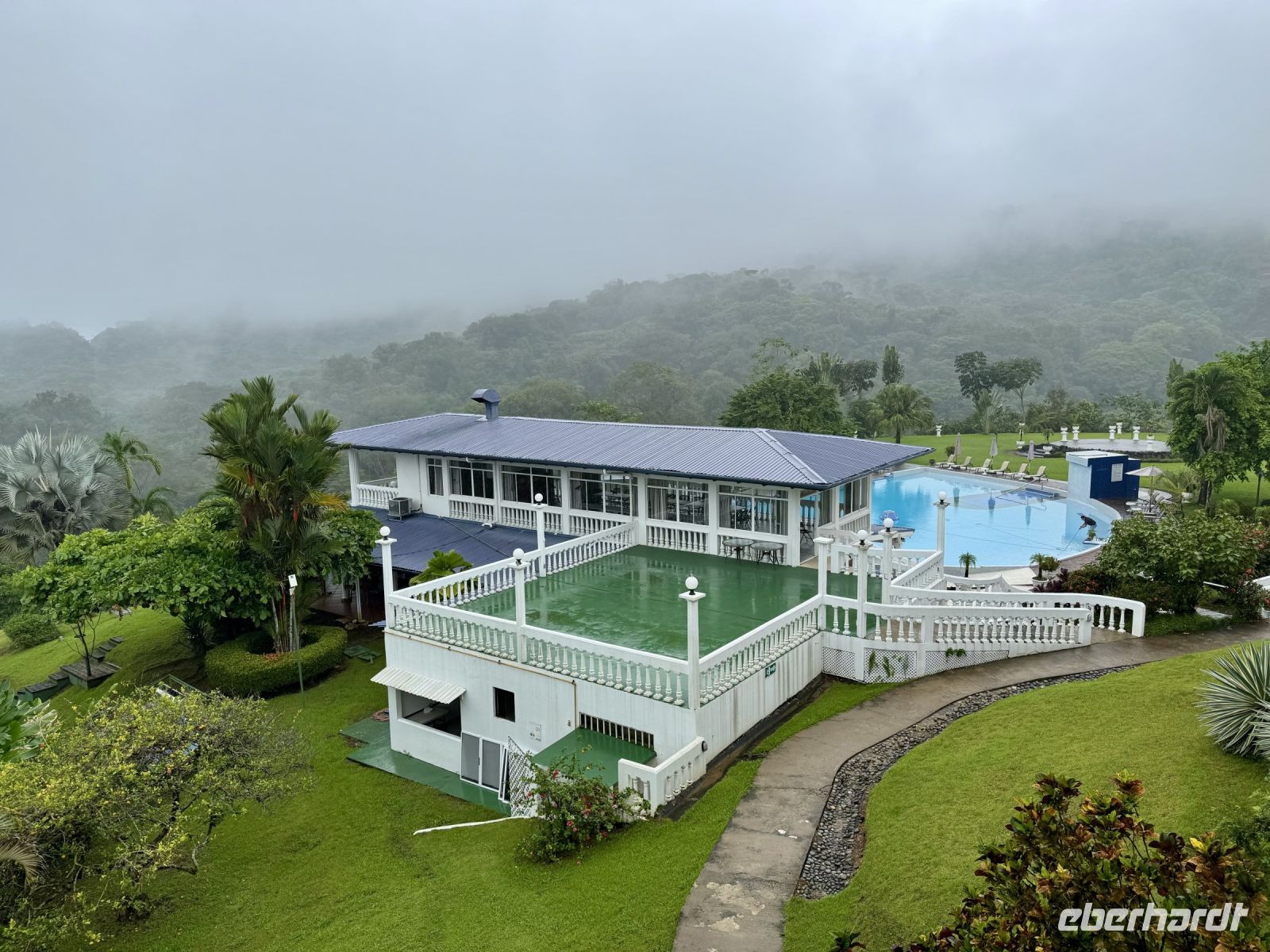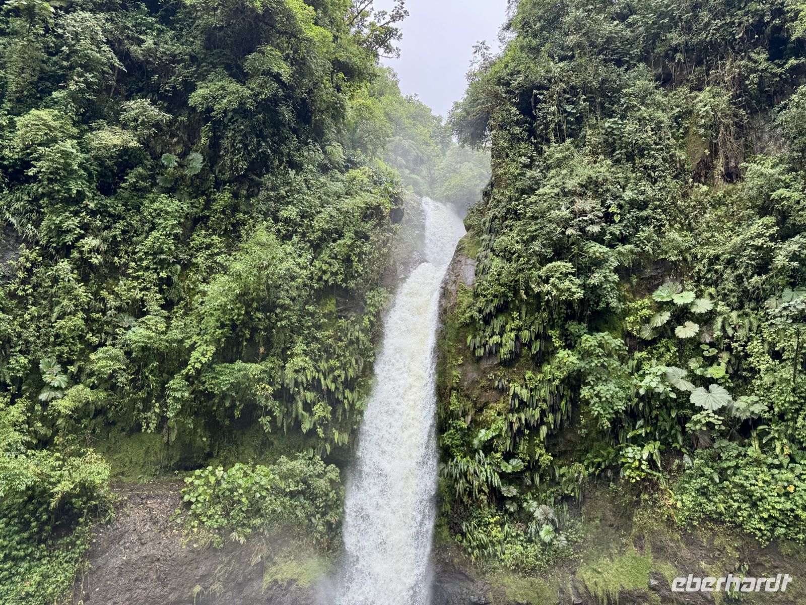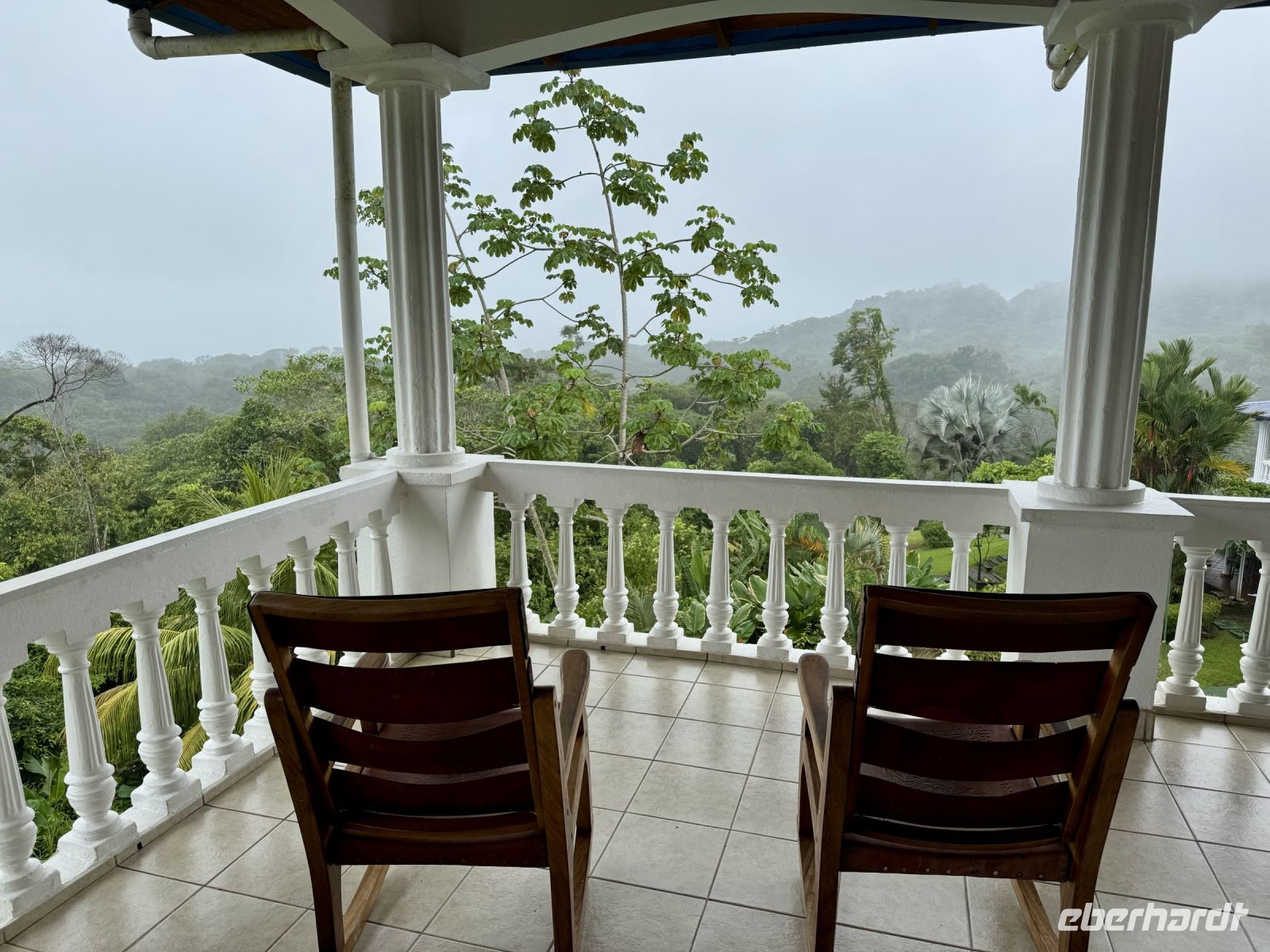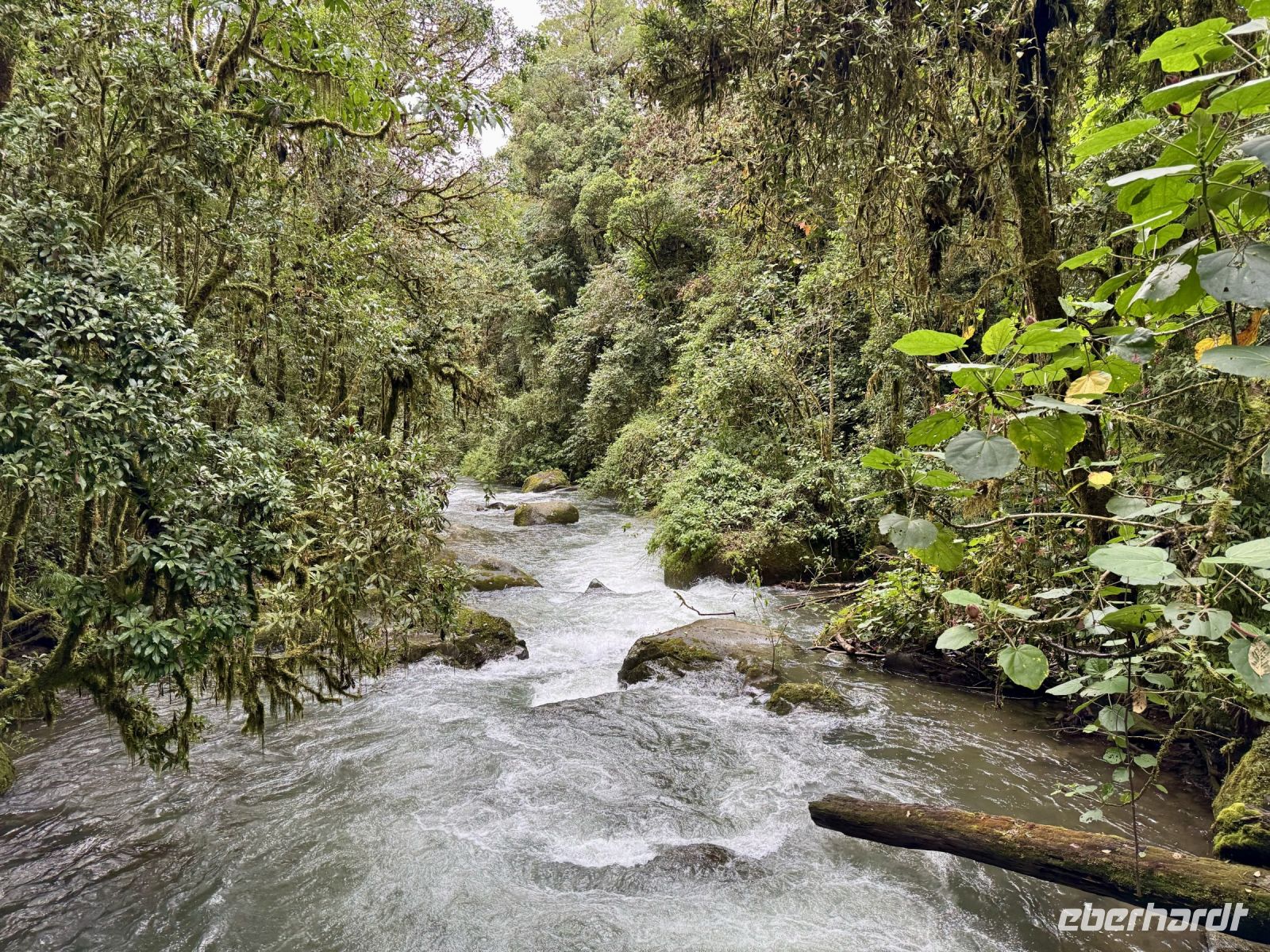 Mein erster Gedanke nach dem Klingeln des Weckers, nein eigentlich noch vor dem Klingeln des Weckers, gilt Nico und seiner optimistischen Wetterprognose von gestern Abend. Ich weiß nicht, ob es wirklich der heftigste Regenschauer ist, den ich bisher in Costa Rica erlebt habe. In meinem noch sehr verschlafenen Zustand kommt er mir jedenfalls so vor. Es rumpelt wieder heftig auf dem Dach. Als ich in meine Badelatschen schlüpfe, blicken mich etwa sechs bis acht neugierige Affenköpfchen aus den Giebelfenstern an und beobachten einen fluchenden Eberhardt-Reiseleiter bei seinem täglichen Morgenritual, darunter auch mindestens eine Affenmutter mit ihrem Jungtier, die so ab fünf Uhr morgens lärmend vor den herabstürzenden Wassermassen ausgerechnet unter meinem Vordach Schutz gesucht haben. Mein chaotisches Treiben wird von ihnen allen fleißig kommentiert. Da bin ich den fünf Fledermäusen im mittleren Giebelfenster dankbar, dass sie mich nur wortlos beäugen. Kann man sich so sehr in einen Ort verlieben, einen Ort, über dem ein besonderer Zauber zu liegen scheint, an dem man herzlich aufgenommen und vorzüglich bewirtet wird, dass der Abschied unheimlich schwerfällt? Die kleinen Tränen, die sich in meinen Augenwinkeln sammeln, und ein Gefühl der Traurigkeit, als unser Boot ablegt und uns unsere Gastgeber Christina und Roland nochmals zuwinken, sind meine Antwort auf diese Frage. Nicht vermissen werde ich hingegen die vielen Stufen hinauf zu unseren Zimmern und die holprige Überfahrt über die Drake Bay. Auch das Meer scheint etwas aufgebracht ob unseres Abschieds. Von der Fahrt auf dem Fluss durch den Regen völlig durchnässt fallen wir Hera in die Arme, der uns am Anleger mit einem neuen Bus erwartet. (Ach, ein riesiges hungriges Krokodil haben wir übrigens auch wieder gesehen.) Dank vieler helfender Hände sind unsere Koffer schnell durch eines der hinteren Fenster auf die Rückbank gehoben und wir beginnen unsere Fahrt in die Berge. In Palmar Norte halten wir schon das erste Mal wieder an, weil uns Nico riesige mysteriöse Steinkugeln zeigen will, die vor ungefähr 1.500 Jahren von der Urbevölkerung mit unbekannten Methoden zu unbekannten Zwecken in vermutlich mühevoller Arbeit produziert worden sind. Ein überdimensionales Murmelspiel? Ein astronomischer Kalender? Fragen, die wohl ohne Zeitmaschine nie beantwortet werden können. Auf der bekannten Küstenstraße fahren wir ein Stück zurück gen Norden, diesmal allerdings bei Tageslicht, sodass wir ab und zu einen Blick auf den Pazifik erhaschen können. Für die Mittagspause hat Nico auch extra ein kleines Restaurant mit Aussicht gewählt — sehen tun wir allerdings nichts. Die Wolken ziehen sogar durch die Sichtfenster bis zu unserem Tisch hinein. Vielleicht ist es auch gut so, dass wir wetterbedingt vom berühmt-berüchtigten „Berg des Todes“ auf der Panamericana nicht viel mitbekommen. Aber es sieht rings um uns herum auch auf einer Höhe von 3.400 Metern immer noch sehr grün aus. Da draußen ist immer noch ein Wald, vielleicht nicht ganz so hoch und dicht, aber immer noch ein grüner Wald. In den Alpen gäbe es auf dieser Höhe nur den blanken Fels. Ins wildromantische Tal von San Gerardo de Dota führt eine steile Stichstraße hinab, die Hera noch einmal herausfordert. Damit wir uns nicht erst umgewöhnen müssen, fahren wir an allen Hotels vorbei, die (noch) im Trockenen liegen, und halten genau an dem, über dem es schon regnet. Danke, Nico! Zu seiner Ehrenrettung: Es ist ein sehr schönes Hotel mit einer sehr hübschen Gartenanlage. Und gebucht hat er es ja auch nicht. Und wenig später regnet es sowieso im ganzen Tal, auf noch rund 2.000 Metern Höhe. Es ist merklich frischer als unten am Pazifik, als wir gegen 16:00 Uhr aussteigen und unsere Zimmer beziehen. Den großen Tisch zum Abendessen haben wir heute im Hotelrestaurant schon etwas zeitiger gebucht, denn morgen geht es früh los — noch vor dem Frühstück —, denn der Quetzal ist ein früher Vogel, der aber gar keine Würmer fängt (bzw. selten).