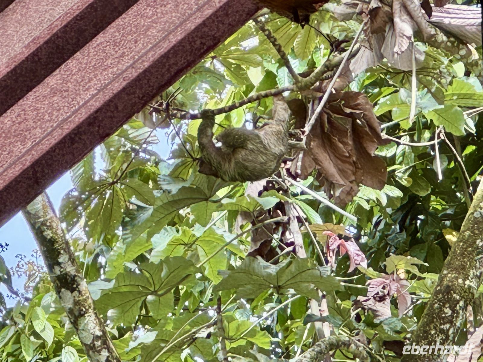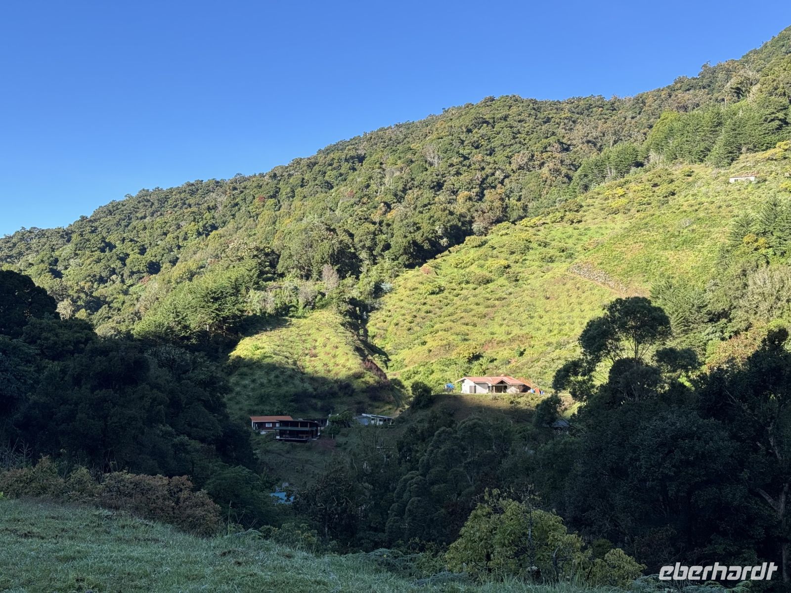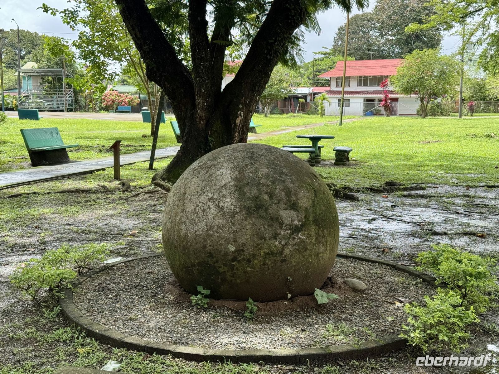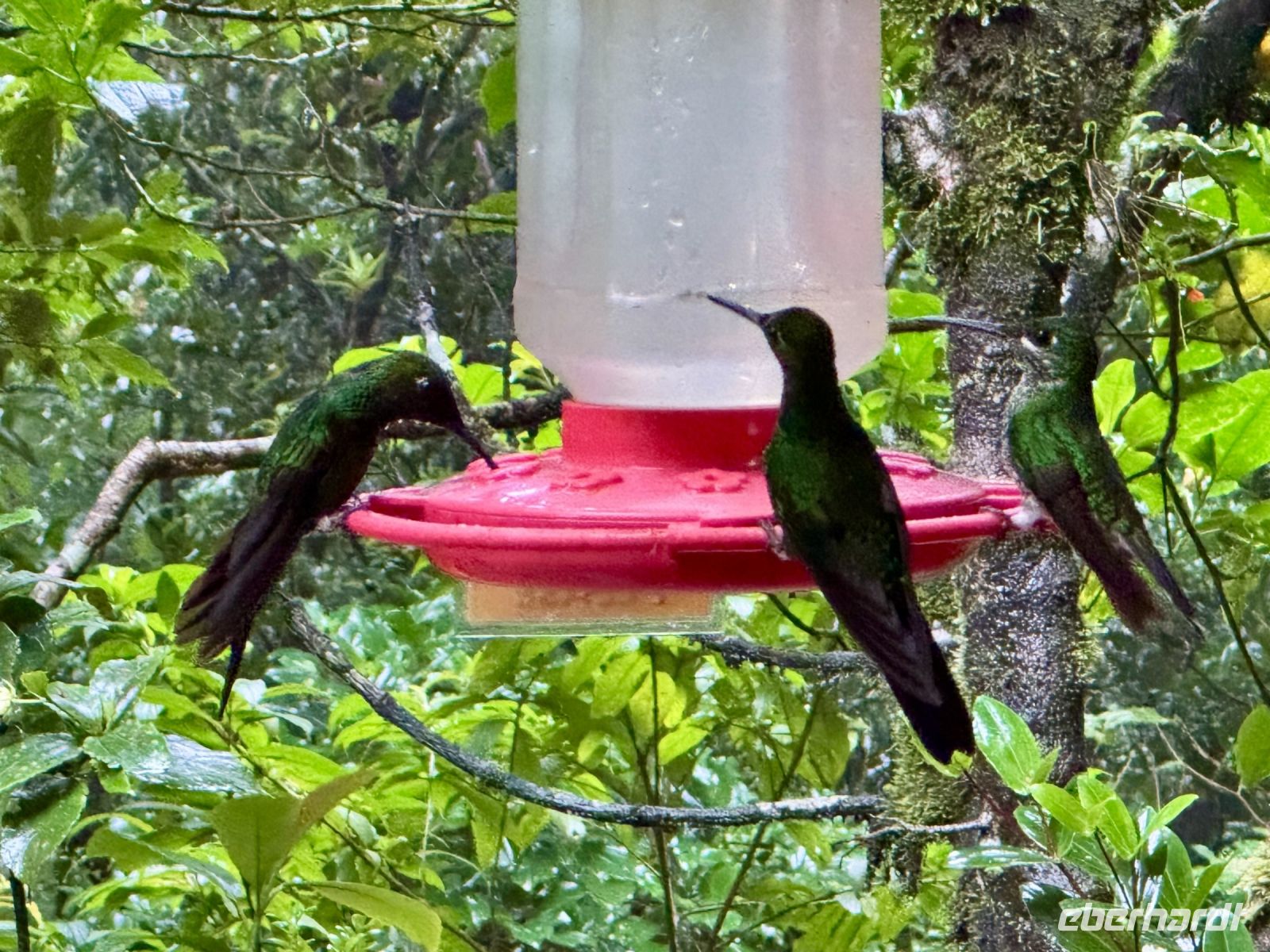 Mein erster Gedanke nach dem Klingeln des Weckers, nein eigentlich noch vor dem Klingeln des Weckers, gilt Nico und seiner optimistischen Wetterprognose von gestern Abend. Ich weiß nicht, ob es wirklich der heftigste Regenschauer ist, den ich bisher in Costa Rica erlebt habe. In meinem noch sehr verschlafenen Zustand kommt er mir jedenfalls so vor. Es rumpelt wieder heftig auf dem Dach. Als ich in meine Badelatschen schlüpfe, blicken mich etwa sechs bis acht neugierige Affenköpfchen aus den Giebelfenstern an und beobachten einen fluchenden Eberhardt-Reiseleiter bei seinem täglichen Morgenritual, darunter auch mindestens eine Affenmutter mit ihrem Jungtier, die so ab fünf Uhr morgens lärmend vor den herabstürzenden Wassermassen ausgerechnet unter meinem Vordach Schutz gesucht haben. Mein chaotisches Treiben wird von ihnen allen fleißig kommentiert. Da bin ich den fünf Fledermäusen im mittleren Giebelfenster dankbar, dass sie mich nur wortlos beäugen. Kann man sich so sehr in einen Ort verlieben, einen Ort, über dem ein besonderer Zauber zu liegen scheint, an dem man herzlich aufgenommen und vorzüglich bewirtet wird, dass der Abschied unheimlich schwerfällt? Die kleinen Tränen, die sich in meinen Augenwinkeln sammeln, und ein Gefühl der Traurigkeit, als unser Boot ablegt und uns unsere Gastgeber Christina und Roland nochmals zuwinken, sind meine Antwort auf diese Frage. Nicht vermissen werde ich hingegen die vielen Stufen hinauf zu unseren Zimmern und die holprige Überfahrt über die Drake Bay. Auch das Meer scheint etwas aufgebracht ob unseres Abschieds. Von der Fahrt auf dem Fluss durch den Regen völlig durchnässt fallen wir Hera in die Arme, der uns am Anleger mit einem neuen Bus erwartet. (Ach, ein riesiges hungriges Krokodil haben wir übrigens auch wieder gesehen.) Dank vieler helfender Hände sind unsere Koffer schnell durch eines der hinteren Fenster auf die Rückbank gehoben und wir beginnen unsere Fahrt in die Berge. In Palmar Norte halten wir schon das erste Mal wieder an, weil uns Nico riesige mysteriöse Steinkugeln zeigen will, die vor ungefähr 1.500 Jahren von der Urbevölkerung mit unbekannten Methoden zu unbekannten Zwecken in vermutlich mühevoller Arbeit produziert worden sind. Ein überdimensionales Murmelspiel? Ein astronomischer Kalender? Fragen, die wohl ohne Zeitmaschine nie beantwortet werden können. Auf der bekannten Küstenstraße fahren wir ein Stück zurück gen Norden, diesmal allerdings bei Tageslicht, sodass wir ab und zu einen Blick auf den Pazifik erhaschen können. Für die Mittagspause hat Nico auch extra ein kleines Restaurant mit Aussicht gewählt — sehen tun wir allerdings nichts. Die Wolken ziehen sogar durch die Sichtfenster bis zu unserem Tisch hinein. Vielleicht ist es auch gut so, dass wir wetterbedingt vom berühmt-berüchtigten „Berg des Todes“ auf der Panamericana nicht viel mitbekommen. Aber es sieht rings um uns herum auch auf einer Höhe von 3.400 Metern immer noch sehr grün aus. Da draußen ist immer noch ein Wald, vielleicht nicht ganz so hoch und dicht, aber immer noch ein grüner Wald. In den Alpen gäbe es auf dieser Höhe nur den blanken Fels. Ins wildromantische Tal von San Gerardo de Dota führt eine steile Stichstraße hinab, die Hera noch einmal herausfordert. Damit wir uns nicht erst umgewöhnen müssen, fahren wir an allen Hotels vorbei, die (noch) im Trockenen liegen, und halten genau an dem, über dem es schon regnet. Danke, Nico! Zu seiner Ehrenrettung: Es ist ein sehr schönes Hotel mit einer sehr hübschen Gartenanlage. Und gebucht hat er es ja auch nicht. Und wenig später regnet es sowieso im ganzen Tal, auf noch rund 2.000 Metern Höhe. Es ist merklich frischer als unten am Pazifik, als wir gegen 16:00 Uhr aussteigen und unsere Zimmer beziehen. Den großen Tisch zum Abendessen haben wir heute im Hotelrestaurant schon etwas zeitiger gebucht, denn morgen geht es früh los — noch vor dem Frühstück —, denn der Quetzal ist ein früher Vogel, der aber gar keine Würmer fängt (bzw. selten).