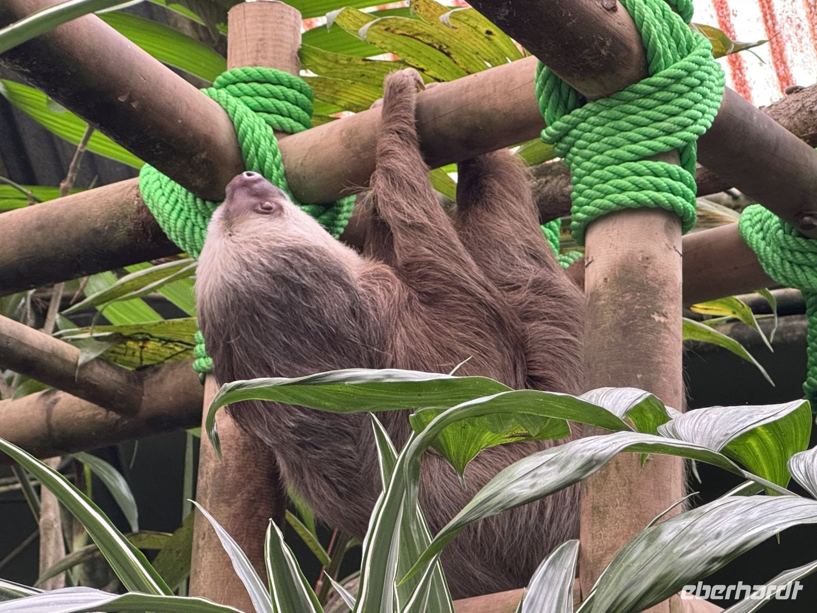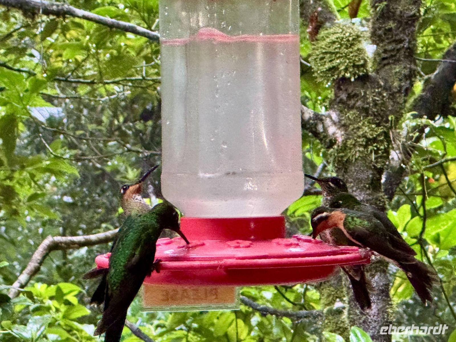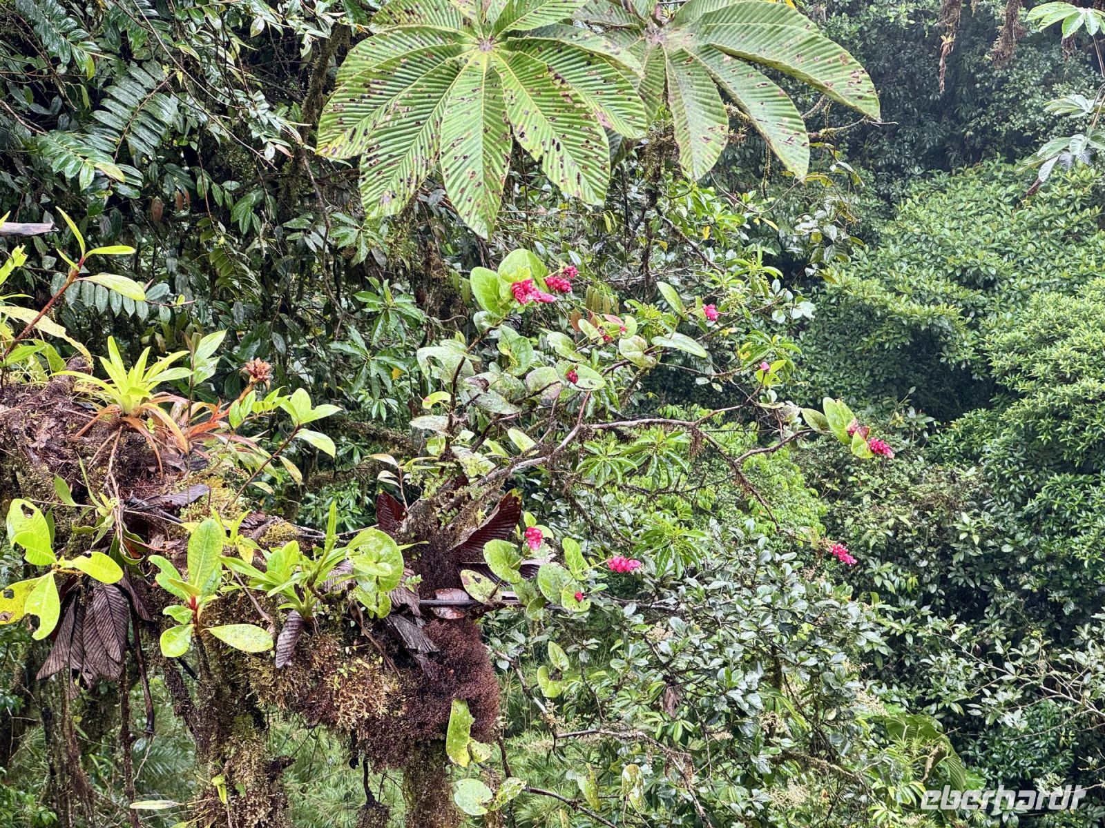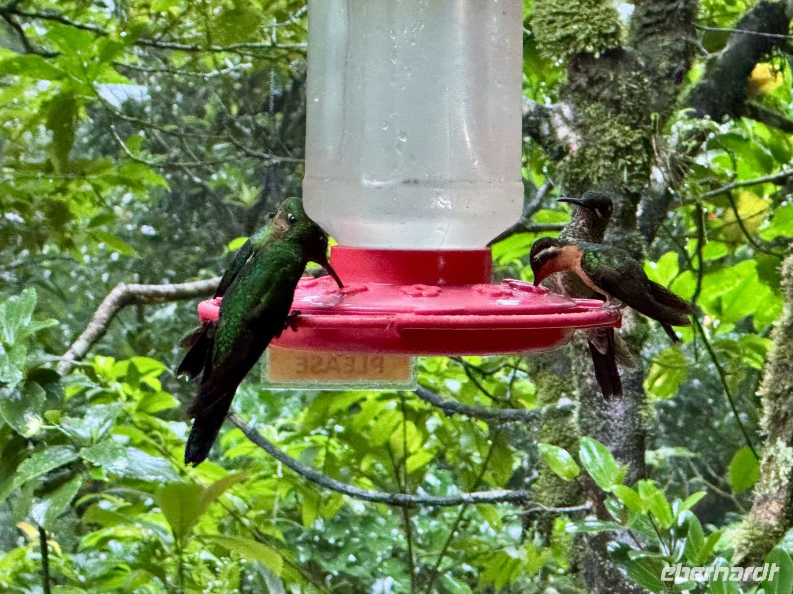 Mein erster Gedanke nach dem Klingeln des Weckers, nein eigentlich noch vor dem Klingeln des Weckers, gilt Nico und seiner optimistischen Wetterprognose von gestern Abend. Ich weiß nicht, ob es wirklich der heftigste Regenschauer ist, den ich bisher in Costa Rica erlebt habe. In meinem noch sehr verschlafenen Zustand kommt er mir jedenfalls so vor. Es rumpelt wieder heftig auf dem Dach. Als ich in meine Badelatschen schlüpfe, blicken mich etwa sechs bis acht neugierige Affenköpfchen aus den Giebelfenstern an und beobachten einen fluchenden Eberhardt-Reiseleiter bei seinem täglichen Morgenritual, darunter auch mindestens eine Affenmutter mit ihrem Jungtier, die so ab fünf Uhr morgens lärmend vor den herabstürzenden Wassermassen ausgerechnet unter meinem Vordach Schutz gesucht haben. Mein chaotisches Treiben wird von ihnen allen fleißig kommentiert. Da bin ich den fünf Fledermäusen im mittleren Giebelfenster dankbar, dass sie mich nur wortlos beäugen. Kann man sich so sehr in einen Ort verlieben, einen Ort, über dem ein besonderer Zauber zu liegen scheint, an dem man herzlich aufgenommen und vorzüglich bewirtet wird, dass der Abschied unheimlich schwerfällt? Die kleinen Tränen, die sich in meinen Augenwinkeln sammeln, und ein Gefühl der Traurigkeit, als unser Boot ablegt und uns unsere Gastgeber Christina und Roland nochmals zuwinken, sind meine Antwort auf diese Frage. Nicht vermissen werde ich hingegen die vielen Stufen hinauf zu unseren Zimmern und die holprige Überfahrt über die Drake Bay. Auch das Meer scheint etwas aufgebracht ob unseres Abschieds. Von der Fahrt auf dem Fluss durch den Regen völlig durchnässt fallen wir Hera in die Arme, der uns am Anleger mit einem neuen Bus erwartet. (Ach, ein riesiges hungriges Krokodil haben wir übrigens auch wieder gesehen.) Dank vieler helfender Hände sind unsere Koffer schnell durch eines der hinteren Fenster auf die Rückbank gehoben und wir beginnen unsere Fahrt in die Berge. In Palmar Norte halten wir schon das erste Mal wieder an, weil uns Nico riesige mysteriöse Steinkugeln zeigen will, die vor ungefähr 1.500 Jahren von der Urbevölkerung mit unbekannten Methoden zu unbekannten Zwecken in vermutlich mühevoller Arbeit produziert worden sind. Ein überdimensionales Murmelspiel? Ein astronomischer Kalender? Fragen, die wohl ohne Zeitmaschine nie beantwortet werden können. Auf der bekannten Küstenstraße fahren wir ein Stück zurück gen Norden, diesmal allerdings bei Tageslicht, sodass wir ab und zu einen Blick auf den Pazifik erhaschen können. Für die Mittagspause hat Nico auch extra ein kleines Restaurant mit Aussicht gewählt — sehen tun wir allerdings nichts. Die Wolken ziehen sogar durch die Sichtfenster bis zu unserem Tisch hinein. Vielleicht ist es auch gut so, dass wir wetterbedingt vom berühmt-berüchtigten „Berg des Todes“ auf der Panamericana nicht viel mitbekommen. Aber es sieht rings um uns herum auch auf einer Höhe von 3.400 Metern immer noch sehr grün aus. Da draußen ist immer noch ein Wald, vielleicht nicht ganz so hoch und dicht, aber immer noch ein grüner Wald. In den Alpen gäbe es auf dieser Höhe nur den blanken Fels. Ins wildromantische Tal von San Gerardo de Dota führt eine steile Stichstraße hinab, die Hera noch einmal herausfordert. Damit wir uns nicht erst umgewöhnen müssen, fahren wir an allen Hotels vorbei, die (noch) im Trockenen liegen, und halten genau an dem, über dem es schon regnet. Danke, Nico! Zu seiner Ehrenrettung: Es ist ein sehr schönes Hotel mit einer sehr hübschen Gartenanlage. Und gebucht hat er es ja auch nicht. Und wenig später regnet es sowieso im ganzen Tal, auf noch rund 2.000 Metern Höhe. Es ist merklich frischer als unten am Pazifik, als wir gegen 16:00 Uhr aussteigen und unsere Zimmer beziehen. Den großen Tisch zum Abendessen haben wir heute im Hotelrestaurant schon etwas zeitiger gebucht, denn morgen geht es früh los — noch vor dem Frühstück —, denn der Quetzal ist ein früher Vogel, der aber gar keine Würmer fängt (bzw. selten).