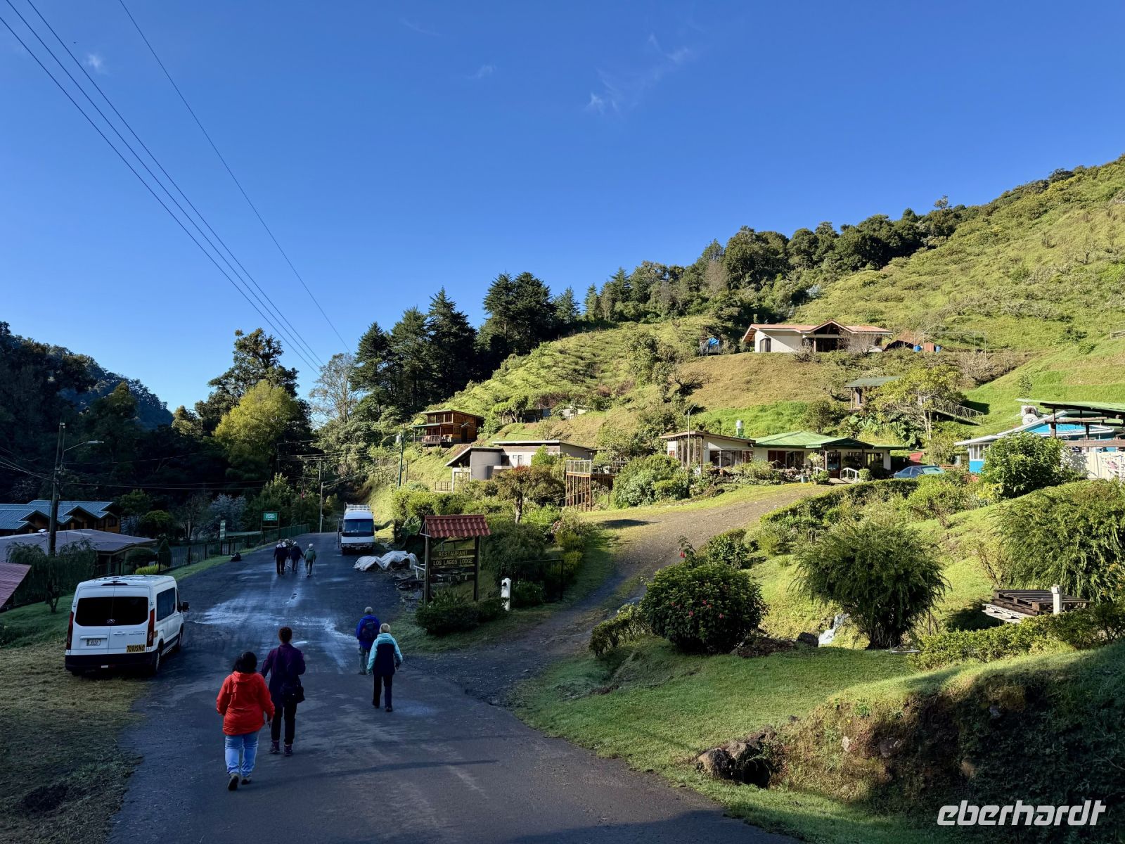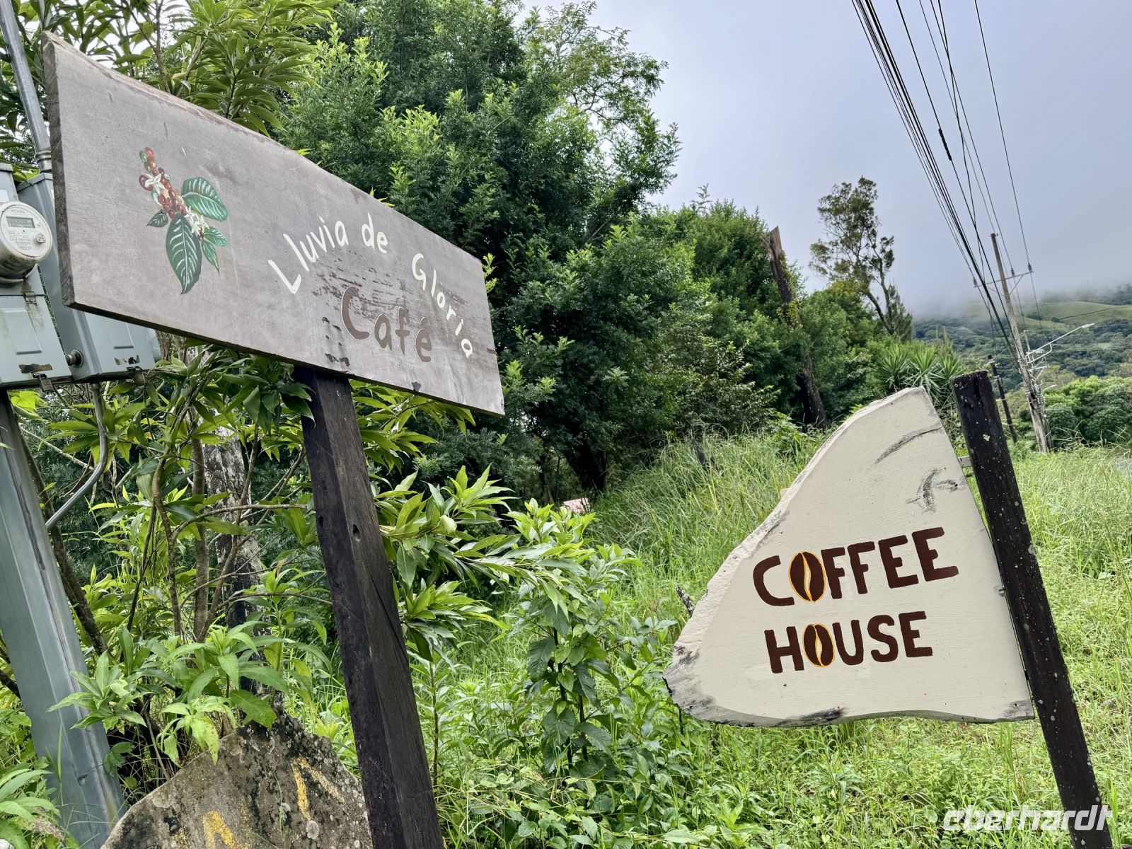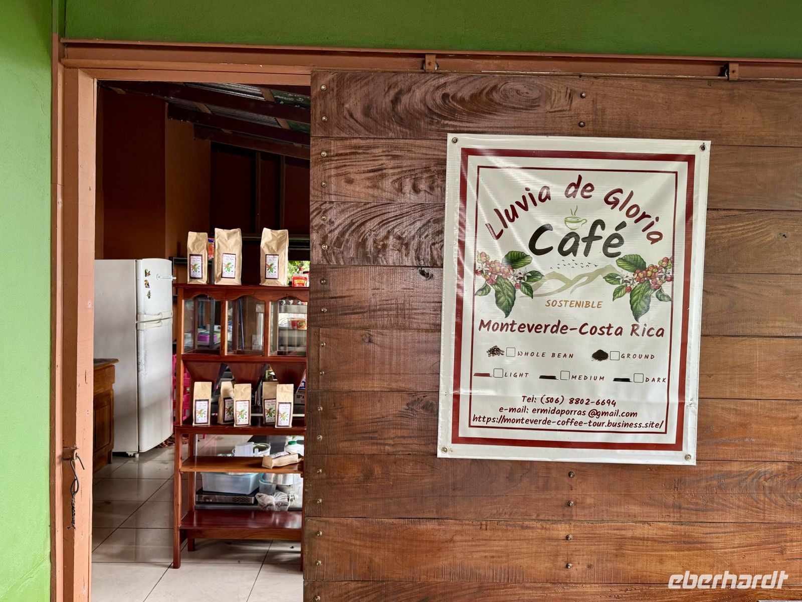 Zum Glück fährt heute Hera mit seinem froschgrünen Bus vor und nicht der Lkw. Beim Koffer-Tetris erreichen er und Nico ein neues Level und wundern sich, dass diesmal noch so viel Platz ist. Kühlere Gefilde hat Nico uns zur Abwechslung versprochen — und tatsächlich zeigt meine Wetter-App für unser nächstes Ziel Monteverde gerade mal 17 Grad an. Vorsichtshalber habe ich gleich Mütze, Schal und Handschuhe ins „Handgepäck“ gesteckt. Natürlich regnet es auch bei unserem Abschied aus Samara. Eine solche Wetterlage hat es wohl seit Jahrzehnten nicht gegeben. Über Nicoya und die Friedensbrücke verlassen wir die Halbinsel und kehren zur Panamericana zurück. Während der Pause in Limonal suchen wir rote Aras, jedoch letztendlich erfolglos. Nur zwei Pleite- äh Rabengeier sitzen auf einem Baum. Wer hier im überteuerten Souvenirladen einkauft, ist aber ganz schnell pleite. Wenig später biegen wir nach Monteverde ab und fahren durch ein ehemaliges Bergbaustädtchen. Über eine schmale, steile Straße in teils fragwürdigem Zustand geht es immer weiter bergauf und bergauf. Bei etwa 900 Höhenmetern sind wir in den Wolken angekommen. Wald und Weideflächen versinken immer mehr im Nebel. Schließlich sehen wir ein Schild am rechten Straßenrand: Lluvia de Gloria — wir sind an der Kaffeeplantage angekommen. Hera schafft es mit dem Bus aufgrund des aufgeschwemmten Bodens nicht rückwärts in die Einfahrt, weshalb wir schnell die 100 Meter bis zum Hauptgebäude laufen. Seine Portion Casado bringen wir unserem herzlichen Chauffeur aber an den Bus. Während des leckeren Mittagessens (alles frisch und nur für uns zubereitet) fängt es wieder an, vom Himmel zu schütten. Spontan fragt Nico unseren Gastgeber Alan, ob er nicht für uns erstmal Kaffee rösten könnte. Das wollte Alan heute sowieso noch tun, weshalb wir Zeuge werden, wie ein echter Vollprofi die hochwertigen Bohnen bis zur Perfektion röstet. Genau diese frisch vor unseren Augen gerösteten Bohnen können wir am Ende des Besuchs für einen fairen Preis käuflich erwerben. Der Regen lässt langsam wieder nach. Nun kommen wir doch noch in den Genuss unserer Führung über die Bio-Plantage. Neben Kaffee werden diverse Zitrusfrüchte und traditionelle Pflanzen angebaut, z. B. Yucca, Kochbananen und Luftkartoffeln. Zwei süße Hunde begleiten uns und passen auf uns auf. Den kleineren würde ich am liebsten gleich mitnehmen. (Und am liebsten zur sicheren Verwahrung auch gleich die beiden Schweinchen mit den Namen „24.12.“ und „31.12.“ — Nomen est Omen, oh oh.) Nach dem sehr schönen ausgedehnten Aufenthalt auf der Plantage setzen wir unsere Fahrt nach Monteverde fort. Weit ist es nun nicht mehr. Am frühen Abend erwartet uns noch ein interessanter Vortrag von Ricardo über die Quäkerfamilien, die sich aus den USA fliehend in den 1950er Jahren in Costa Rica niederließen und hier in Monteverde mit viel körperlichem Einsatz ein neues (verregnetes) Zuhause sowie die erste Käserei des Landes aufbauten. Die Geschichte von Ricardos Familie ist auch eng verknüpft mit der Geschichte des Nebelwaldes und des Nationalparks. Nach der Präsentation fahren Nico, Hera und ich mit einigen Gästen noch zu Nicos Freundin Rebecca, die mit ihrer Familie ein Restaurant betreibt. Und zwar ein sehr gutes, denn wir sind von der Qualität der Speisen sehr angetan und wollen morgen gleich mit der ganzen Gruppe wiederkommen!