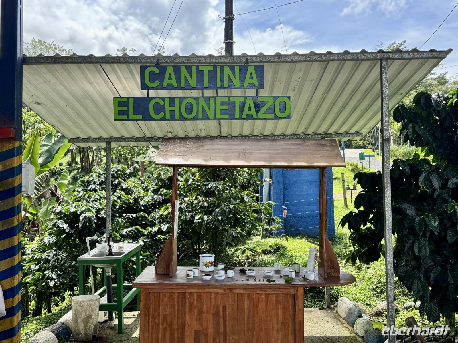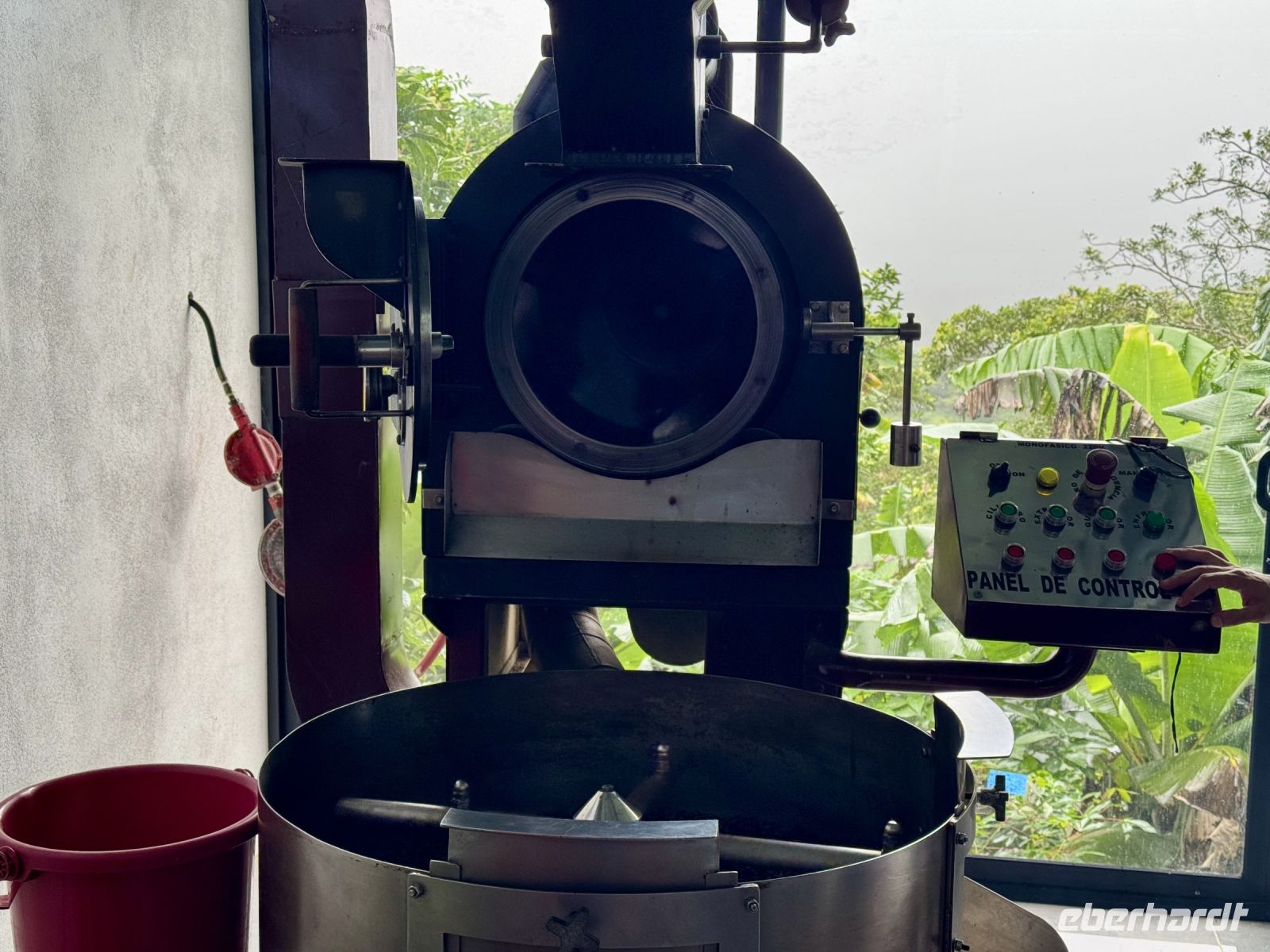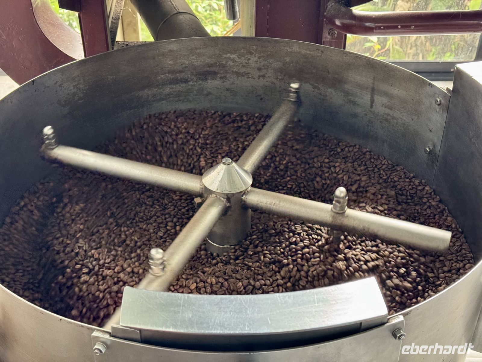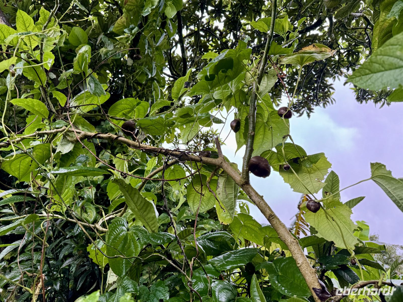 Zum Glück fährt heute Hera mit seinem froschgrünen Bus vor und nicht der Lkw. Beim Koffer-Tetris erreichen er und Nico ein neues Level und wundern sich, dass diesmal noch so viel Platz ist. Kühlere Gefilde hat Nico uns zur Abwechslung versprochen — und tatsächlich zeigt meine Wetter-App für unser nächstes Ziel Monteverde gerade mal 17 Grad an. Vorsichtshalber habe ich gleich Mütze, Schal und Handschuhe ins „Handgepäck“ gesteckt. Natürlich regnet es auch bei unserem Abschied aus Samara. Eine solche Wetterlage hat es wohl seit Jahrzehnten nicht gegeben. Über Nicoya und die Friedensbrücke verlassen wir die Halbinsel und kehren zur Panamericana zurück. Während der Pause in Limonal suchen wir rote Aras, jedoch letztendlich erfolglos. Nur zwei Pleite- äh Rabengeier sitzen auf einem Baum. Wer hier im überteuerten Souvenirladen einkauft, ist aber ganz schnell pleite. Wenig später biegen wir nach Monteverde ab und fahren durch ein ehemaliges Bergbaustädtchen. Über eine schmale, steile Straße in teils fragwürdigem Zustand geht es immer weiter bergauf und bergauf. Bei etwa 900 Höhenmetern sind wir in den Wolken angekommen. Wald und Weideflächen versinken immer mehr im Nebel. Schließlich sehen wir ein Schild am rechten Straßenrand: Lluvia de Gloria — wir sind an der Kaffeeplantage angekommen. Hera schafft es mit dem Bus aufgrund des aufgeschwemmten Bodens nicht rückwärts in die Einfahrt, weshalb wir schnell die 100 Meter bis zum Hauptgebäude laufen. Seine Portion Casado bringen wir unserem herzlichen Chauffeur aber an den Bus. Während des leckeren Mittagessens (alles frisch und nur für uns zubereitet) fängt es wieder an, vom Himmel zu schütten. Spontan fragt Nico unseren Gastgeber Alan, ob er nicht für uns erstmal Kaffee rösten könnte. Das wollte Alan heute sowieso noch tun, weshalb wir Zeuge werden, wie ein echter Vollprofi die hochwertigen Bohnen bis zur Perfektion röstet. Genau diese frisch vor unseren Augen gerösteten Bohnen können wir am Ende des Besuchs für einen fairen Preis käuflich erwerben. Der Regen lässt langsam wieder nach. Nun kommen wir doch noch in den Genuss unserer Führung über die Bio-Plantage. Neben Kaffee werden diverse Zitrusfrüchte und traditionelle Pflanzen angebaut, z. B. Yucca, Kochbananen und Luftkartoffeln. Zwei süße Hunde begleiten uns und passen auf uns auf. Den kleineren würde ich am liebsten gleich mitnehmen. (Und am liebsten zur sicheren Verwahrung auch gleich die beiden Schweinchen mit den Namen „24.12.“ und „31.12.“ — Nomen est Omen, oh oh.) Nach dem sehr schönen ausgedehnten Aufenthalt auf der Plantage setzen wir unsere Fahrt nach Monteverde fort. Weit ist es nun nicht mehr. Am frühen Abend erwartet uns noch ein interessanter Vortrag von Ricardo über die Quäkerfamilien, die sich aus den USA fliehend in den 1950er Jahren in Costa Rica niederließen und hier in Monteverde mit viel körperlichem Einsatz ein neues (verregnetes) Zuhause sowie die erste Käserei des Landes aufbauten. Die Geschichte von Ricardos Familie ist auch eng verknüpft mit der Geschichte des Nebelwaldes und des Nationalparks. Nach der Präsentation fahren Nico, Hera und ich mit einigen Gästen noch zu Nicos Freundin Rebecca, die mit ihrer Familie ein Restaurant betreibt. Und zwar ein sehr gutes, denn wir sind von der Qualität der Speisen sehr angetan und wollen morgen gleich mit der ganzen Gruppe wiederkommen!