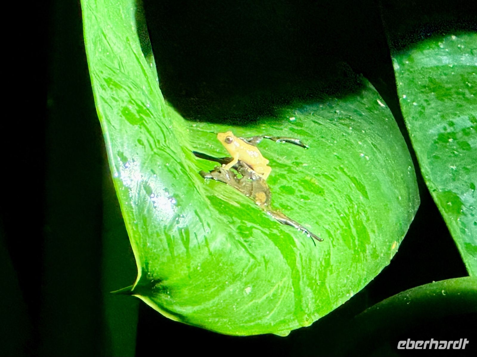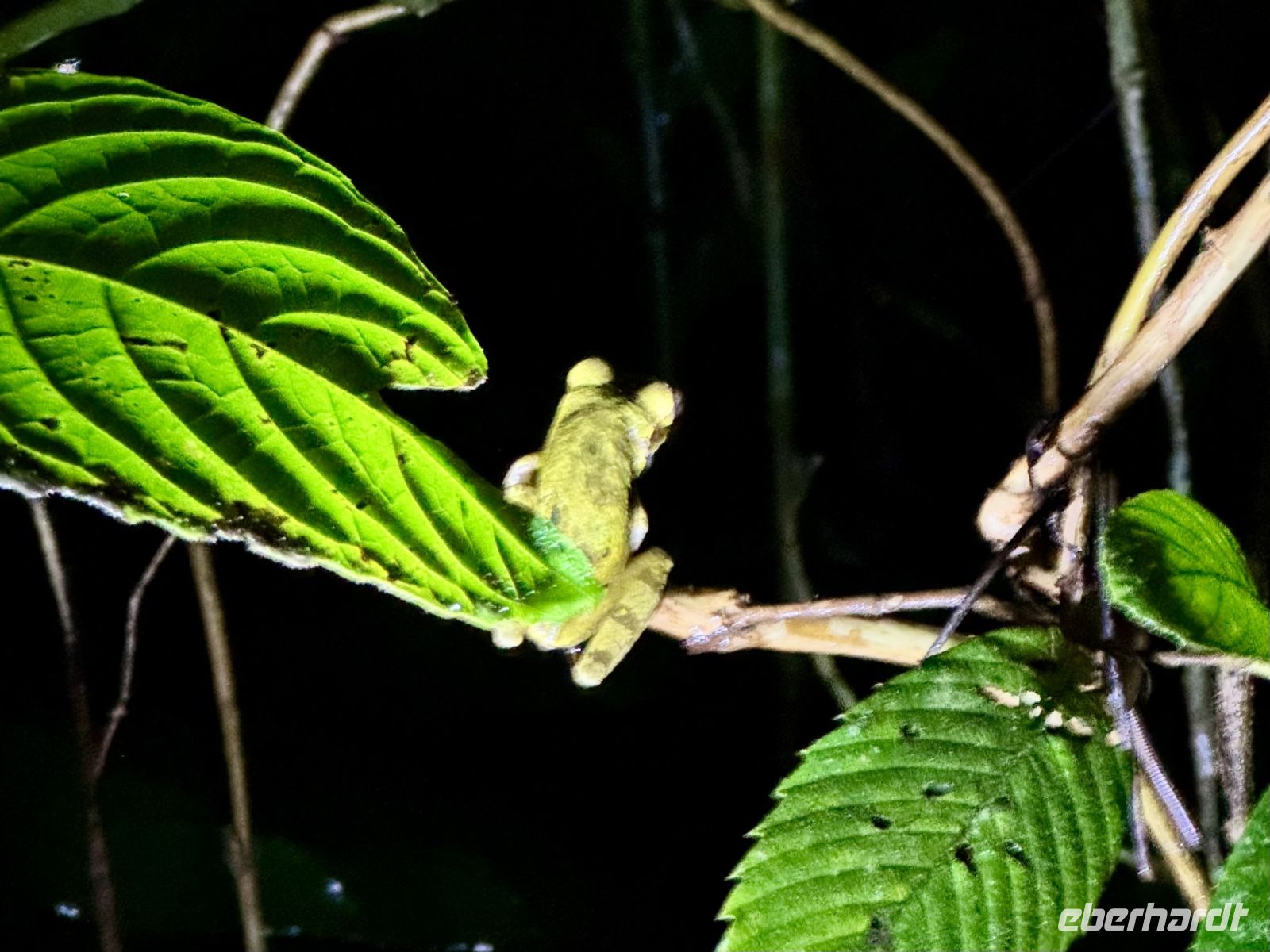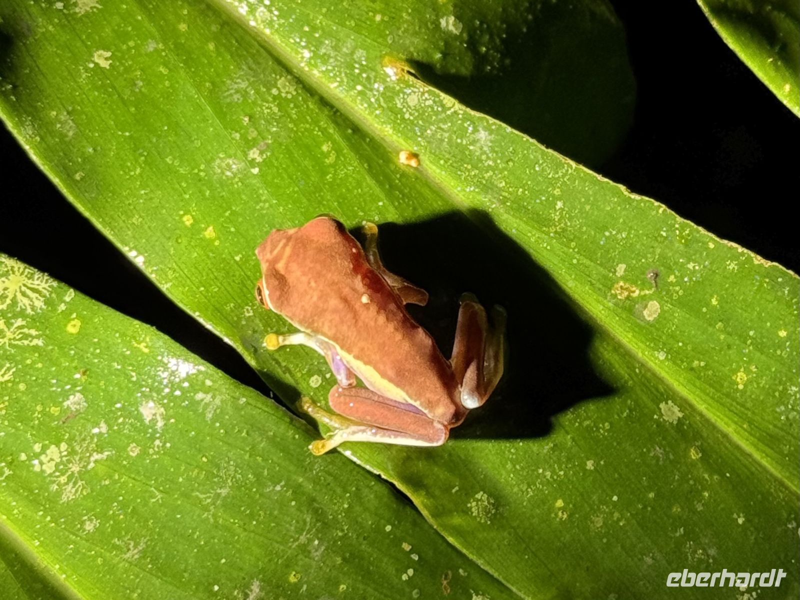 Durch den Zeitunterschied wachen wir in der ersten Nacht in Costa Rica mehrmals und/oder sehr zeitig am Morgen auf. So drehen einige Gäste meiner kleinen Gruppe schon vor dem Frühstück eine kleine Runde auf dem hoteleigenen Coffee Trail. Unsere Fahrt zum Vulkan Poas führt uns auch bereits an einigen Kaffeeplantagen vorbei. Die Straße windet sich höher und höher, stellenweise muss sich unser Kleinbus ganz schön den Berg hinaufquälen. Bei einem Fotostopp blicken wir zurück auf das Tal von San José zwischen den Vulkanen im Norden und dem Faltengebirge im Süden. Dann erreichen wir den Park und spazieren im leichten Sprühregen durch einen Zwerg-Nebelwald, wie uns Nico erklärt, zum Rand des Vulkans. An einigen Stellen konnte ich unterwegs ein bisschen den Schwefel riechen. Obwohl auch heute die Wolken von der Karibik herein- und über den Vulkan ziehen, lassen sich der Krater selbst und auch der See (bis zu 70 Grad heiß!) am Boden gut erkennen. Durch dichte Wolken, grüne Wälder und Weideland mit Holsteinrindern fahren wir nun bergab zu unserem zweiten Stopp, der Kaffeeplantage. Unterwegs kaufen wir spontan an einem Stand die lokalen Spezialitäten Erdbeeren und Käse, die wir auf der Weiterfahrt verkosten. Beides sehr lecker! Ein Fotostopp an einem Wasserfall ist die nächste Überraschung, die Nico für uns parat hat. Geht es jetzt jeden Tag so weiter? Gegen Mittag erreichen wir die Kaffeeplantage und bekommen dort auch erstmal ein traditionelles Mittagsgericht (Casado) mit u. a. Reis, Bohnen und Kochbananen. Anschließend führt uns Mahri (?) durch die Plantage und erklärt uns die gesamte Produktionskette von der Aussaat bis zur Röstung. Weil wir gut aufpassen, spendiert sie zwischendurch eine Runde Kaffeelikör. Draußen in der Sonne lässt es sich im Moment kaum aushalten. Dafür trocknen jetzt die Bohnen besonders gut. Natürlich bekommen wir am Ende der Führung auch eine Tasse Kaffee — aufgebrüht nach der traditionellen Methode. Und die braucht ihre Zeit … Zurück im Bus zeichnet Nico unsere heutige Route auf der Karte ein. Wir sind auf der Karibikseite der Vulkankette angelangt und müssen noch bis La Fortuna. Das ist gar nicht mehr so weit — gegen 15:30 Uhr sind wir am Hotel. Nachdem wir unsere Zimmer bezogen haben, dürfen wir uns etwa eine Stunde ausruhen, bevor wir nochmals aufbrechen. Gemeinsam wollen wir auf einer Nachtwanderung den Froschkönig suchen. Mit einem Guide und Taschenlampen begeben wir uns in den Dschungel. Eine wahre Symphonie aus Luten erfüllt die Nacht. Schnell werden wir fündig und sehen die ersten Frösche. Der heftige Regen treibt sie wohl nach draußen, meint Nico. So kehren wir zwar klatschnass, aber mit einer erfreulich hohen Ausbeute zurück. Wir haben viele Regenfrösche gesehen, den berühmten Rotaugen-Grünfrosch, auch den kleinsten Frosch Costa Ricas, Sanduhr-Laubfrösche, ja sogar ein eigentlich tagaktiver Pfeilgiftfrosch hat für uns Glückspilze extra Überstunden gemacht. Außerdem haben wir eine Viper, einen Glasflügelschmetterling und schlafende kleine Eidechsen gesehen. Beim gemeinsamen Abendessen im Grillrestaurant gegenüber unserem Hotel — Nico hat freundlicherweise einen Tisch für uns reserviert — stärken wir uns nach dem doch recht langen ersten Rundreisetag in Costa Rica mit bereits vielen tollen Momenten.